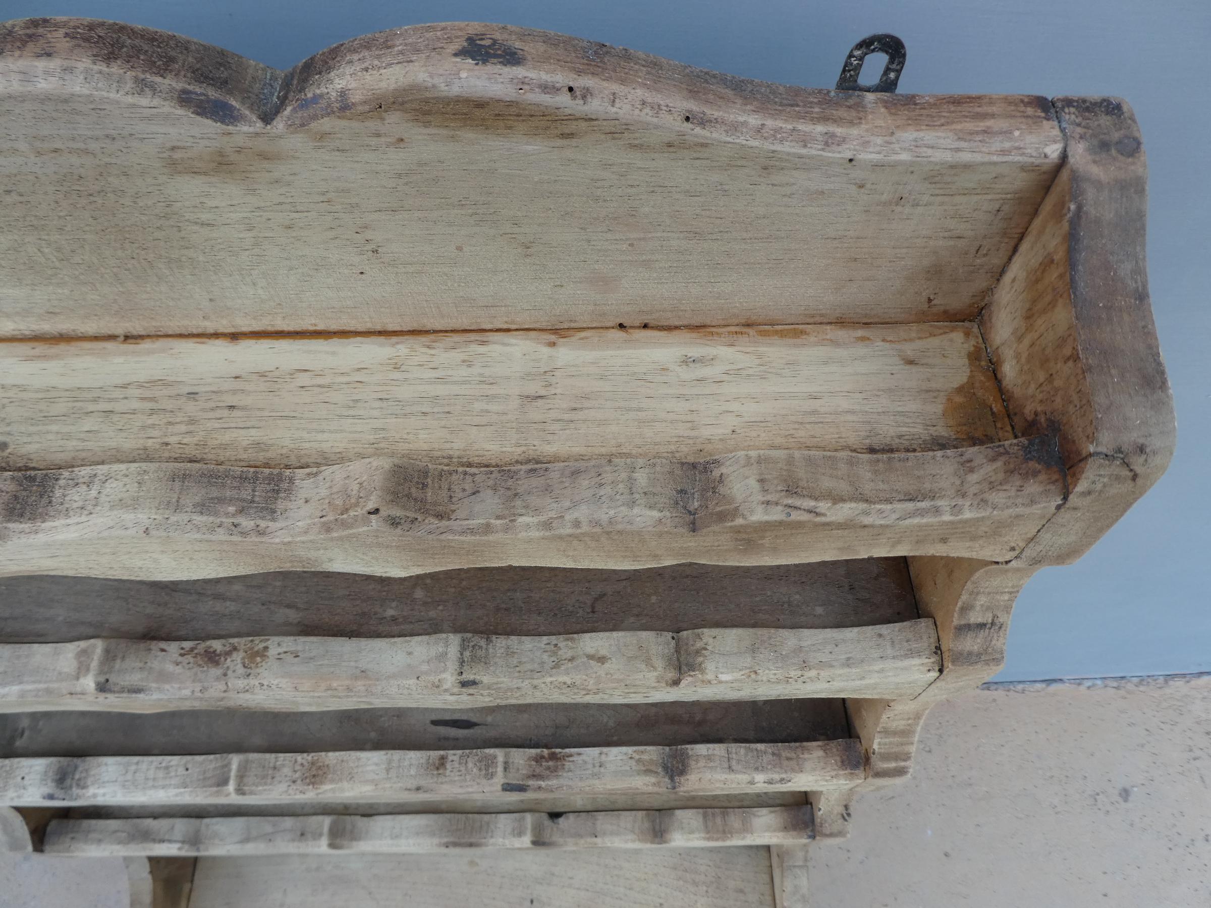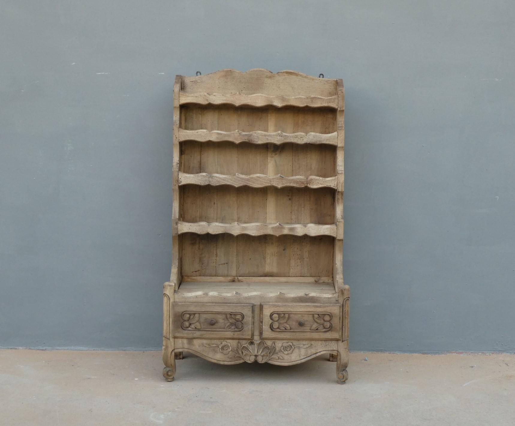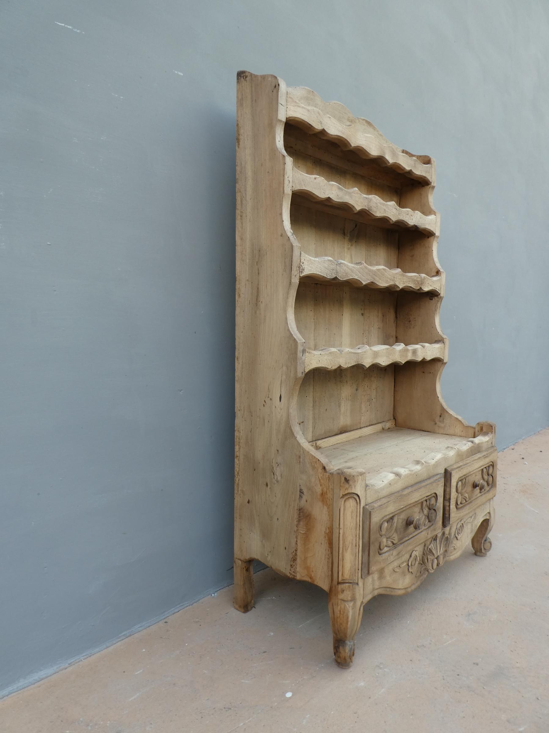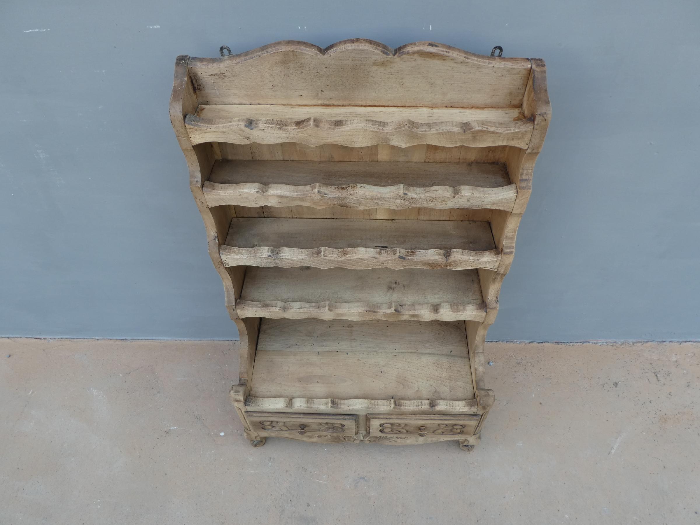 Mobile piattaia scaffale pensile a ripiani fissi, realizzata in legno di noce e dotata di un doppio cassetto sul fronte. La grande cura riservata all’intaglio, e l’armonioso movimento della struttura, sono gli elementi chiave appartenenti allo stile provenzale francese. All’occorrenza, grazie agli appositi ganci sul retro, si può anche appendere. Necessita di leggeri interventi di restauro, sono presenti buchi di tarlo. Epoca metà ‘900.