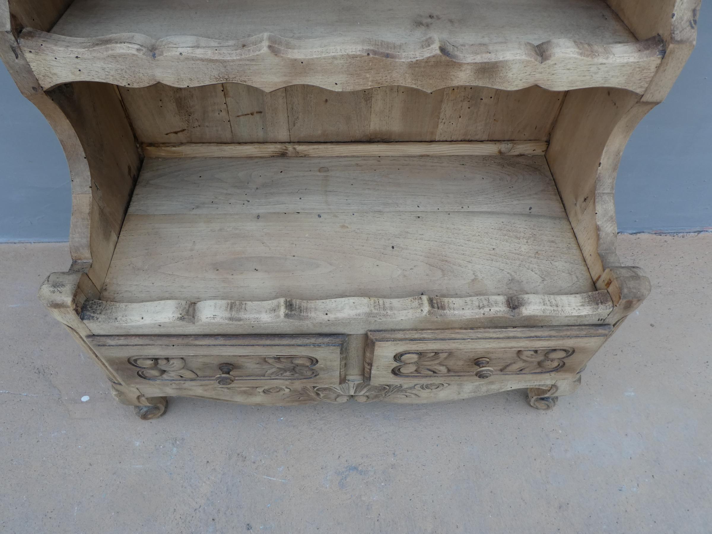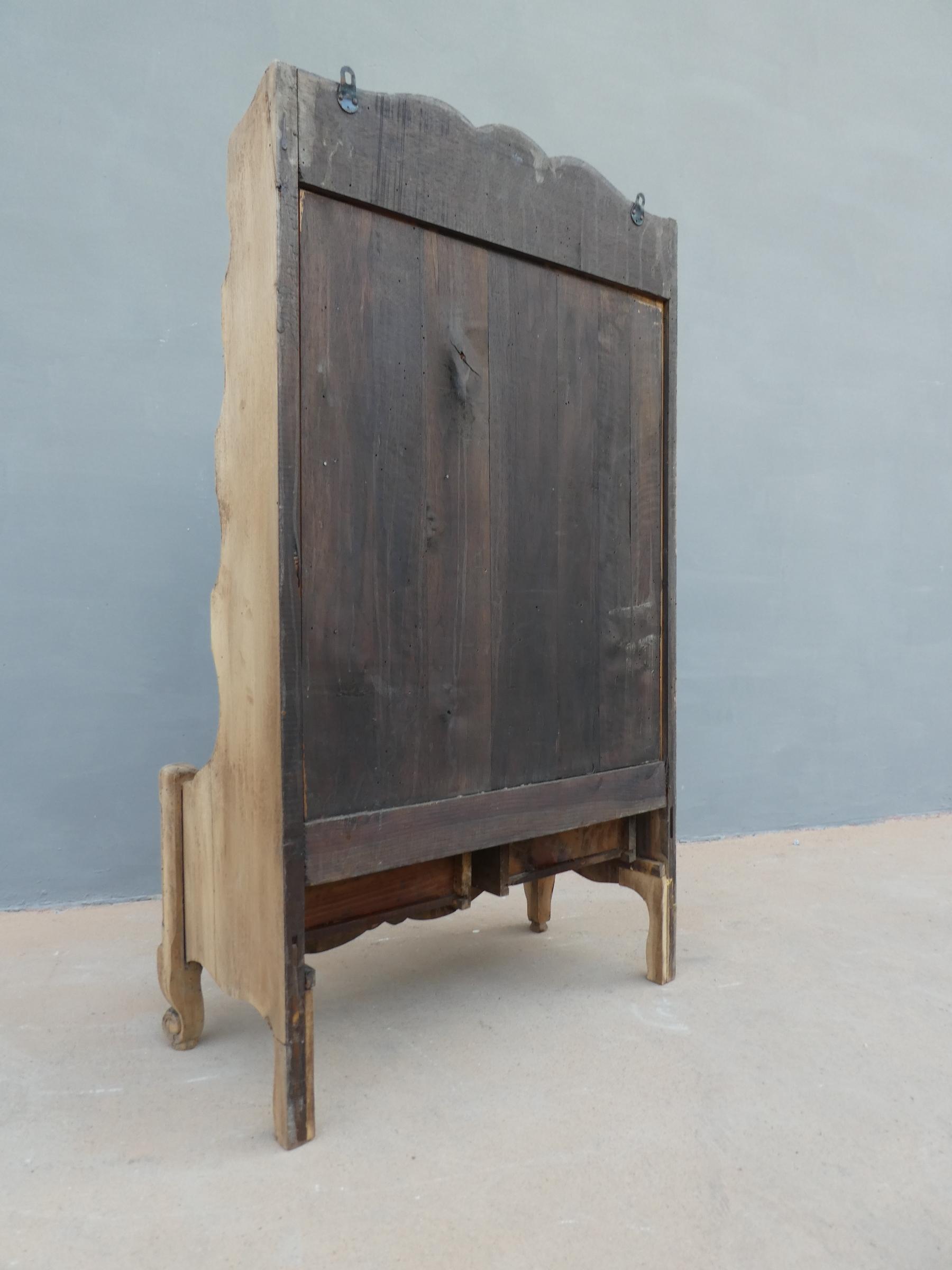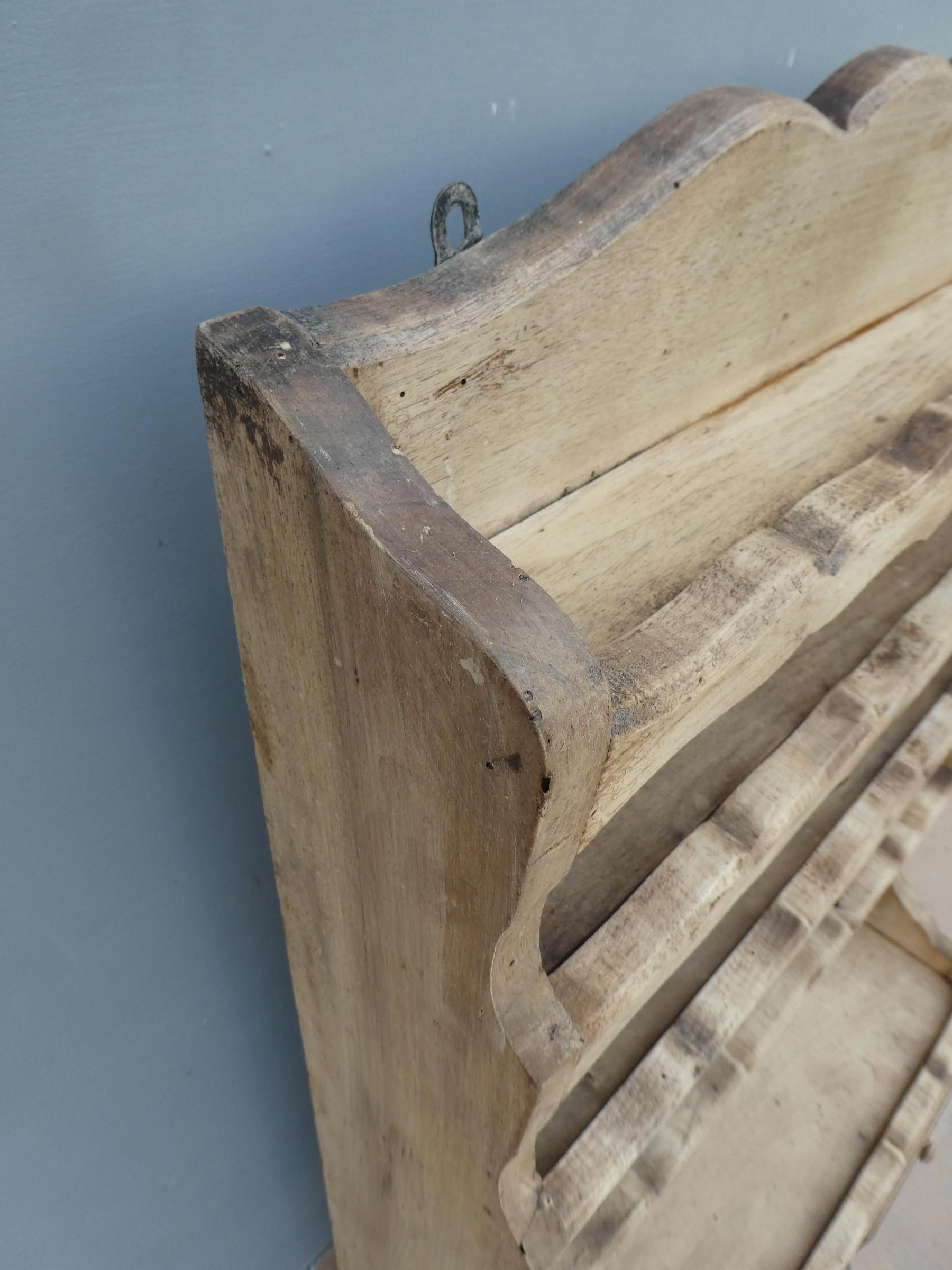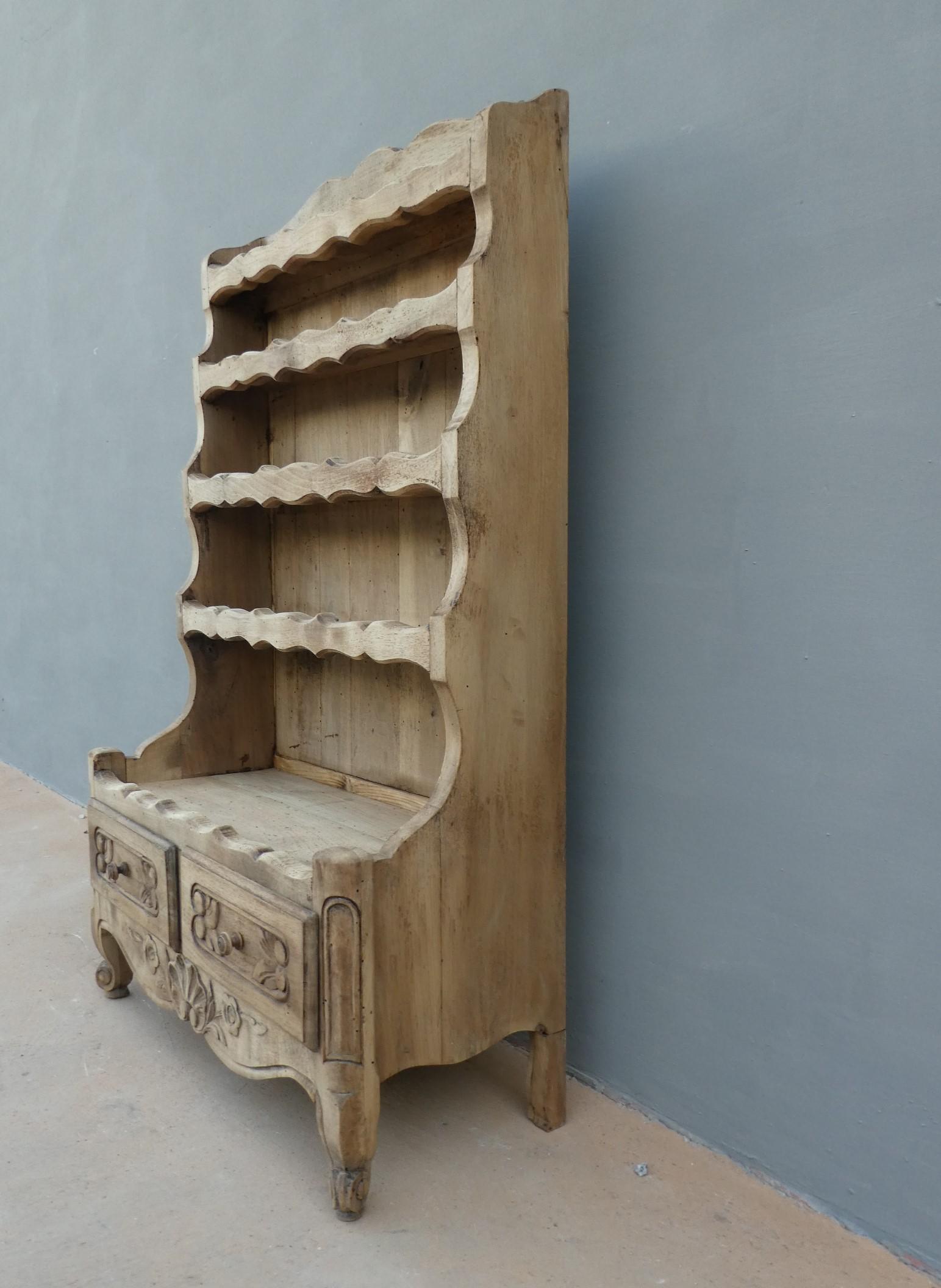 Mobile piattaia scaffale pensile a ripiani fissi, realizzata in legno di noce e dotata di un doppio cassetto sul fronte. La grande cura riservata all’intaglio, e l’armonioso movimento della struttura, sono gli elementi chiave appartenenti allo stile provenzale francese. All’occorrenza, grazie agli appositi ganci sul retro, si può anche appendere. Necessita di leggeri interventi di restauro, sono presenti buchi di tarlo. Epoca metà ‘900.