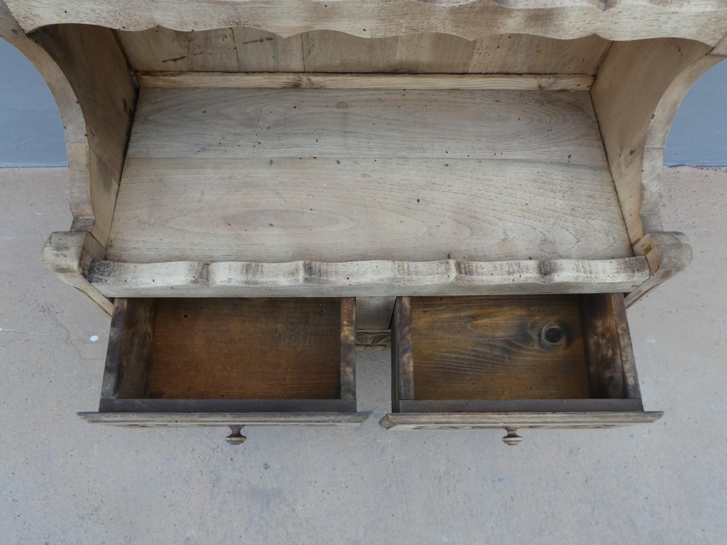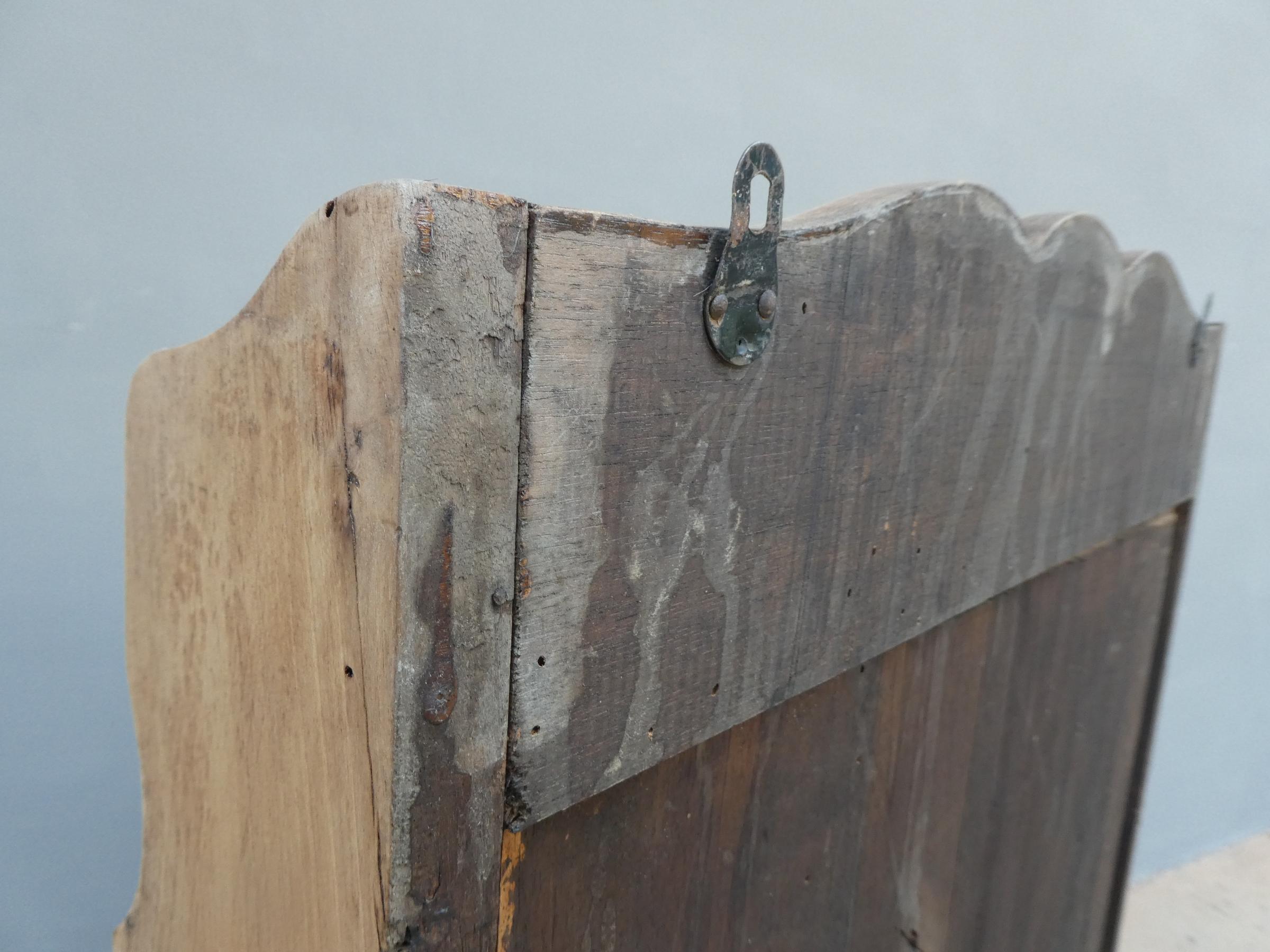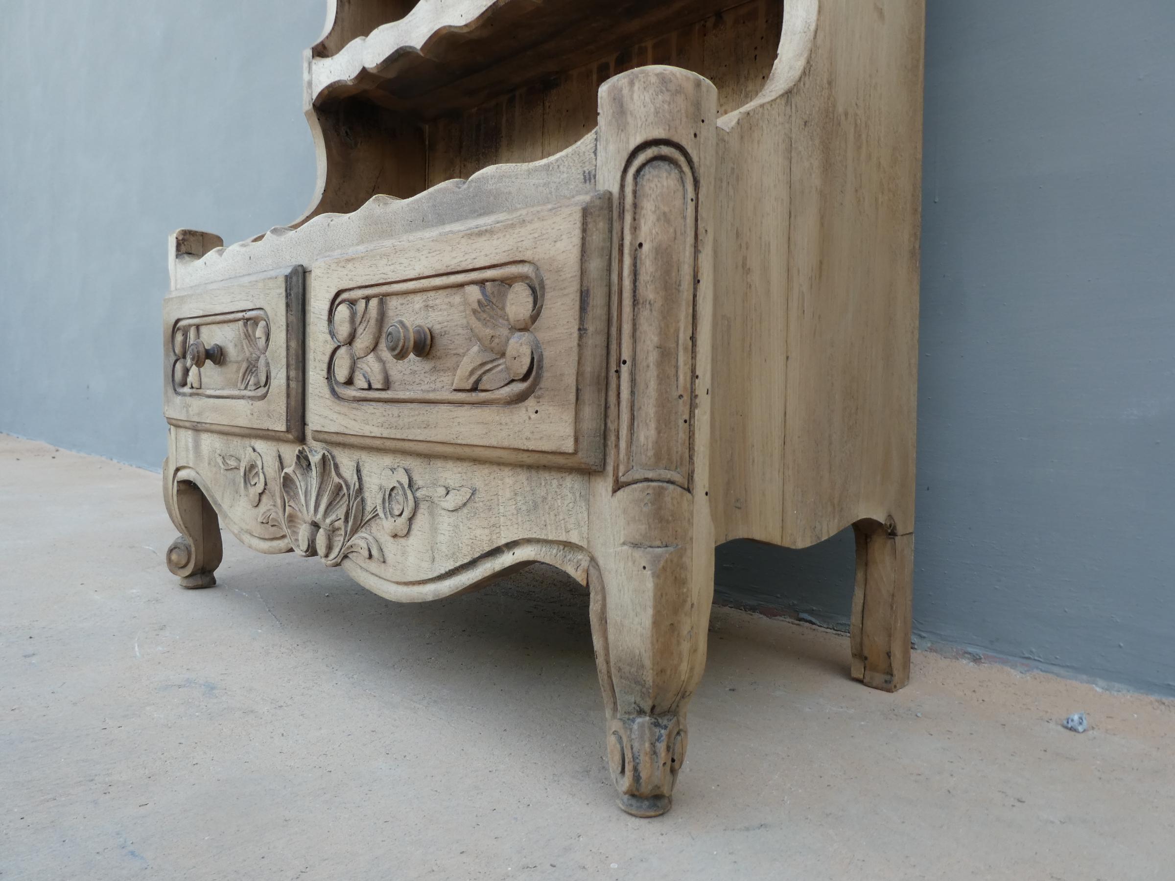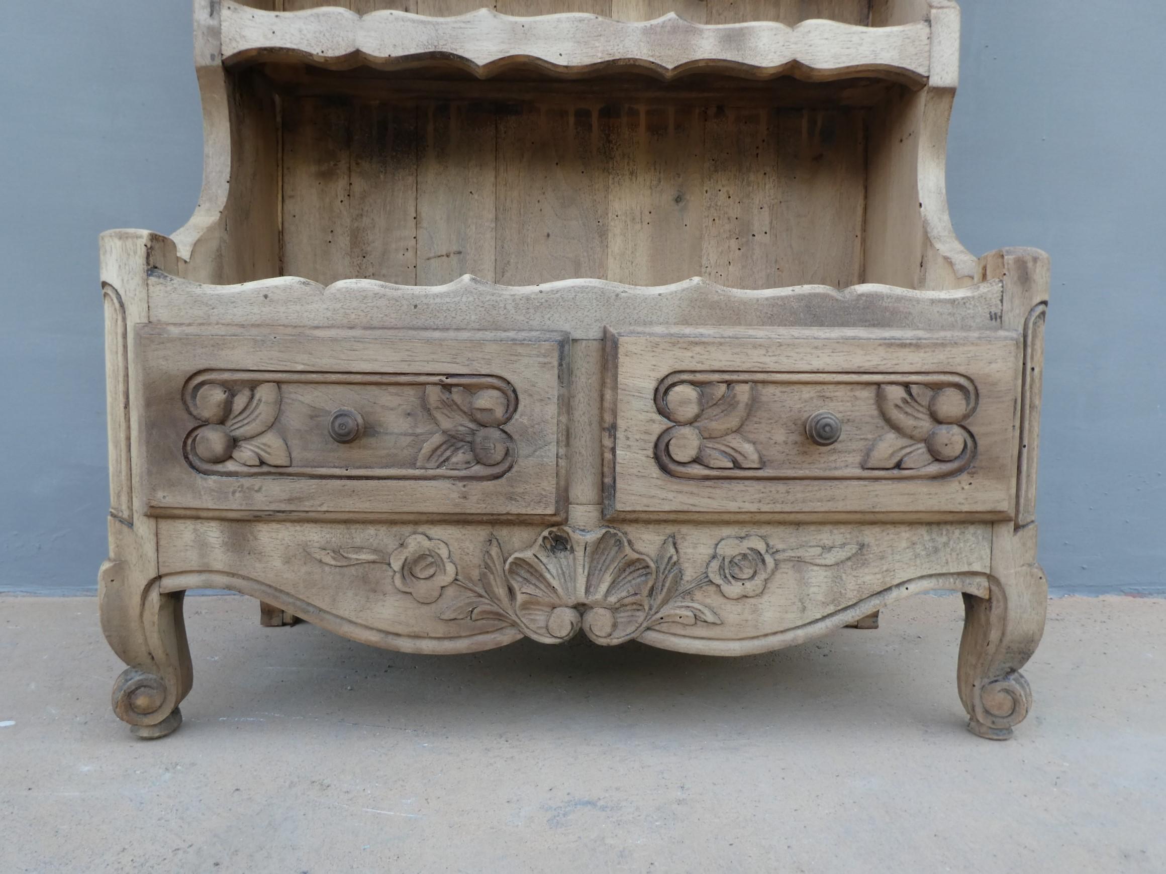 Mobile piattaia scaffale pensile a ripiani fissi, realizzata in legno di noce e dotata di un doppio cassetto sul fronte. La grande cura riservata all’intaglio, e l’armonioso movimento della struttura, sono gli elementi chiave appartenenti allo stile provenzale francese. All’occorrenza, grazie agli appositi ganci sul retro, si può anche appendere. Necessita di leggeri interventi di restauro, sono presenti buchi di tarlo. Epoca metà ‘900.