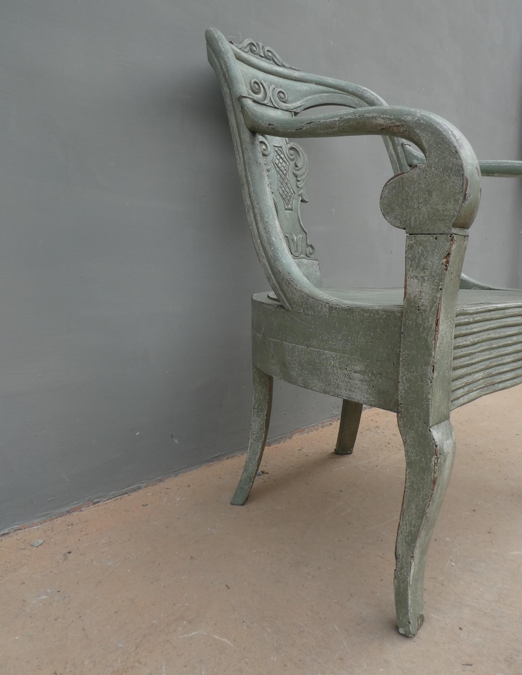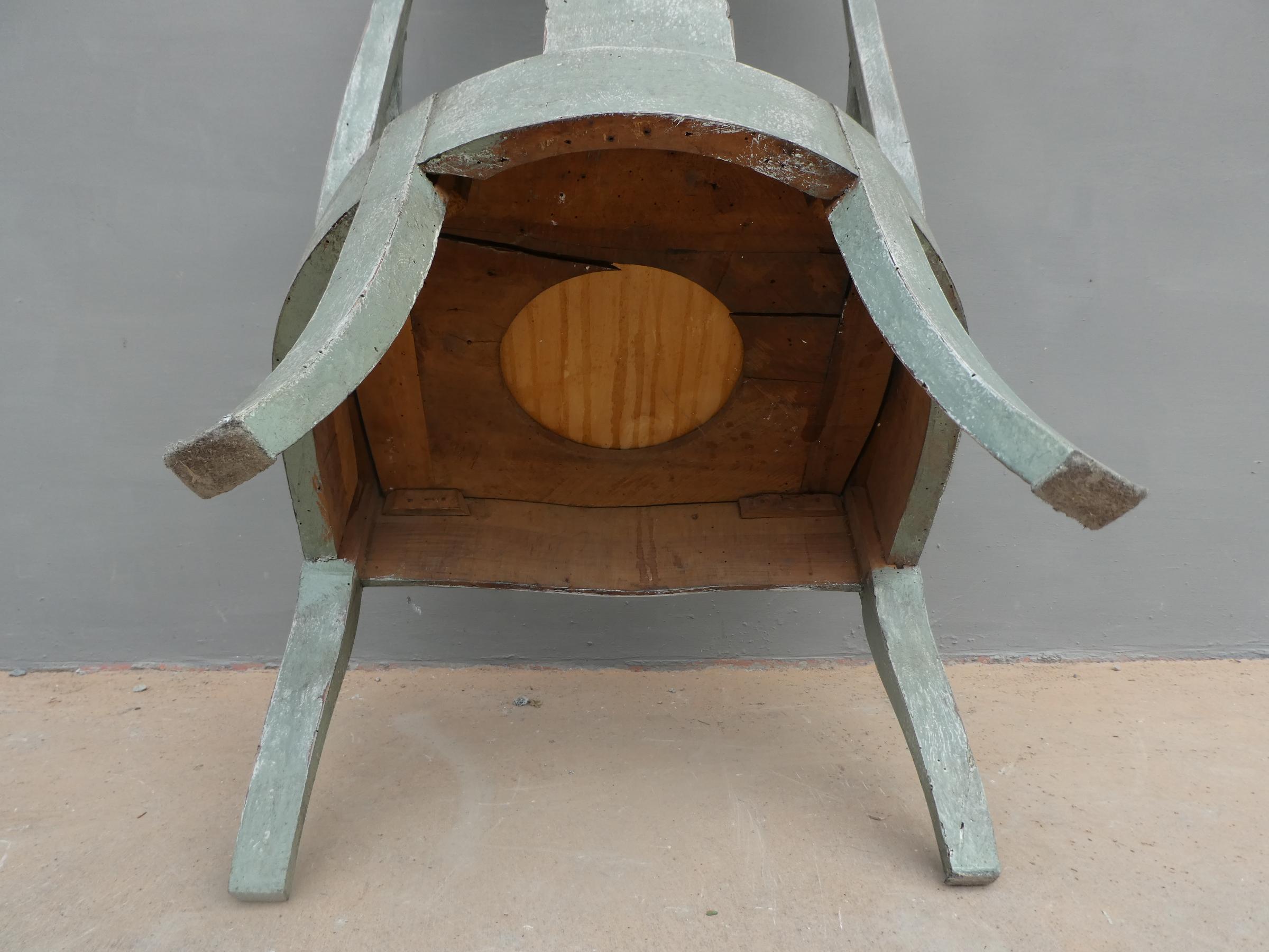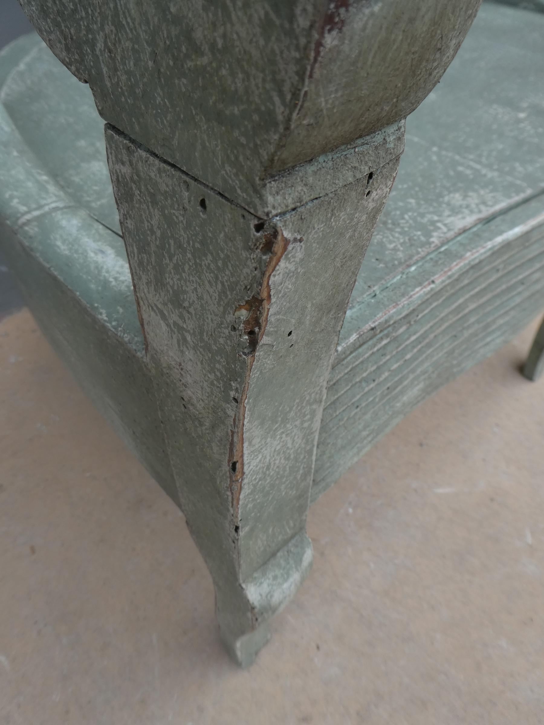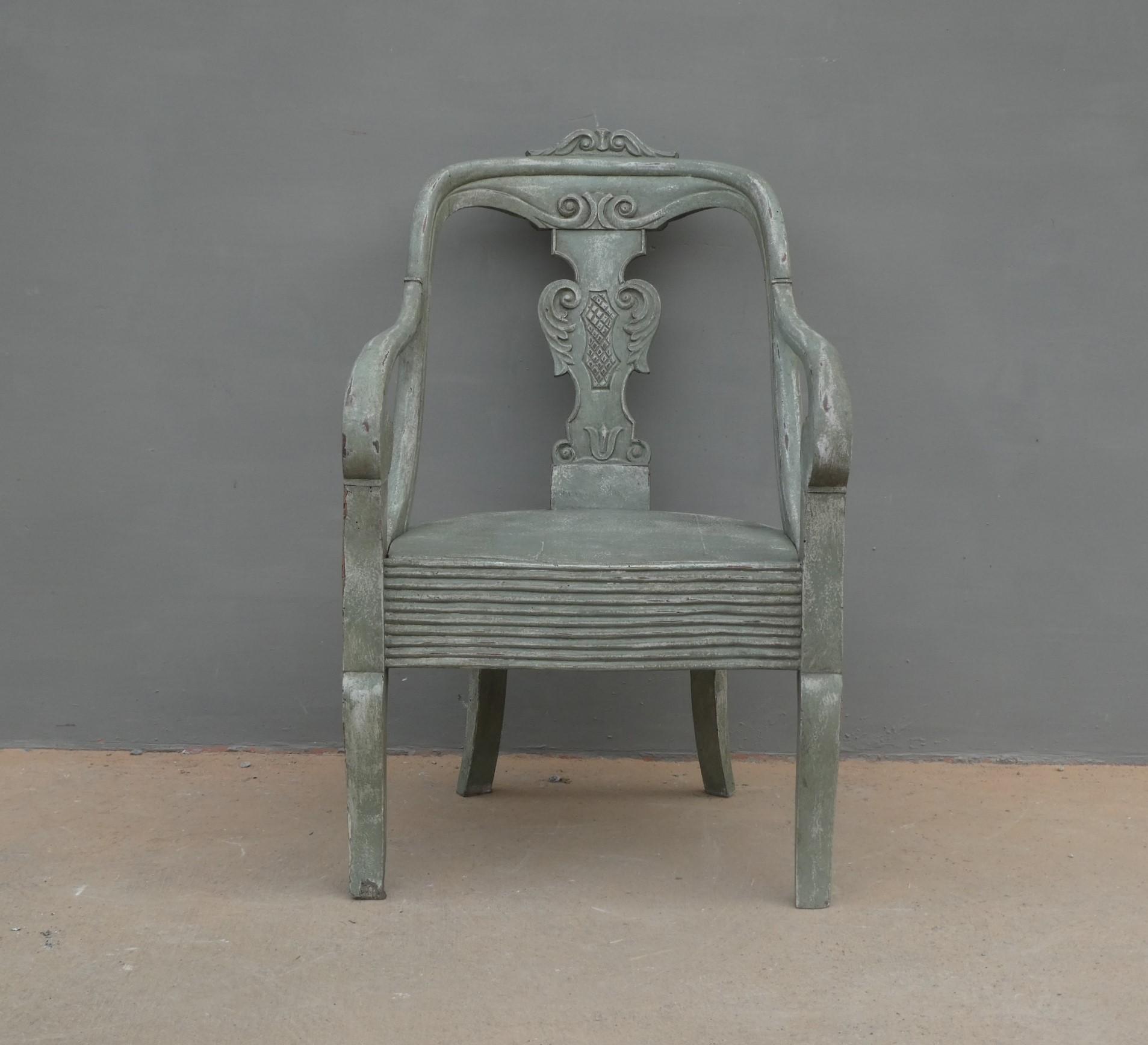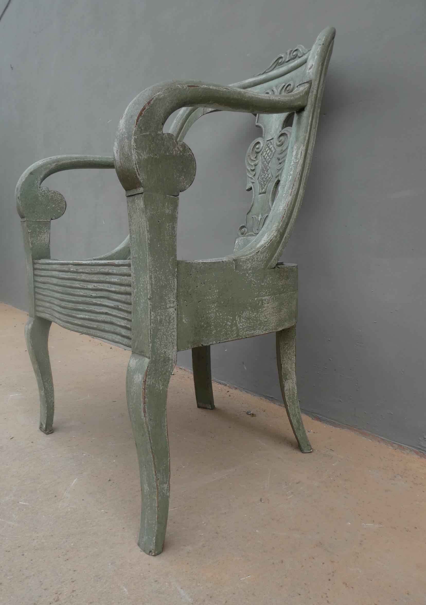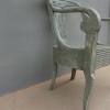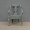 Poltrona singola Carlo X realizzata in legno con seduta in legno (non coeva), laccata e rifinita con la tecnica “Shabby Chic” ed appartenente d’epoca alla metà dell’800. Questo stile predilige schienali lavorati ed avvolgenti, minuziosi intagli, e gambe anteriori che formano con i supporti dei lavorati braccioli un solo elemento. Presenta qualche foro di tarlo.