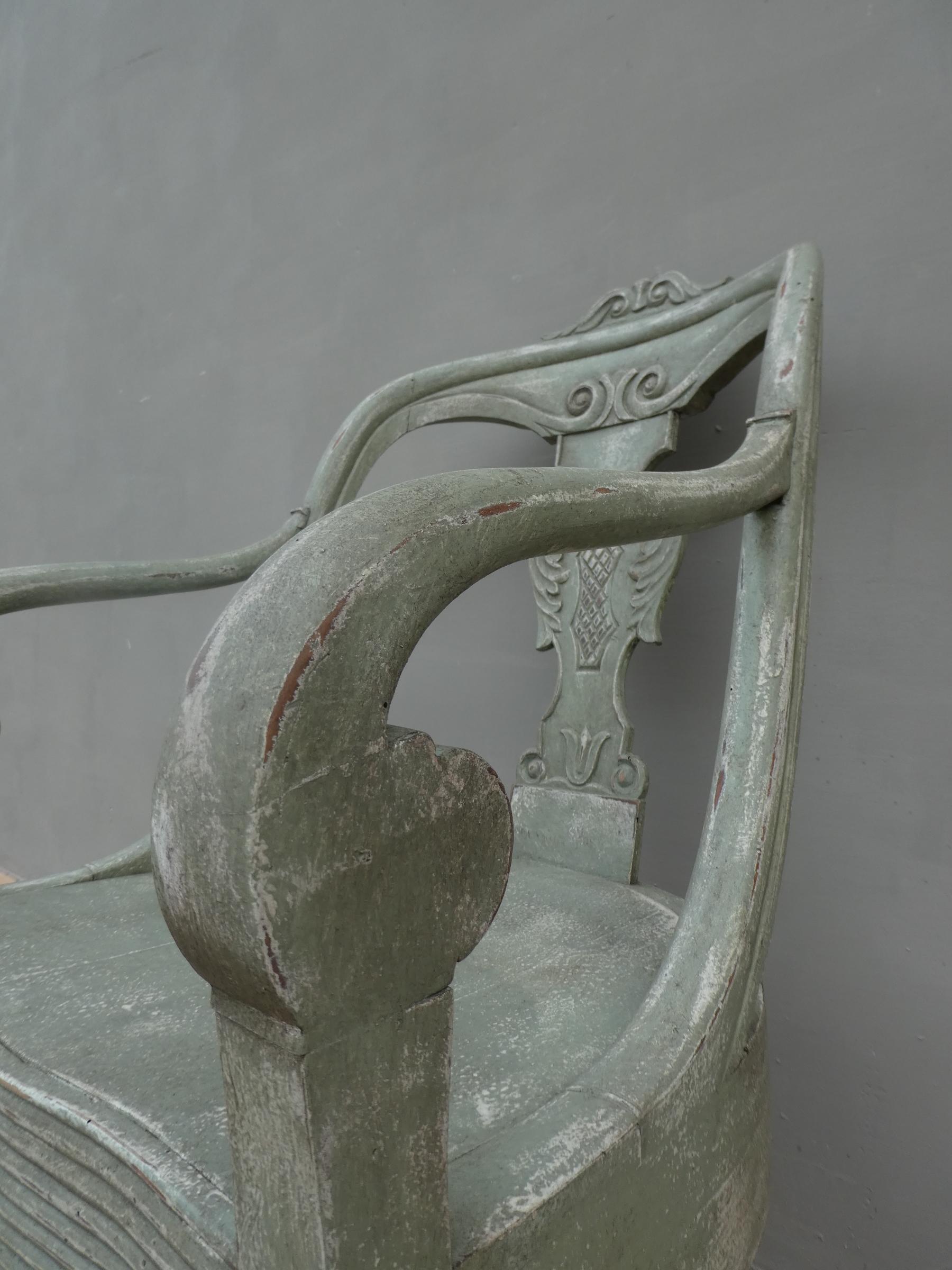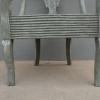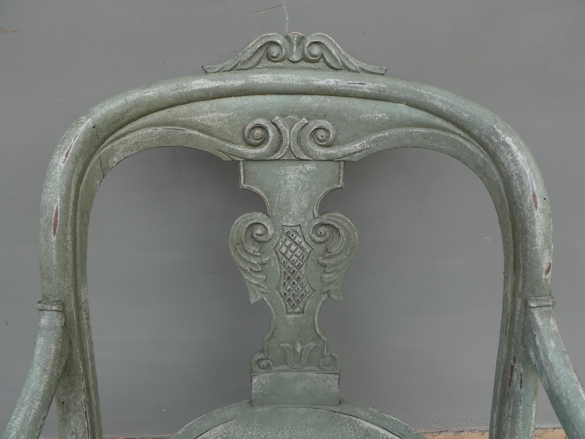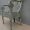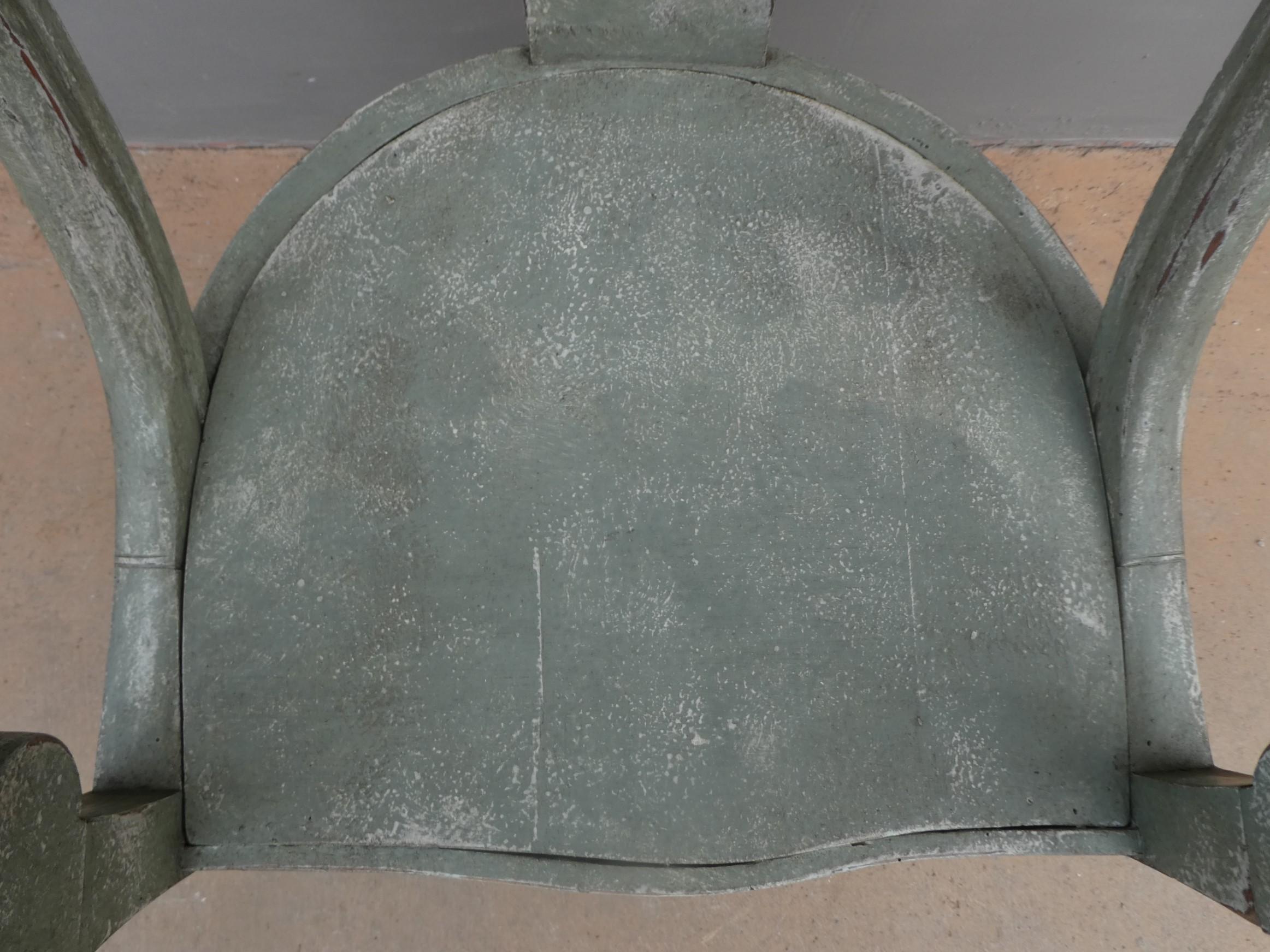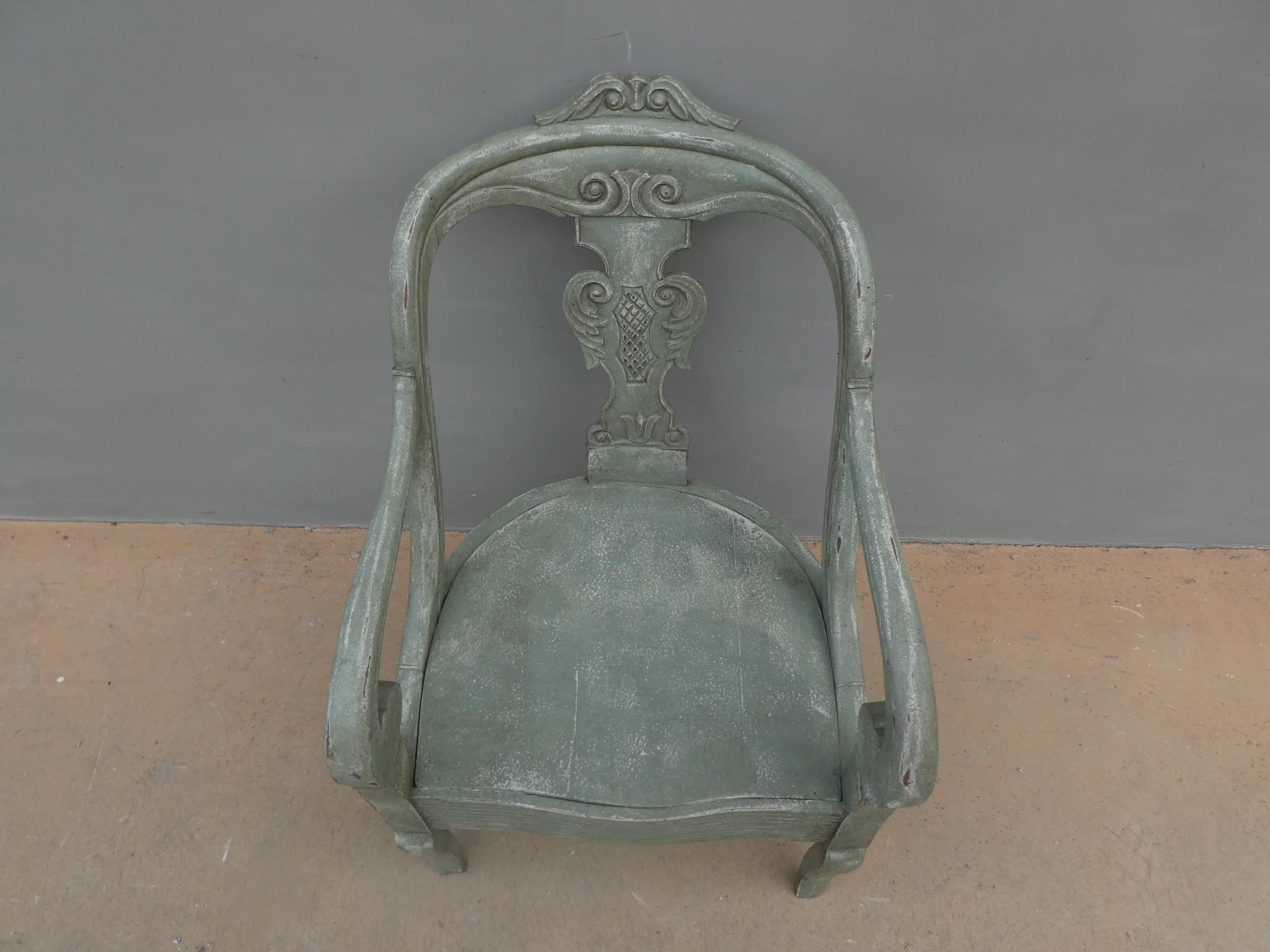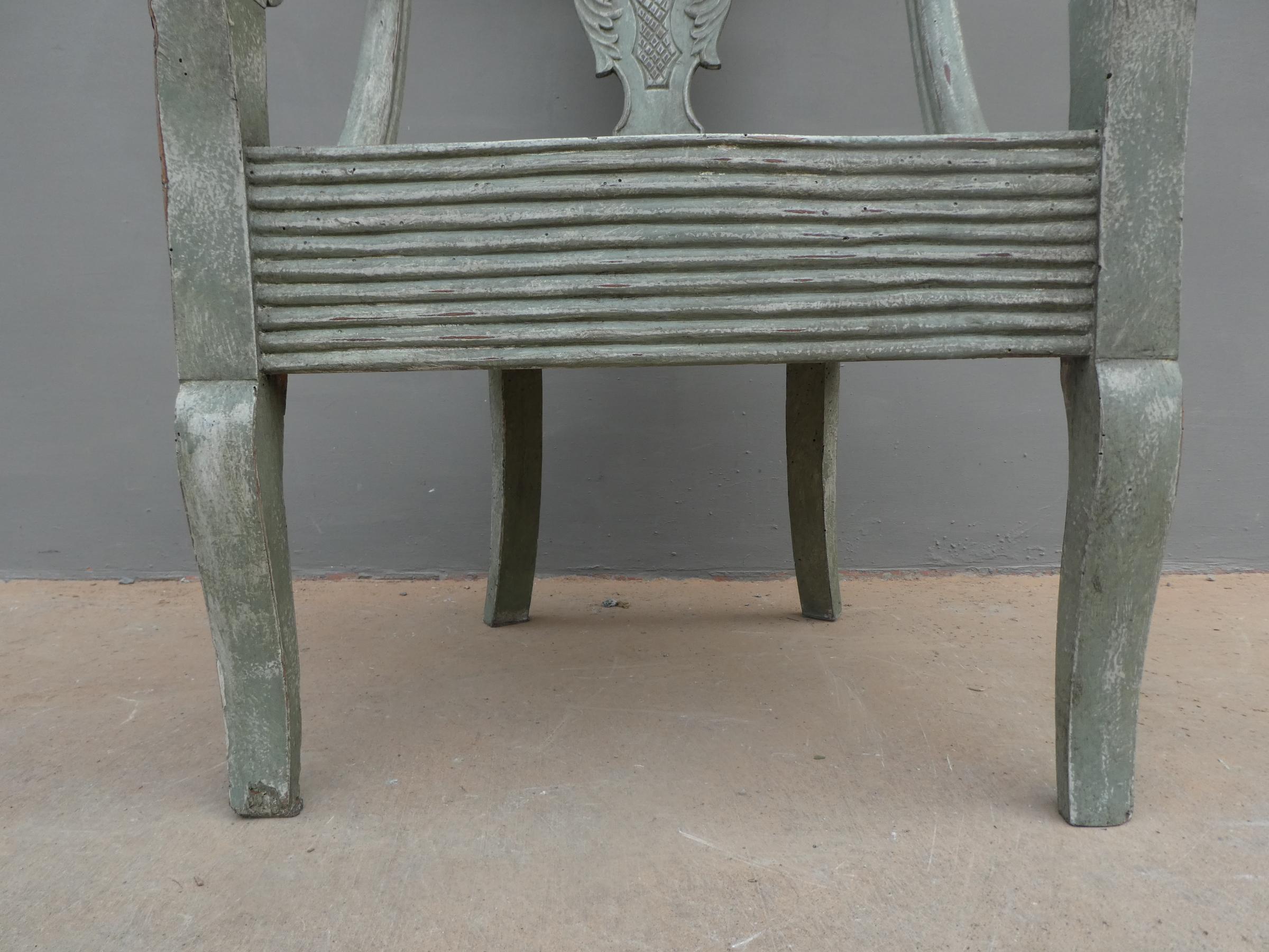 Poltrona singola Carlo X realizzata in legno con seduta in legno (non coeva), laccata e rifinita con la tecnica “Shabby Chic” ed appartenente d’epoca alla metà dell’800. Questo stile predilige schienali lavorati ed avvolgenti, minuziosi intagli, e gambe anteriori che formano con i supporti dei lavorati braccioli un solo elemento. Presenta qualche foro di tarlo.
