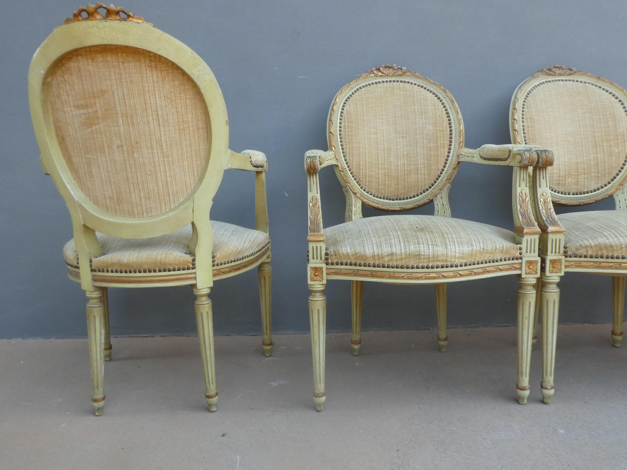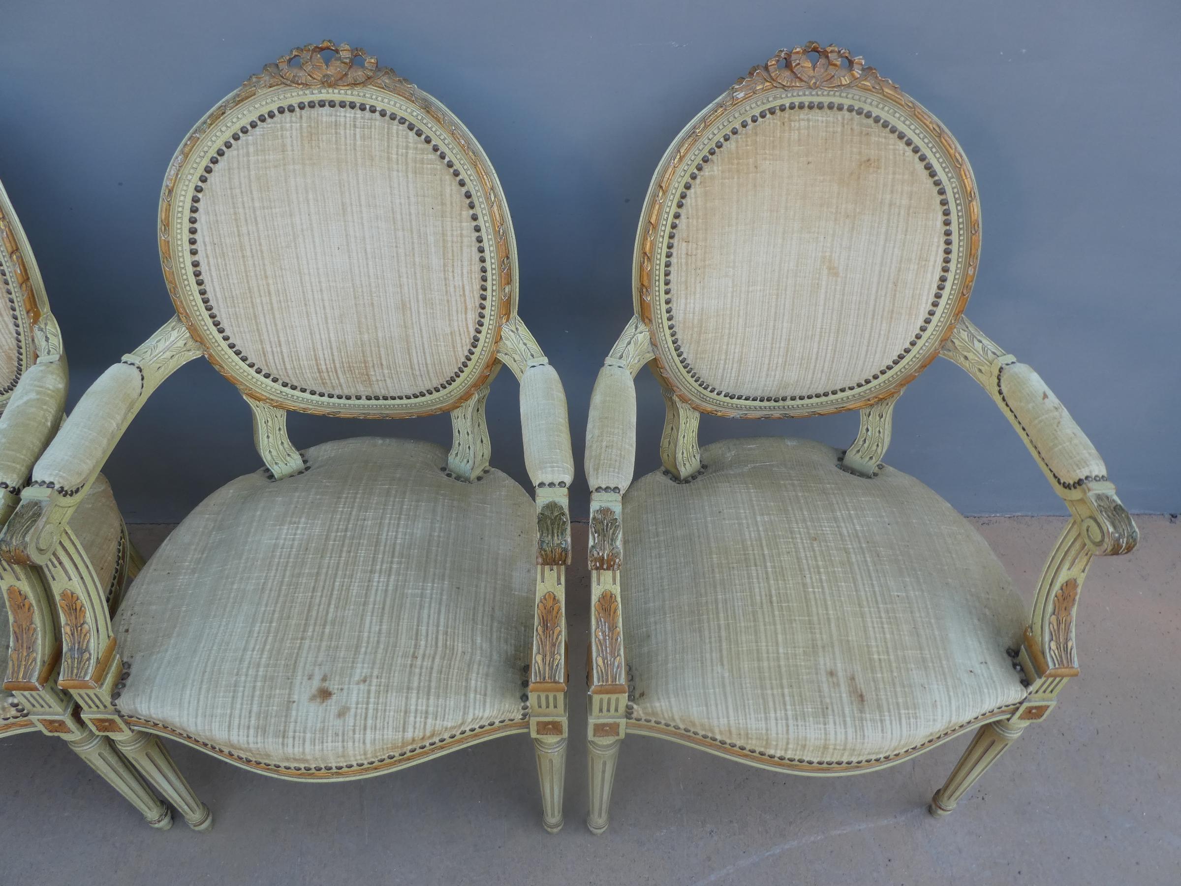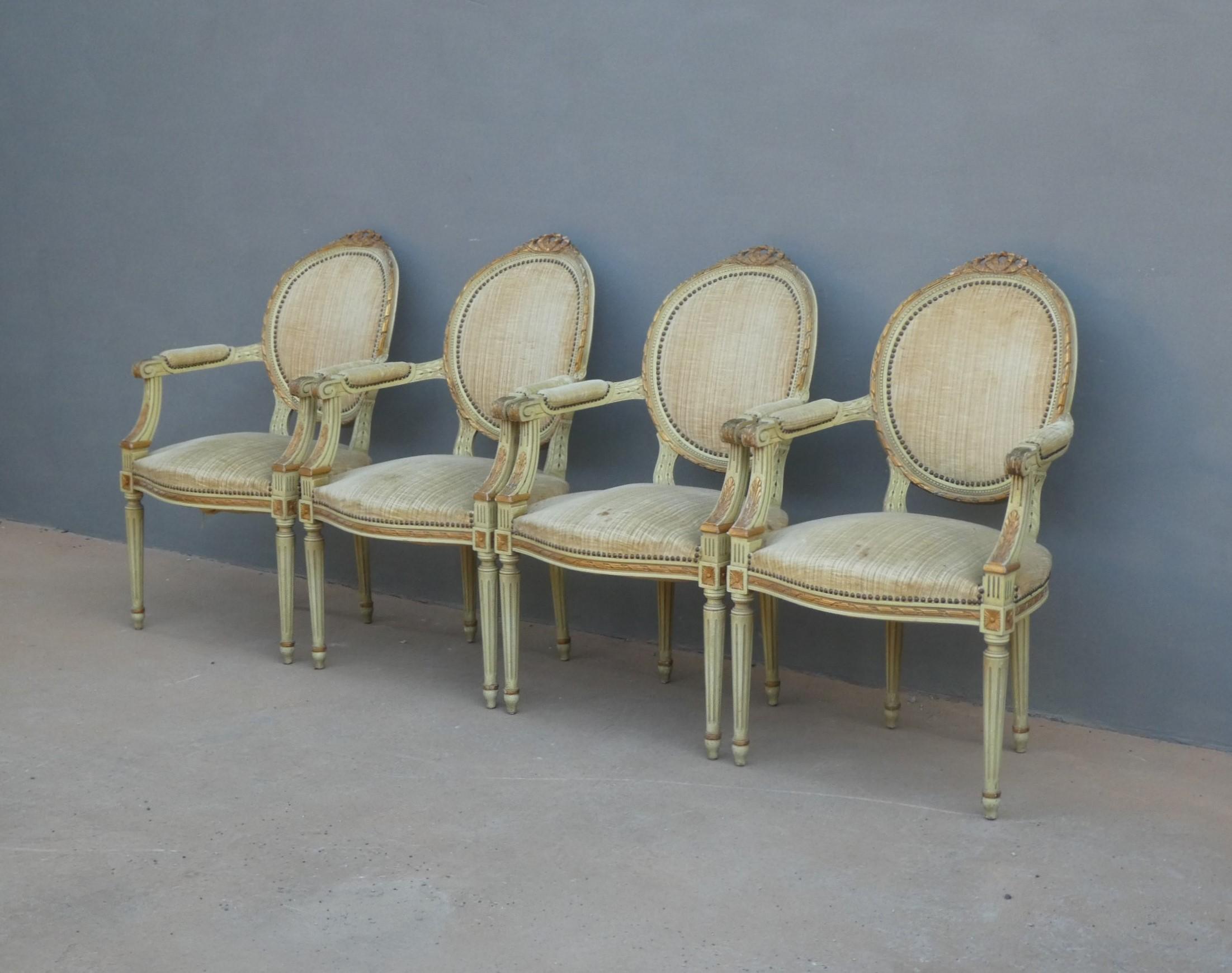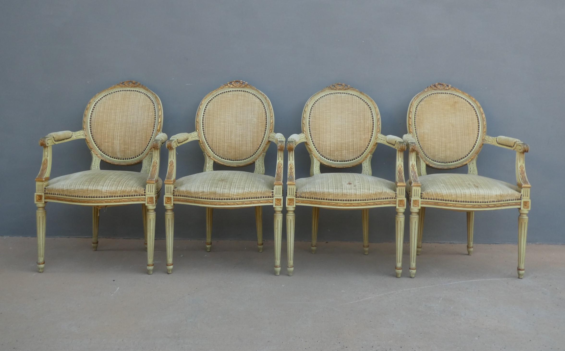 Quattro poltrone stile Luigi XVI con schienale a ‘medaglione’, laccate e dorate, rivestite interamente in tessuto (macchiato in alcuni punti). Un caratteristico esempio di seduta dalla raffinata eleganza: decorata con ‘dadi’ agli angoli della cintura, arricchiti da un motivo floreale interno, sostenuta da gambe rastremate verso il basso ed impreziosite con delicate sgusciature. Necessitano di piccoli interventi di restauro (foto). Epoca metà ‘900.