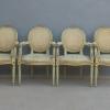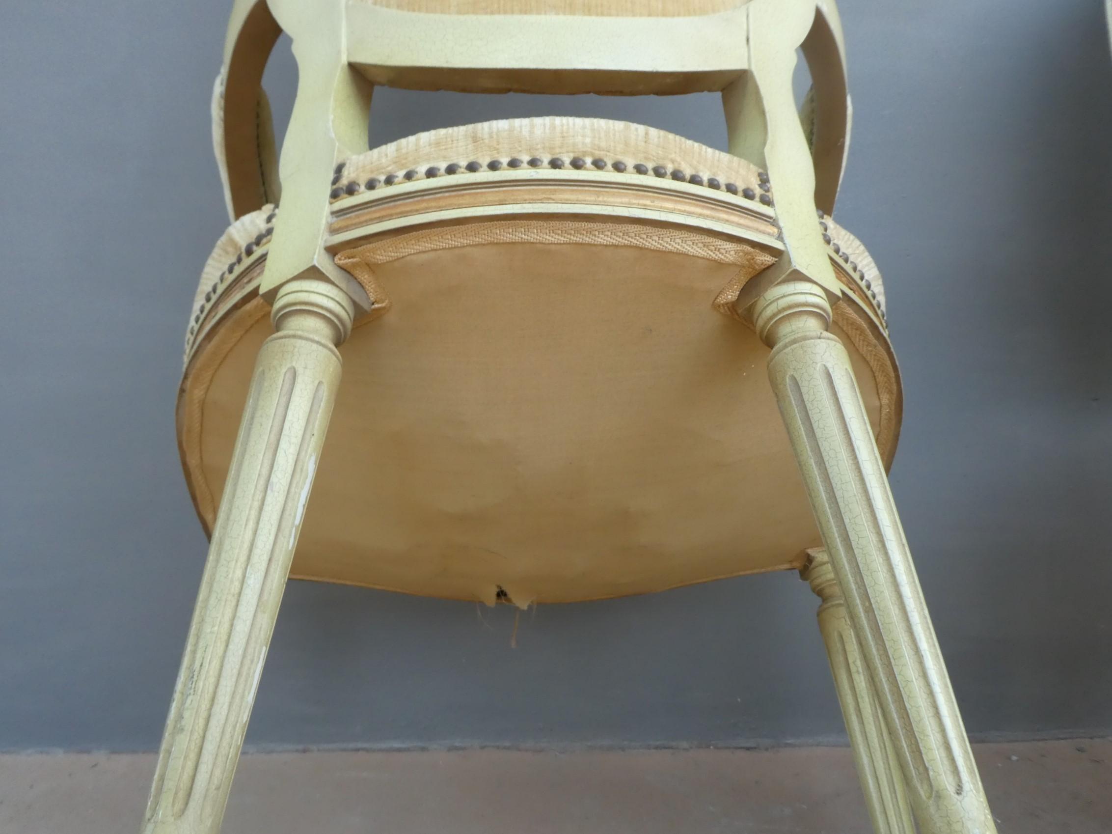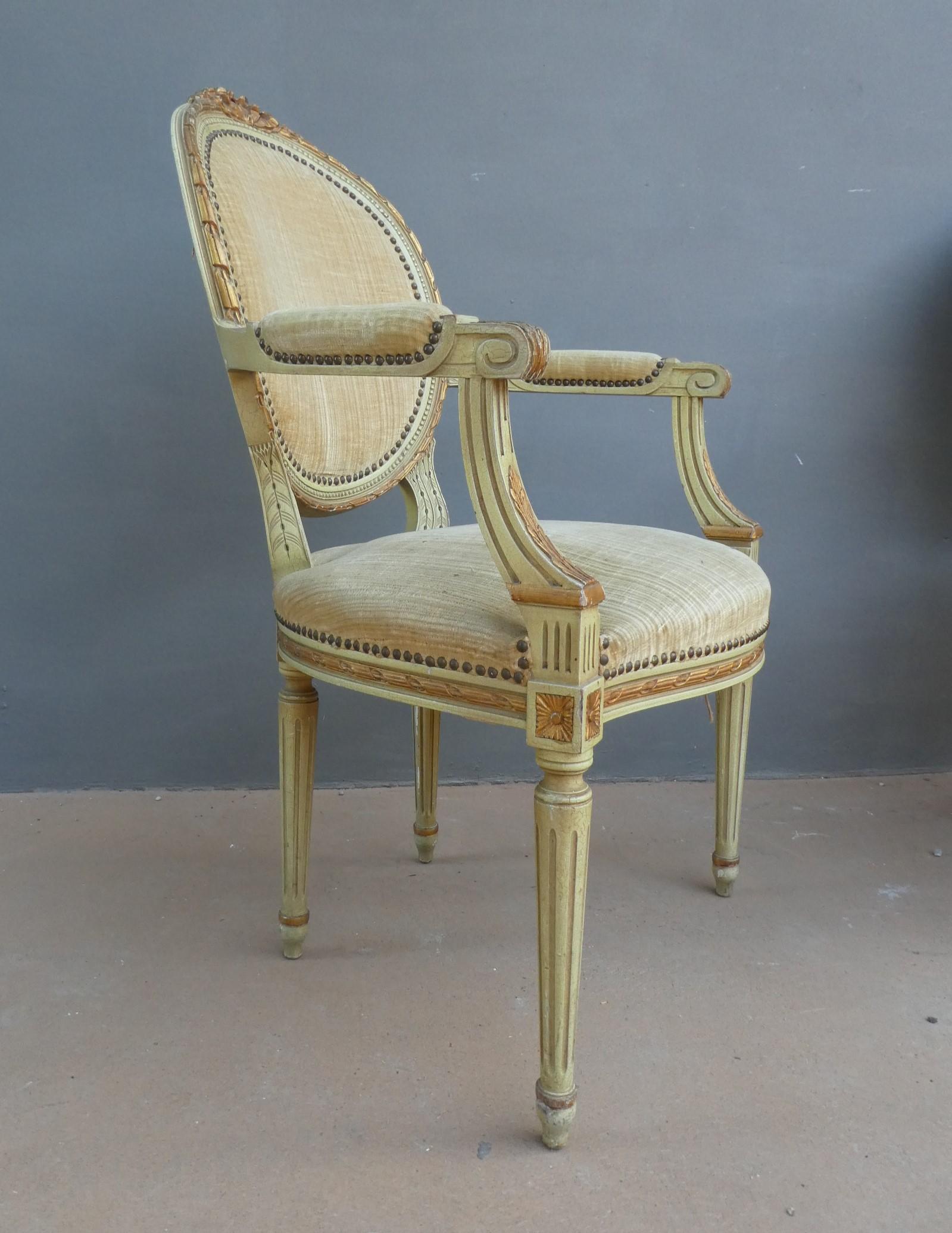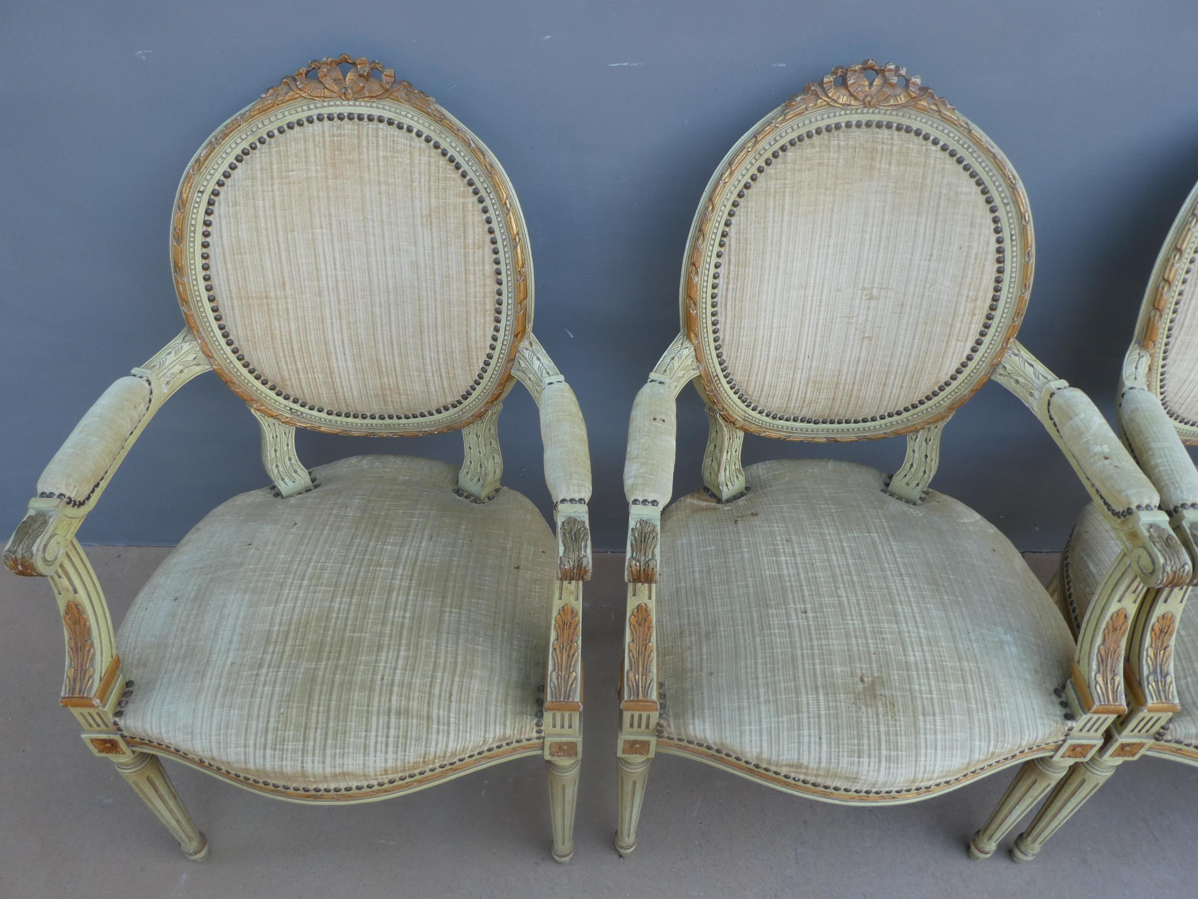 Quattro poltrone stile Luigi XVI con schienale a ‘medaglione’, laccate e dorate, rivestite interamente in tessuto (macchiato in alcuni punti). Un caratteristico esempio di seduta dalla raffinata eleganza: decorata con ‘dadi’ agli angoli della cintura, arricchiti da un motivo floreale interno, sostenuta da gambe rastremate verso il basso ed impreziosite con delicate sgusciature. Necessitano di piccoli interventi di restauro (foto). Epoca metà ‘900.