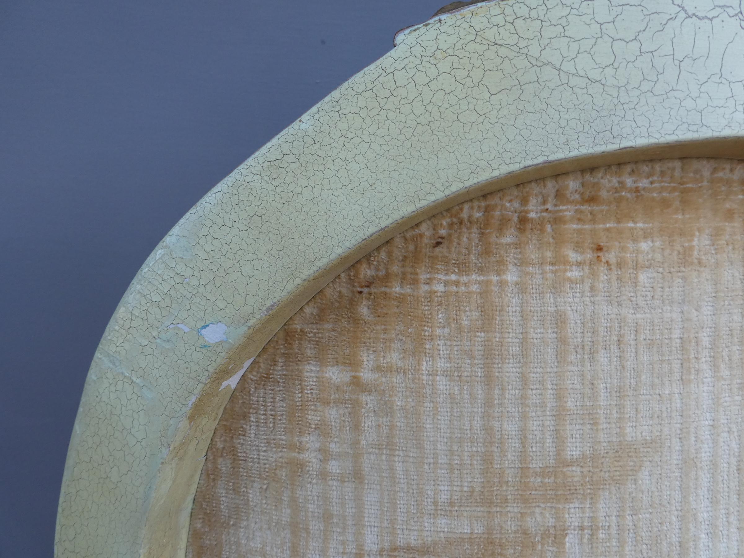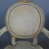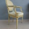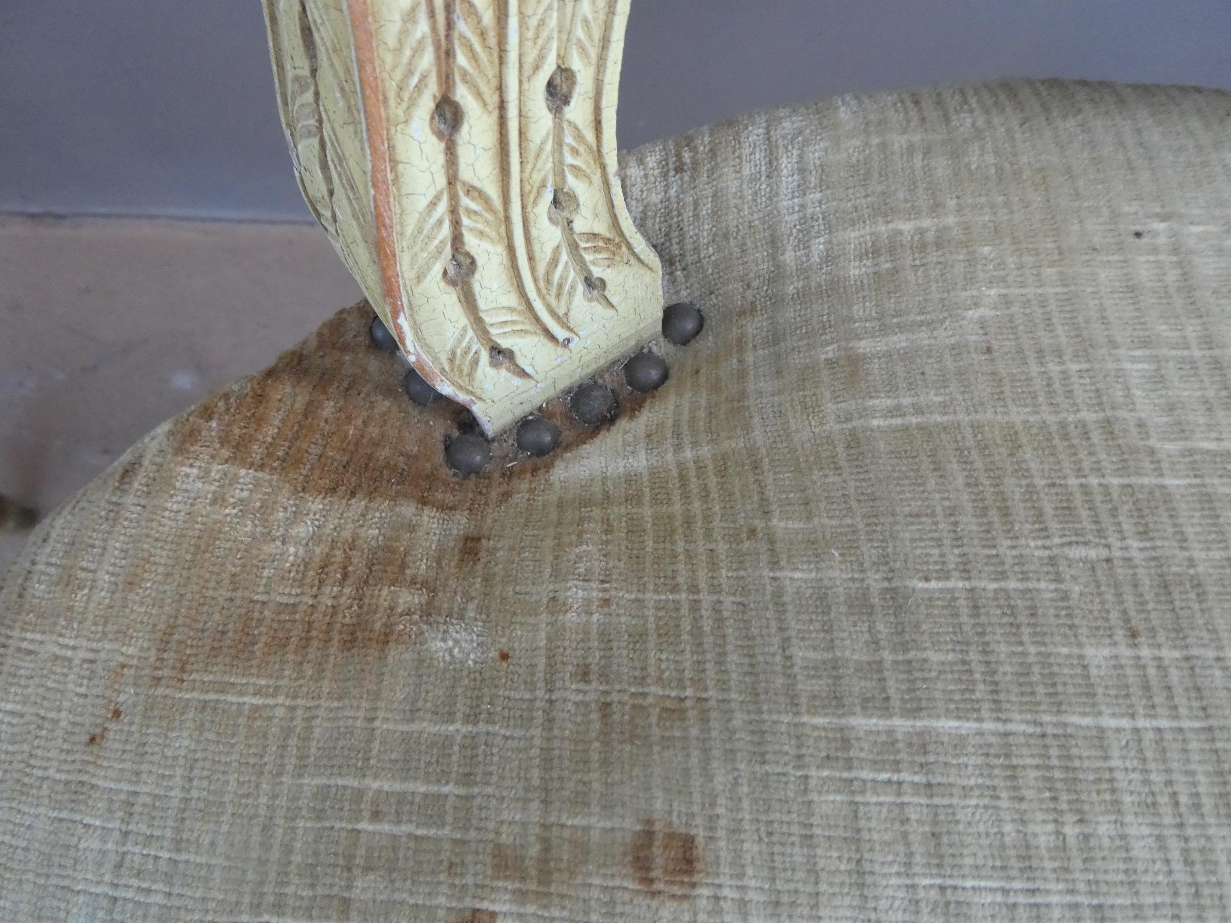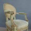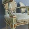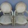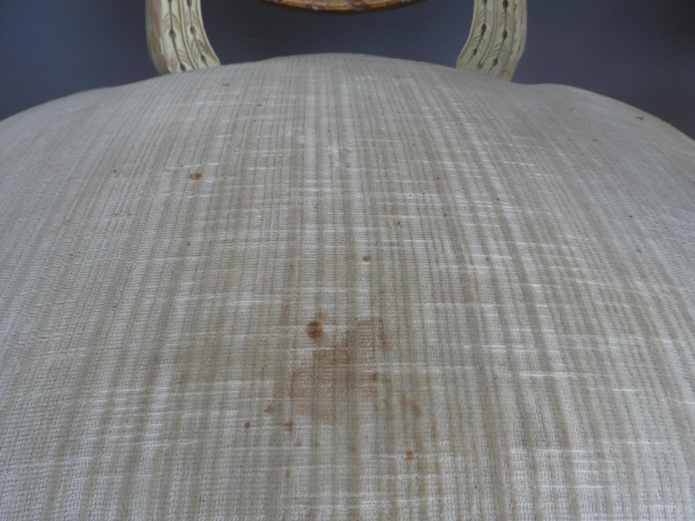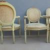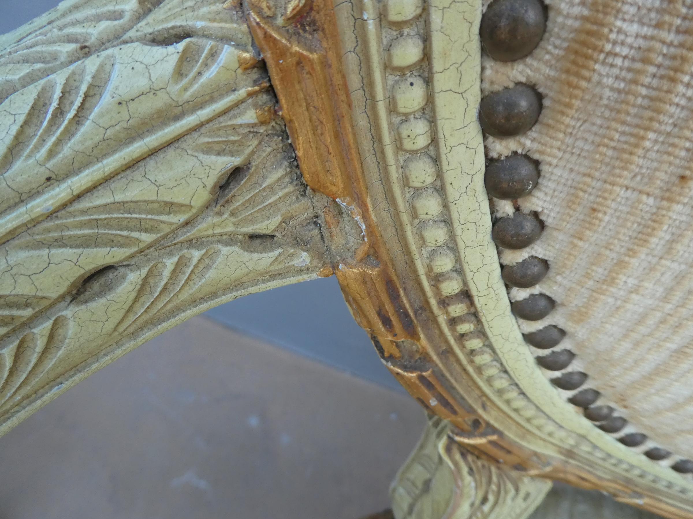 Quattro poltrone stile Luigi XVI con schienale a ‘medaglione’, laccate e dorate, rivestite interamente in tessuto (macchiato in alcuni punti). Un caratteristico esempio di seduta dalla raffinata eleganza: decorata con ‘dadi’ agli angoli della cintura, arricchiti da un motivo floreale interno, sostenuta da gambe rastremate verso il basso ed impreziosite con delicate sgusciature. Necessitano di piccoli interventi di restauro (foto). Epoca metà ‘900.