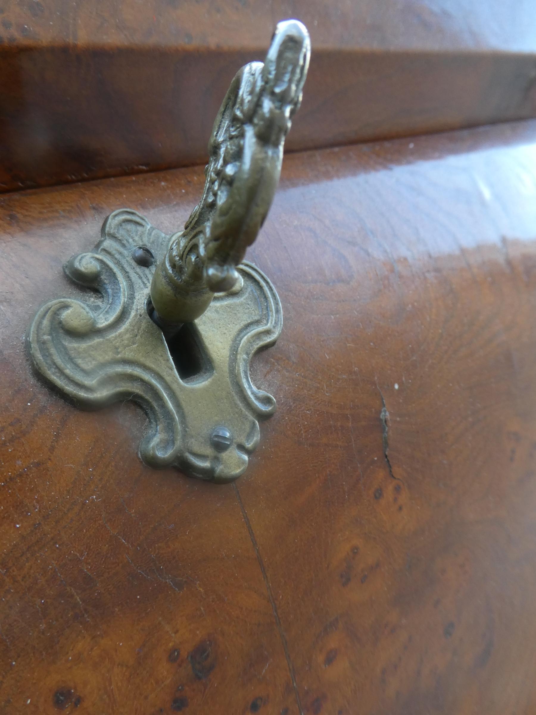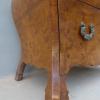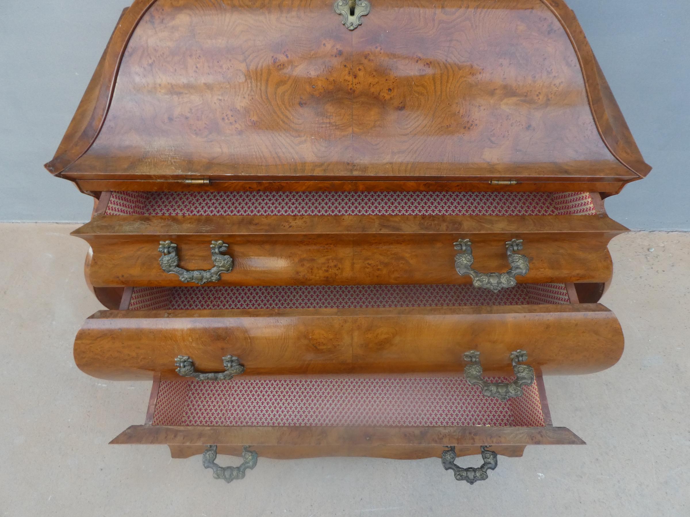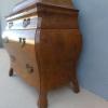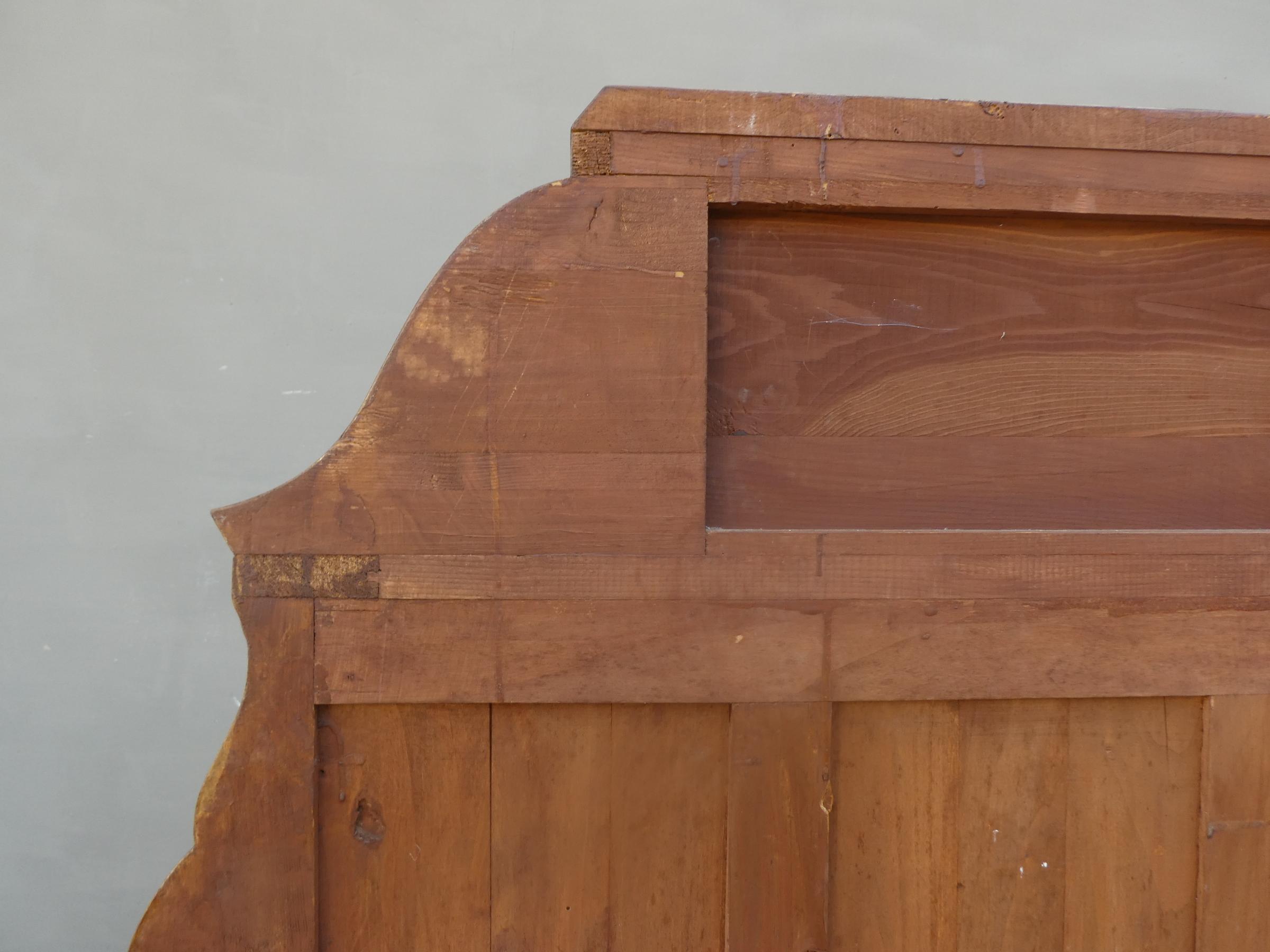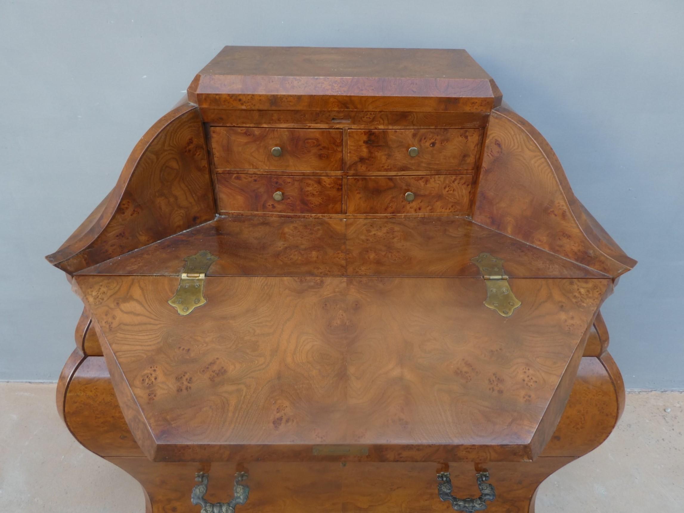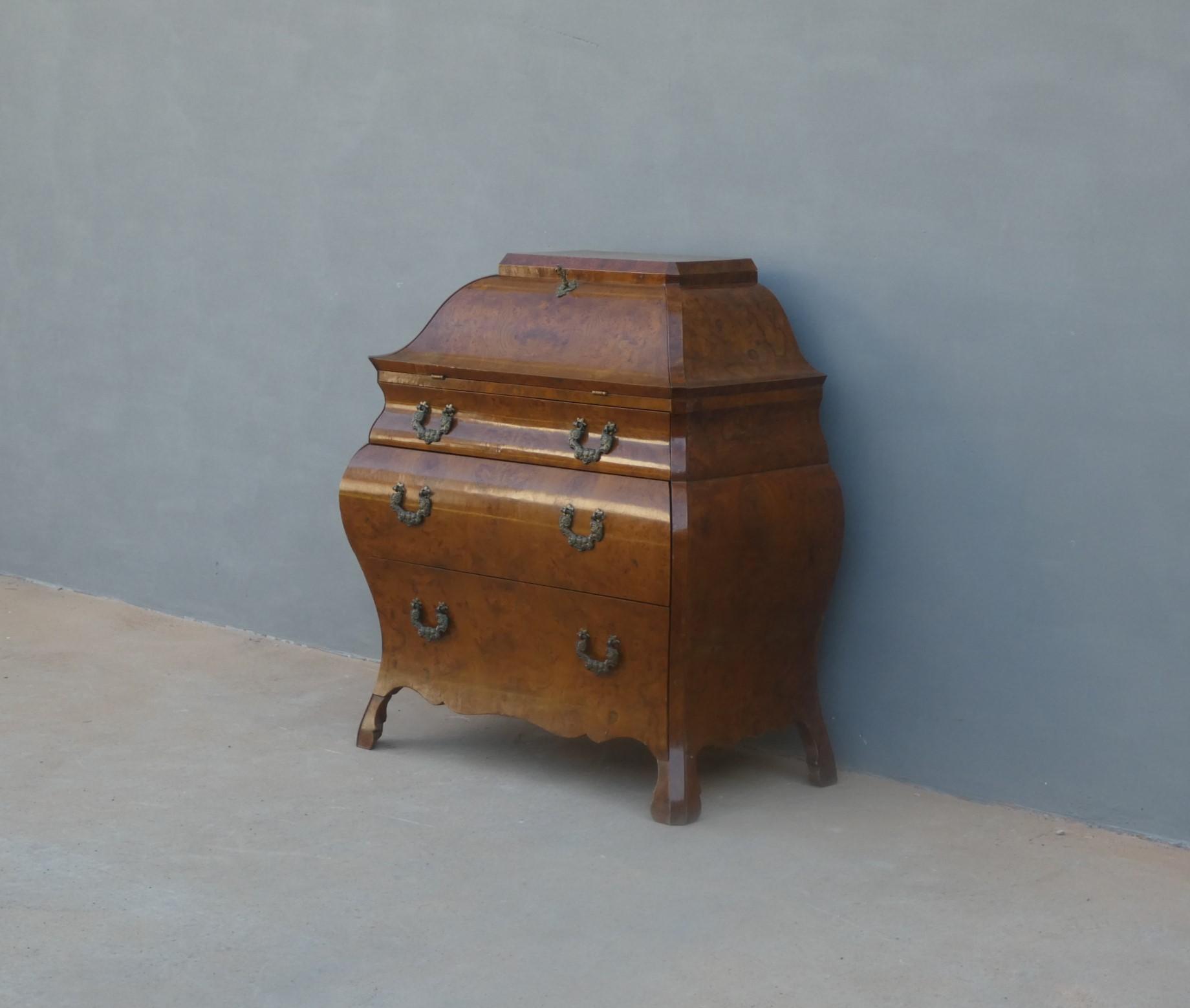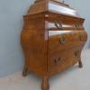 Ribalta ad urna con calatoia a scrittoio dotata di tre cassetti frontali ed appartenente d’epoca alla metà del ‘900. La ricerca di un decoro mirato sta principalmente nella sua stessa struttura, dove la linea curva diventa uno degli elementi principali di decorazione. Studiata anche la scelta d’impreziosire il corpo con la lastronatura in olmo, un’essenza nota e raffinata, facilmente riconoscibile grazie ai fitti motivi marezzati che crea. La calatoia frontale cela al suo interno un piano scrittura e dei cassettini. Necessita di leggeri interventi di restauro (foto).