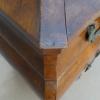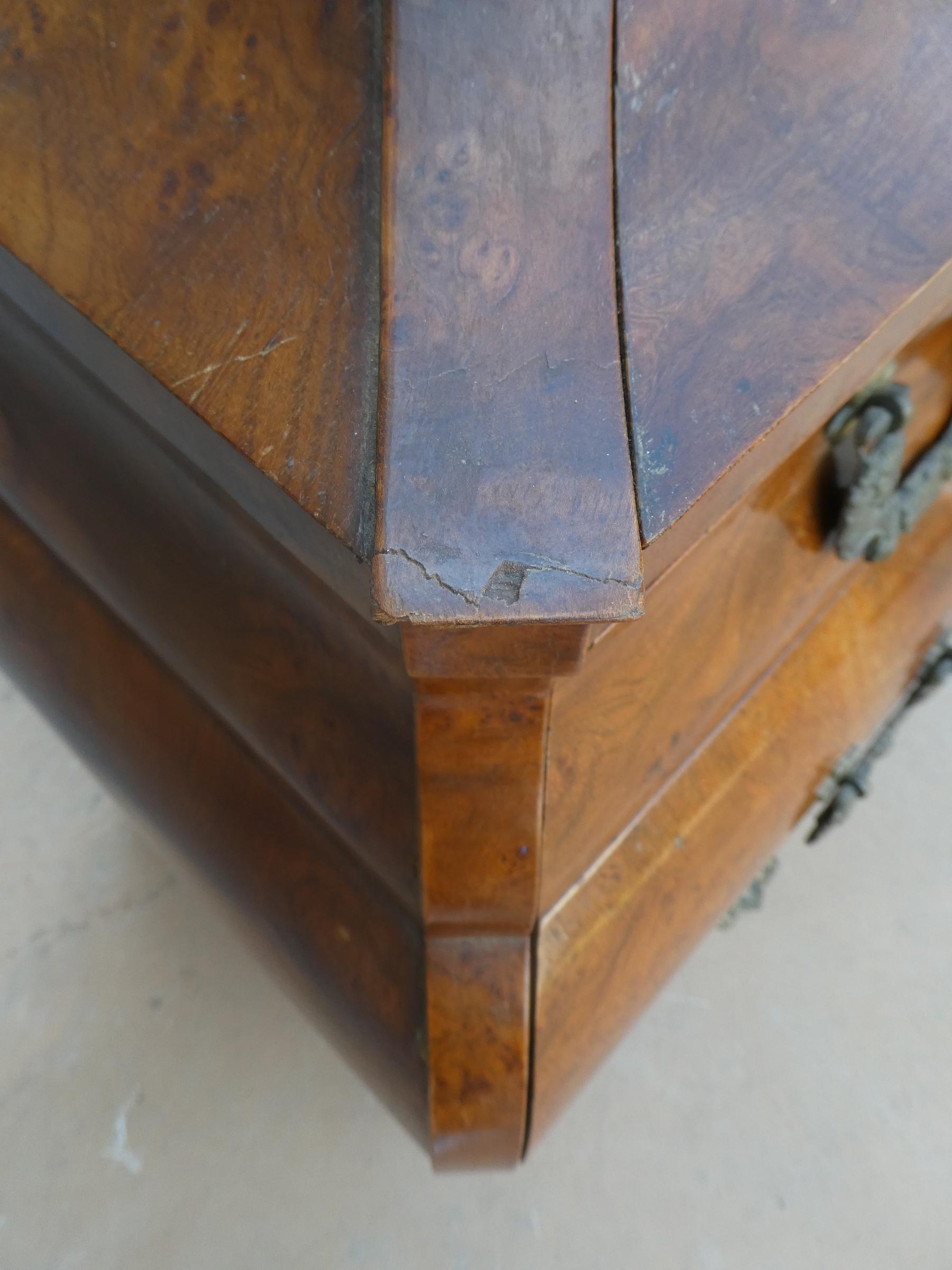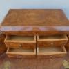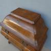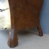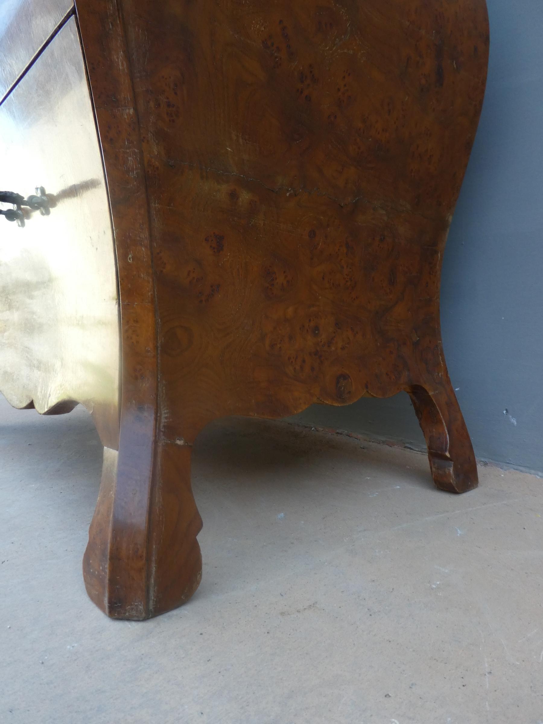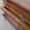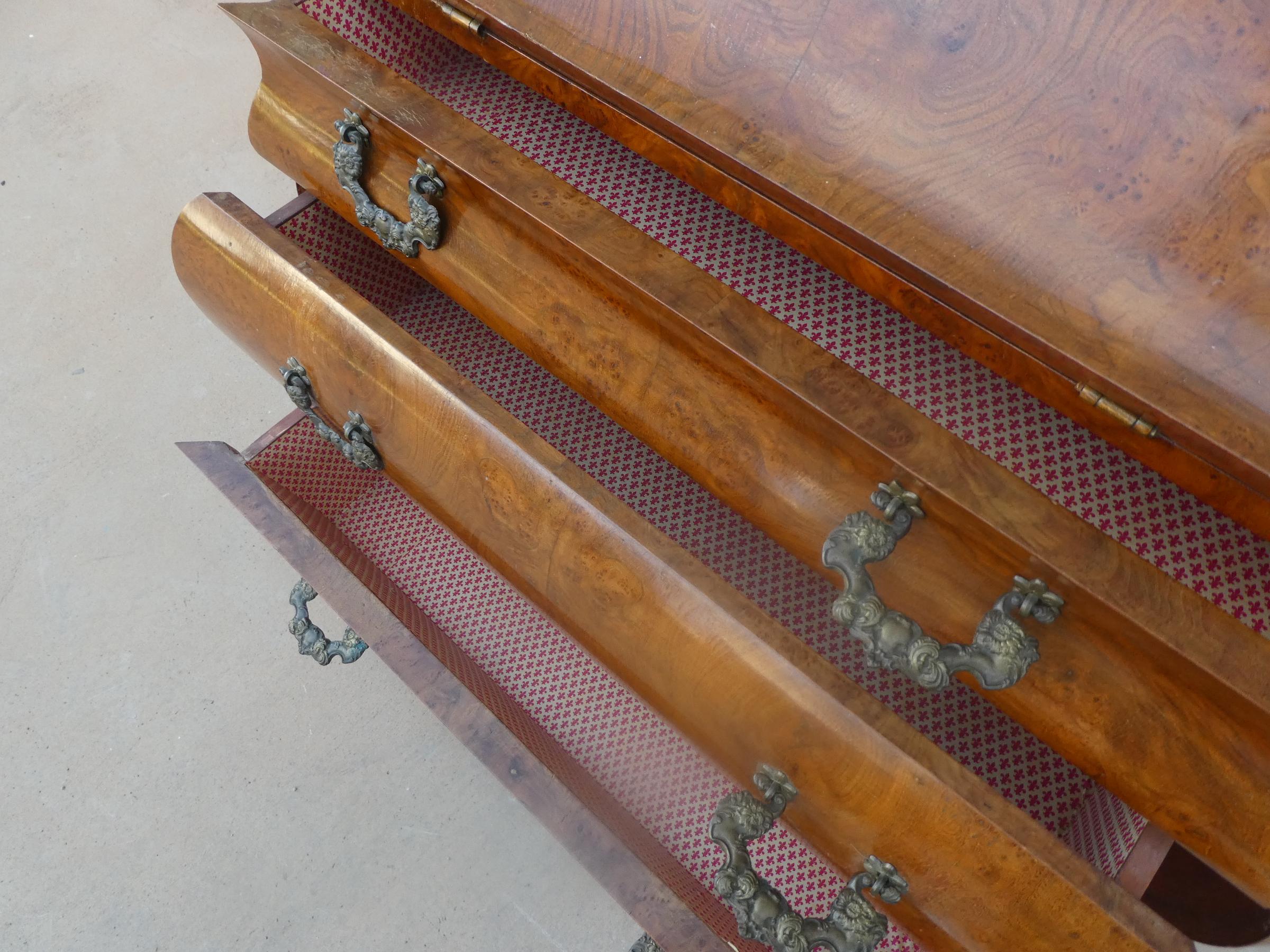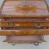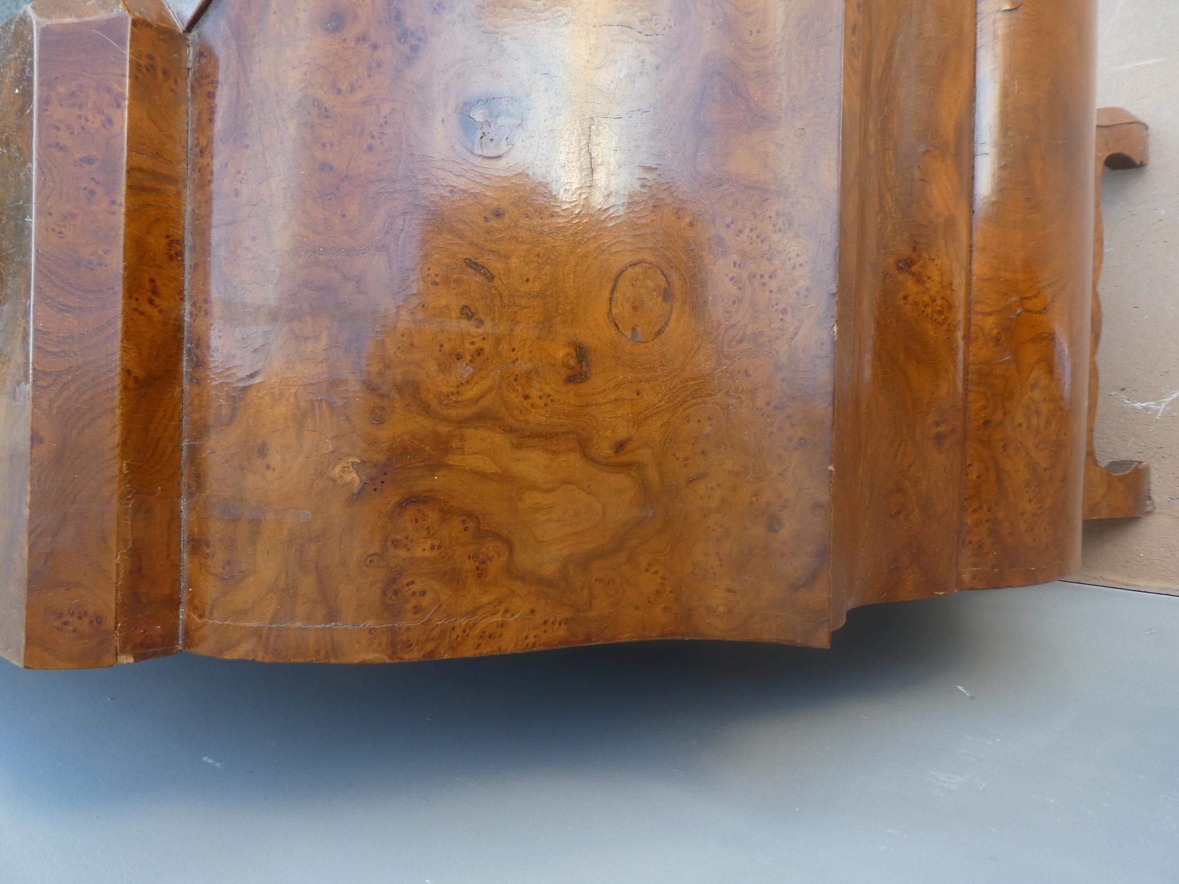 Ribalta ad urna con calatoia a scrittoio dotata di tre cassetti frontali ed appartenente d’epoca alla metà del ‘900. La ricerca di un decoro mirato sta principalmente nella sua stessa struttura, dove la linea curva diventa uno degli elementi principali di decorazione. Studiata anche la scelta d’impreziosire il corpo con la lastronatura in olmo, un’essenza nota e raffinata, facilmente riconoscibile grazie ai fitti motivi marezzati che crea. La calatoia frontale cela al suo interno un piano scrittura e dei cassettini. Necessita di leggeri interventi di restauro (foto).