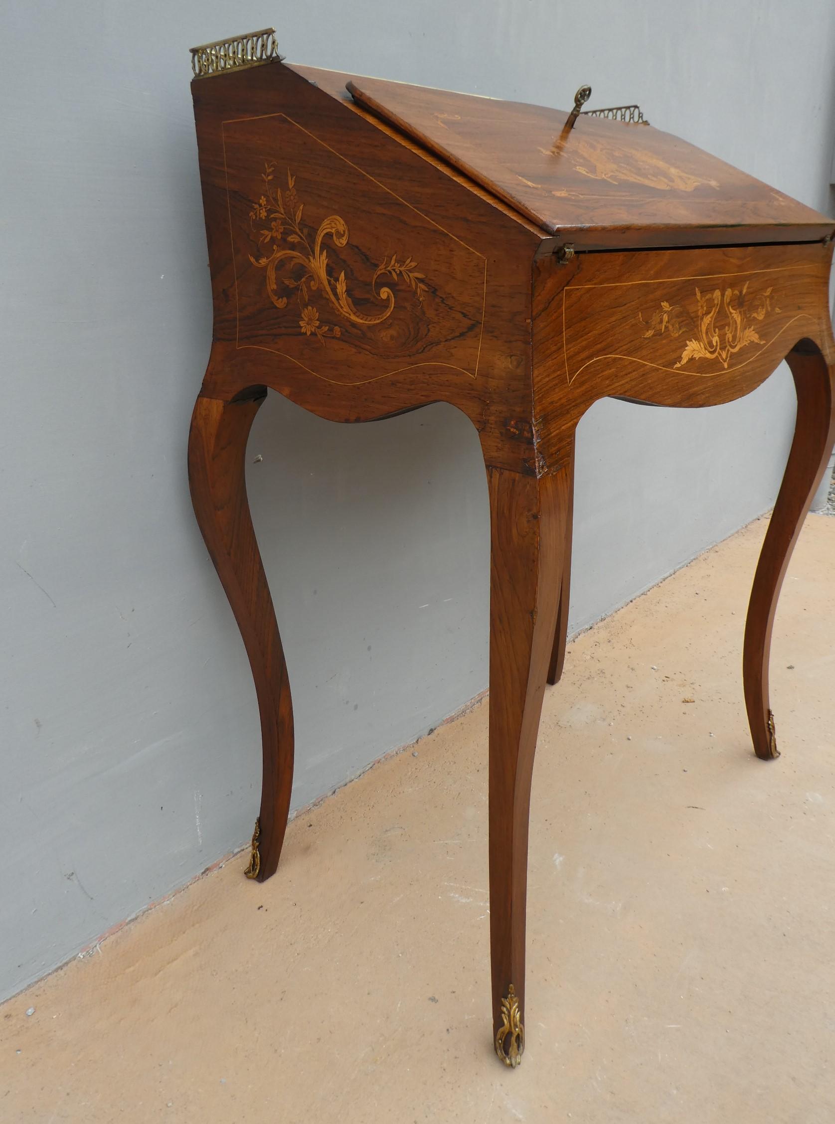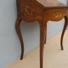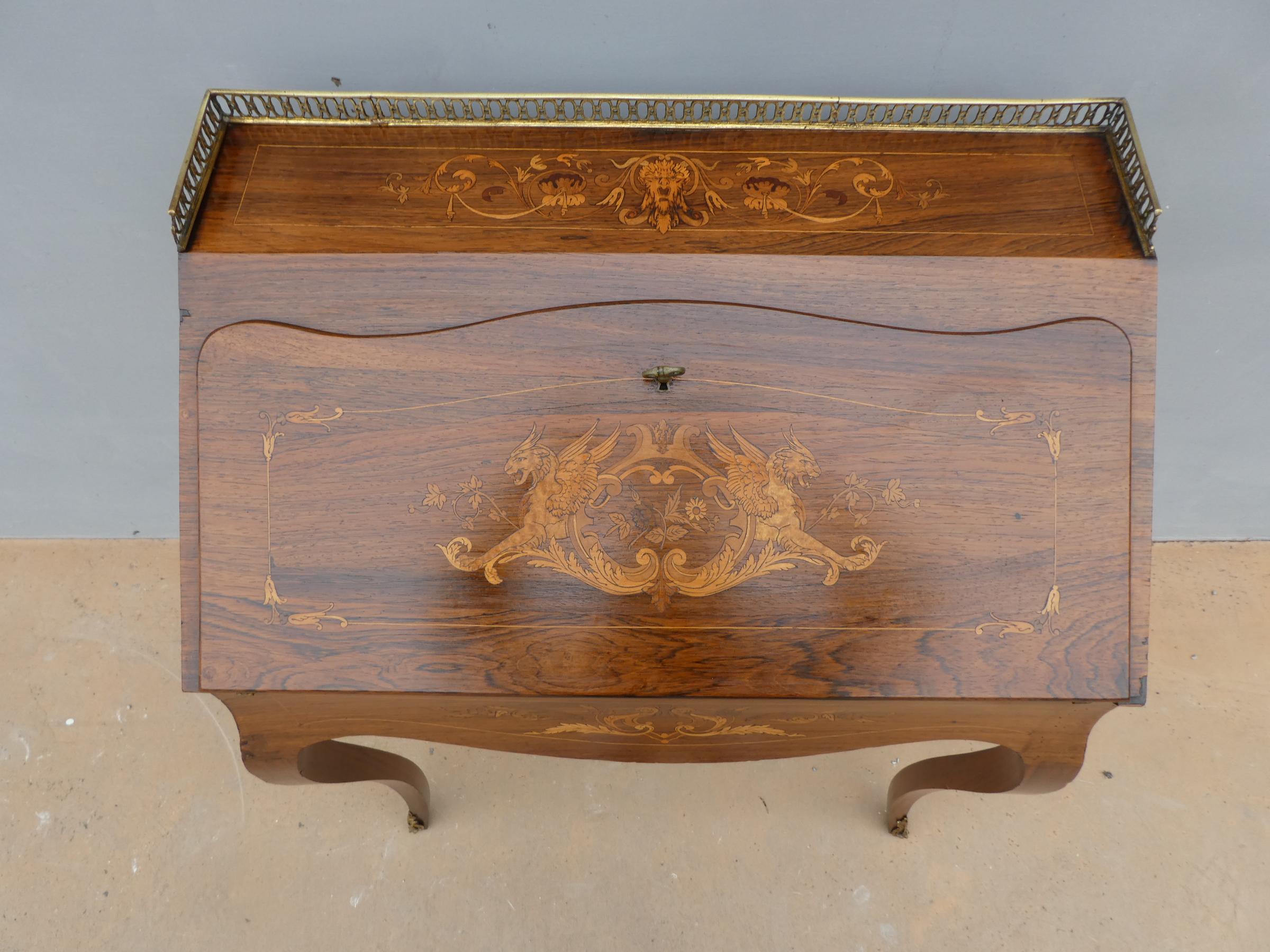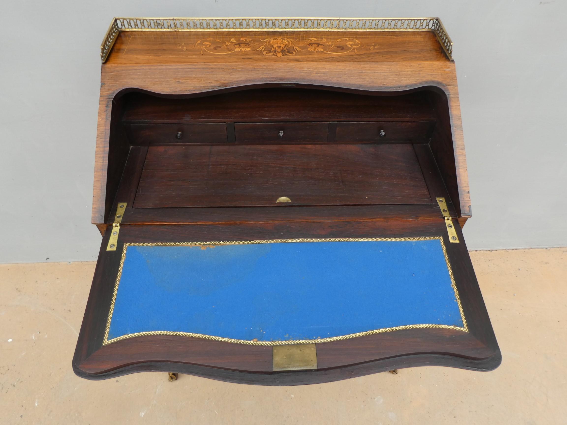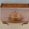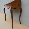 Ribalta Napoleone III dotata di una calatoia a scrittoio, appartenente d’epoca alla fine dell’800. La struttura, sorretta dai lunghi ed incurvati montanti, si presenta leggera ed armoniosa. E’ contraddistinta dall’uso raffinato delle lucenti applicazioni e dai minuziosi intarsi, destinati a risaltare sull’elegante superficie impiallacciata in palissandro che fa da sfondo. All’interno cela dei cassettini, un’asse a sfilo ed un piano scrittura. Necessita di leggeri interventi di restauro (foto).