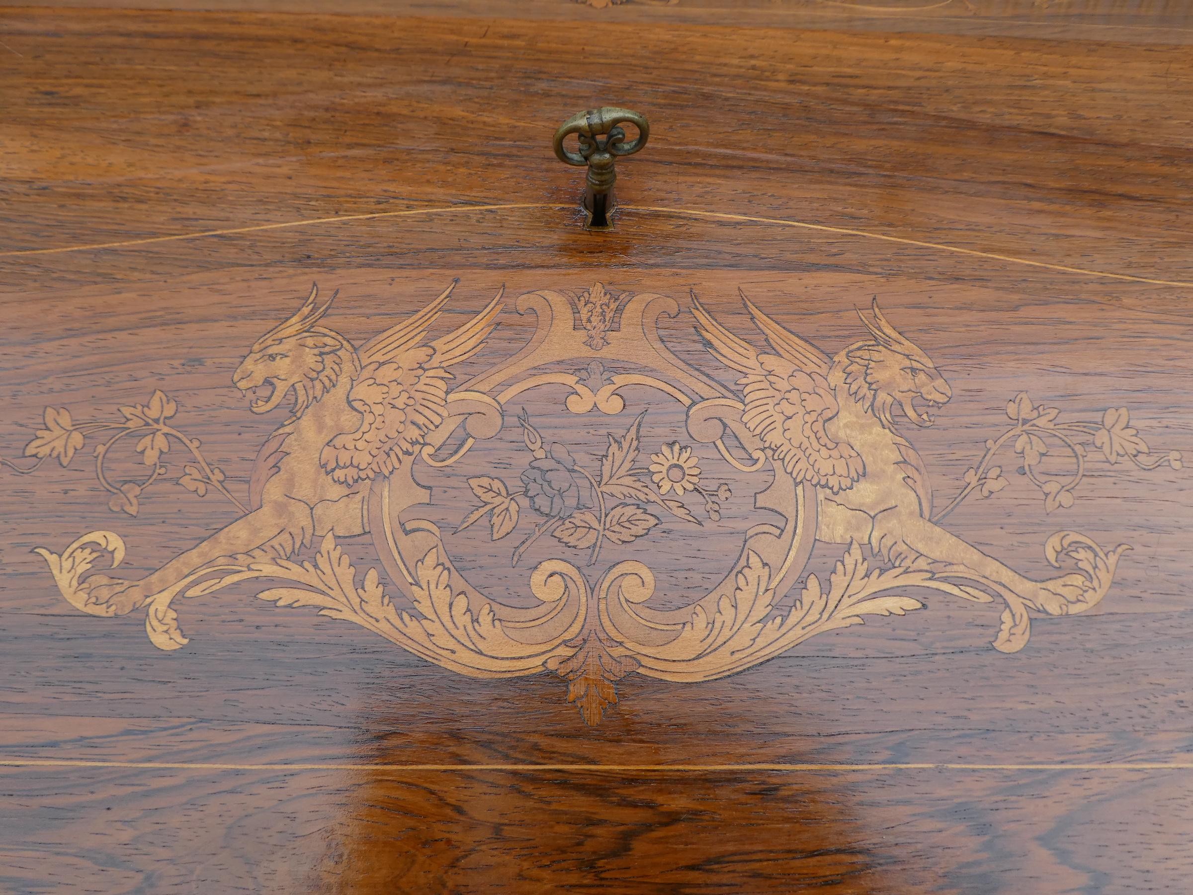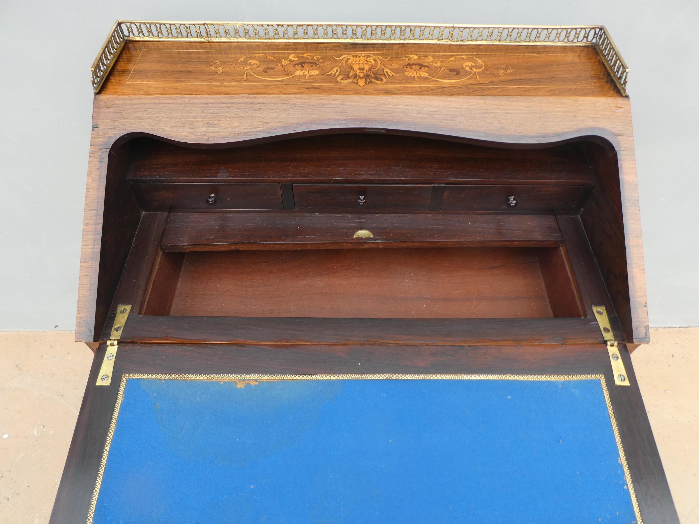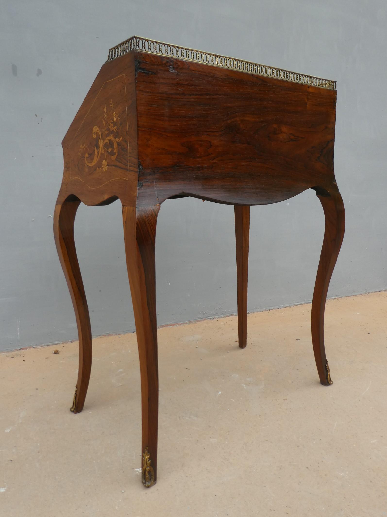 Ribalta Napoleone III dotata di una calatoia a scrittoio, appartenente d’epoca alla fine dell’800. La struttura, sorretta dai lunghi ed incurvati montanti, si presenta leggera ed armoniosa. E’ contraddistinta dall’uso raffinato delle lucenti applicazioni e dai minuziosi intarsi, destinati a risaltare sull’elegante superficie impiallacciata in palissandro che fa da sfondo. All’interno cela dei cassettini, un’asse a sfilo ed un piano scrittura. Necessita di leggeri interventi di restauro (foto).