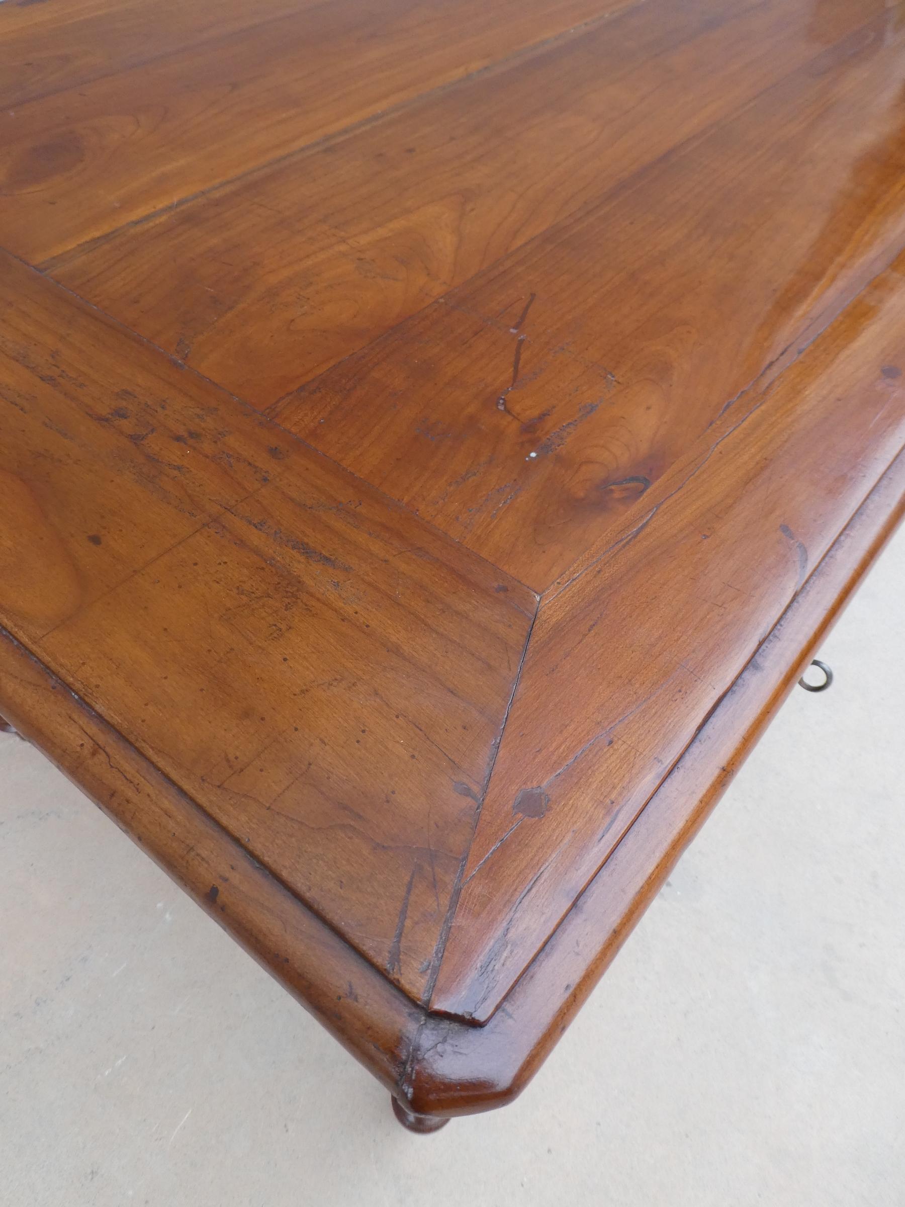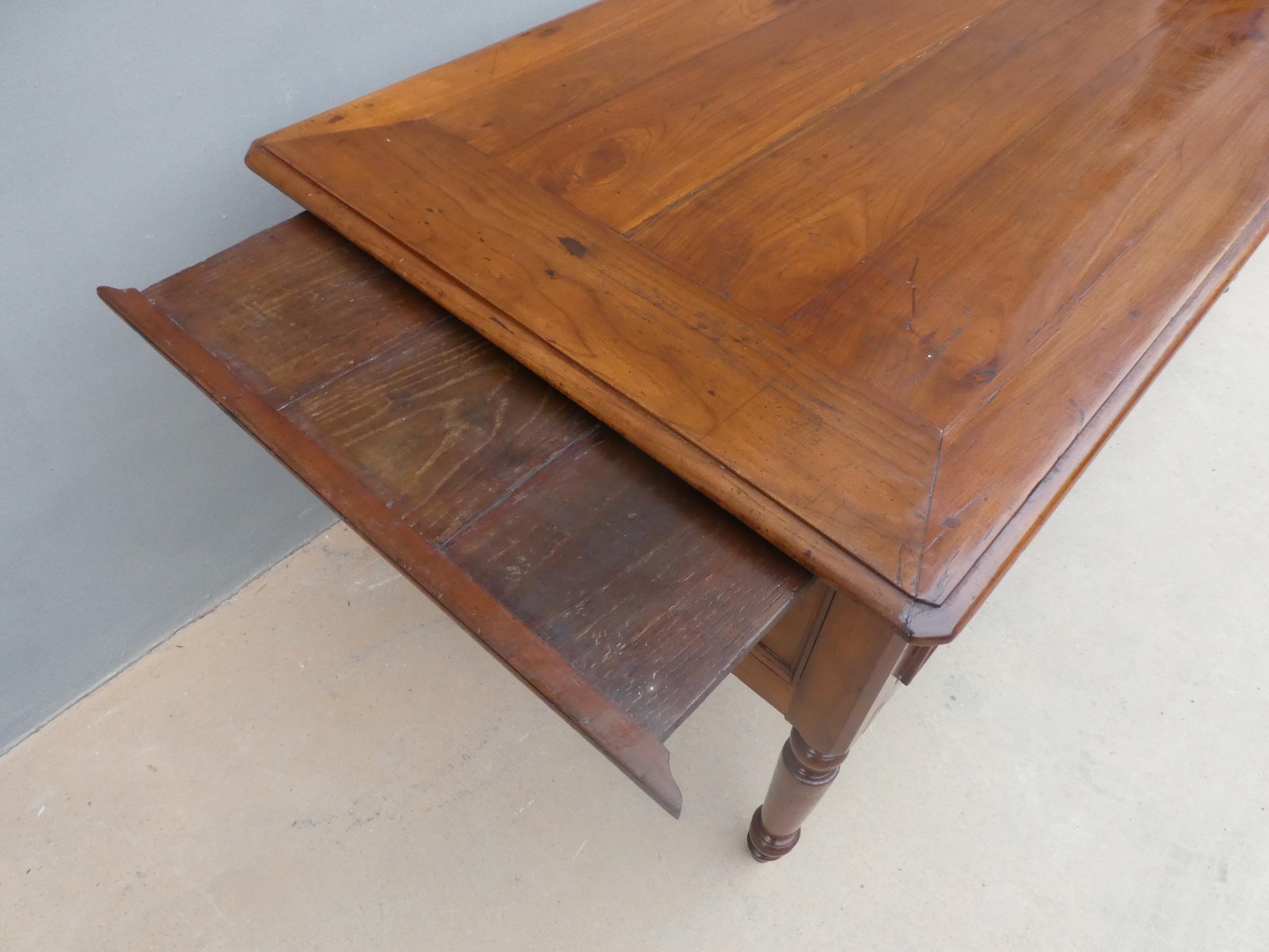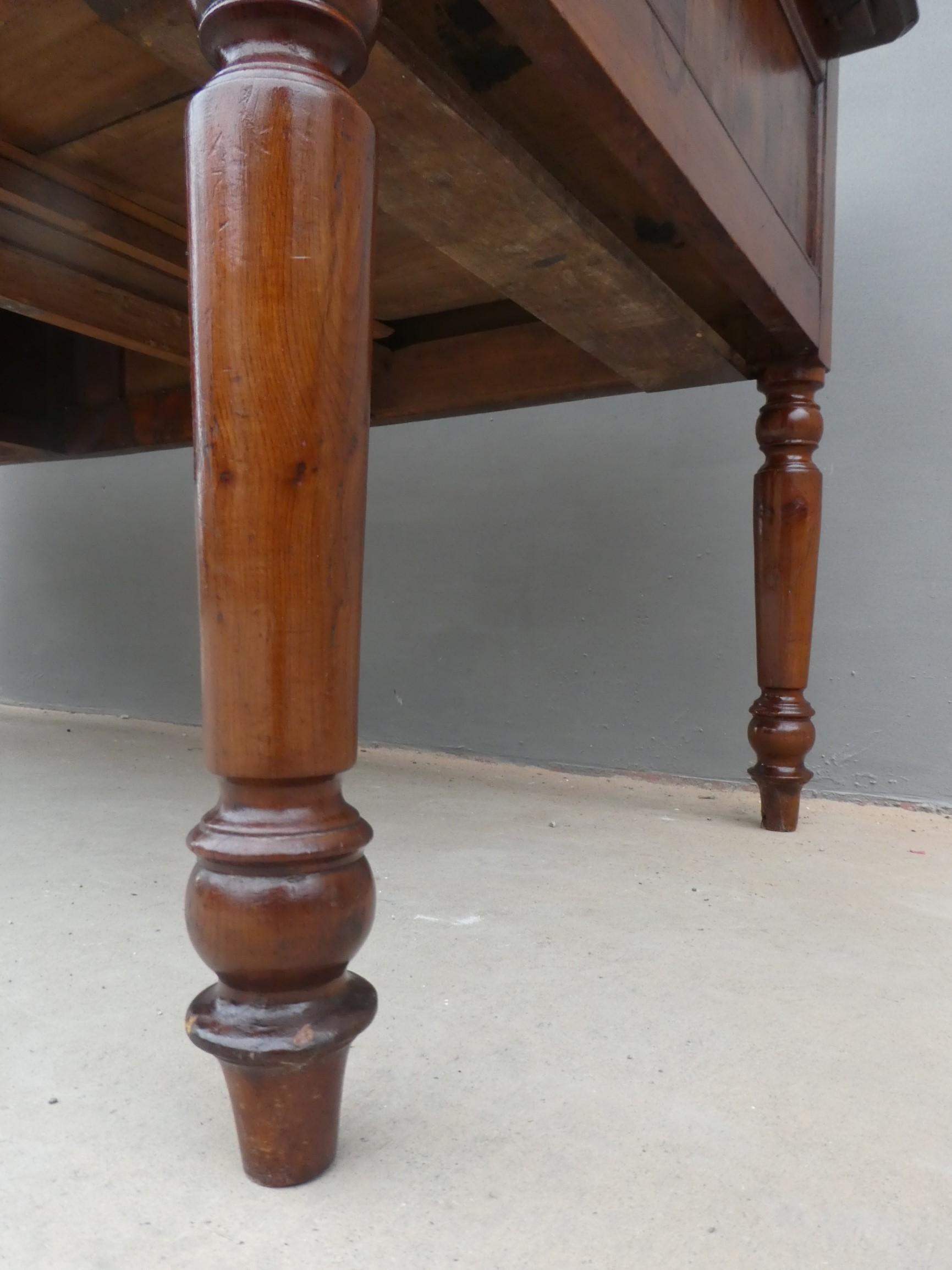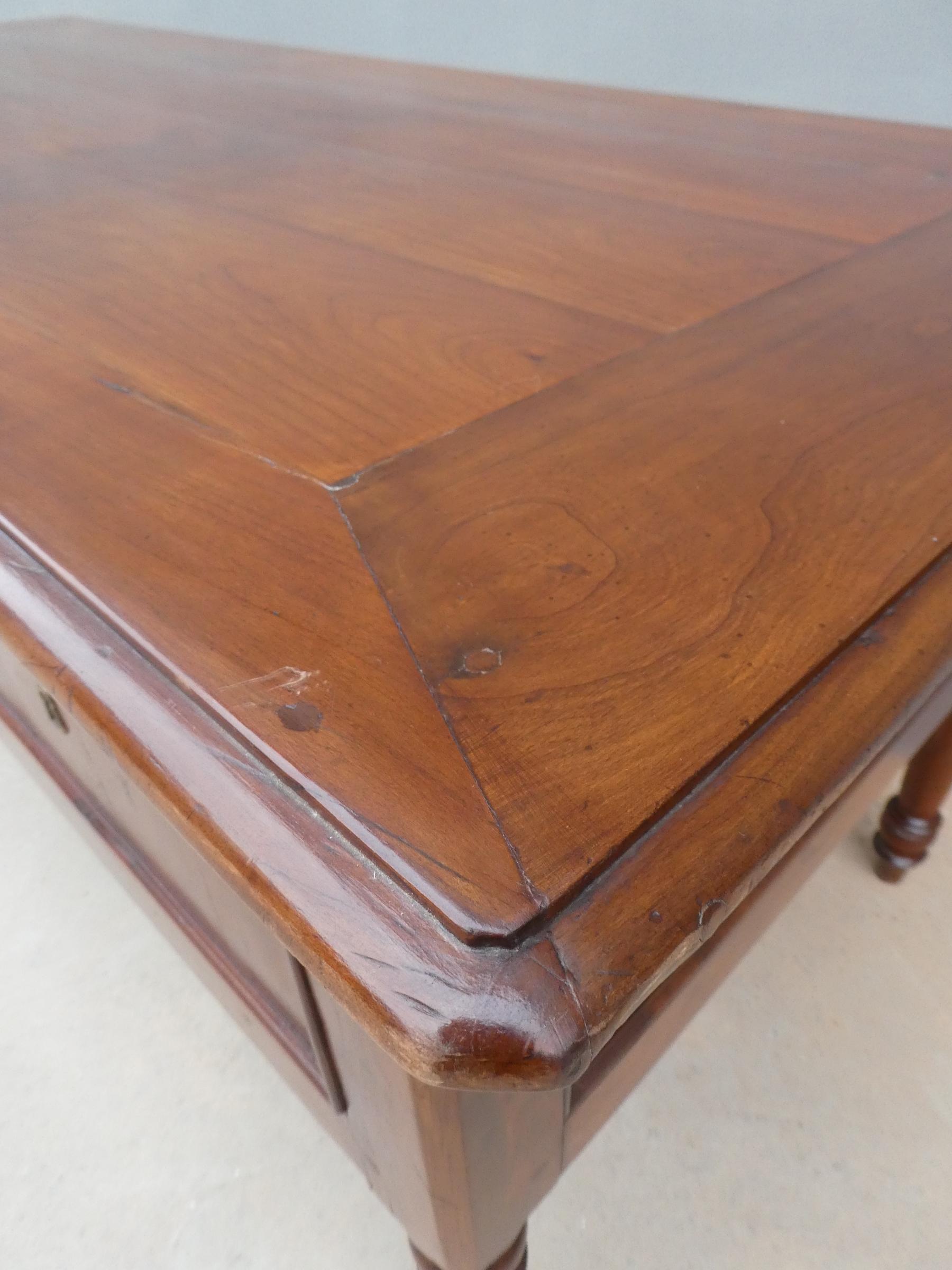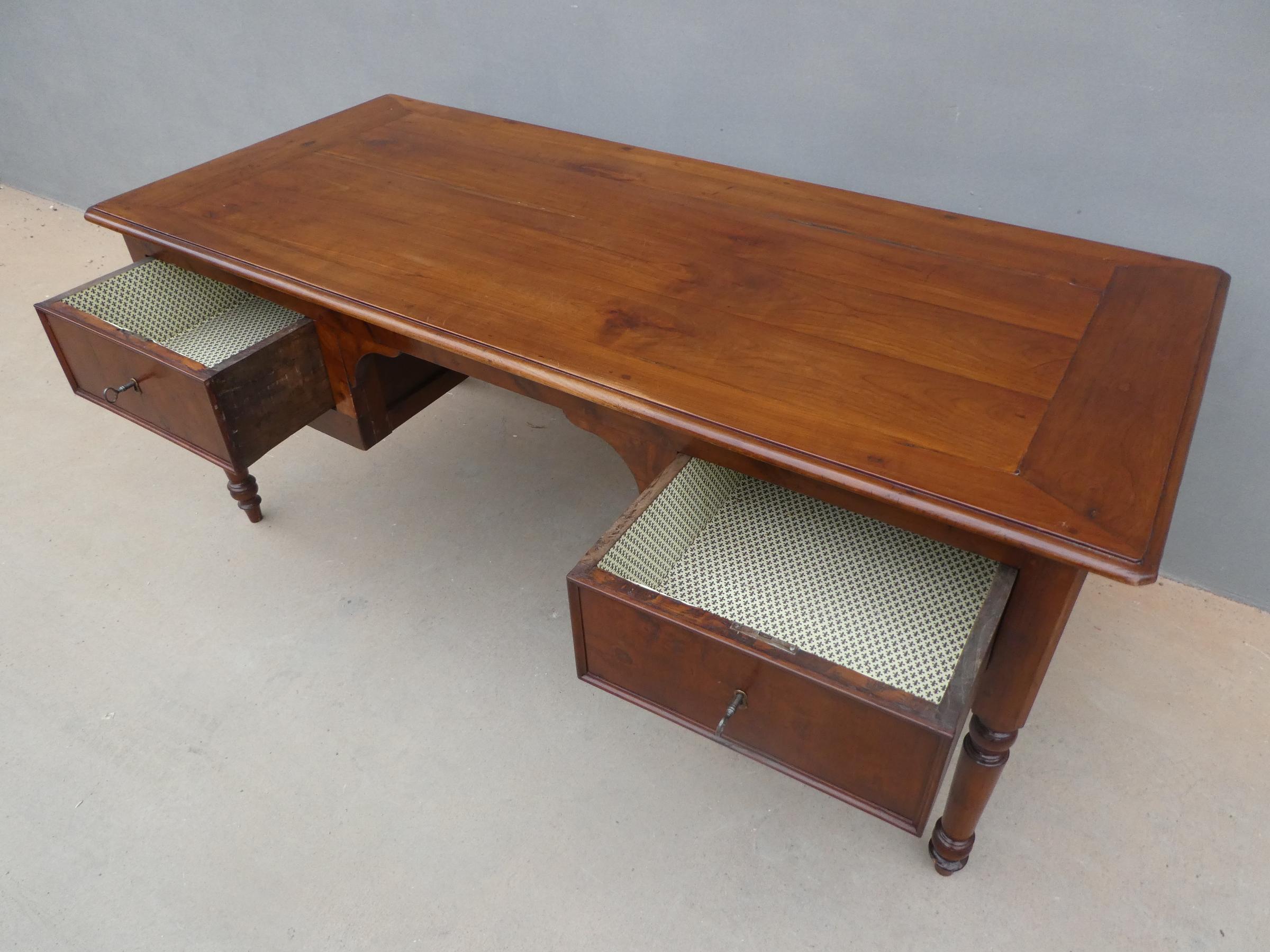 Scrittoio scrivania in olmo, dotata di due cassetti frontali e due assi a sfilo laterali ed appartenente d’epoca alla seconda metà dell’800. La struttura si presenta semplice e lineare, e vanta proporzioni sapientemente equilibrate. La ricerca di un essenziale decoro, si riflette anche sulla scelta dei montanti, arricchiti solamente con delicate torniture. Rifinito anche sul retro. Necessita di piccoli interventi di restauro (foto).