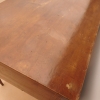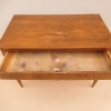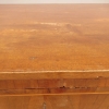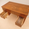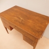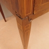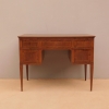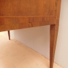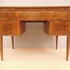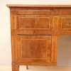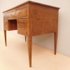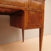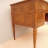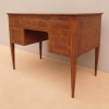 Scrittoio scrivania rettangolare Luigi XVI lastronato in noce, ulivo e palissandro, dotato di un un piano scrittura in legno, un cassetto centrale e due laterali a scomparsa, appartenente d’epoca ai primi dell’800. La struttura, sorretta dai caratteristici montanti rastremati verso il basso, si presenta semplice e lineare. La ricerca di un decoro delicato si riflette anche sulla scelta d’impreziosire il corpo con leggeri filetti, che spiccano contrastanti sulla raffinata superficie che fa da sfondo. Rifinito anche sul retro. Necessita d’interventi di restauro (foto); una gamba è da incollare/fissare.