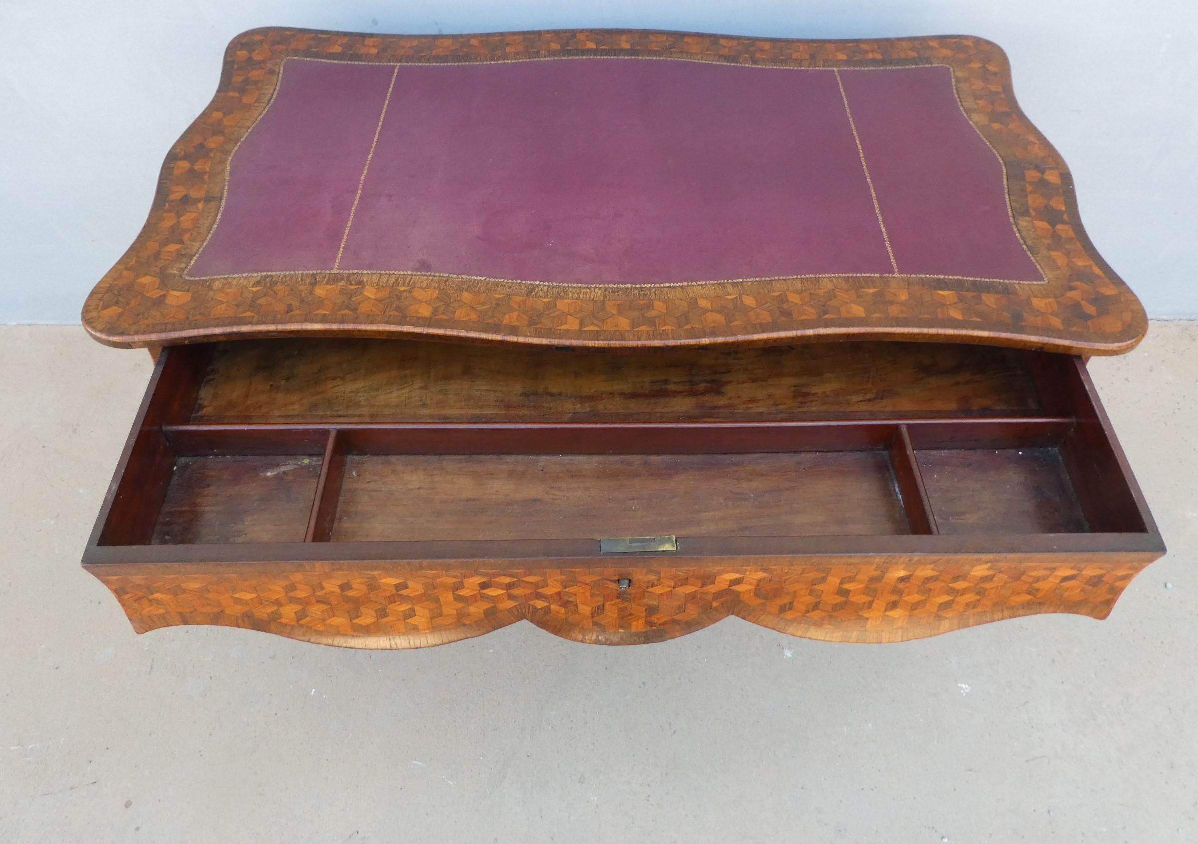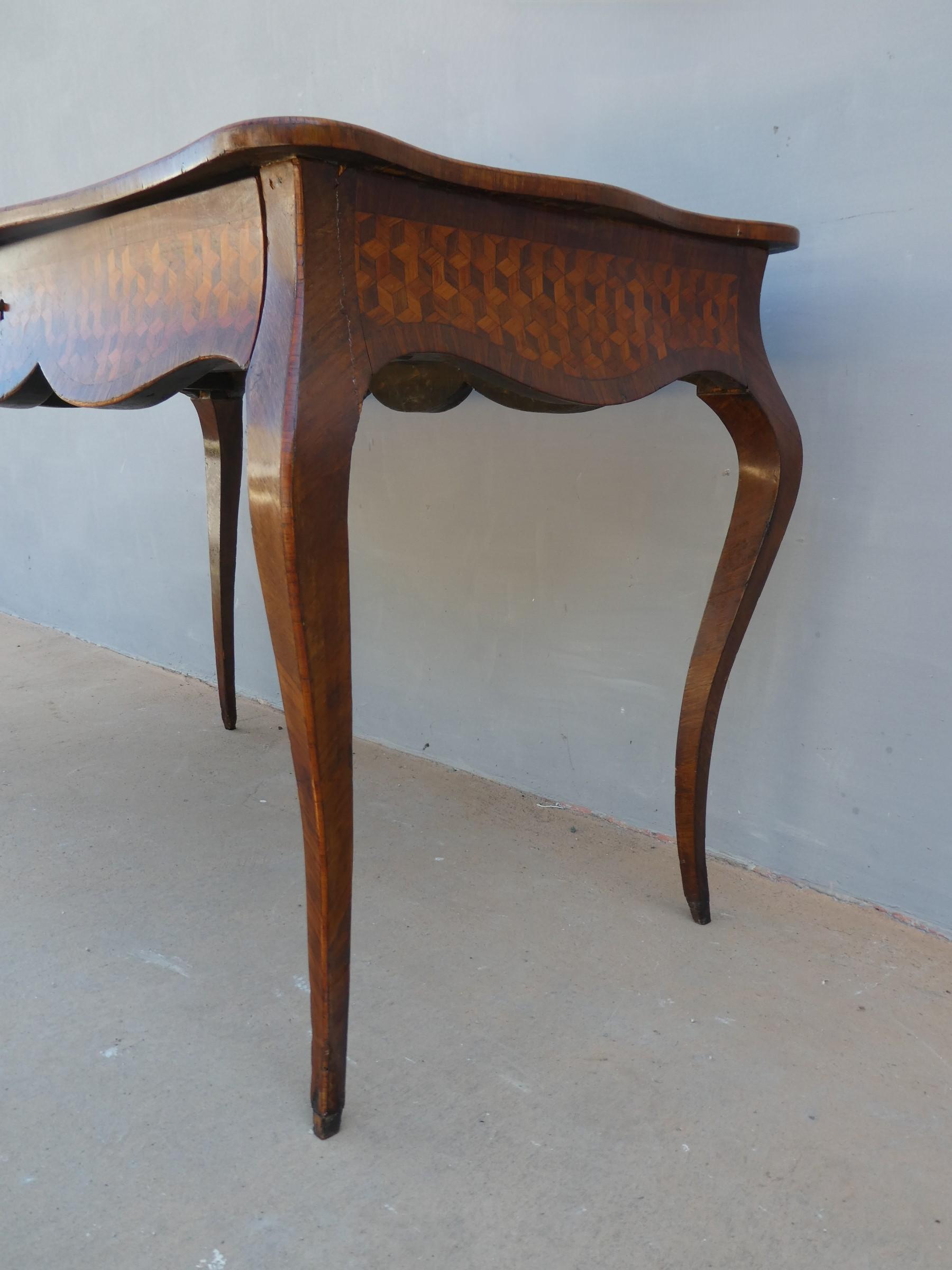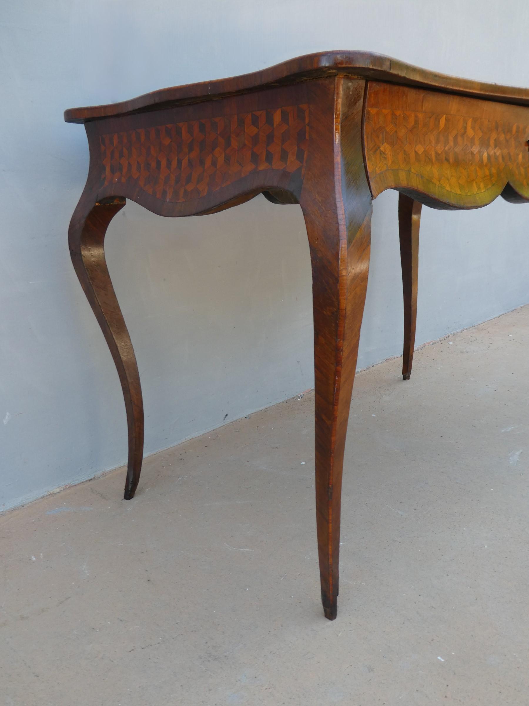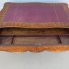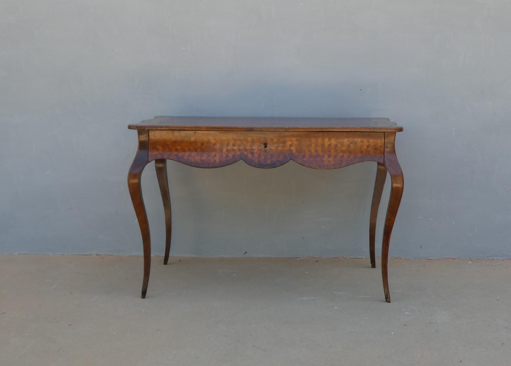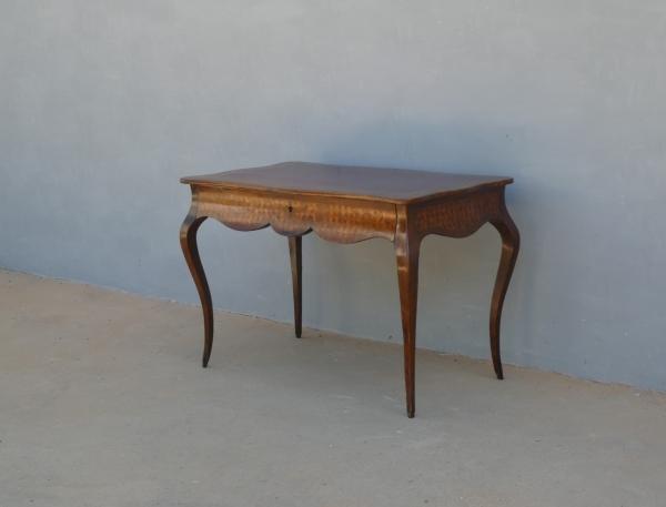 Scrittoio scrivania dotato di un cassetto frontale a scomparsa ed un piano scrittura rivestito in pelle, appartenente d’epoca alla fine dell’800. Semplice ed armonioso nella linea, il mobile ottiene il suo effetto decorativo grazie all’uso della ‘marchetteria’, dove l’impiallacciatura ad intarsio in palissandro e bois de rose crea complessi e geometrici motivi. Necessita di alcuni interventi di restauro (foto).