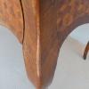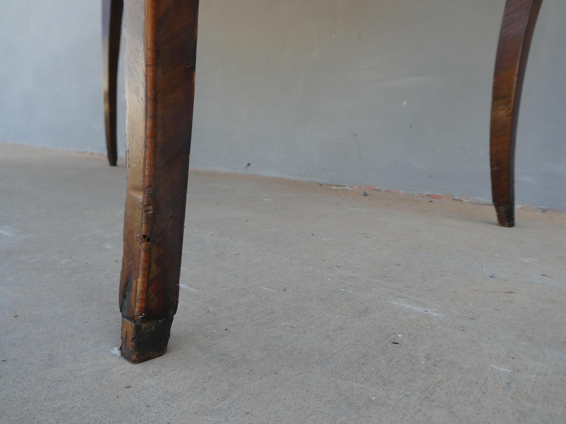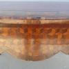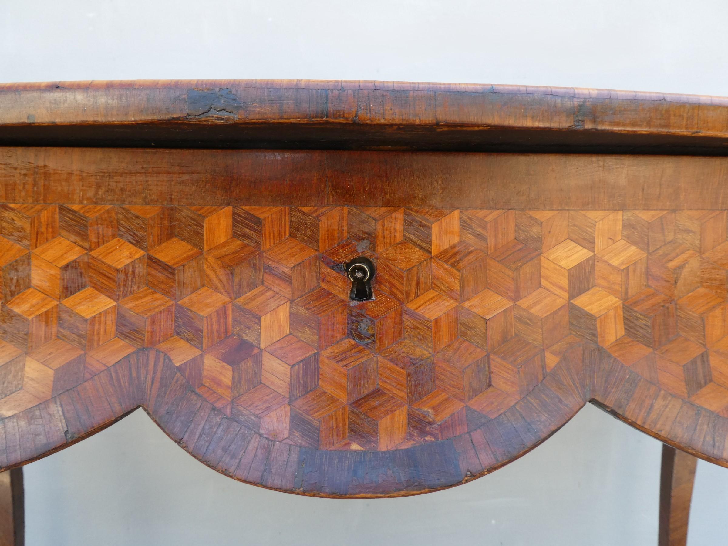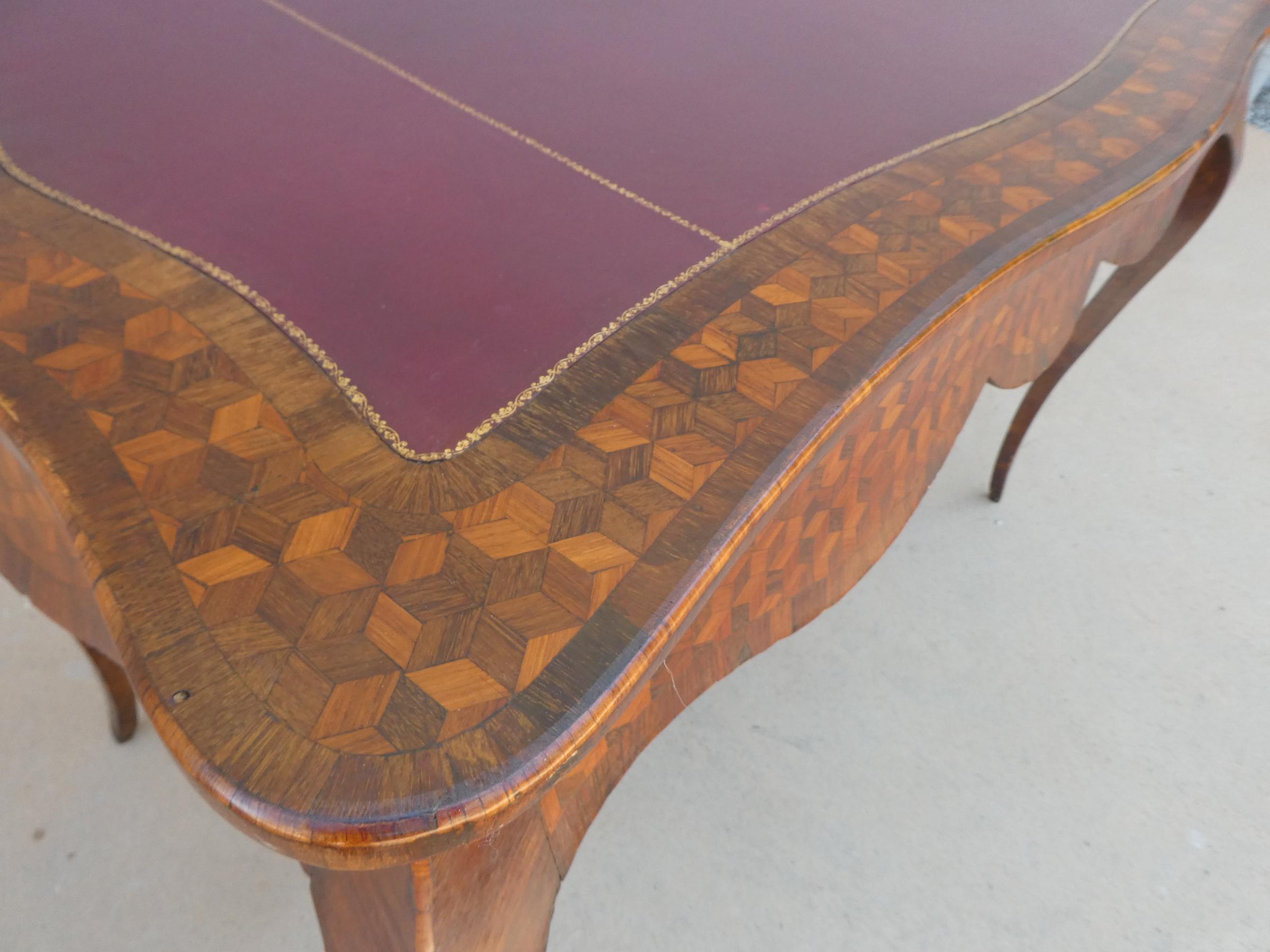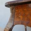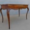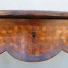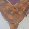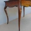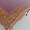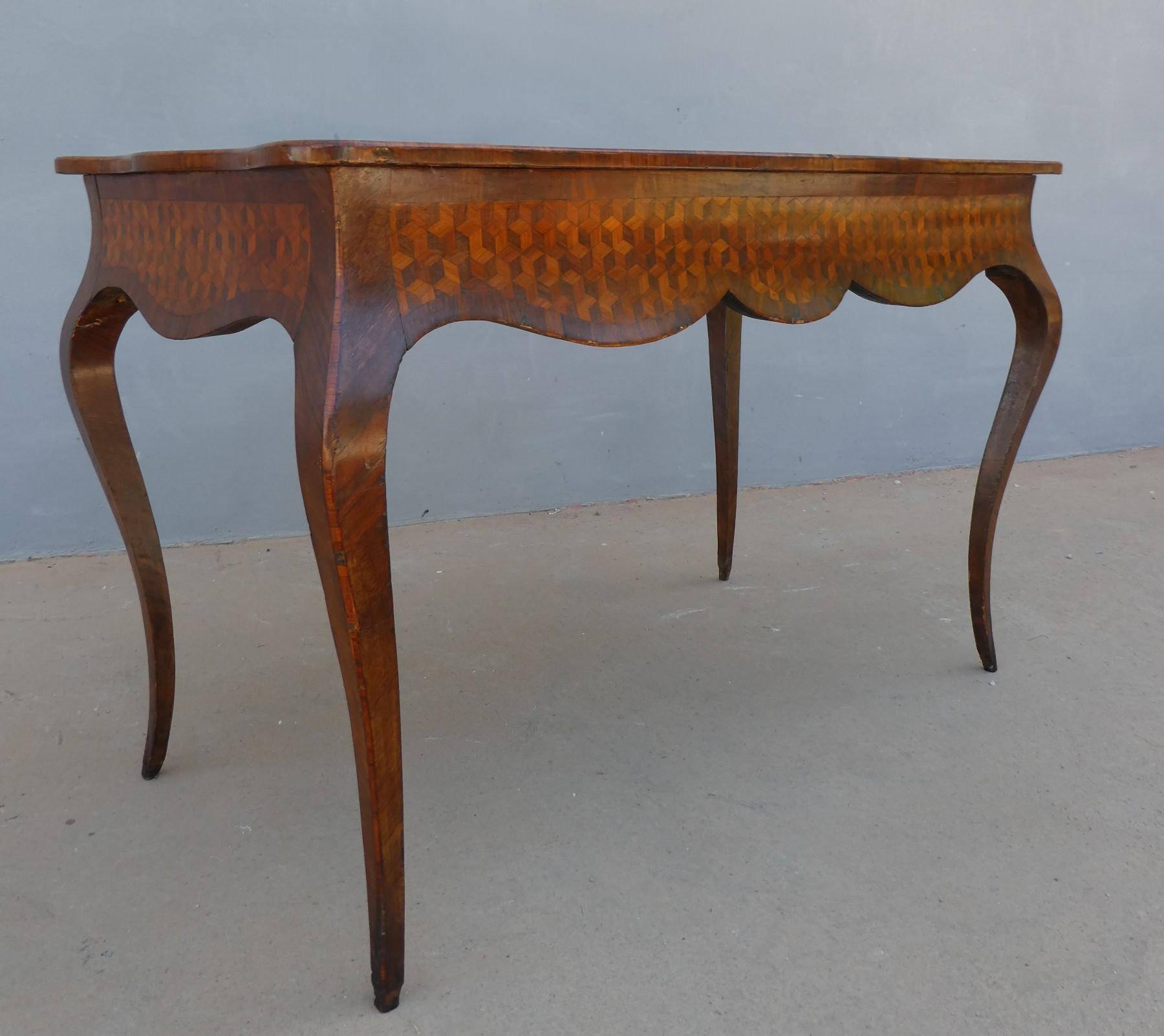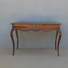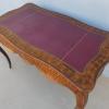 Scrittoio scrivania dotato di un cassetto frontale a scomparsa ed un piano scrittura rivestito in pelle, appartenente d’epoca alla fine dell’800. Semplice ed armonioso nella linea, il mobile ottiene il suo effetto decorativo grazie all’uso della ‘marchetteria’, dove l’impiallacciatura ad intarsio in palissandro e bois de rose crea complessi e geometrici motivi. Necessita di alcuni interventi di restauro (foto).