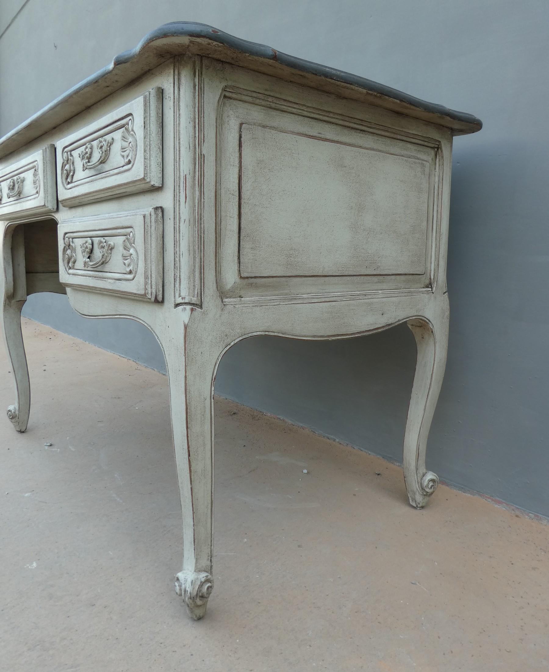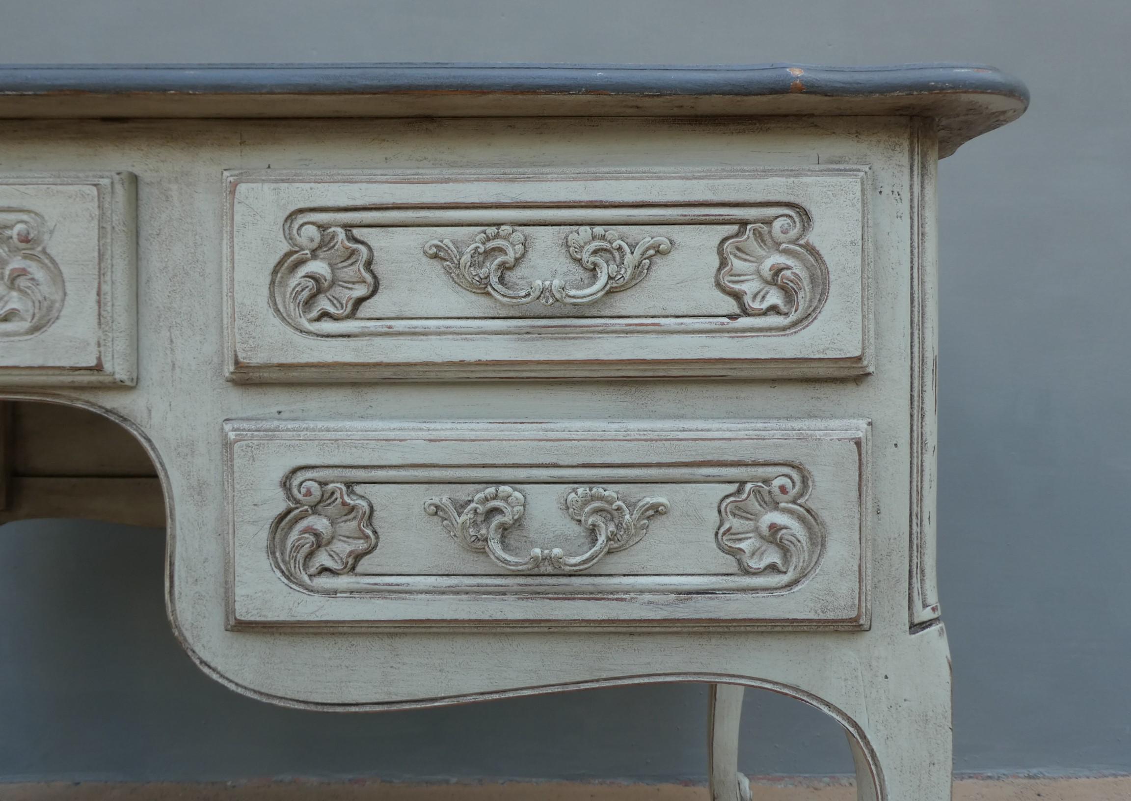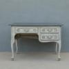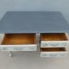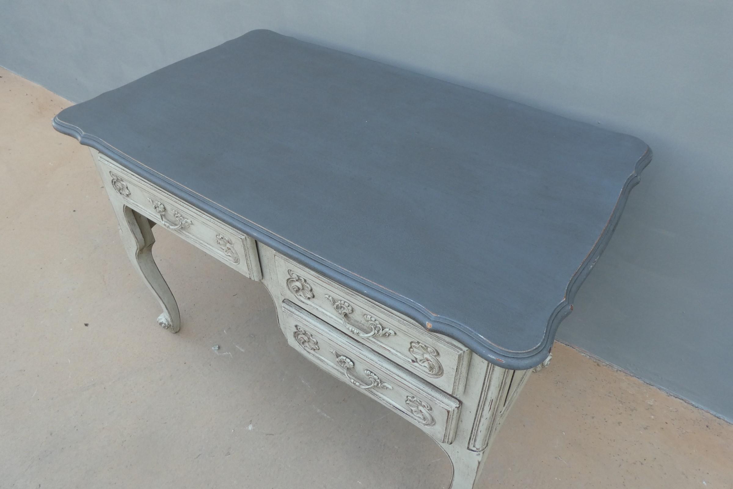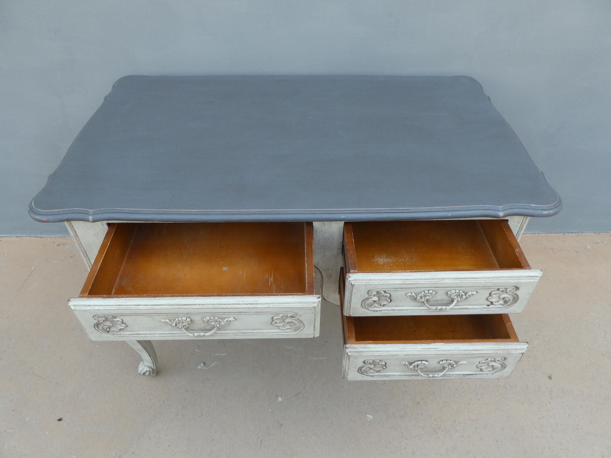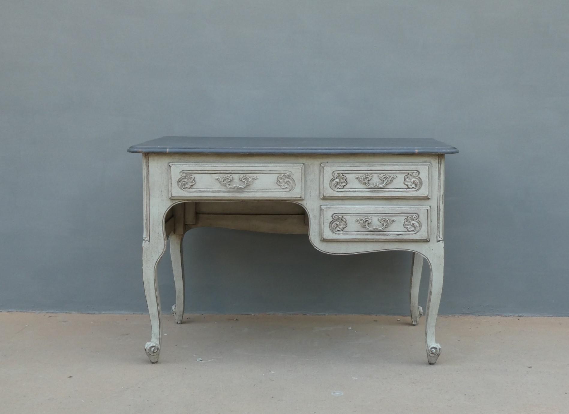 Scrittoio scrivania rettangolare stile provenzale dotata di tre cassetti frontali, laccata bicolore e rifinita con la tecnica “Shabby Chic”. Ciò che rende elegante ed originale questo mobile, oltre alla grande cura riservata all’intaglio, è il contrasto creato dalla lacca chiara utilizzata per il cavalletto delle gambe, con quella scura del piano d’appoggio. Rifinita anche sul retro. Epoca metà ‘900.