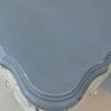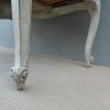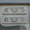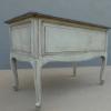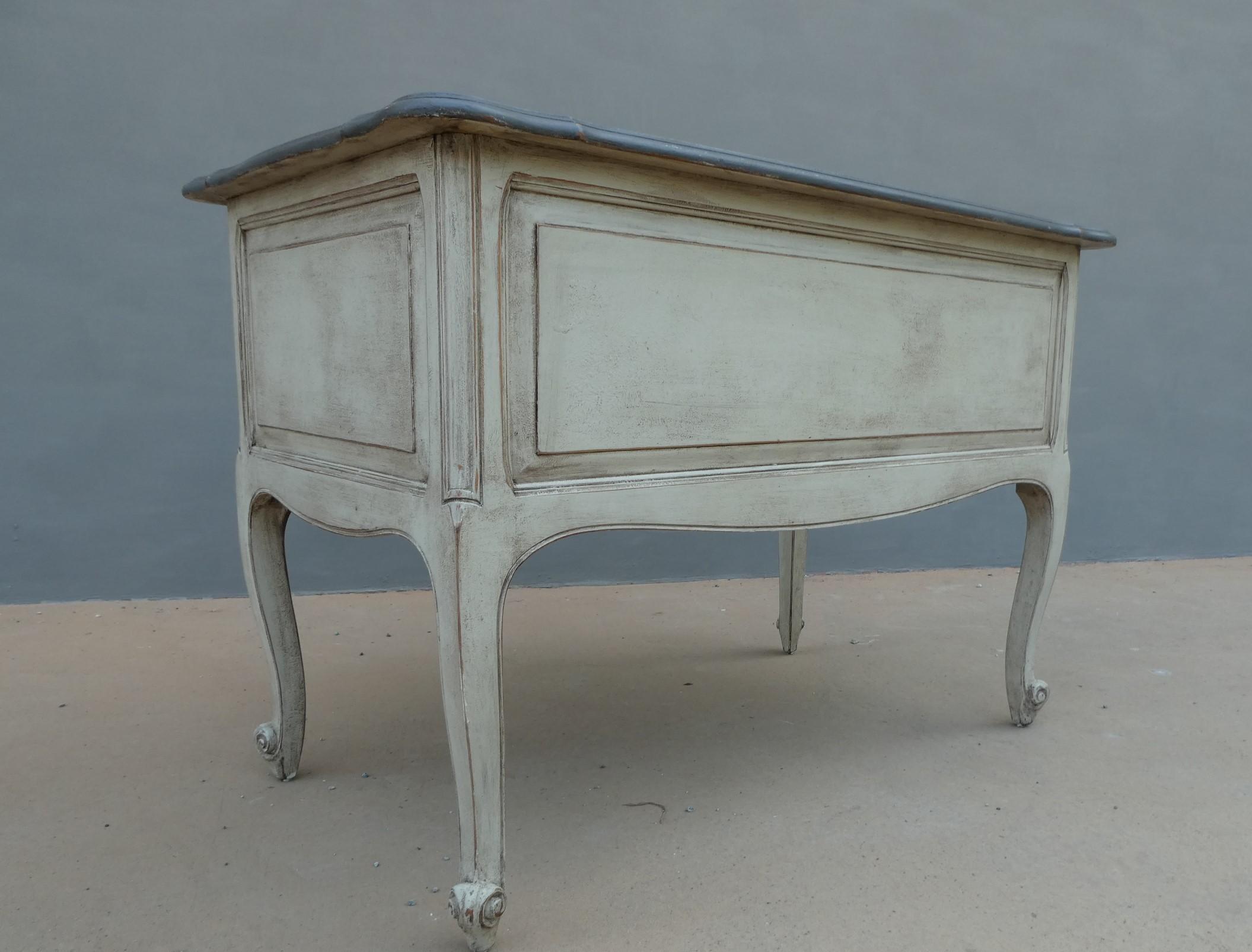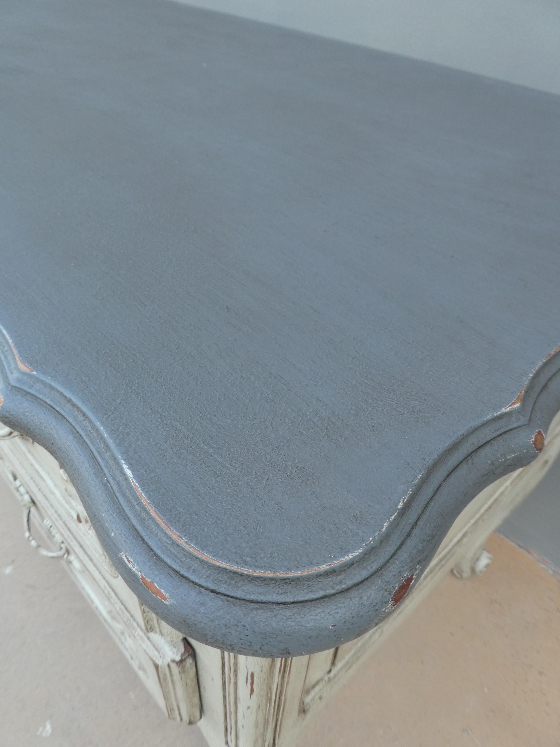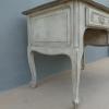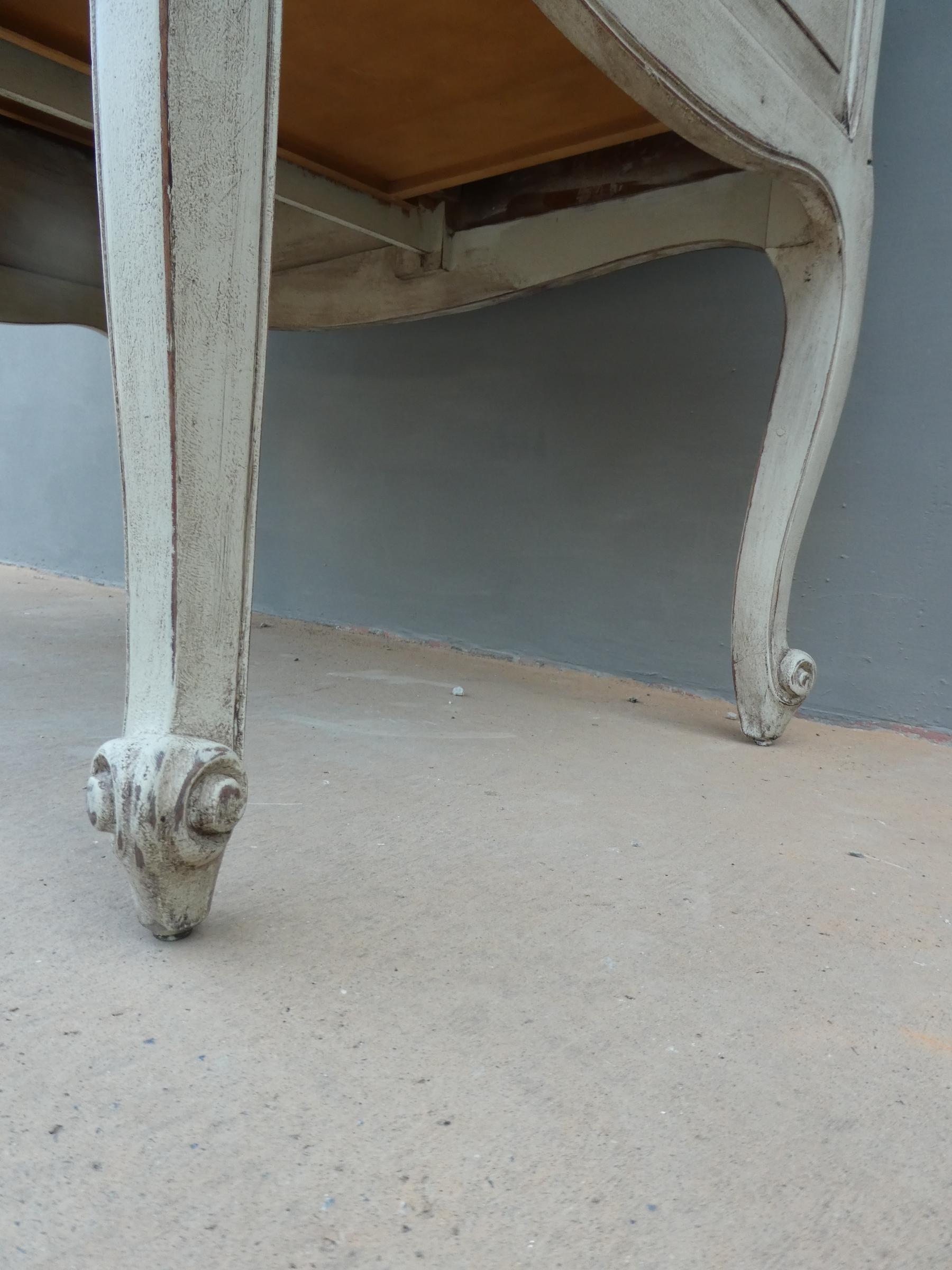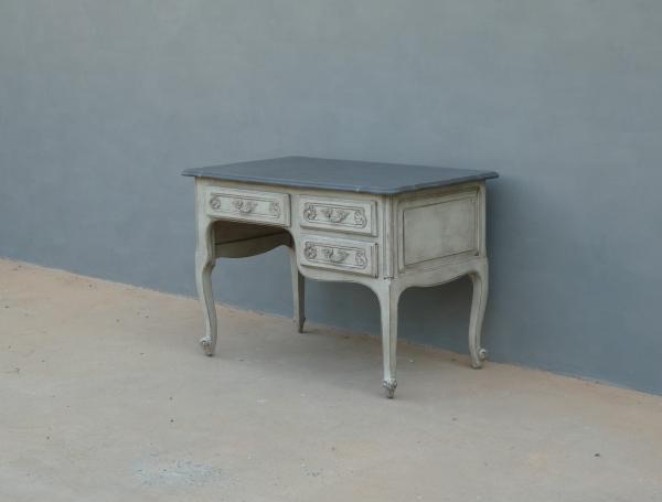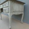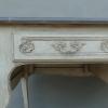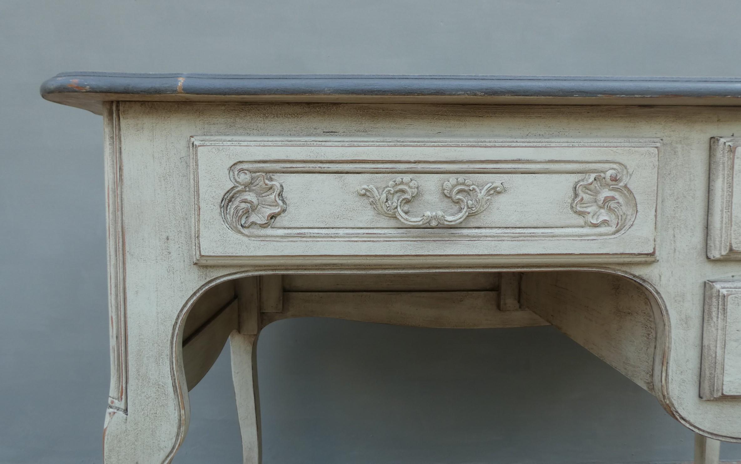 Scrittoio scrivania rettangolare stile provenzale dotata di tre cassetti frontali, laccata bicolore e rifinita con la tecnica “Shabby Chic”. Ciò che rende elegante ed originale questo mobile, oltre alla grande cura riservata all’intaglio, è il contrasto creato dalla lacca chiara utilizzata per il cavalletto delle gambe, con quella scura del piano d’appoggio. Rifinita anche sul retro. Epoca metà ‘900.
