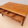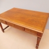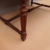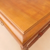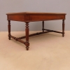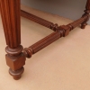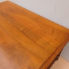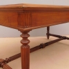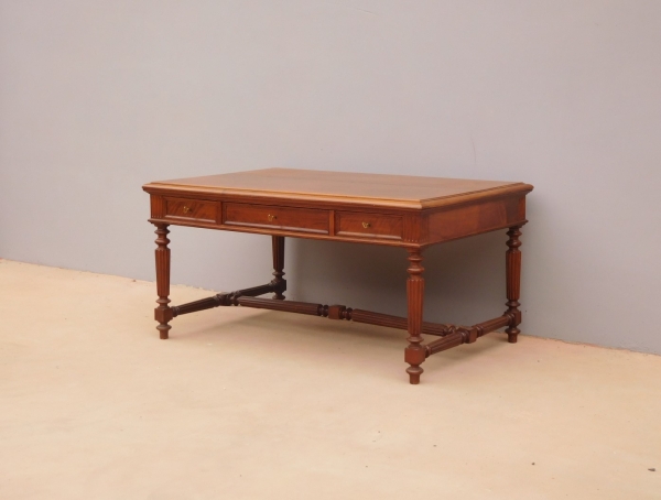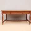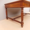 Scrittoio scrivania tavolo rettangolare dotato di tre cassetti frontali e realizzato in legno di noce. La semplice struttura vanta dimensioni abbondanti e proporzioni sapientemente equilibrate. La ricerca di un decoro delicato, si riflette anche sulla scelta dei montati, arricchiti solamente con delicate sgusciature. Necessita di alcuni interventi di restauro; è stata applicata una staffa sotto le traverse per rafforzarle (foto). Epoca fine ‘800/primi ‘900.