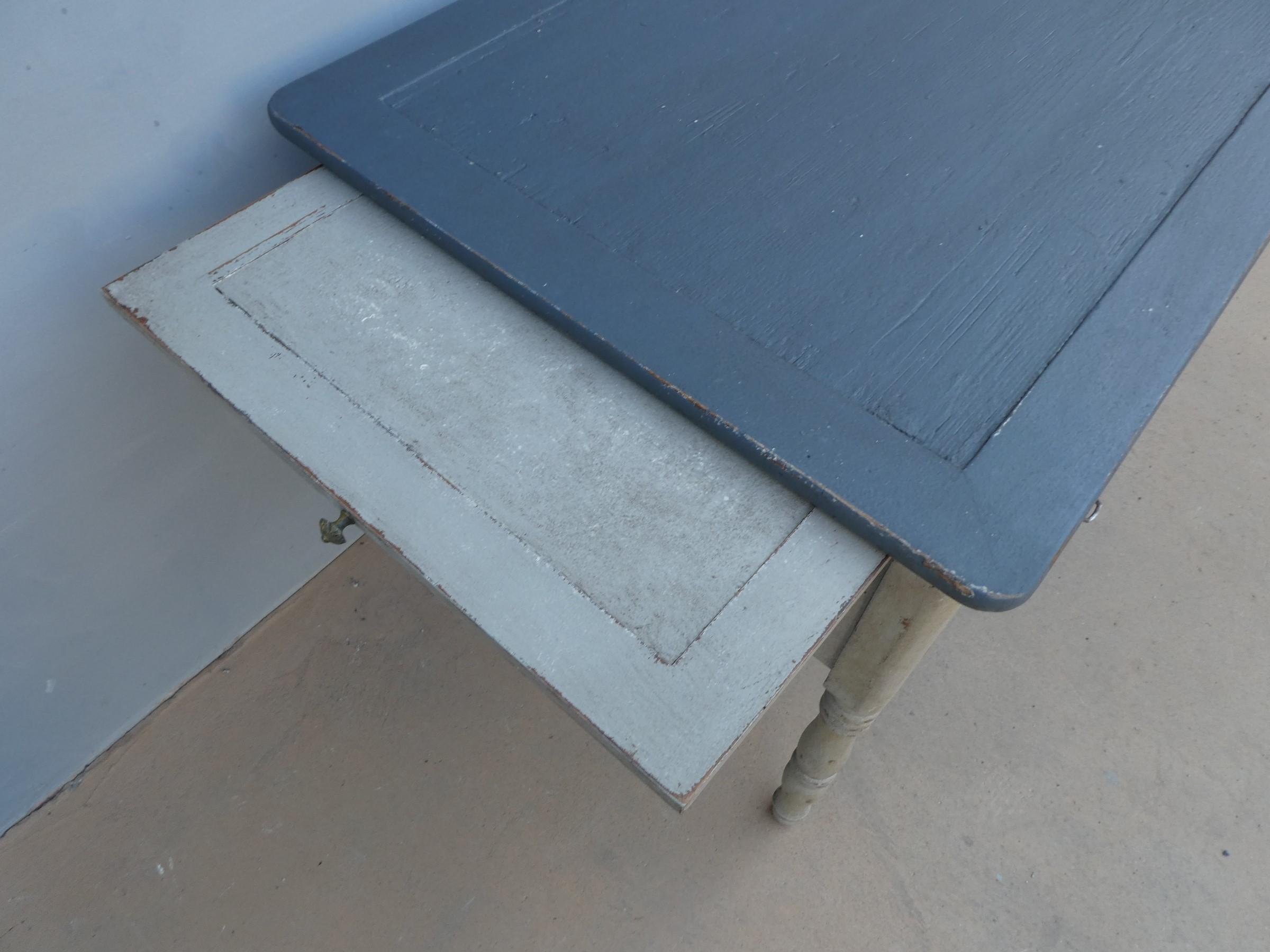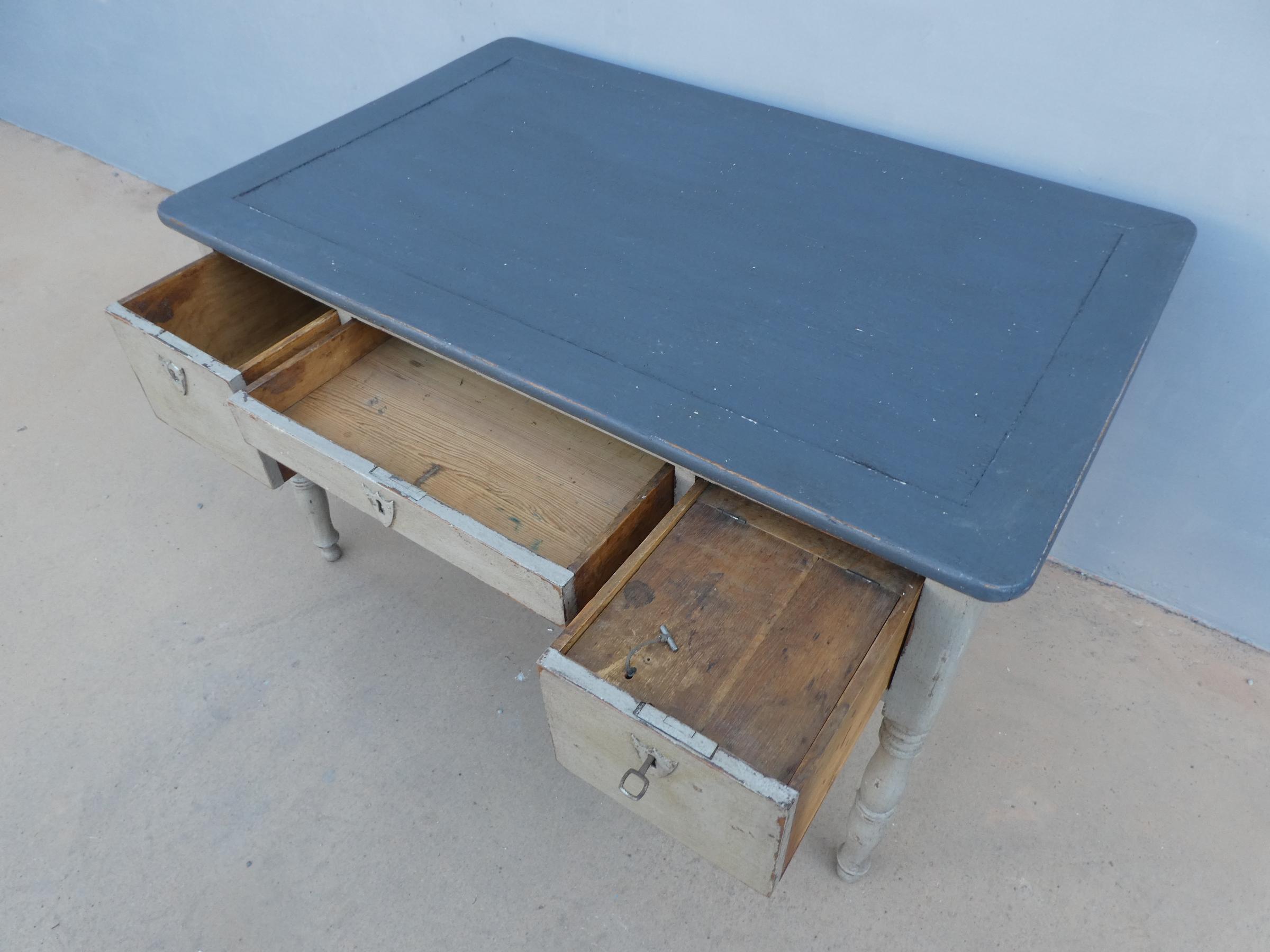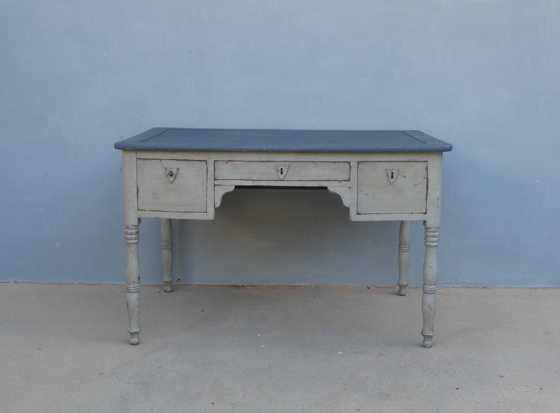 Scrivania tavolo scrittoio fisso rettangolare, corredato da tre cassetti frontali (di cui uno dotato di un piccolo scomparto segreto) ed una piccola asse a sfilo laterale, laccato e rifinito con la tecnica “Shabby Chic”. Ciò che rende originale questo mobile, è il contrasto creato dalla lacca chiara utilizzata per il cavalletto delle gambe, con quella scura del piano d’appoggio. Epoca seconda metà ‘800.