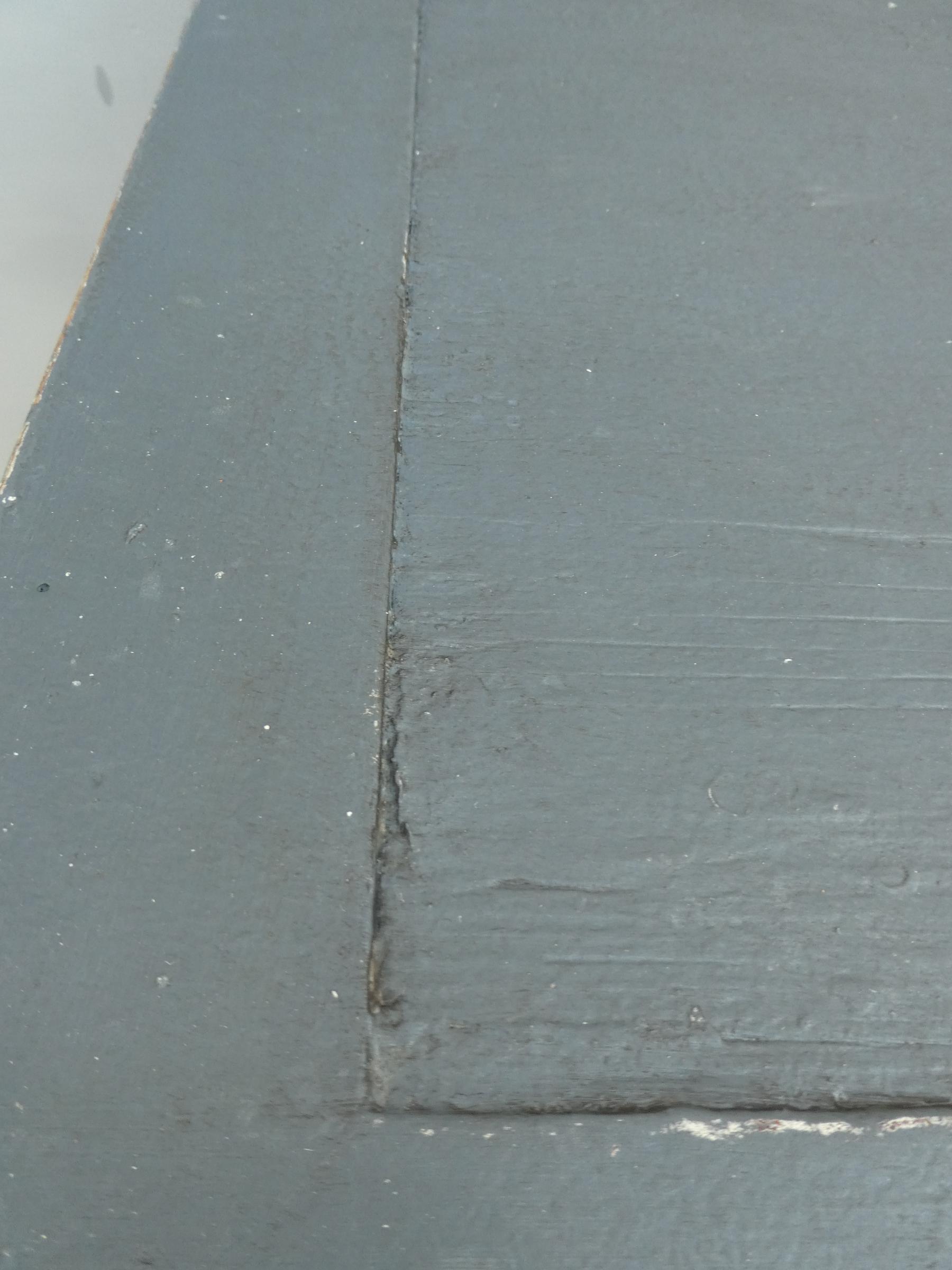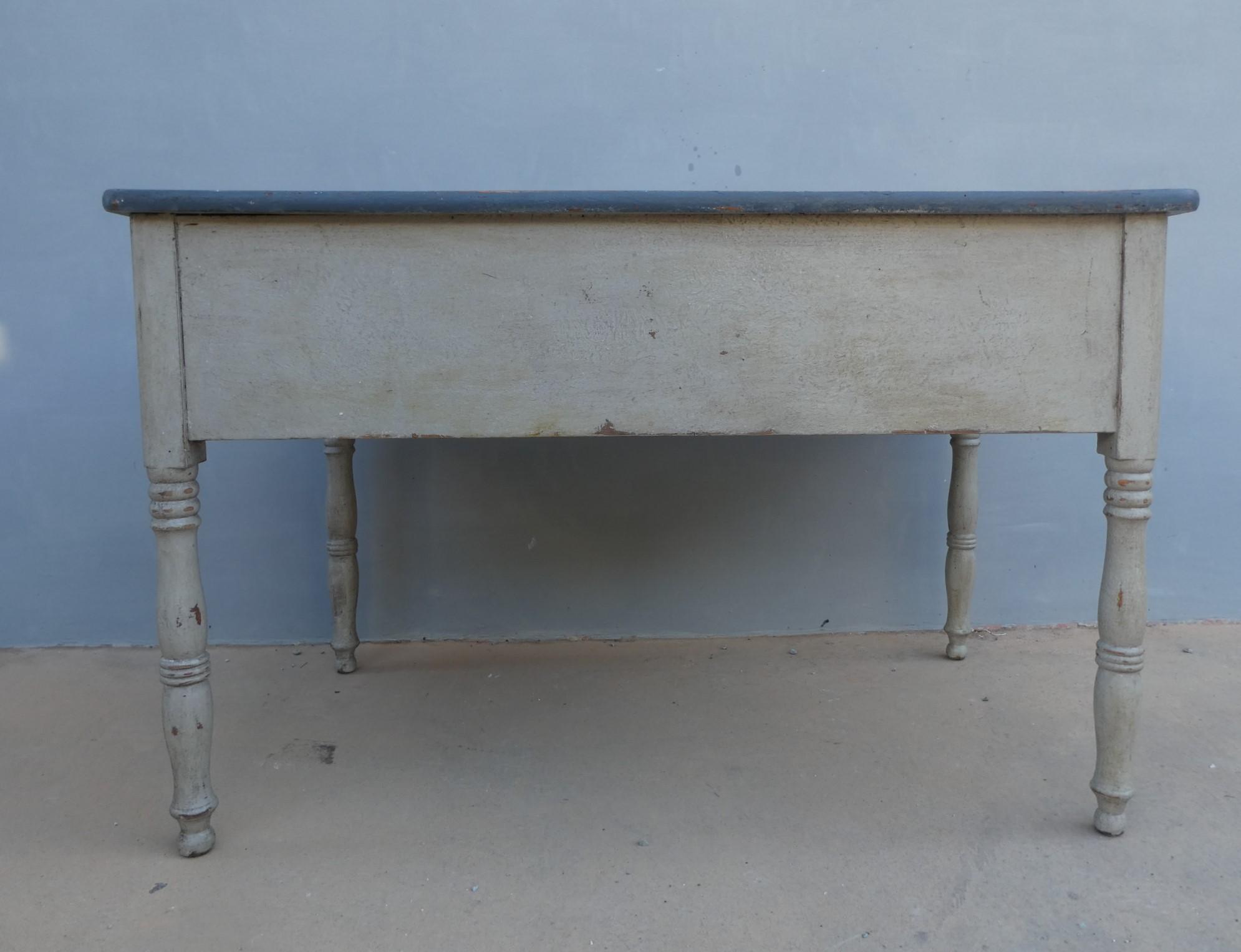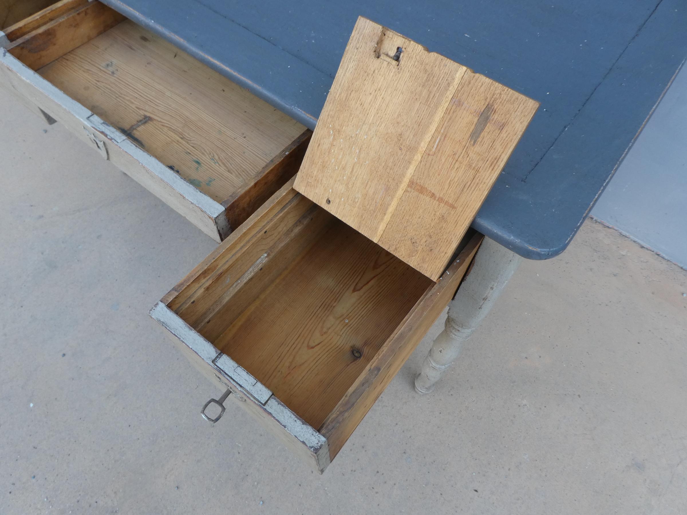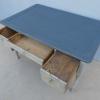 Scrivania tavolo scrittoio fisso rettangolare, corredato da tre cassetti frontali (di cui uno dotato di un piccolo scomparto segreto) ed una piccola asse a sfilo laterale, laccato e rifinito con la tecnica “Shabby Chic”. Ciò che rende originale questo mobile, è il contrasto creato dalla lacca chiara utilizzata per il cavalletto delle gambe, con quella scura del piano d’appoggio. Epoca seconda metà ‘800.