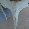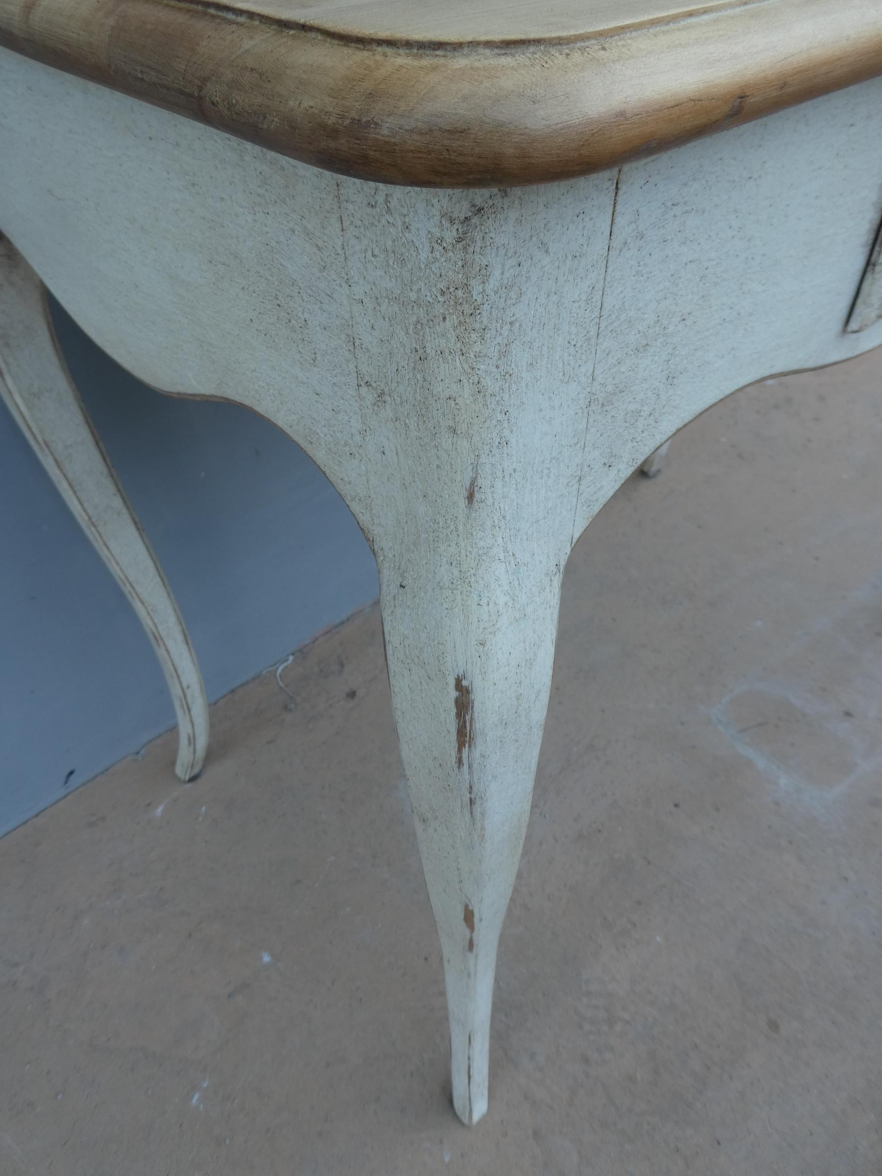 Tavolino scrittoio rettangolare dotato di un cassetto frontale, laccato e rifinito con la tecnica “Shabby Chic” che prevede l’uso di colori chiari e colori più scuri che affiorano dopo il trattamento d’usura. Ciò che rende elegante ed originale questo mobile, è il contrasto creato dalla lacca chiara utilizzata per il cavalletto delle gambe, con quella del piano in ciliegio, lasciato a legno. Epoca seconda metà ‘900.