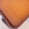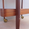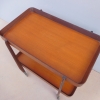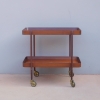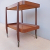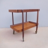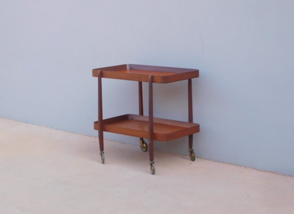 Tavolino carrellino rettangolare dotato di un doppio ripiano d’appoggio e rotelle. Questo genere di mobile è caratterizzato da geometricità e grande leggerezza. La struttura, infatti, sorretta da quattro lineari montanti, e priva di decorazioni, si presenta semplice ed essenziale. Epoca seconda metà ‘900 – modernariato anni ’60.