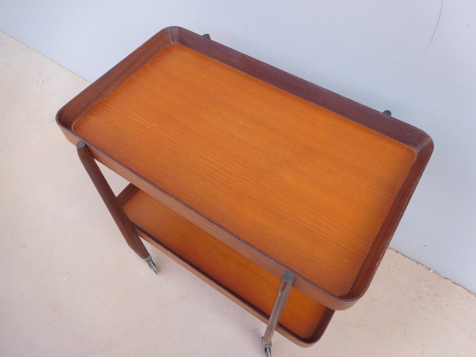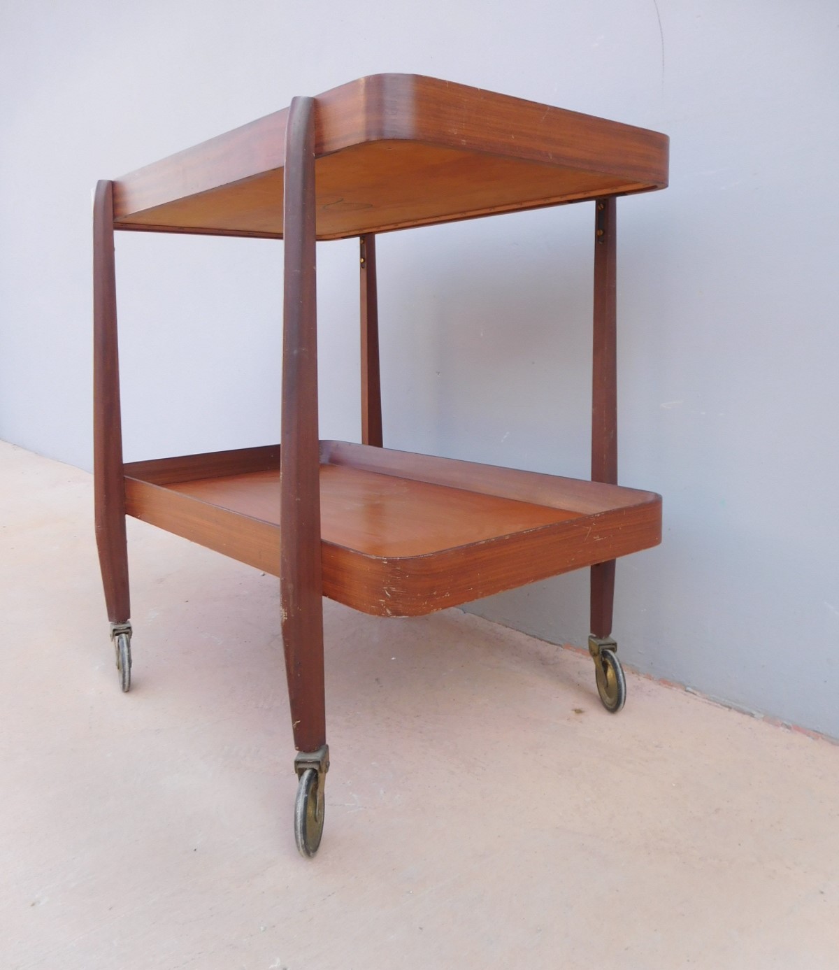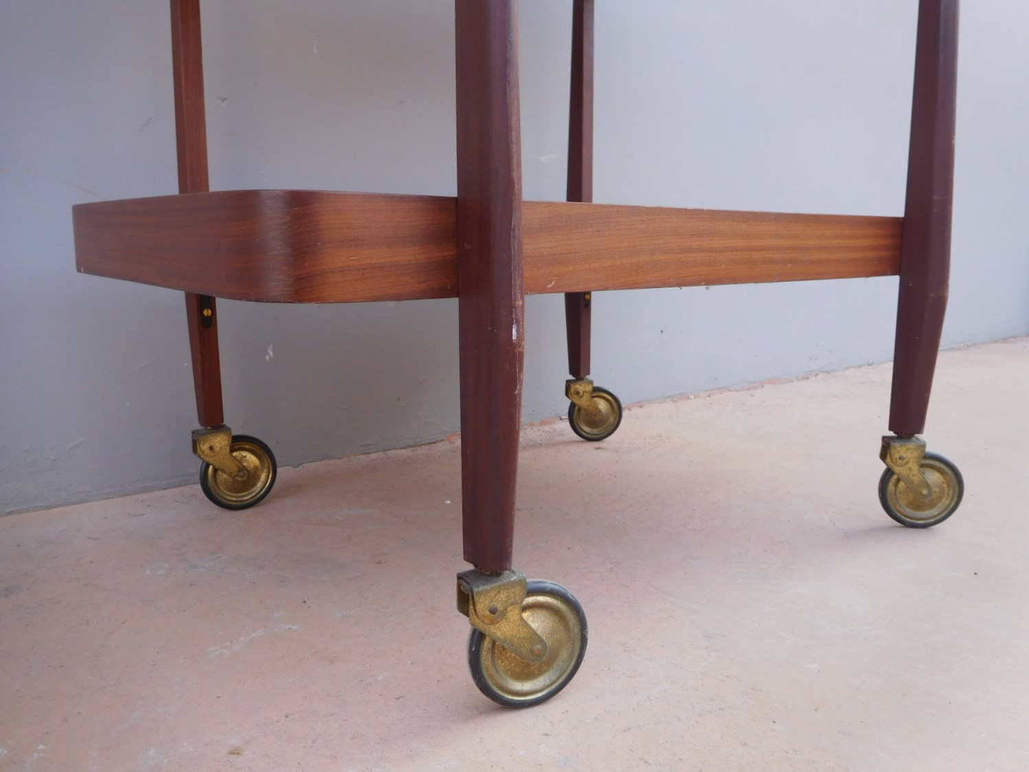 Tavolino carrellino rettangolare dotato di un doppio ripiano d’appoggio e rotelle. Questo genere di mobile è caratterizzato da geometricità e grande leggerezza. La struttura, infatti, sorretta da quattro lineari montanti, e priva di decorazioni, si presenta semplice ed essenziale. Epoca seconda metà ‘900 – modernariato anni ’60.