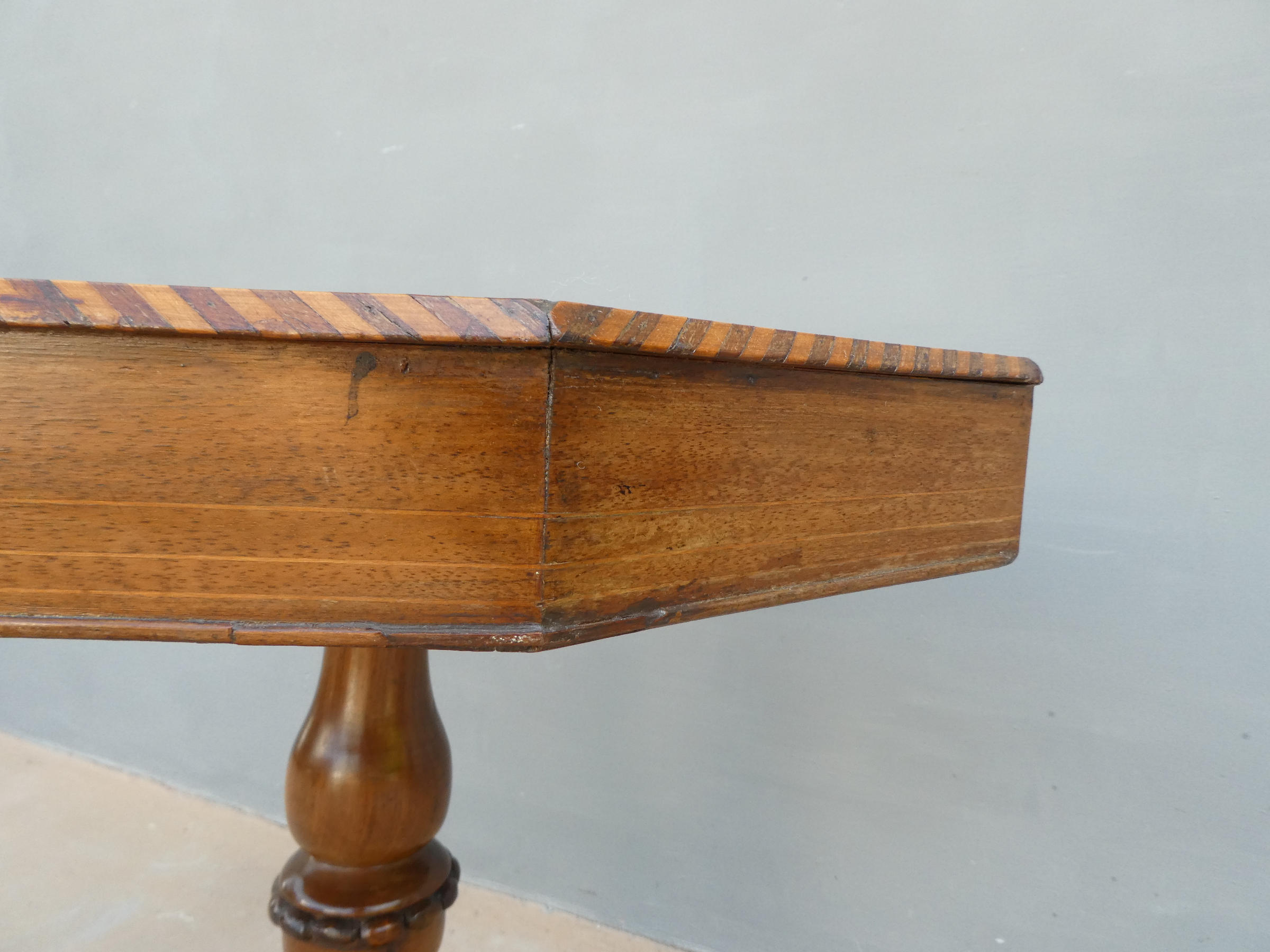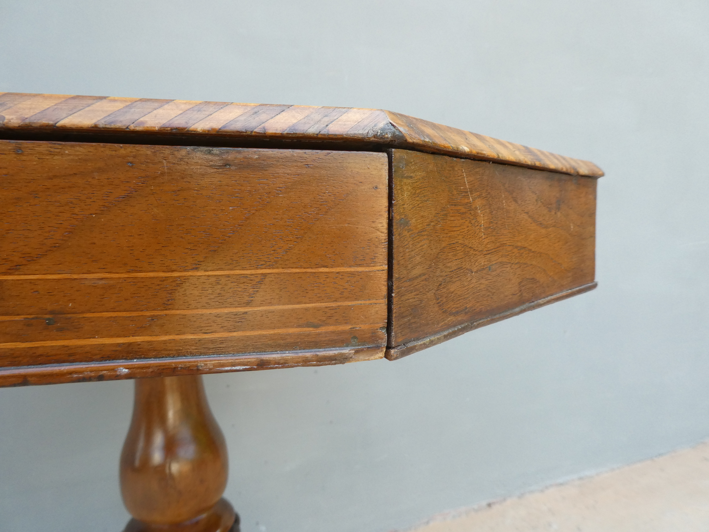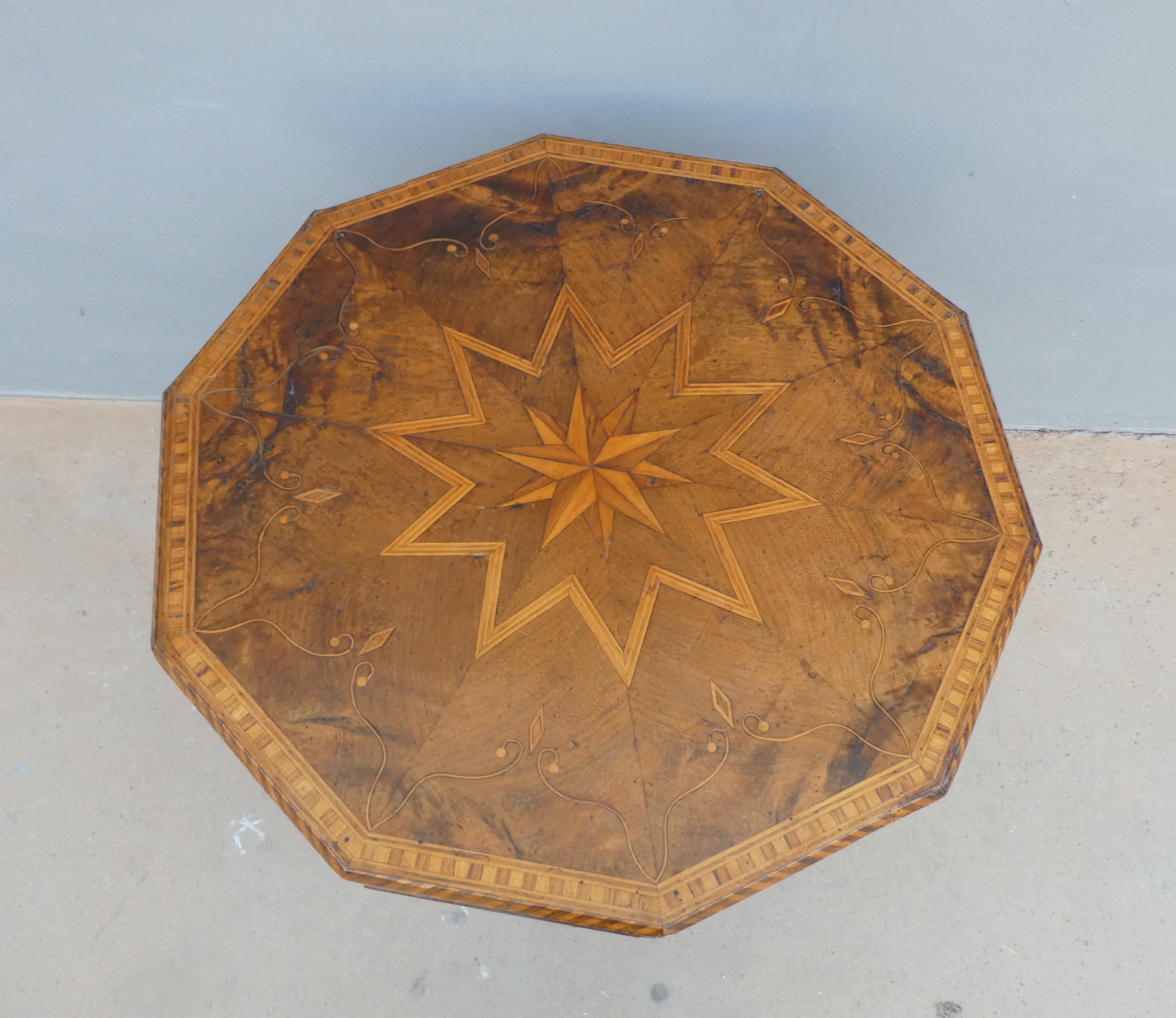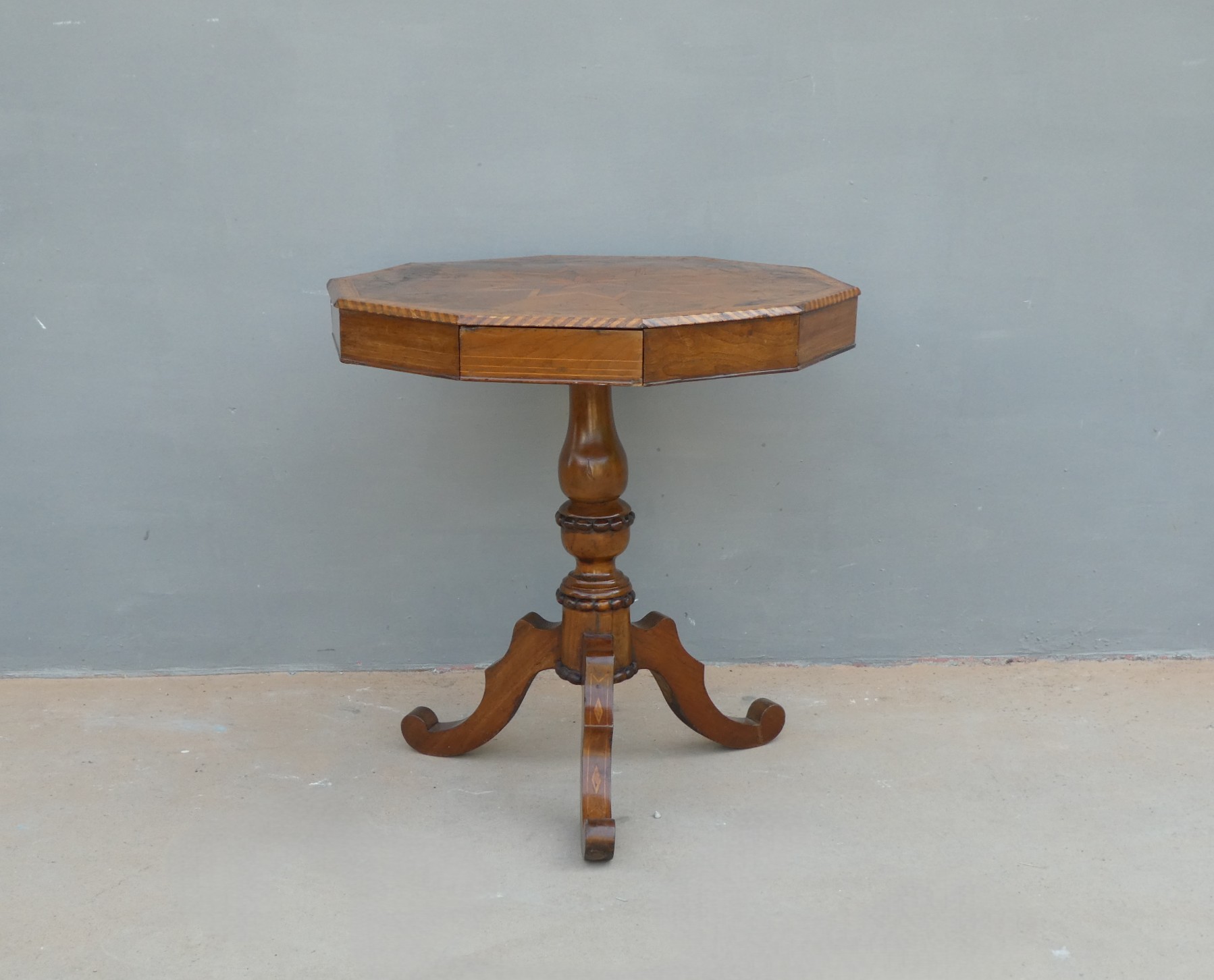 Tavolino d’appoggio sfaccettato decagonale con cassettino frontale a scomparsa, appartenente d’epoca alla metà dell’800. La struttura, sorretta da un gambo centrale ramificato su tre piedi d’appoggio, si presenta semplice ed elegante. La ricerca di un decoro mirato si riflette anche sulla scelta d’impreziosire il corpo con minuziosi intarsi/filetti, che spiccano contrastanti sulla delicata superficie in noce che fa da sfondo. Necessita di piccoli interventi di restauro.