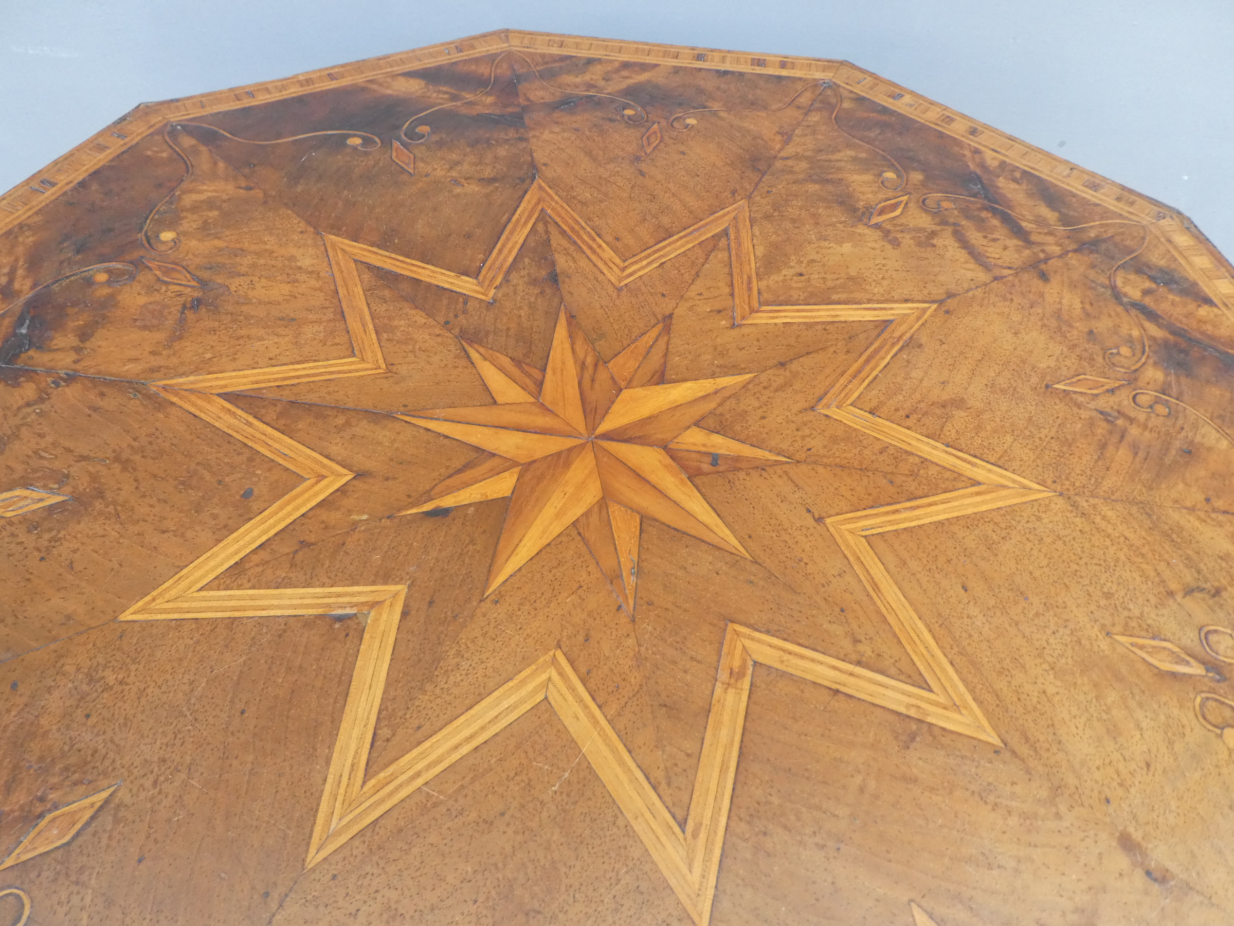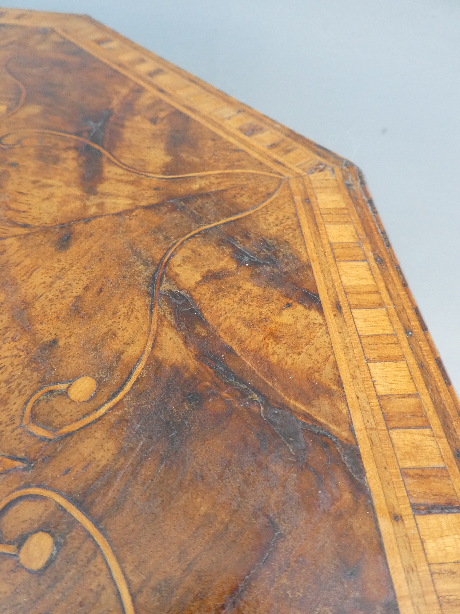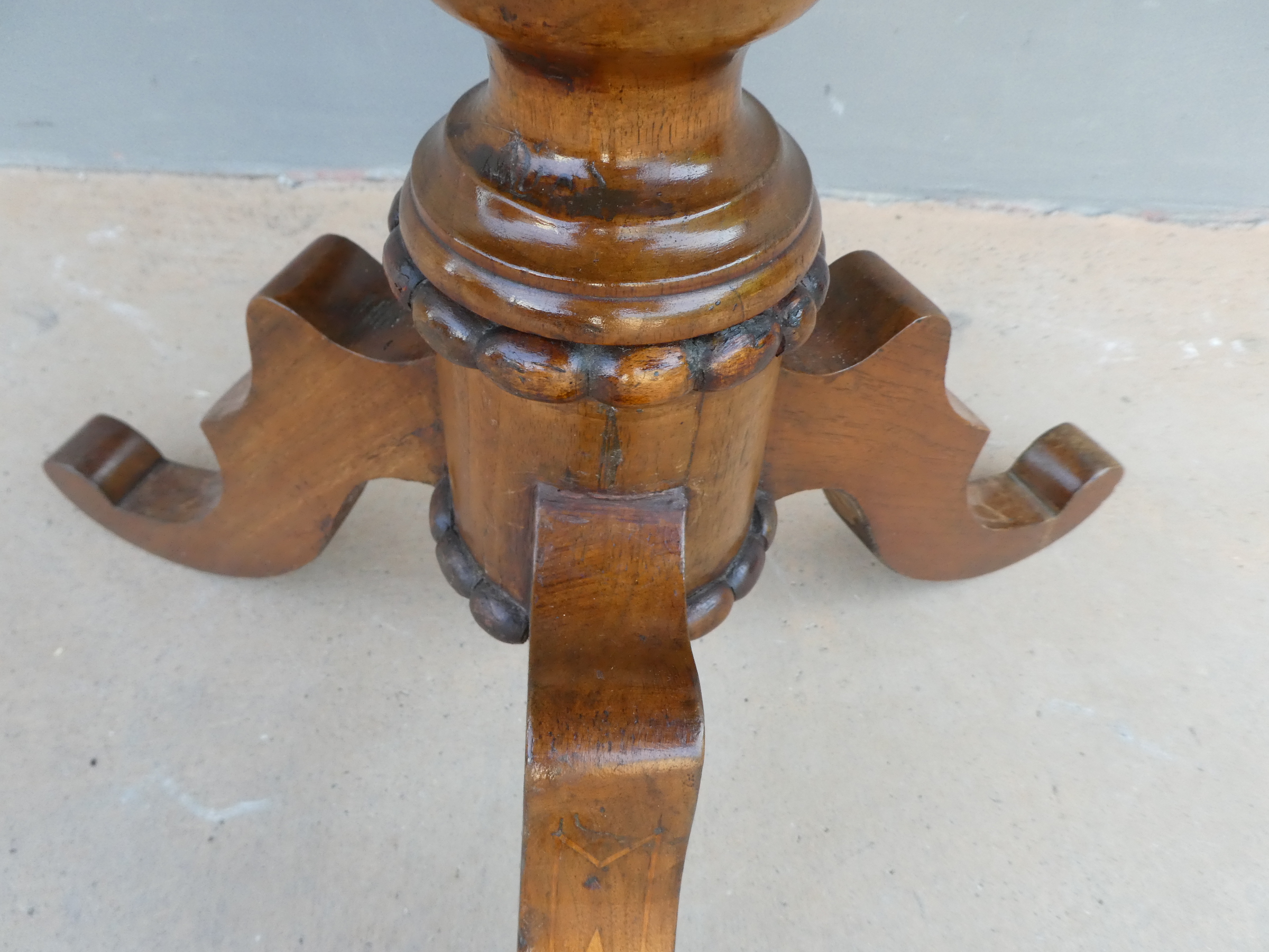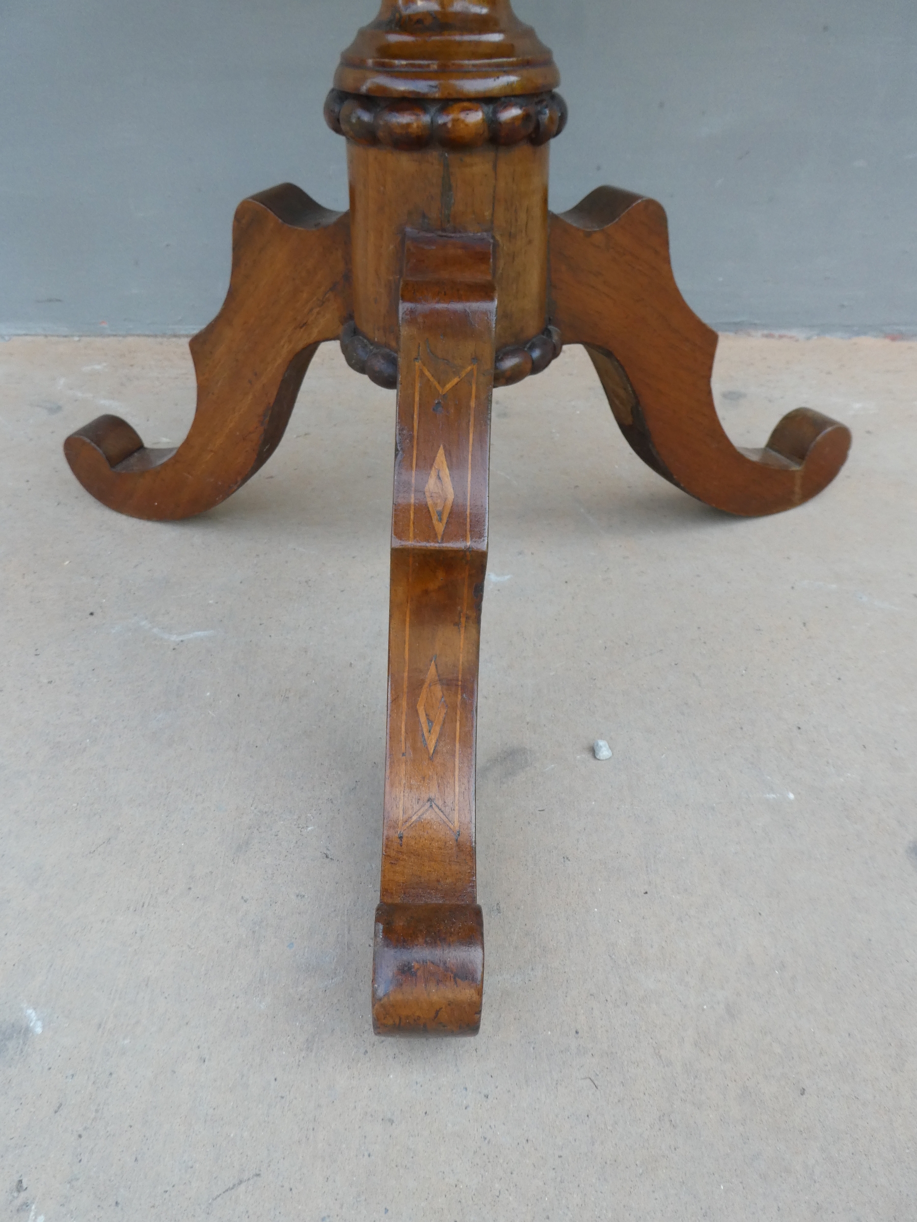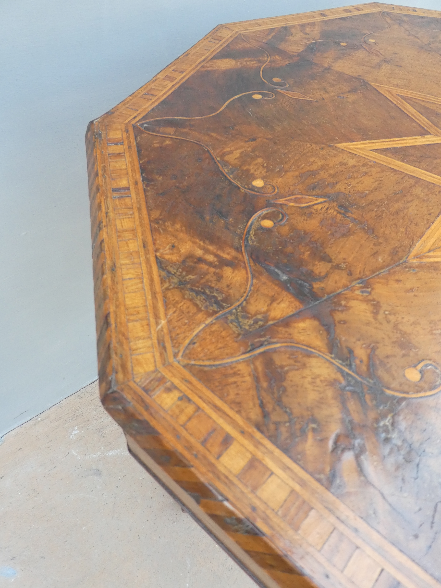 Tavolino d’appoggio sfaccettato decagonale con cassettino frontale a scomparsa, appartenente d’epoca alla metà dell’800. La struttura, sorretta da un gambo centrale ramificato su tre piedi d’appoggio, si presenta semplice ed elegante. La ricerca di un decoro mirato si riflette anche sulla scelta d’impreziosire il corpo con minuziosi intarsi/filetti, che spiccano contrastanti sulla delicata superficie in noce che fa da sfondo. Necessita di piccoli interventi di restauro.