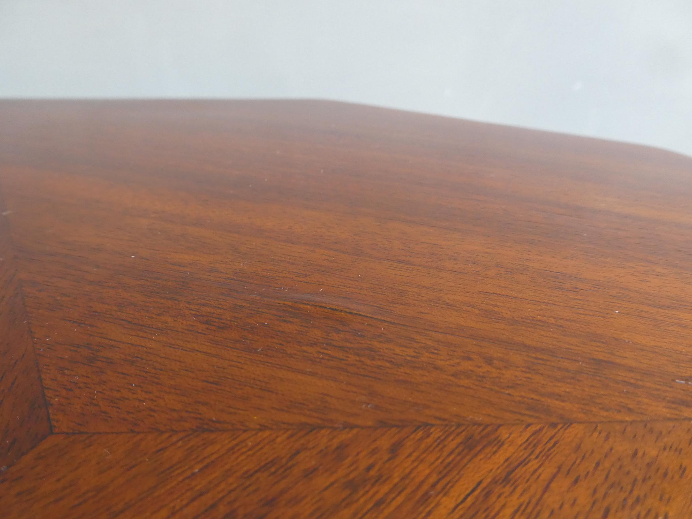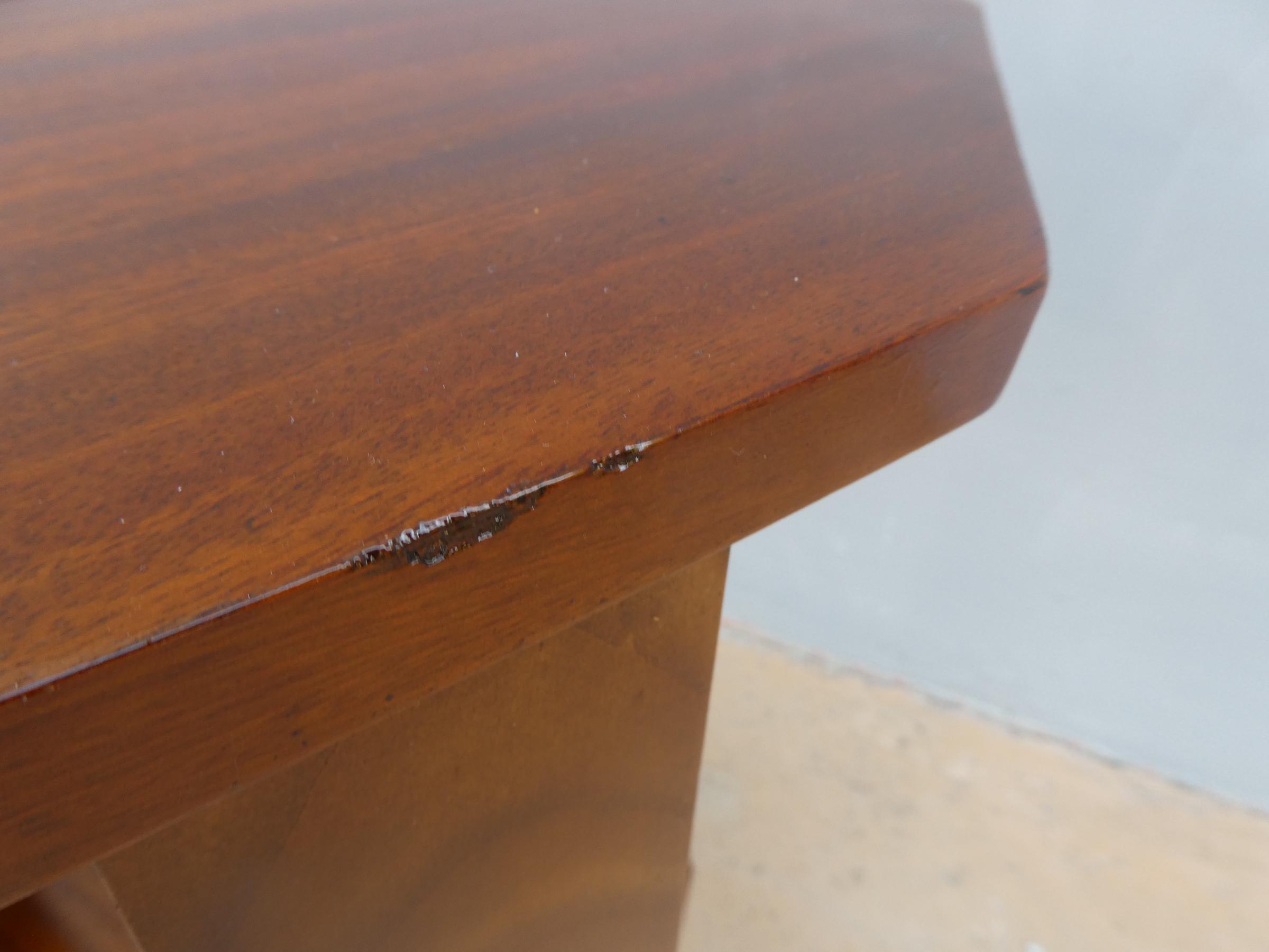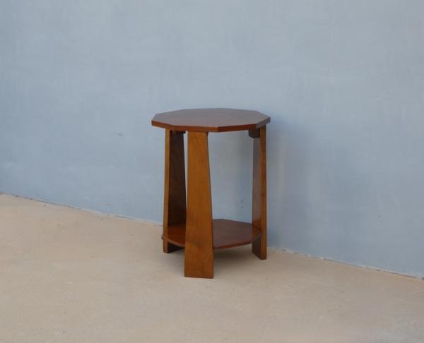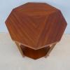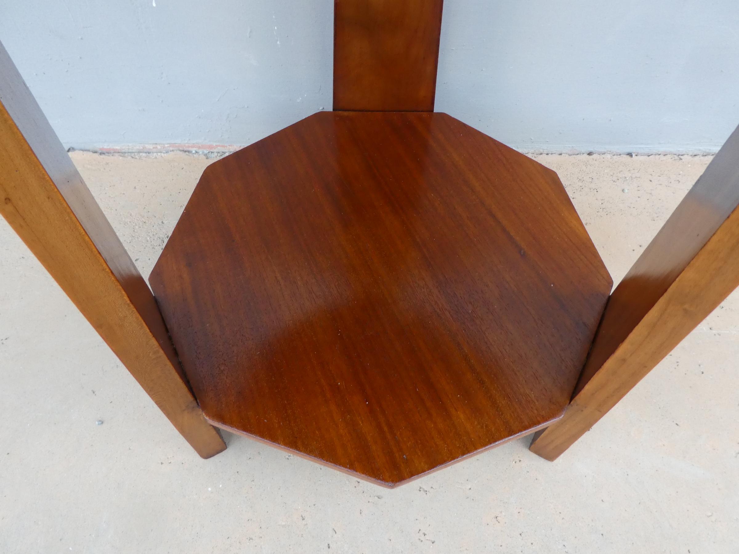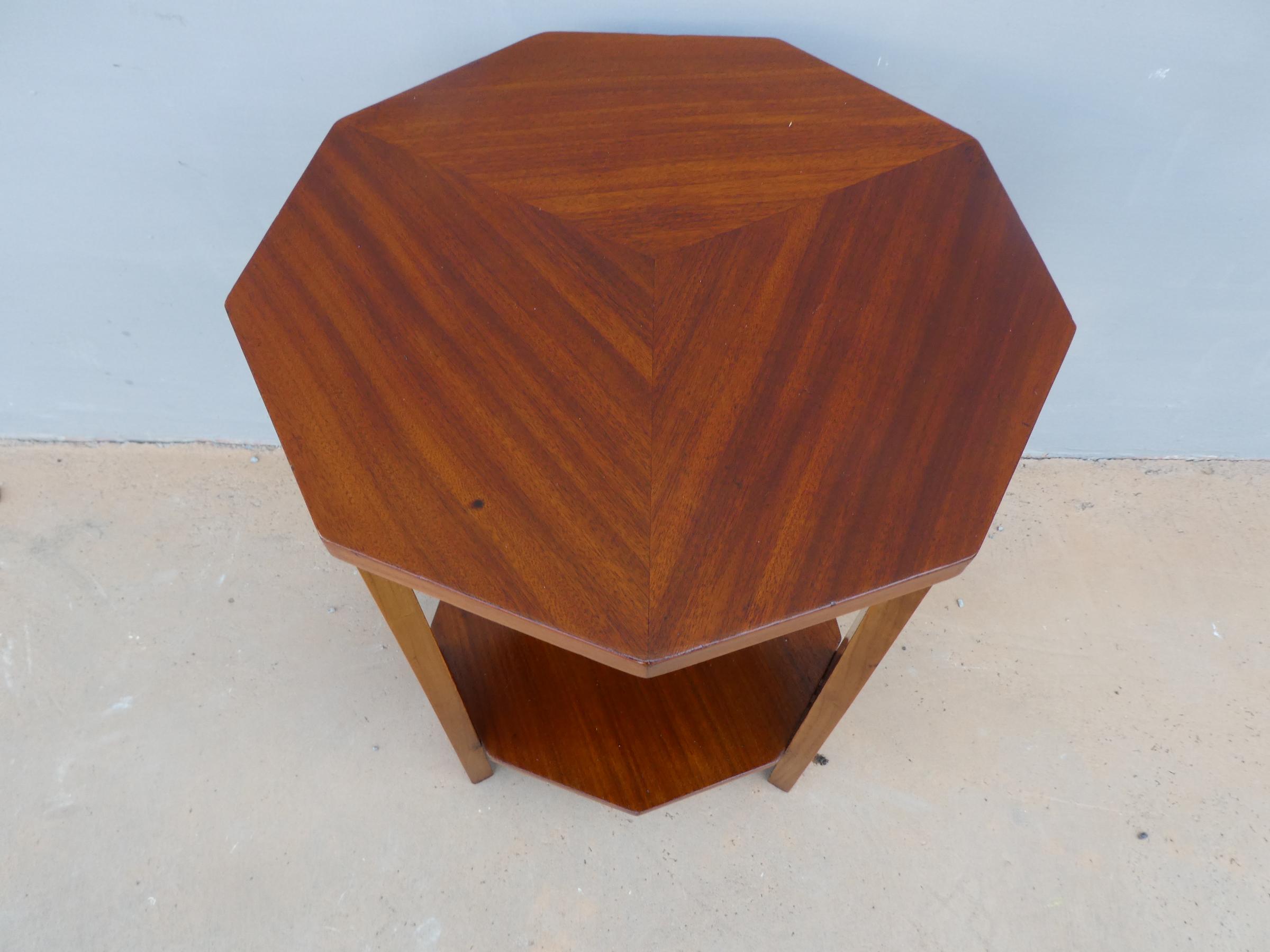 Tavolino mobiletto Decò con due ripiani d’appoggio sfaccettati, impiallacciato in mogano ed appartenente d’epoca alla metà del ‘900. Presenta piccoli segni d’usura (foto).