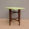 Tavolino etager quadrato con ripiano d’appoggio (recentemente) laccato. Questo genere di mobile è caratterizzato da geometricità e grande leggerezza. La struttura, infatti, sorretta da quattro lineari montanti in legno, e priva di decorazioni, si presenta semplice ed essenziale. Epoca seconda metà ‘900 – modernariato anni ’60.
