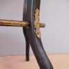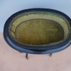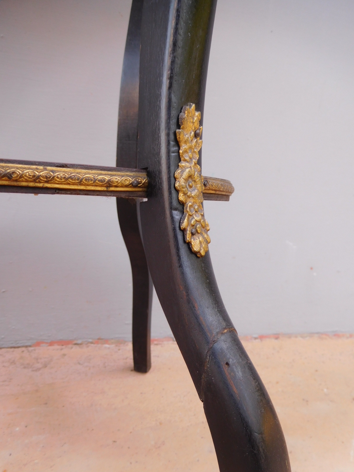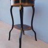 Tavolino fioriera ovale Napoleone III, appartenente d’epoca alla fine dell’800. La delicata struttura, oltre a vantare proporzioni sapientemente equilibrate, si contraddistingue per il piano d’appoggio apribile, che cela internamente una vaschetta rivestita in tessuto. E’ inoltre impreziosita da ricchi intarsi/filetti, contrastanti con la raffinata superficie in che fa sfondo, caratteristici dello stile. Necessita di leggeri interventi di restauro (foto complete sul nostro sito www.gascoantichita.it).