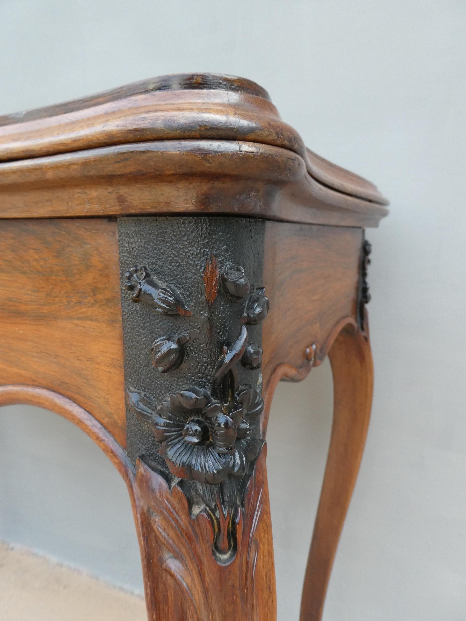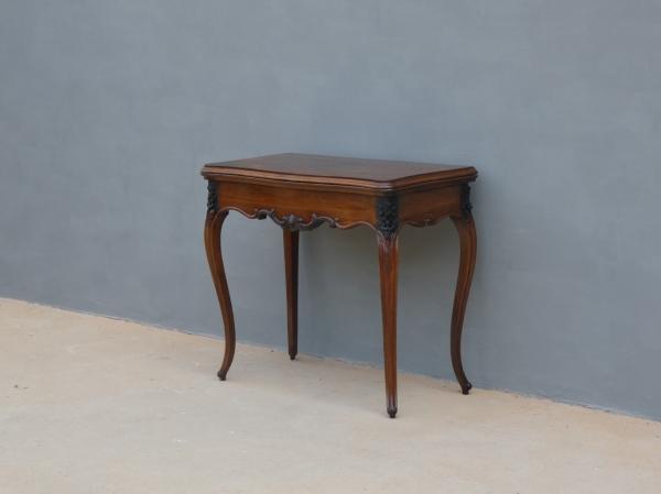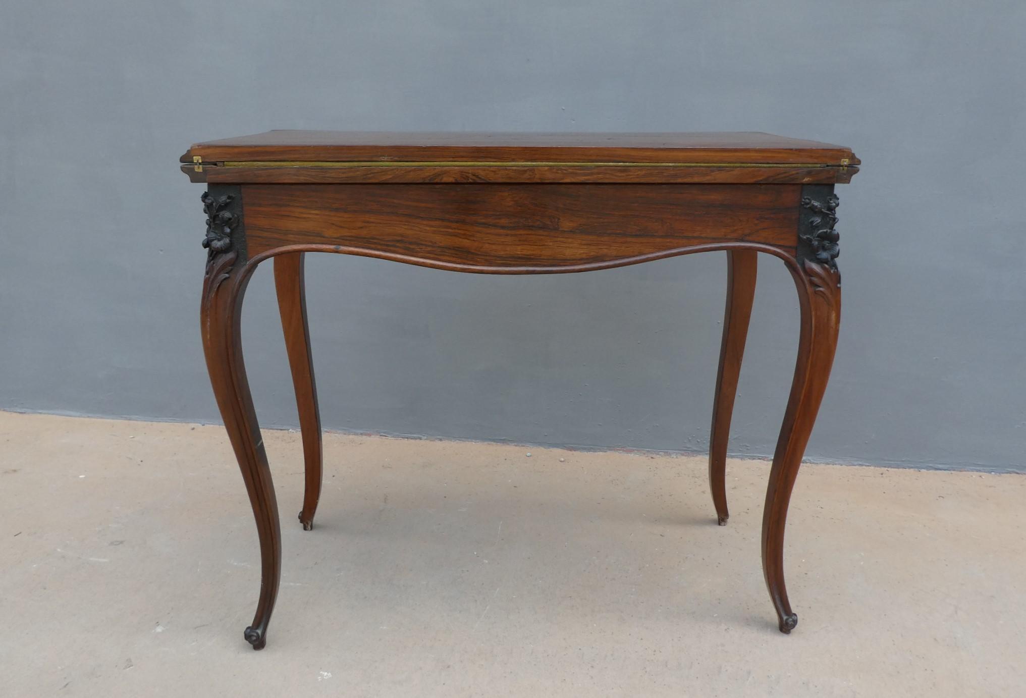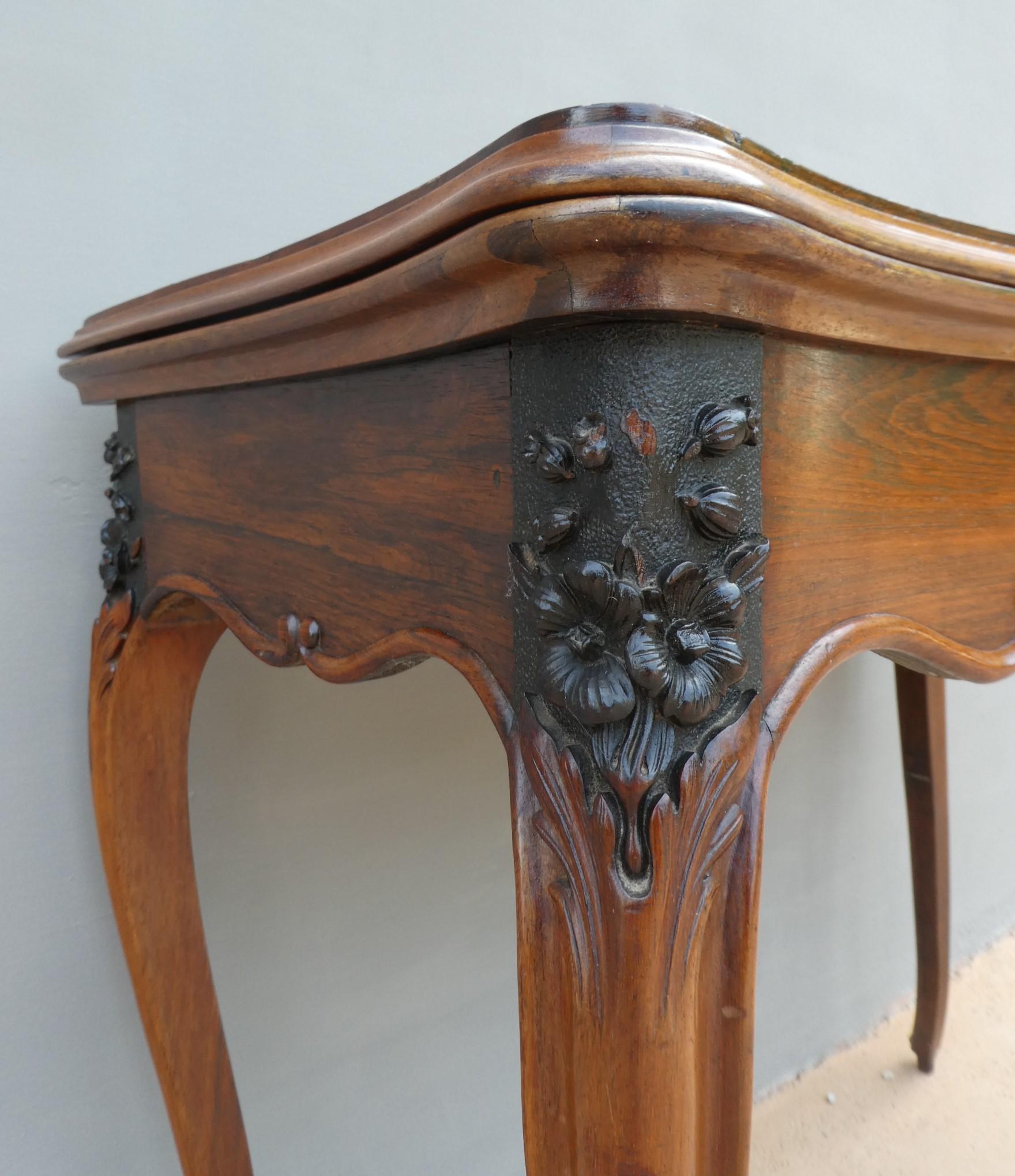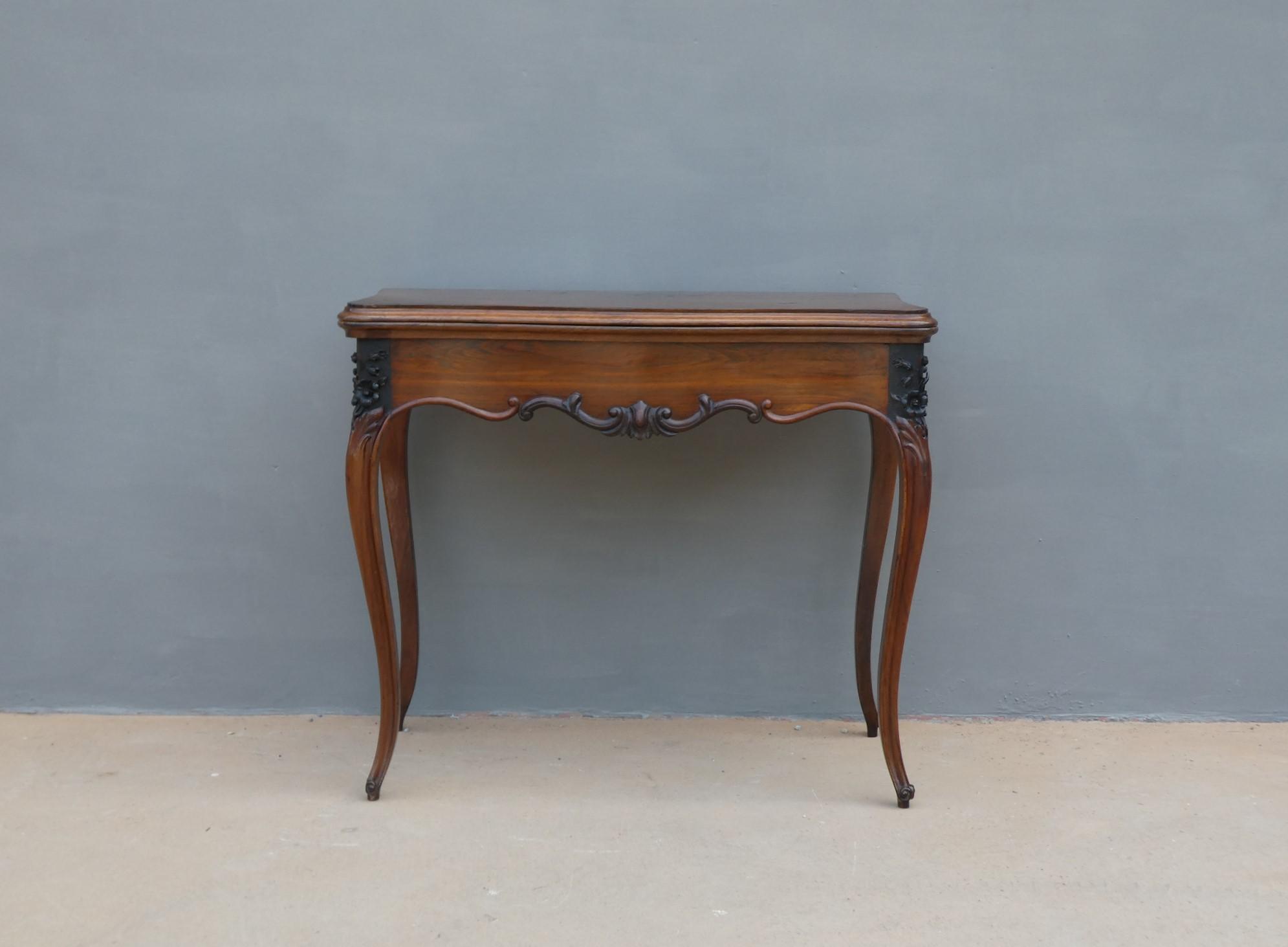 Tavolino console rettangolare da gioco realizzato in palissandro, sorretto da lunghi e sinuosi montanti, arricchiti all’estremità con ricchi intagli, ed appartenente d’epoca alla fine dell’800. Il mobile è studiato in modo tale che, aprendo la plancia, e facendola appoggiare al cassetto a scomparsa, che si ottiene sfilando il retro della struttura, raddoppi la superficie d’appoggio. L’interno è rivestito in tessuto. Necessita di leggeri interventi di restauro.