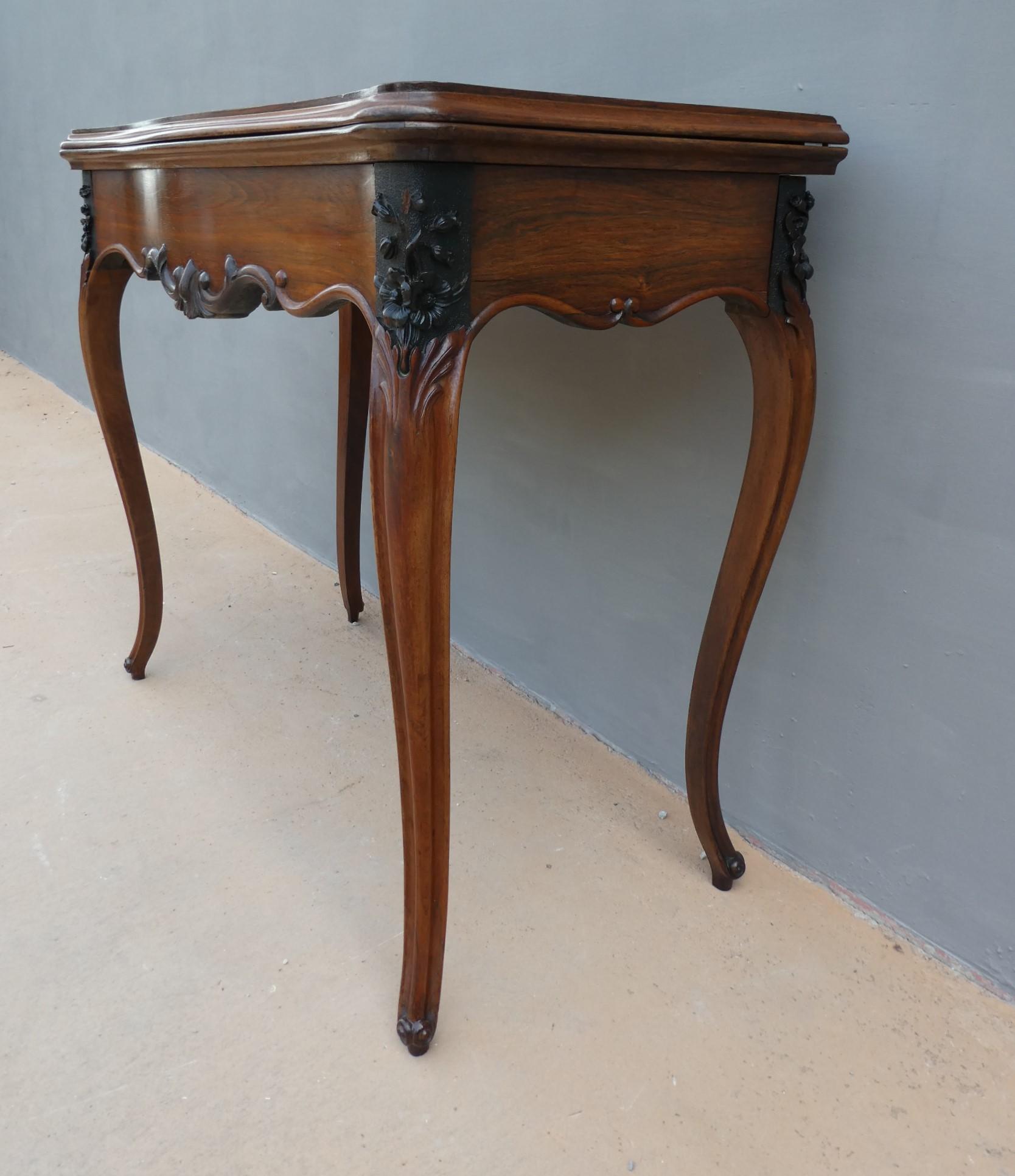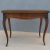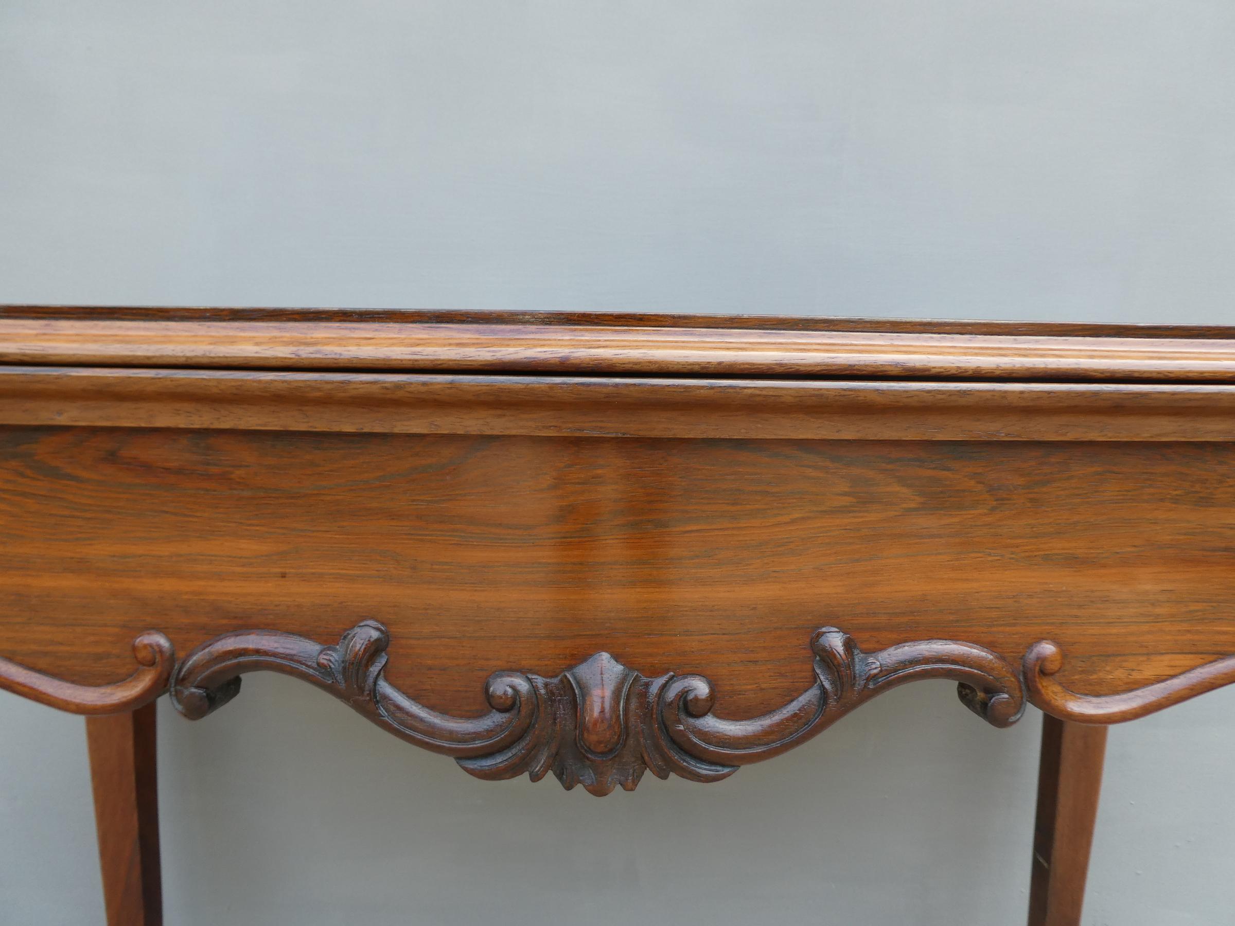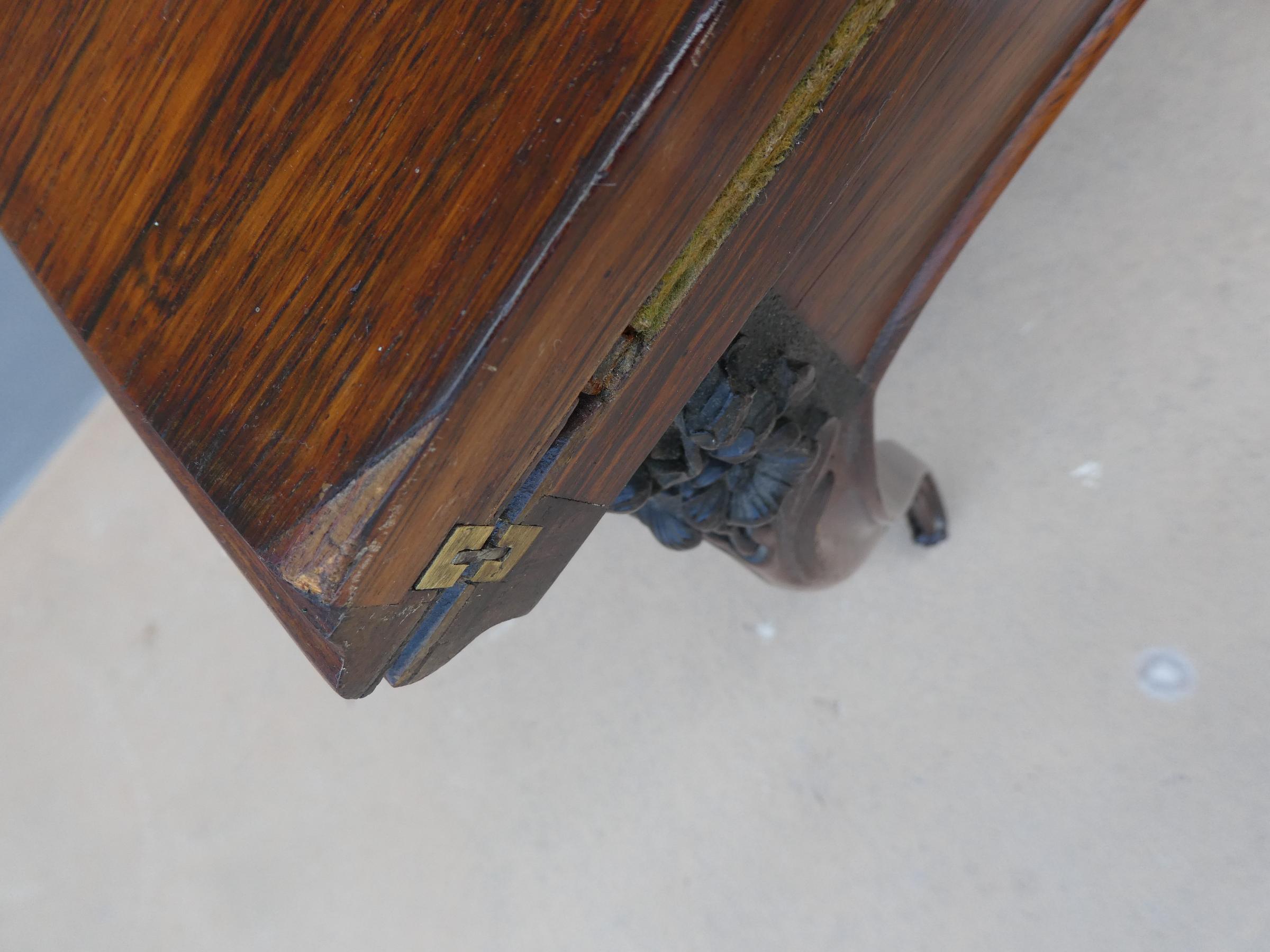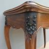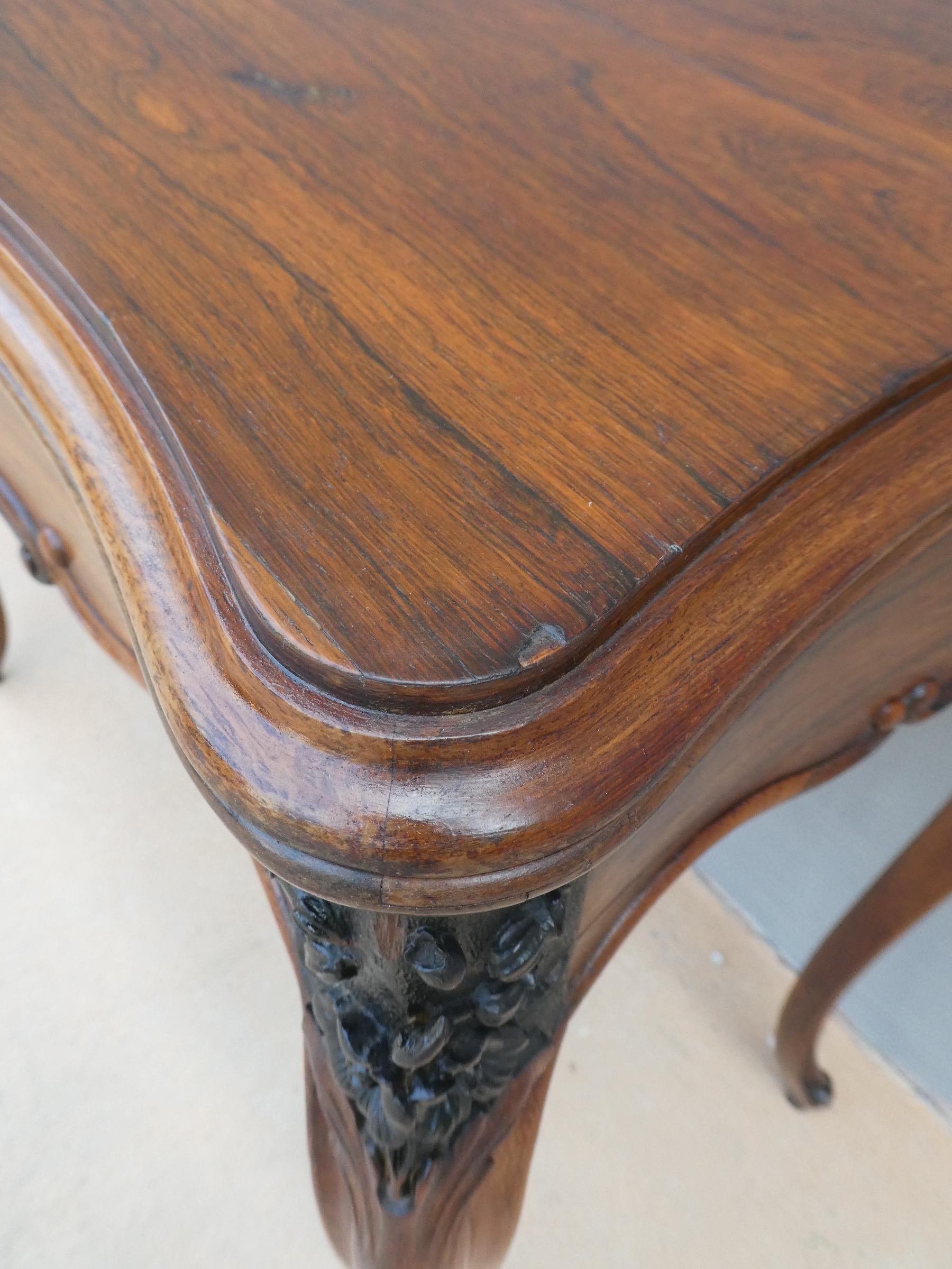 Tavolino console rettangolare da gioco realizzato in palissandro, sorretto da lunghi e sinuosi montanti, arricchiti all’estremità con ricchi intagli, ed appartenente d’epoca alla fine dell’800. Il mobile è studiato in modo tale che, aprendo la plancia, e facendola appoggiare al cassetto a scomparsa, che si ottiene sfilando il retro della struttura, raddoppi la superficie d’appoggio. L’interno è rivestito in tessuto. Necessita di leggeri interventi di restauro.
