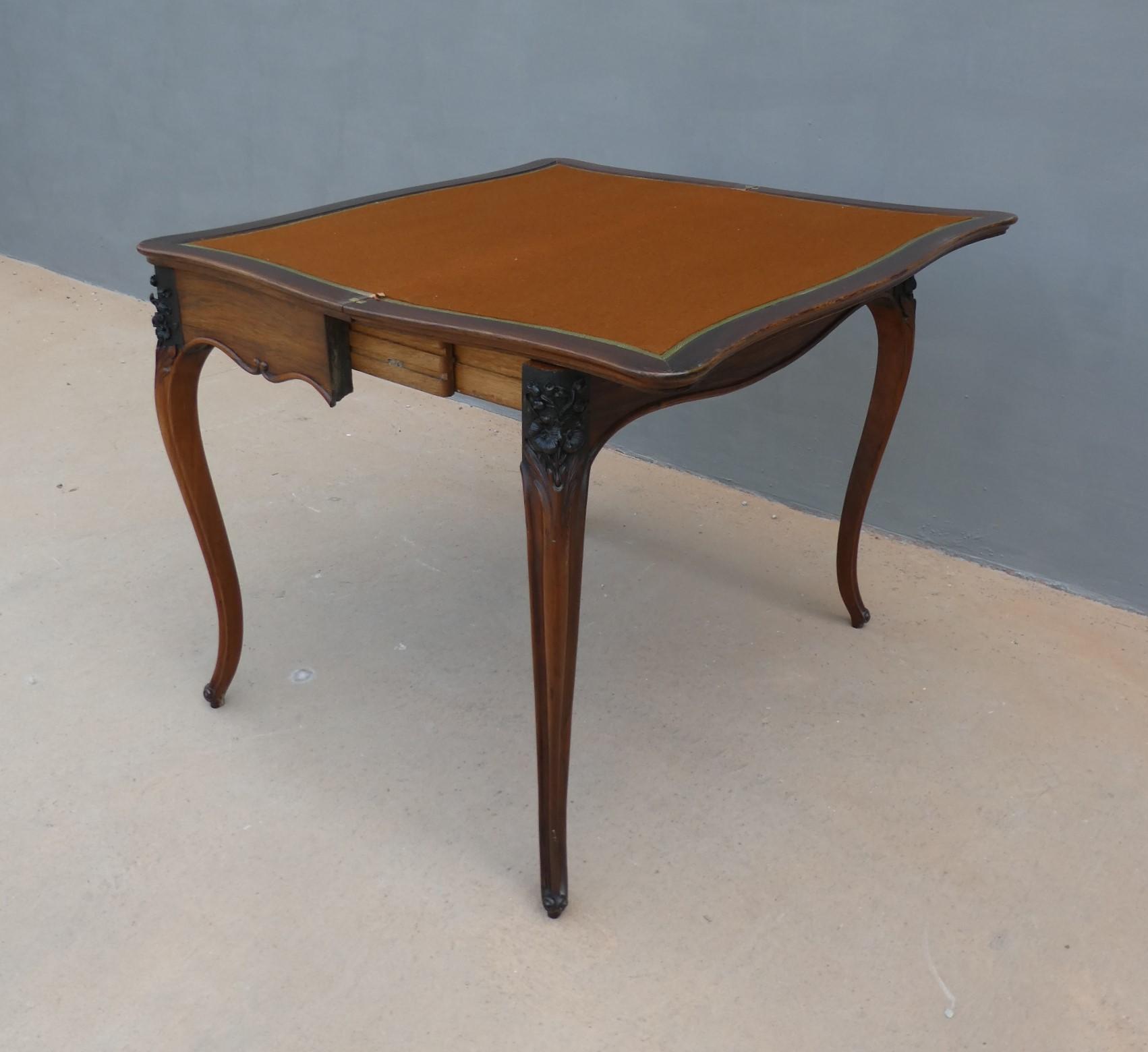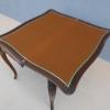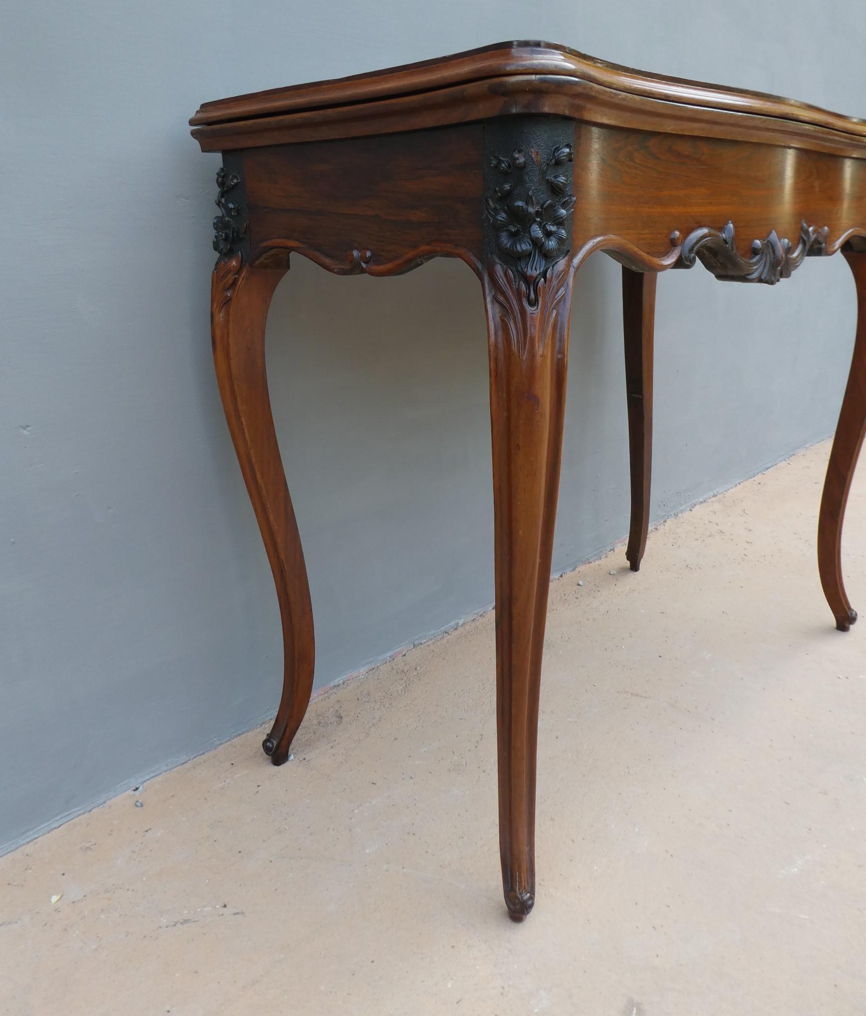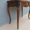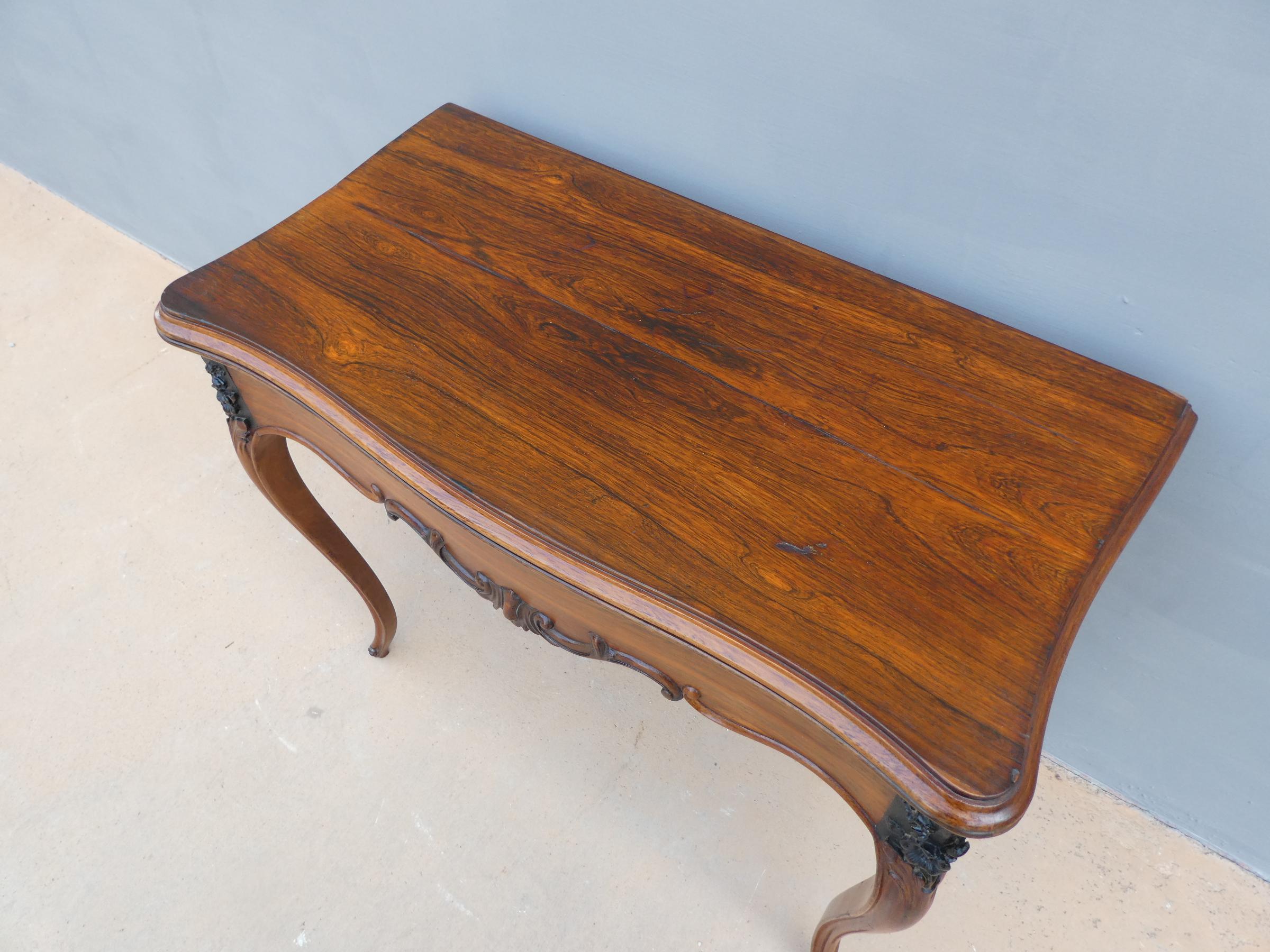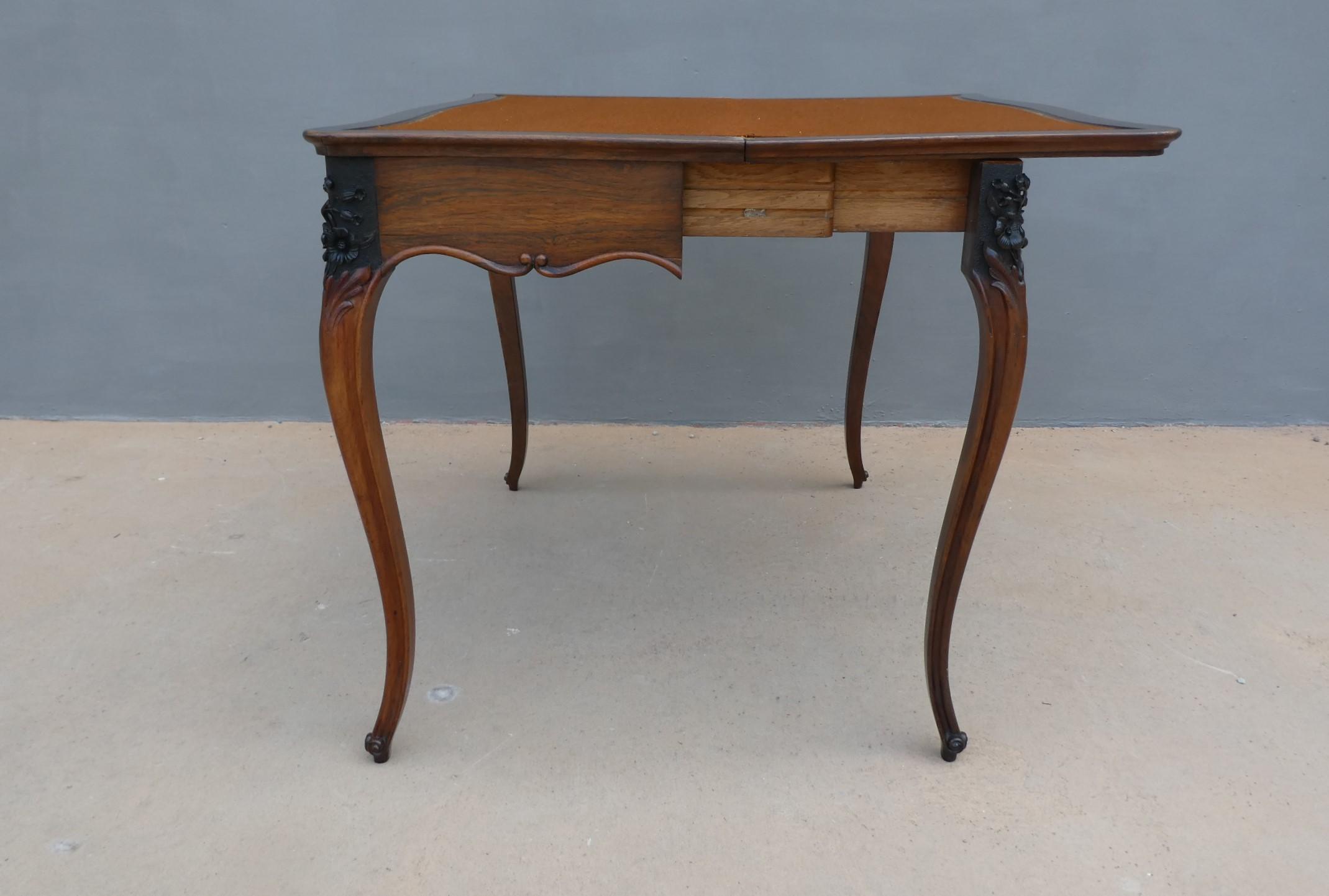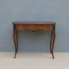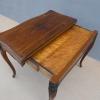 Tavolino console rettangolare da gioco realizzato in palissandro, sorretto da lunghi e sinuosi montanti, arricchiti all’estremità con ricchi intagli, ed appartenente d’epoca alla fine dell’800. Il mobile è studiato in modo tale che, aprendo la plancia, e facendola appoggiare al cassetto a scomparsa, che si ottiene sfilando il retro della struttura, raddoppi la superficie d’appoggio. L’interno è rivestito in tessuto. Necessita di leggeri interventi di restauro.