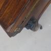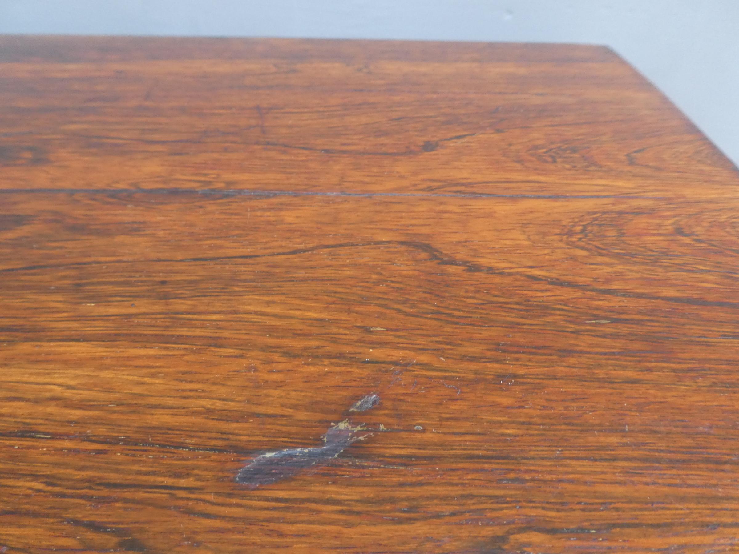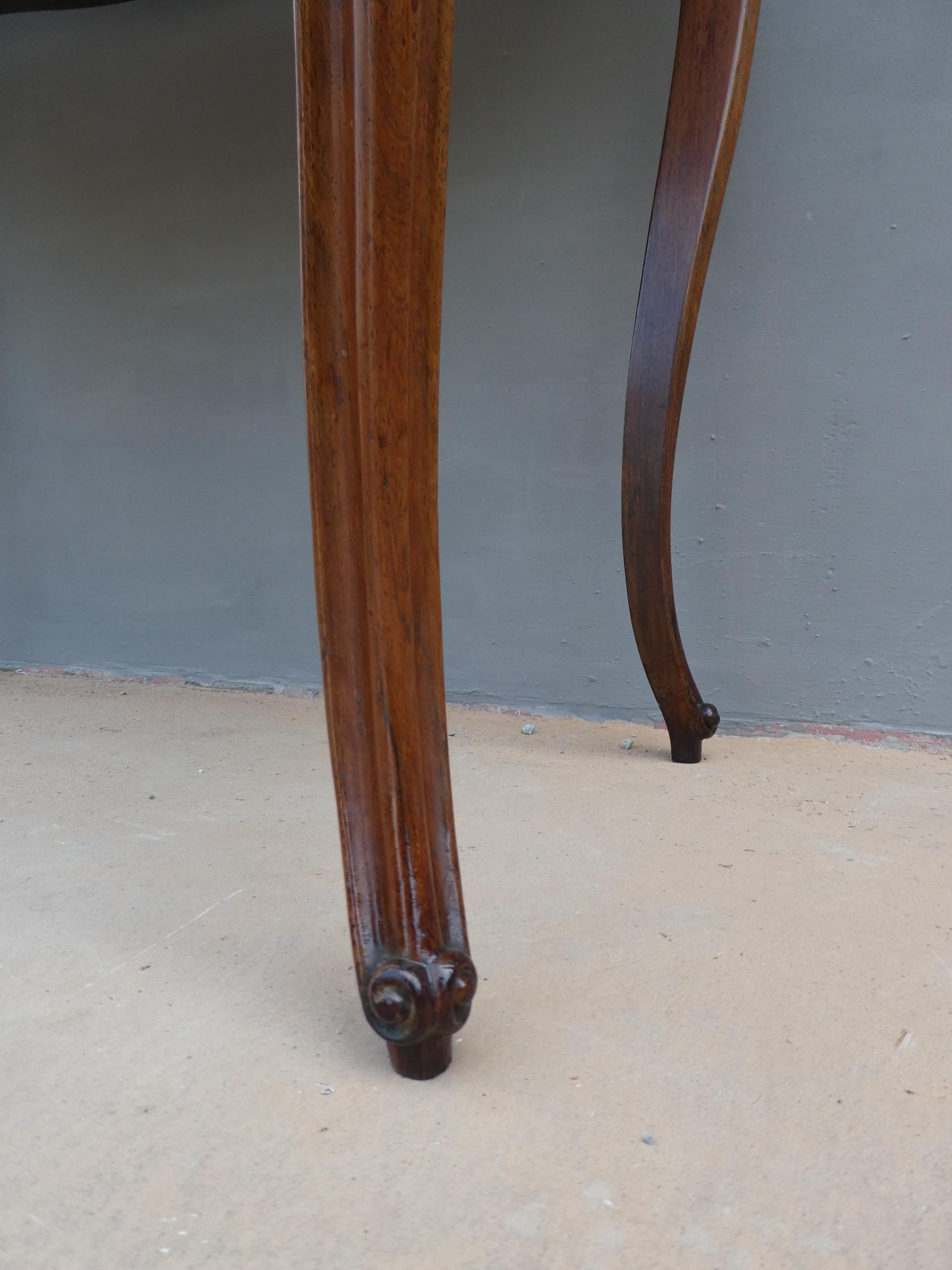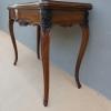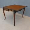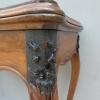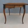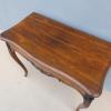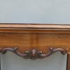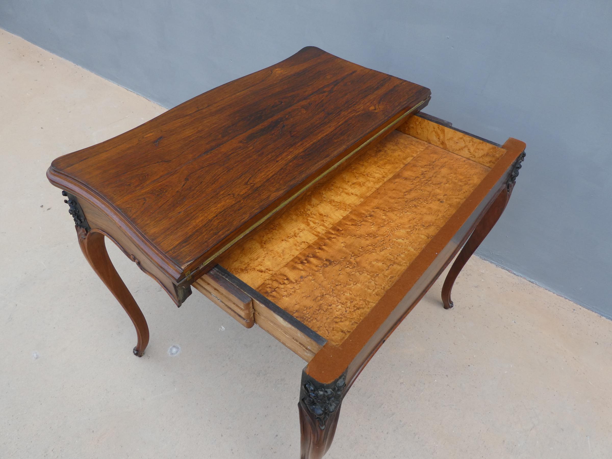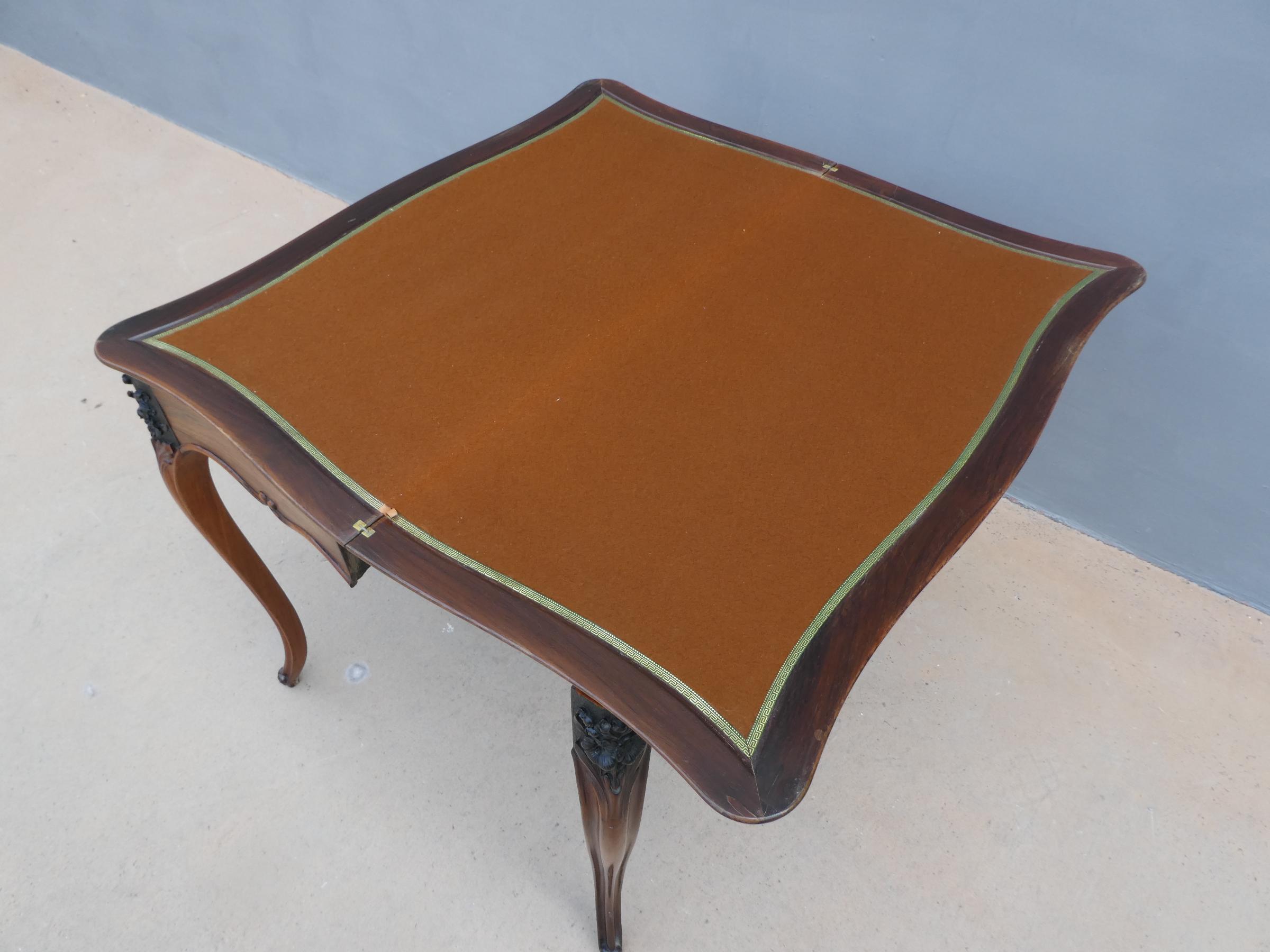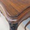 Tavolino console rettangolare da gioco realizzato in palissandro, sorretto da lunghi e sinuosi montanti, arricchiti all’estremità con ricchi intagli, ed appartenente d’epoca alla fine dell’800. Il mobile è studiato in modo tale che, aprendo la plancia, e facendola appoggiare al cassetto a scomparsa, che si ottiene sfilando il retro della struttura, raddoppi la superficie d’appoggio. L’interno è rivestito in tessuto. Necessita di leggeri interventi di restauro.