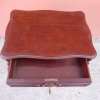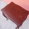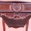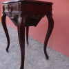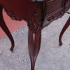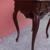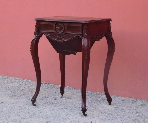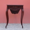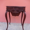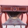 Tavolino rettangolare d’appoggio con vaschetta portaoggetti e cassettino frontale, francese, appartenente d’epoca alla fine dell’800. L’intagliata struttura conferisce una raffinata eleganza. La ricerca di un decoro delicato si riflette anche sulla scelta d’utilizzare il mogano; un’essenza nota e delicata, ricca di venature di tonalità più scura. Rifinito minuziosamente anche sul retro. Necessita di restauro.