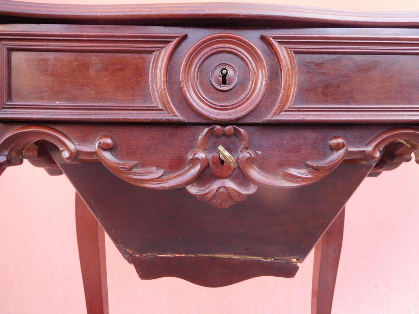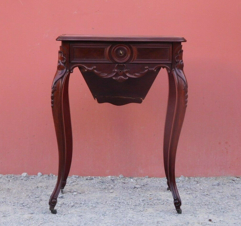 Tavolino rettangolare d’appoggio con vaschetta portaoggetti e cassettino frontale, francese, appartenente d’epoca alla fine dell’800. L’intagliata struttura conferisce una raffinata eleganza. La ricerca di un decoro delicato si riflette anche sulla scelta d’utilizzare il mogano; un’essenza nota e delicata, ricca di venature di tonalità più scura. Rifinito minuziosamente anche sul retro. Necessita di restauro.