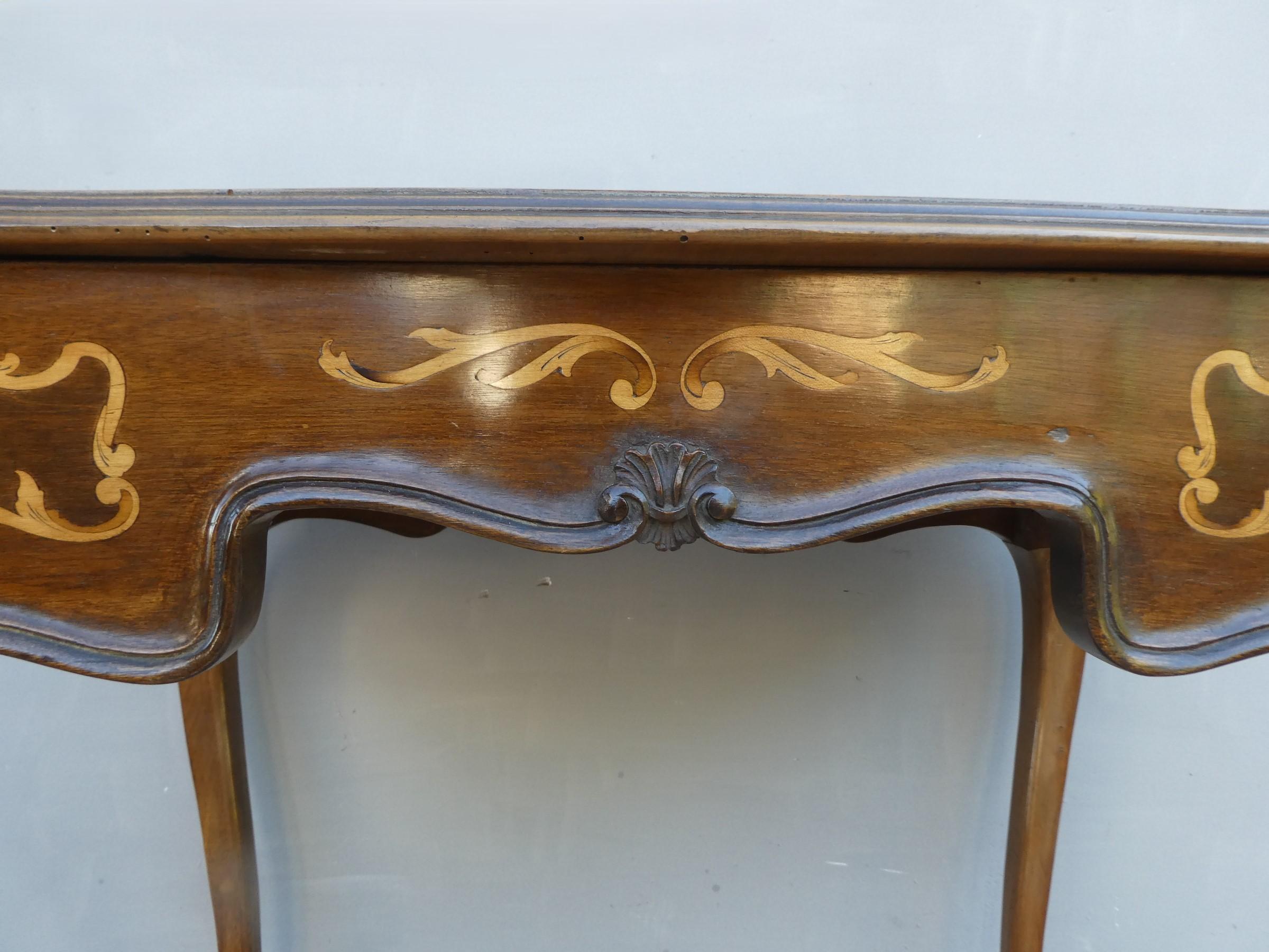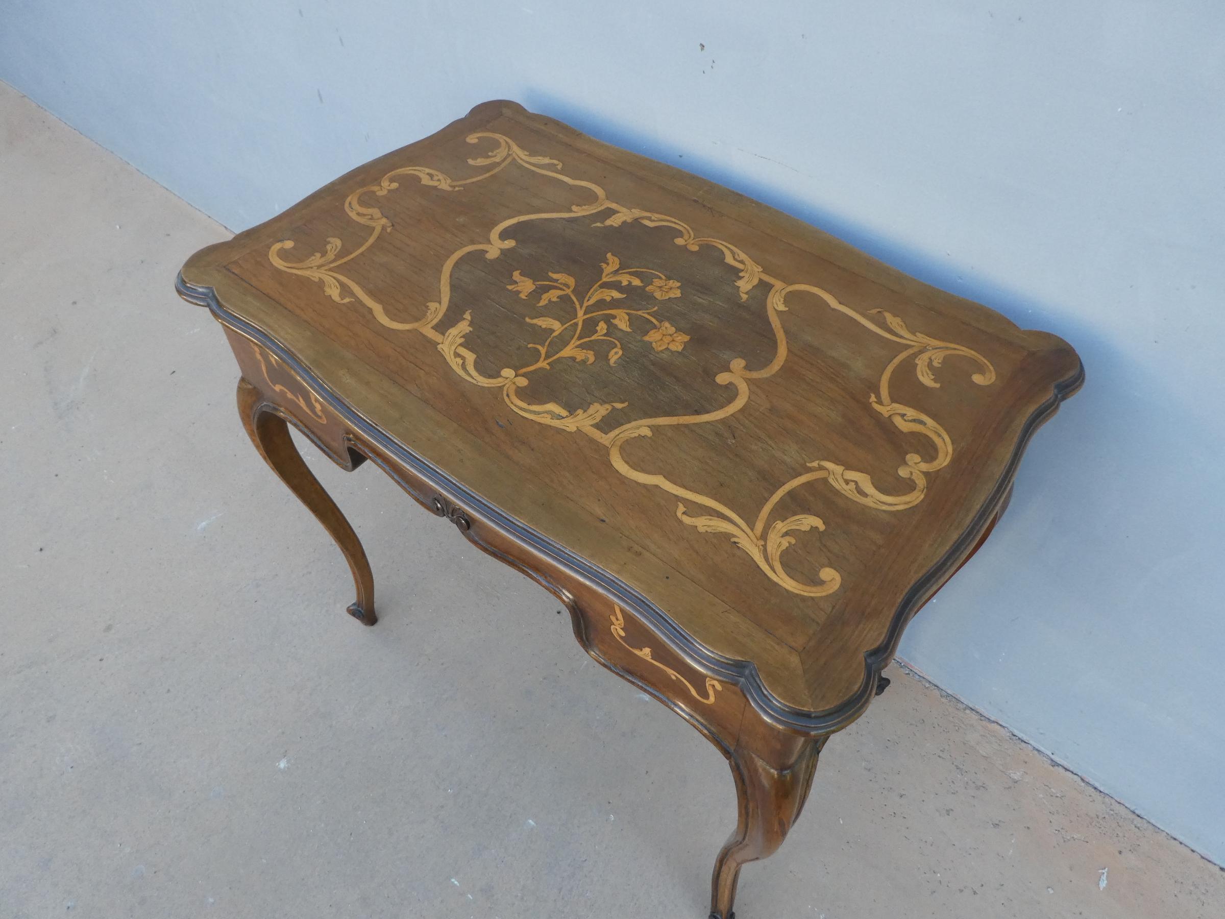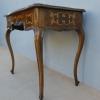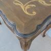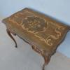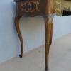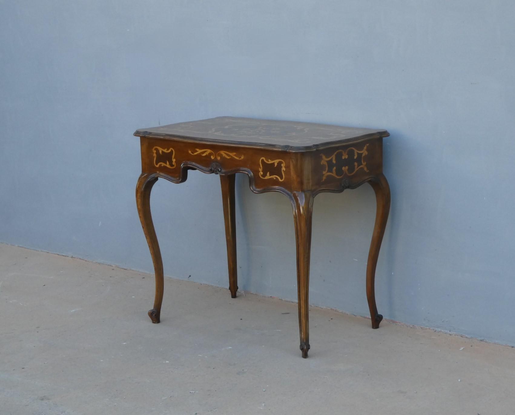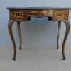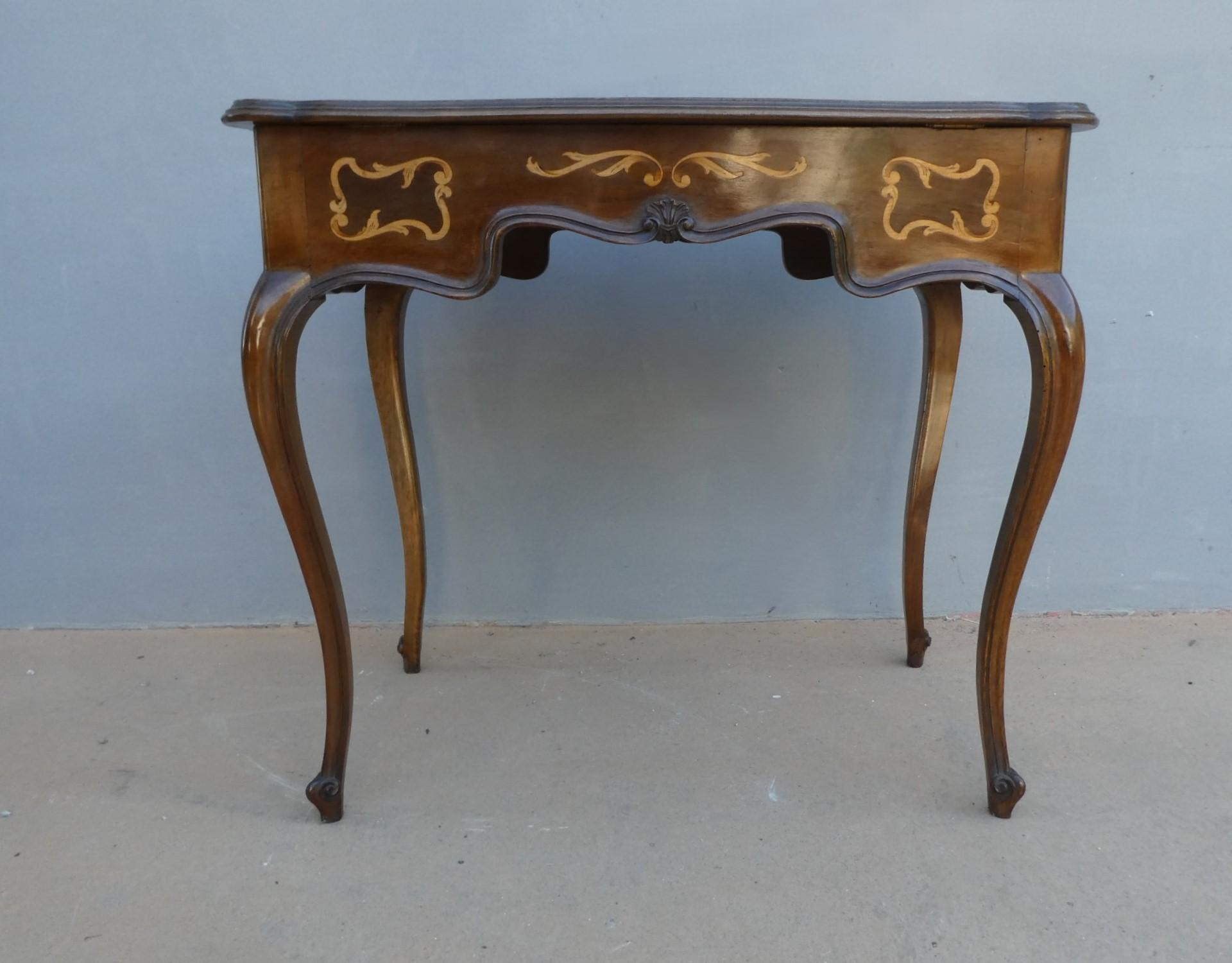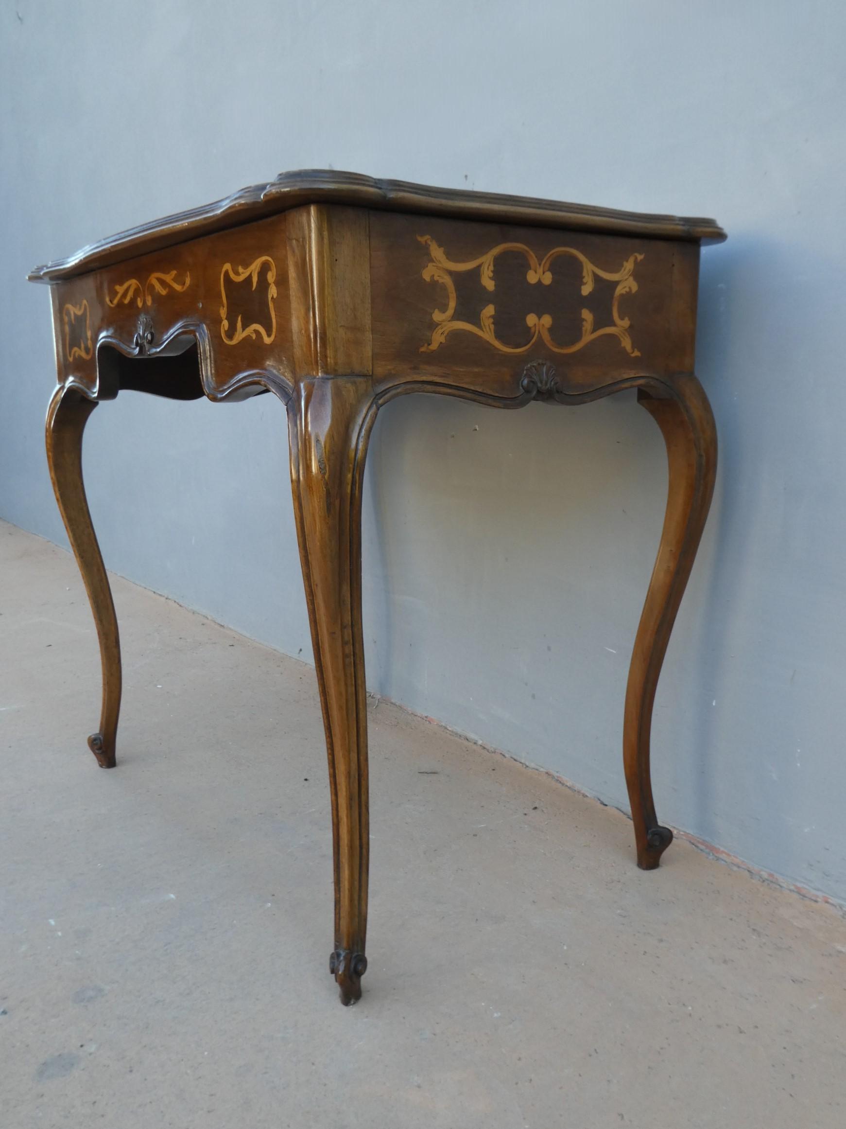 Tavolino scrittoio coiffeuse stile piemontese dotato di un piano d’appoggio apribile, fornito al suo interno di uno scomparto ed uno specchio. L’armoniosa struttura, sorretta dagli incurvati montanti, si presenta sinuosa ed elegante. La ricerca di un decoro mirato si riflette sulla scelta di voler impreziosire il corpo con delicati filetti/intarsi, che spiccano contrastanti sulla superficie in noce (il piano è impiallacciato) che fa da sfondo. Necessita di alcuni interventi di restauro, appartenente d’epoca alla metà del ‘900.
