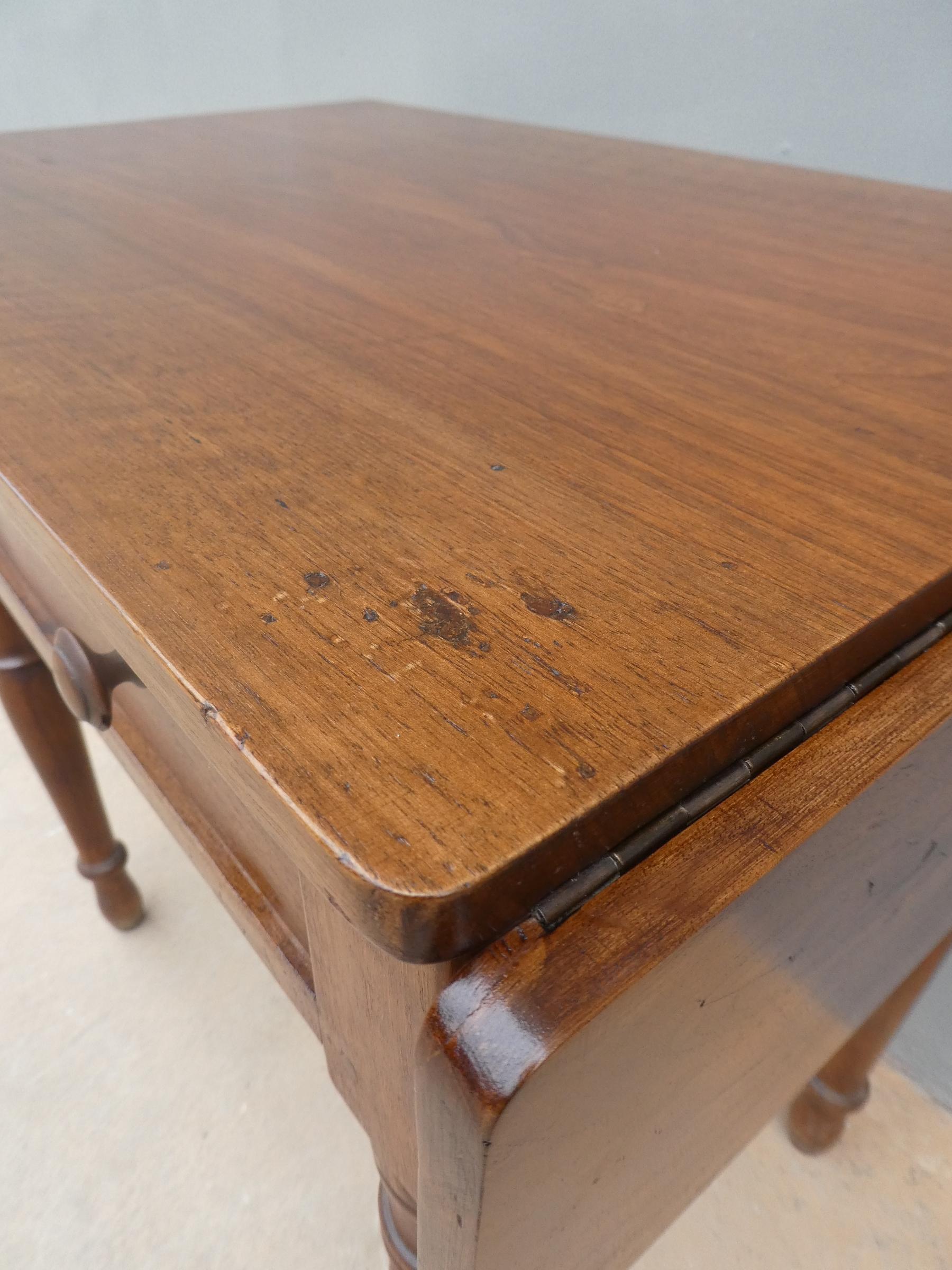 Tavolino scrittoio realizzato in noce e dotato di un cassetto frontale. La particolarità di questo mobile è la sua stessa struttura: alzando le bandelle laterali, e bloccandole con le apposite mensoline in legno poste sotto la plancia, aumenta notevolmente la superficie d’appoggio. Necessita di leggeri interventi di restauro. Epoca ‘900.