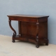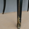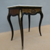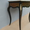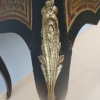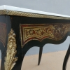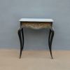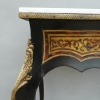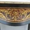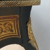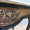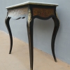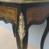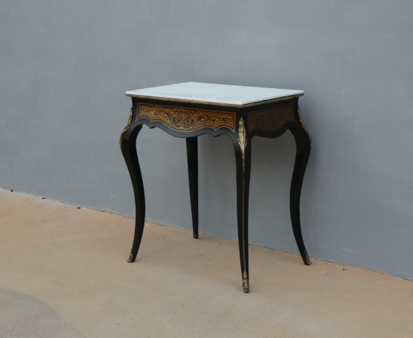Tavolino st.Boulle con piano d’appoggio in marmo, appartenente d’epoca alla fine dell’800. Il forte impatto decorativo è dato dalla scelta d’impreziosire il corpo con lucenti intarsi in ottone, che spiccano contrastanti sulla superficie scura che fa da sfondo. Le applicazioni dorate sui montanti, oltre ad arricchire la struttura, hanno il compito di proteggere la parti più vulnerabili del mobile. Necessita di alcuni interventi di restauro; mancano parti di filetti (foto).