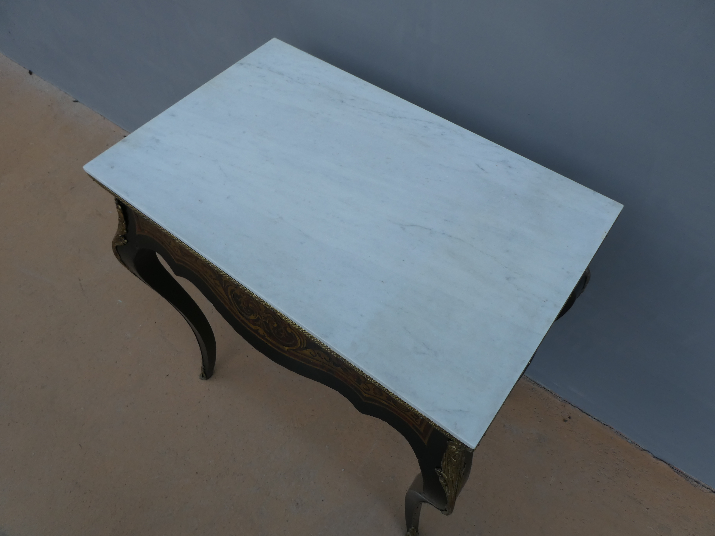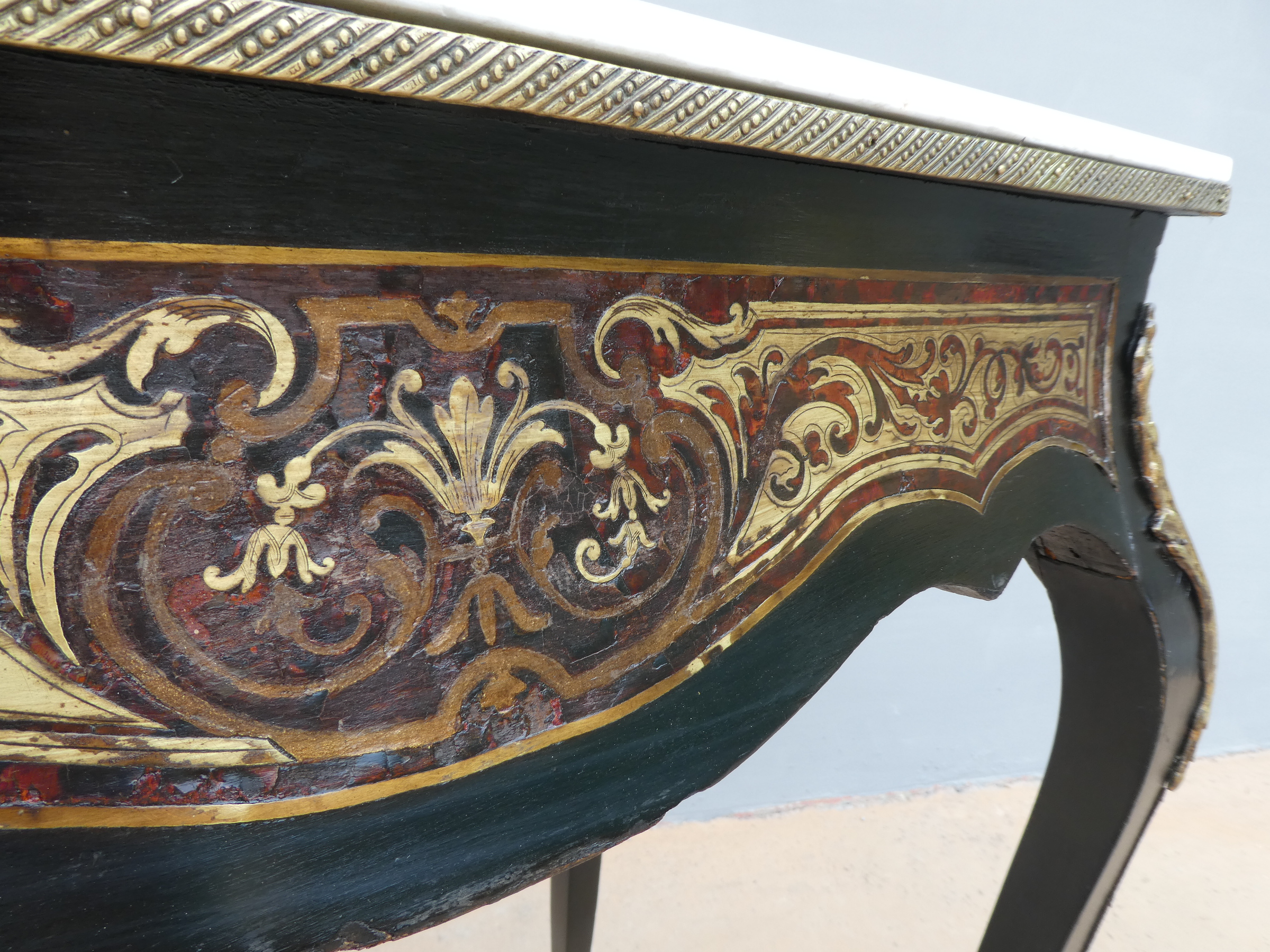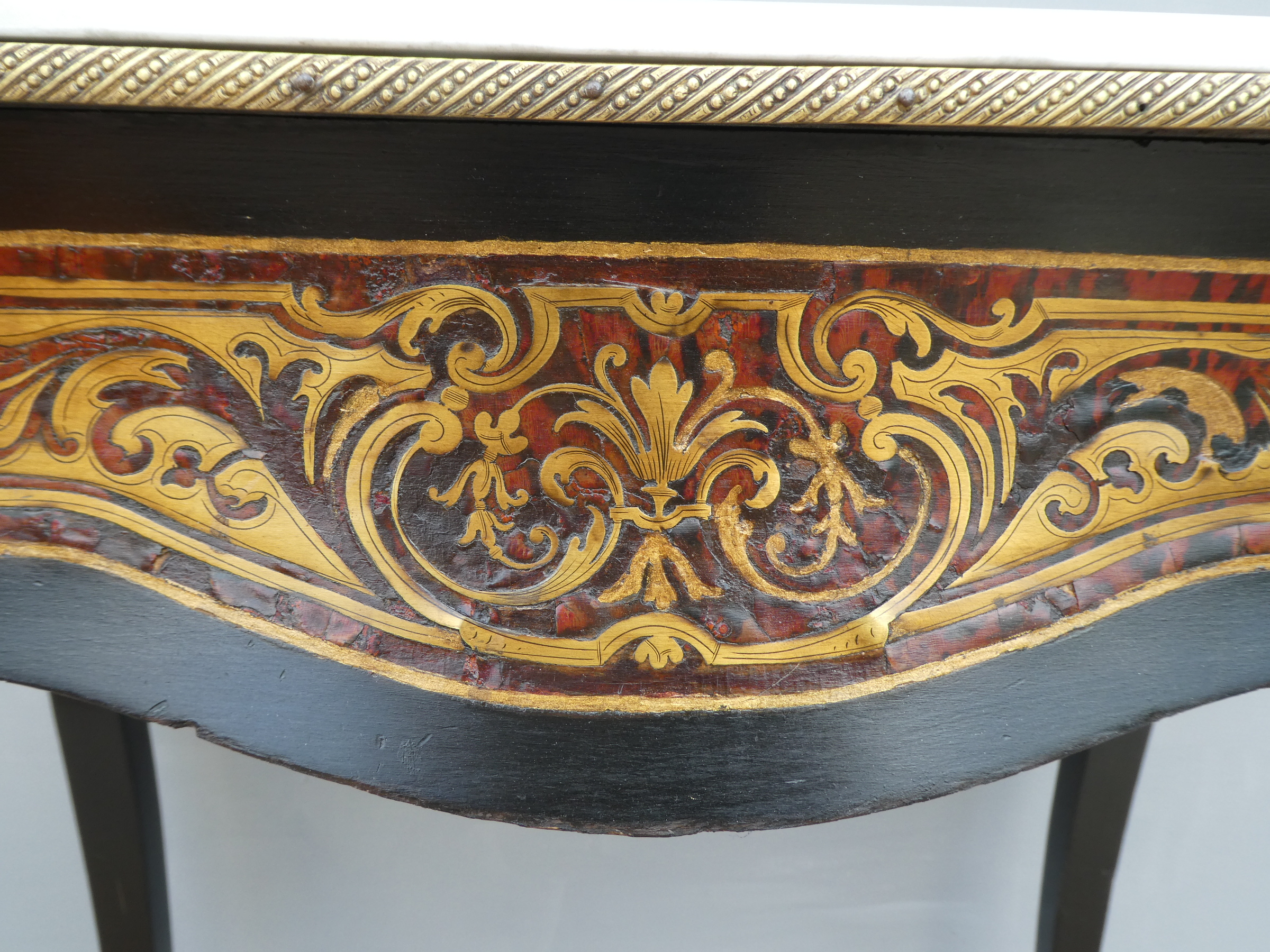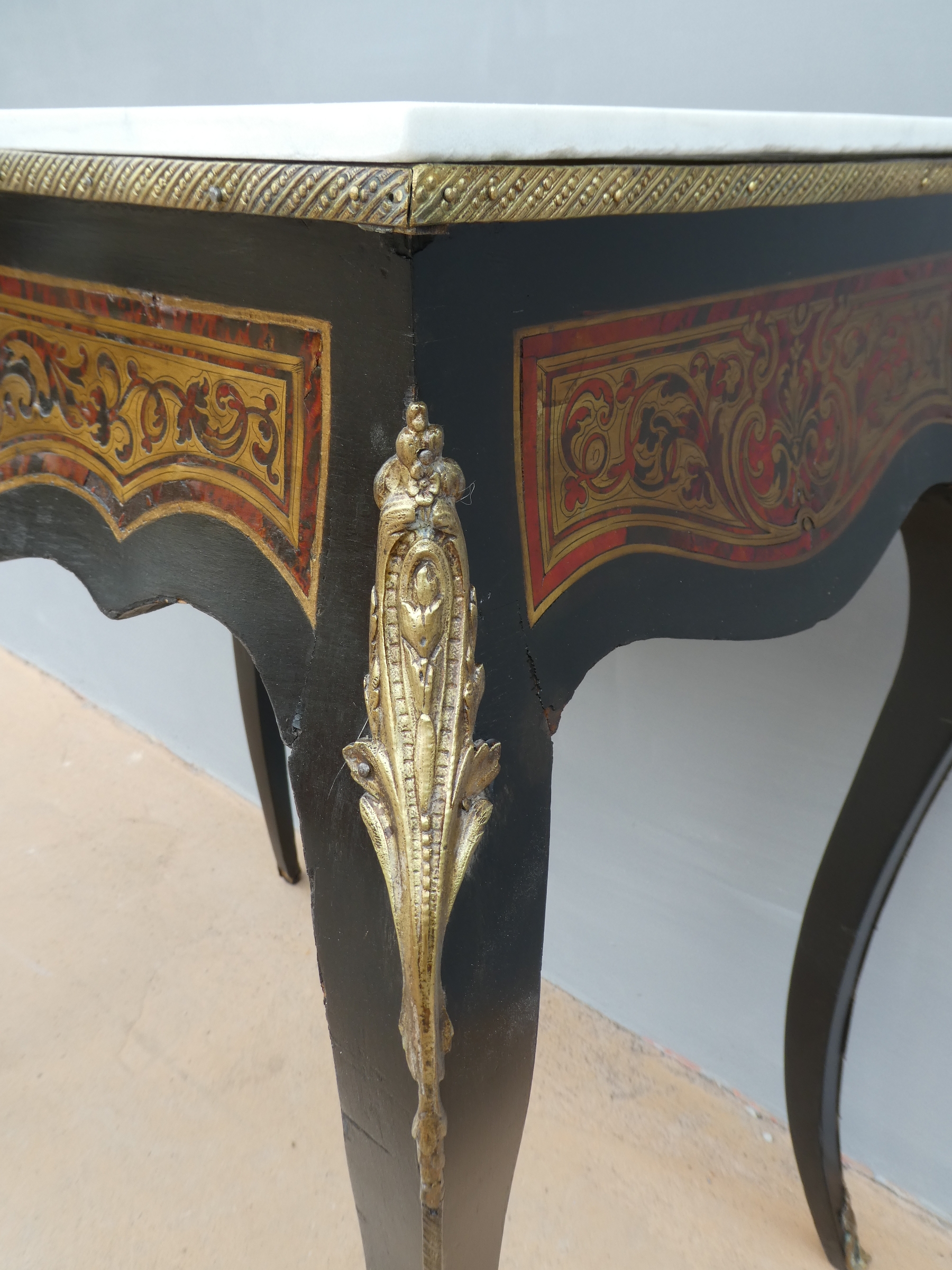 Tavolino st.Boulle con piano d’appoggio in marmo, appartenente d’epoca alla fine dell’800. Il forte impatto decorativo è dato dalla scelta d’impreziosire il corpo con lucenti intarsi in ottone, che spiccano contrastanti sulla superficie scura che fa da sfondo. Le applicazioni dorate sui montanti, oltre ad arricchire la struttura, hanno il compito di proteggere la parti più vulnerabili del mobile. Necessita di alcuni interventi di restauro; mancano parti di filetti (foto).