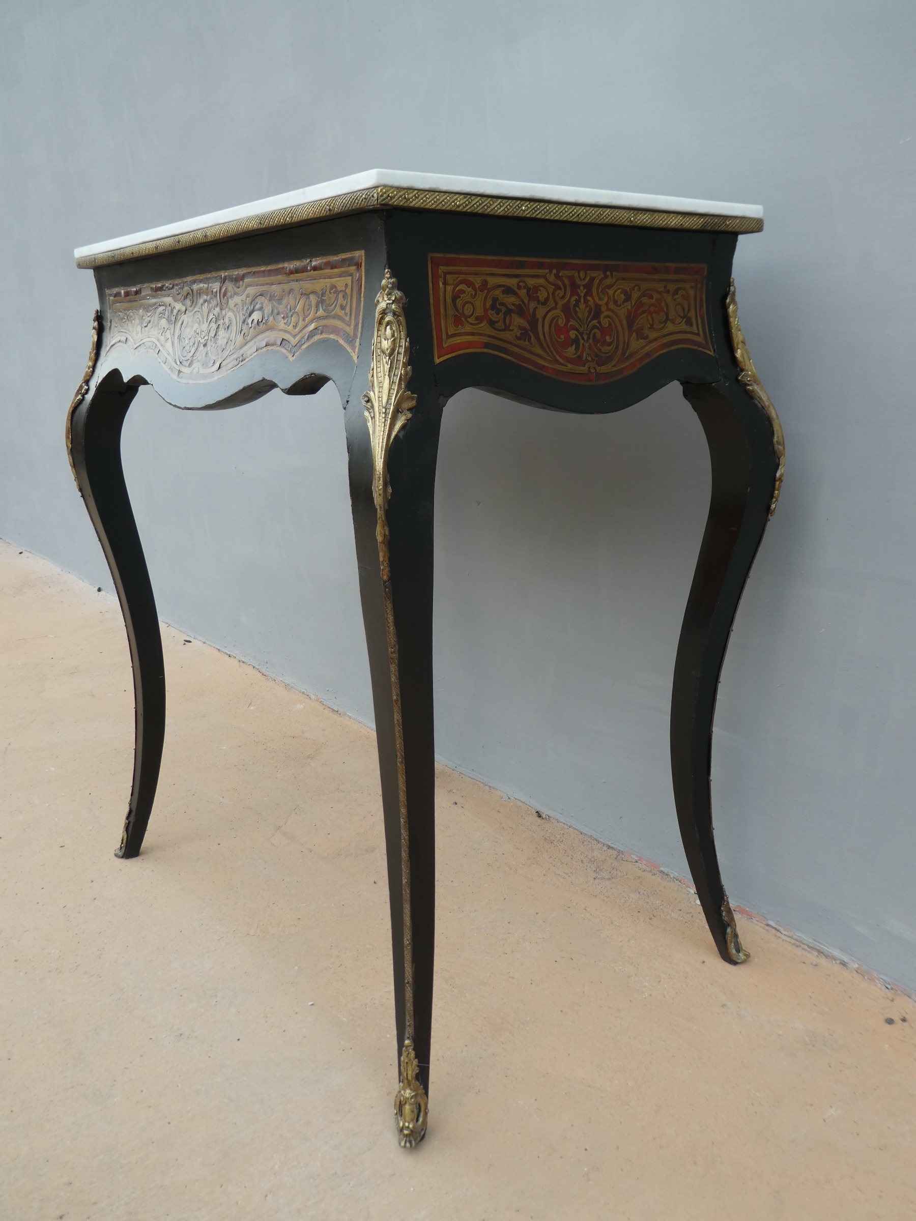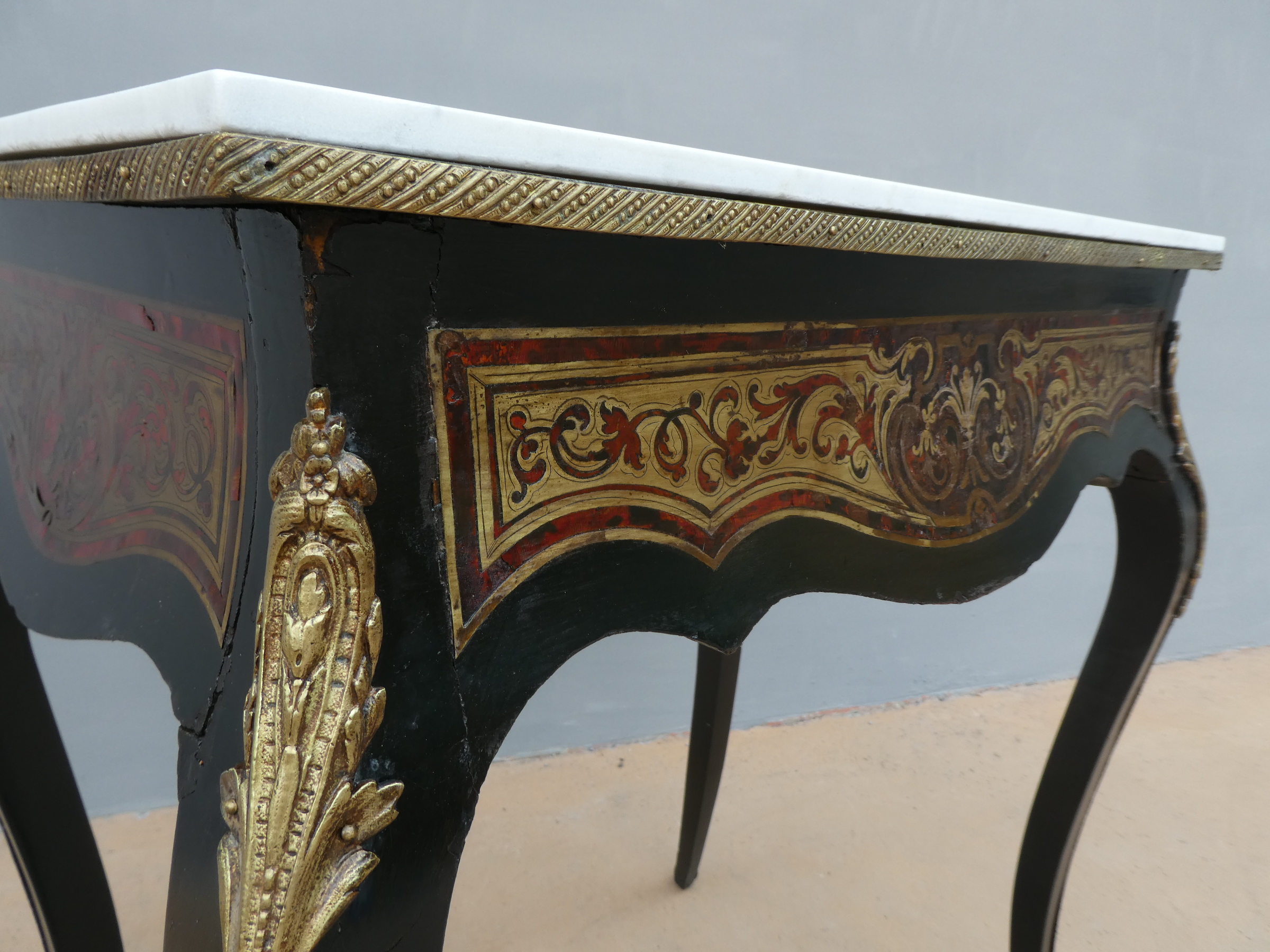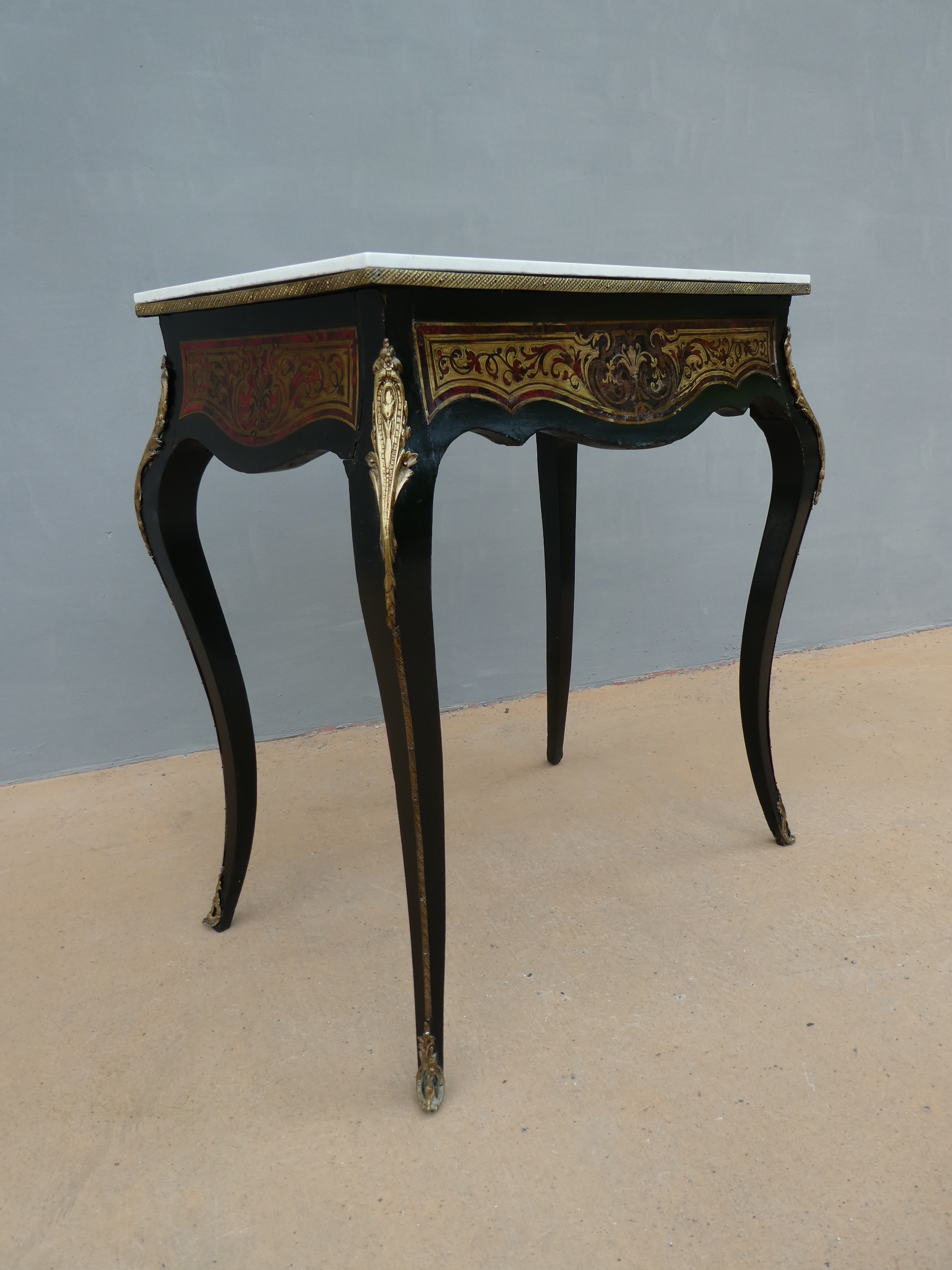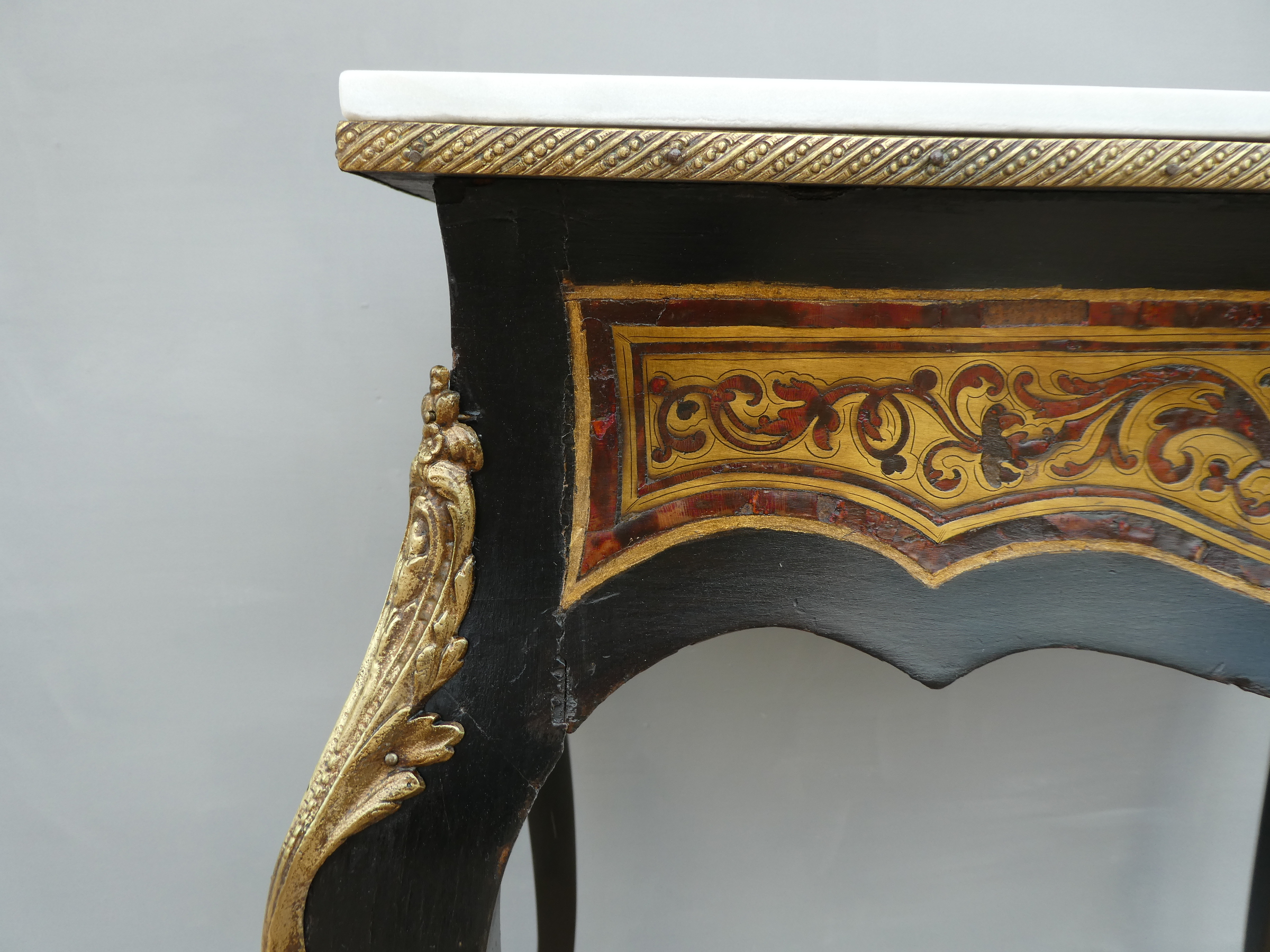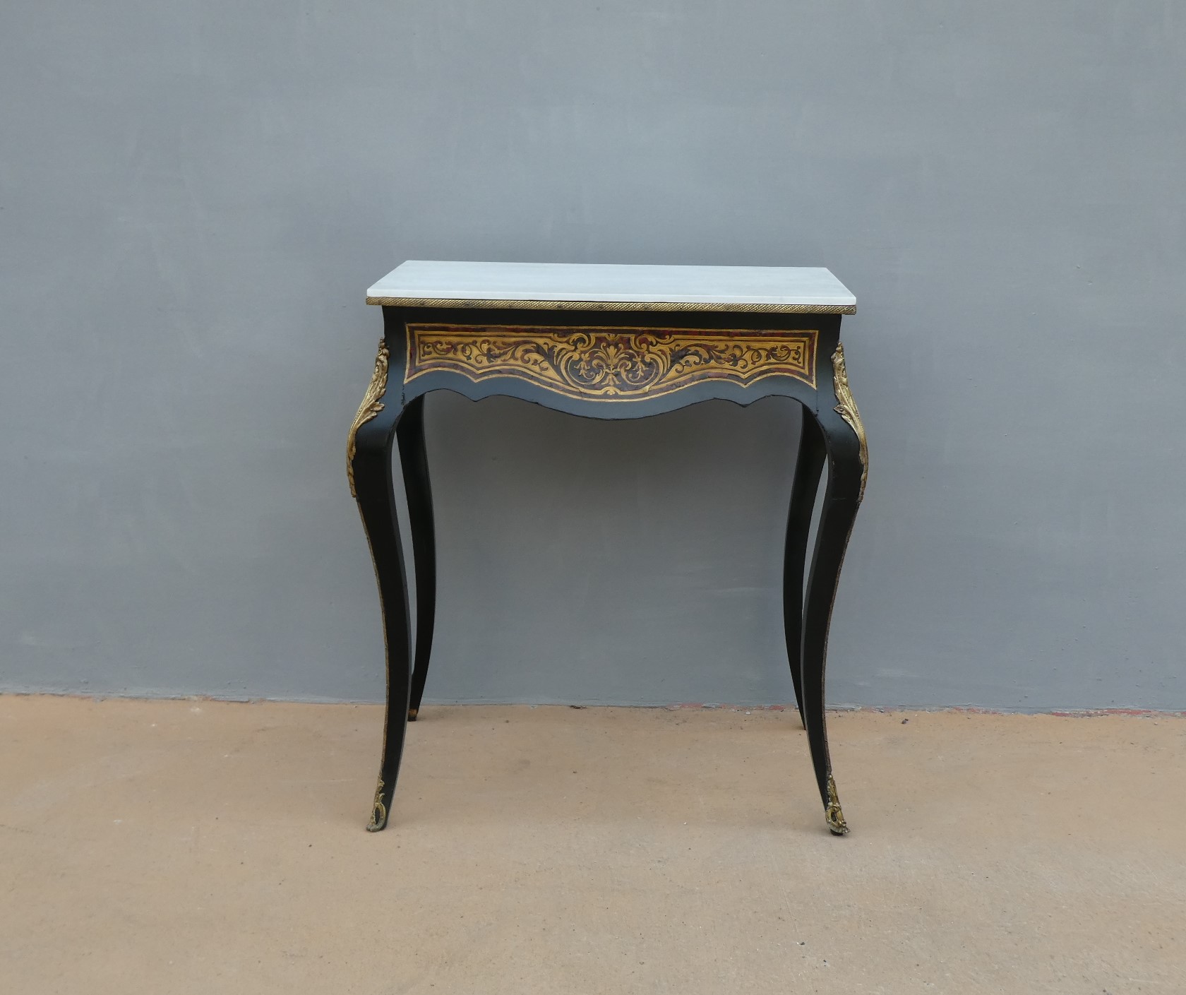 Tavolino st.Boulle con piano d’appoggio in marmo, appartenente d’epoca alla fine dell’800. Il forte impatto decorativo è dato dalla scelta d’impreziosire il corpo con lucenti intarsi in ottone, che spiccano contrastanti sulla superficie scura che fa da sfondo. Le applicazioni dorate sui montanti, oltre ad arricchire la struttura, hanno il compito di proteggere la parti più vulnerabili del mobile. Necessita di alcuni interventi di restauro; mancano parti di filetti (foto).