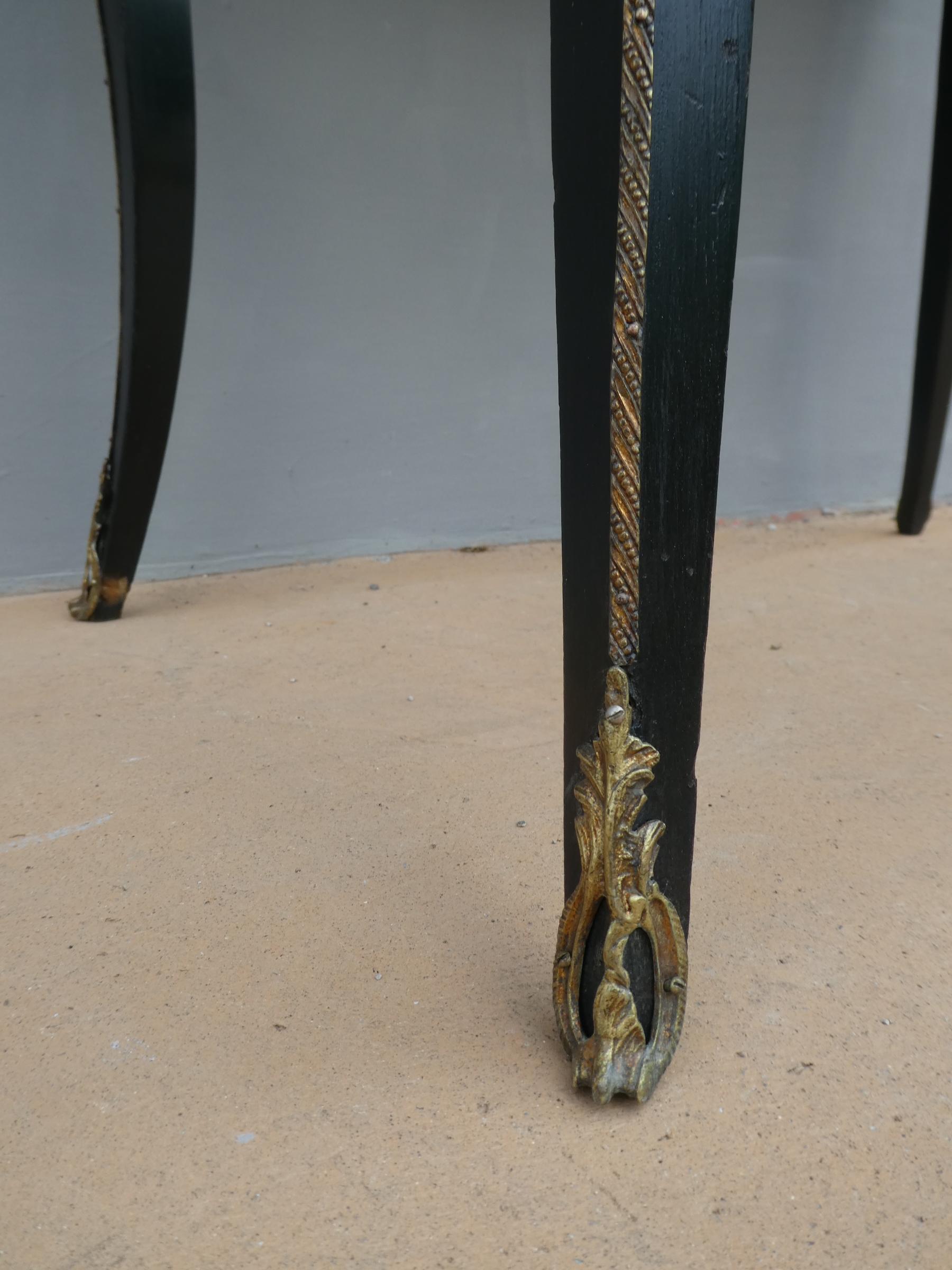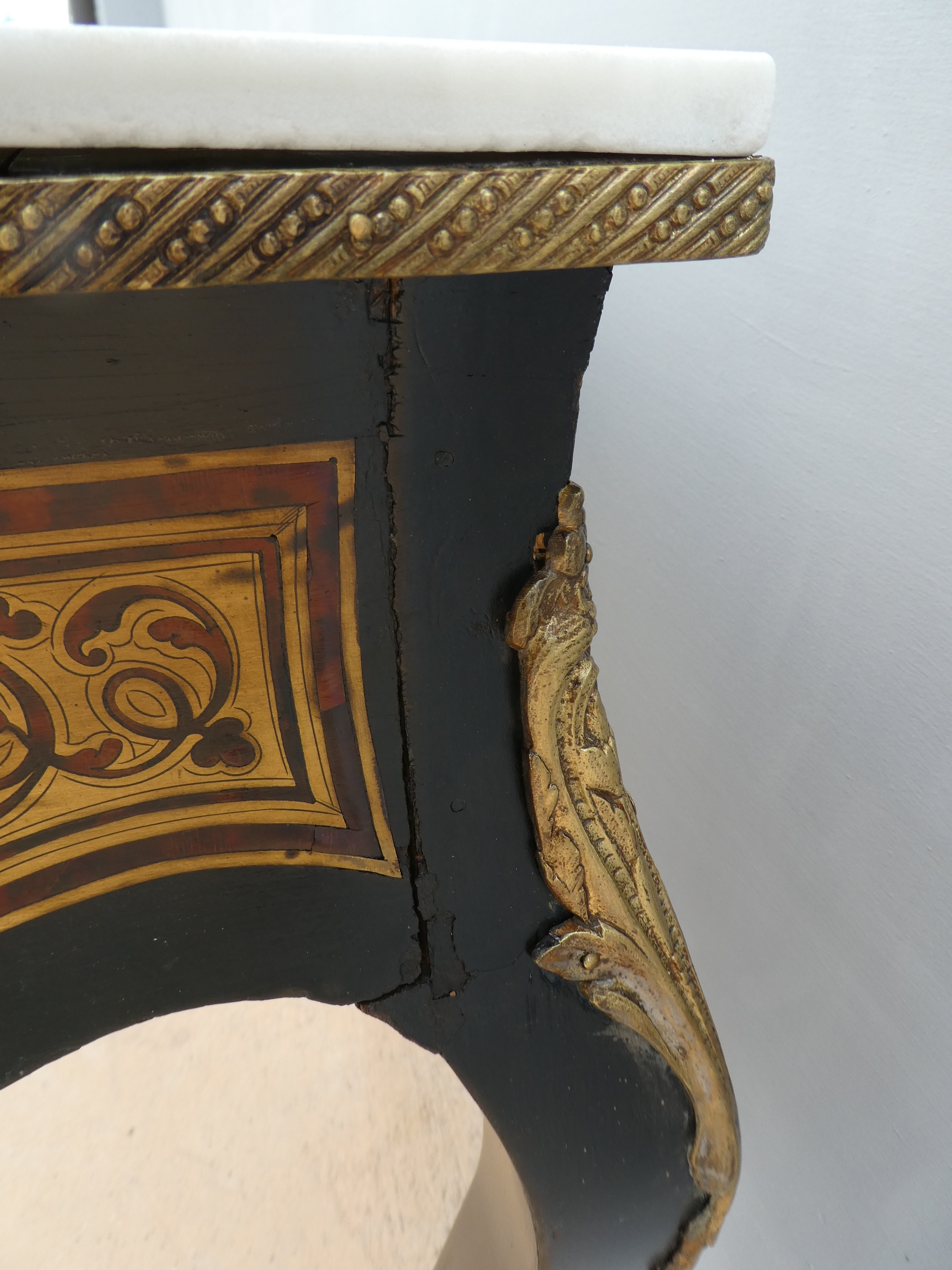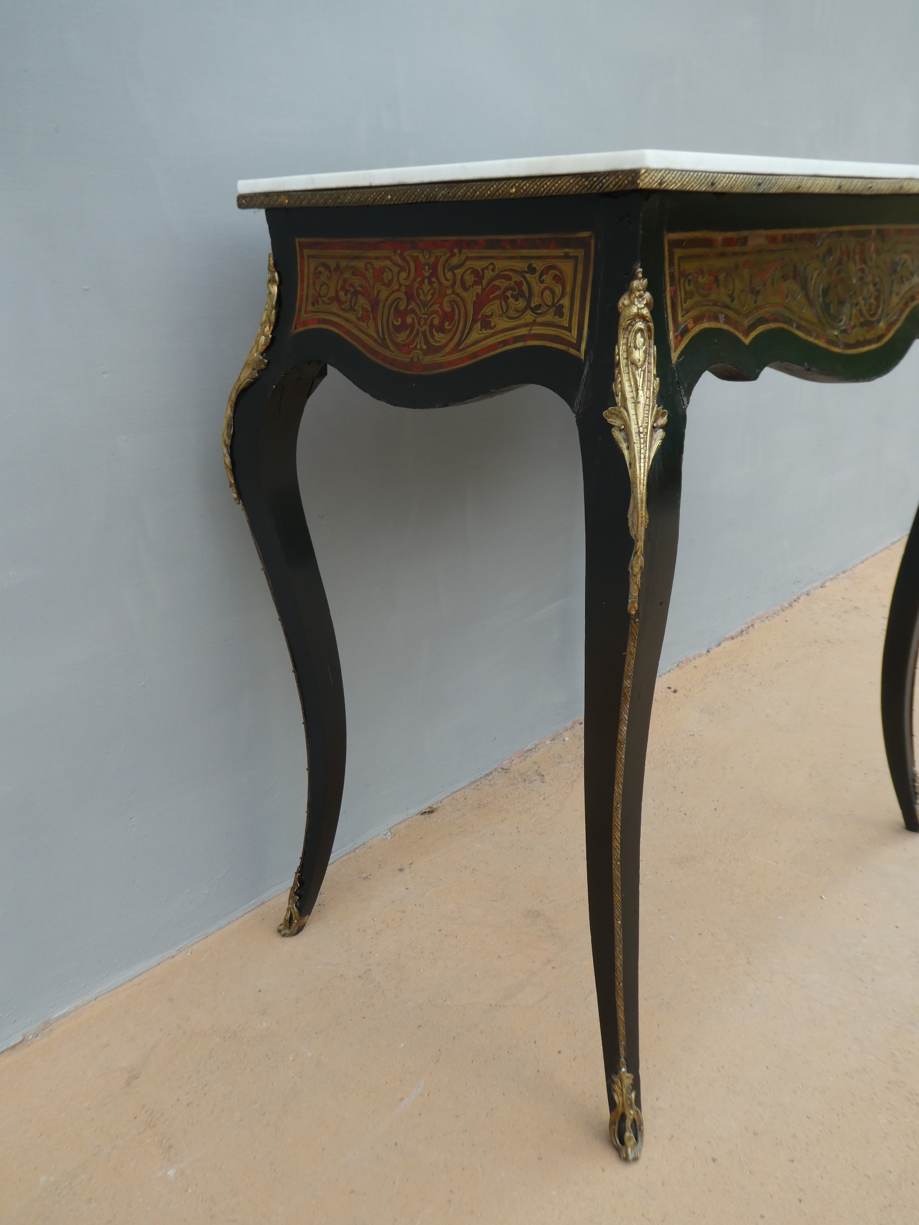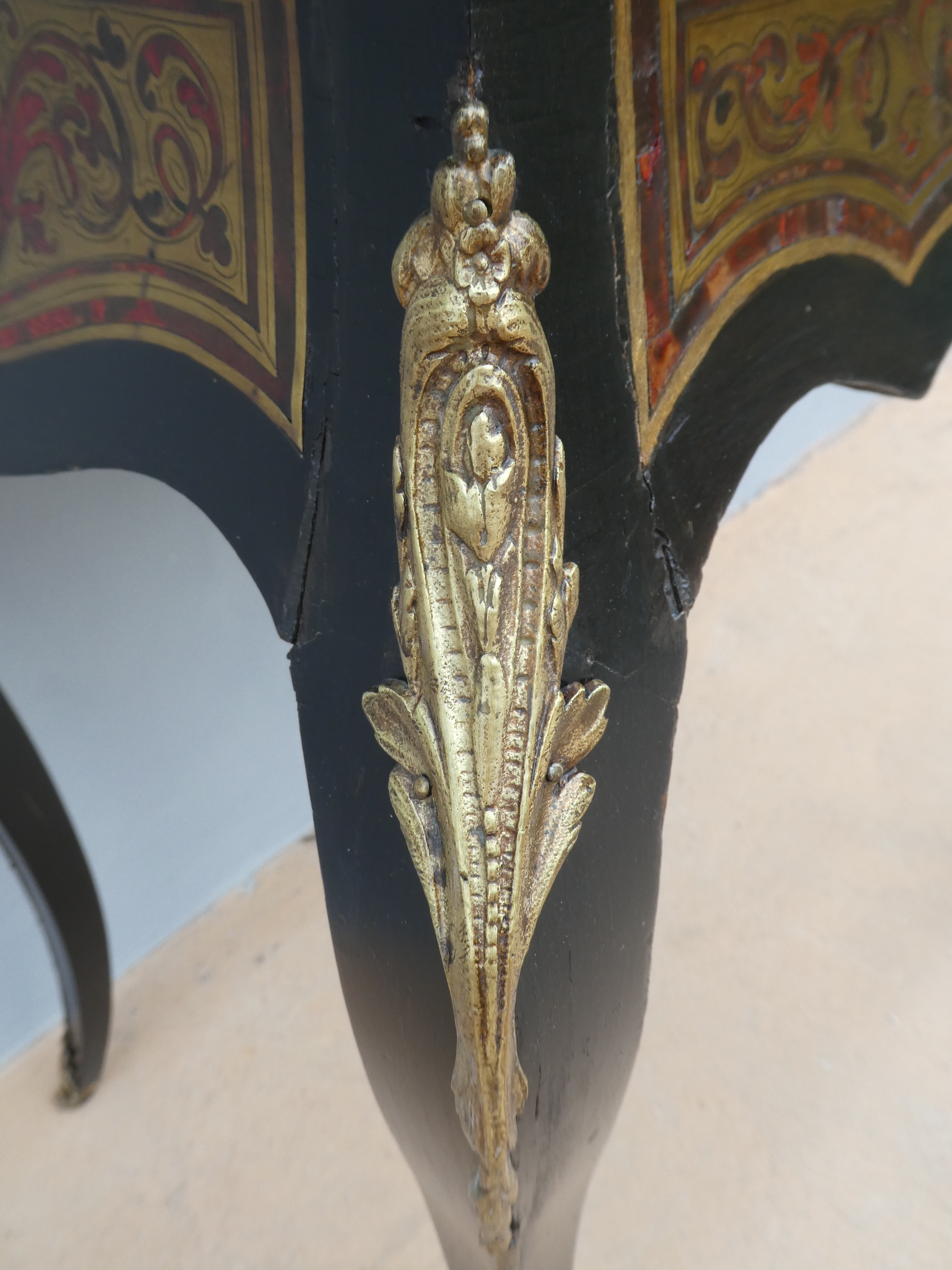 Tavolino st.Boulle con piano d’appoggio in marmo, appartenente d’epoca alla fine dell’800. Il forte impatto decorativo è dato dalla scelta d’impreziosire il corpo con lucenti intarsi in ottone, che spiccano contrastanti sulla superficie scura che fa da sfondo. Le applicazioni dorate sui montanti, oltre ad arricchire la struttura, hanno il compito di proteggere la parti più vulnerabili del mobile. Necessita di alcuni interventi di restauro; mancano parti di filetti (foto).