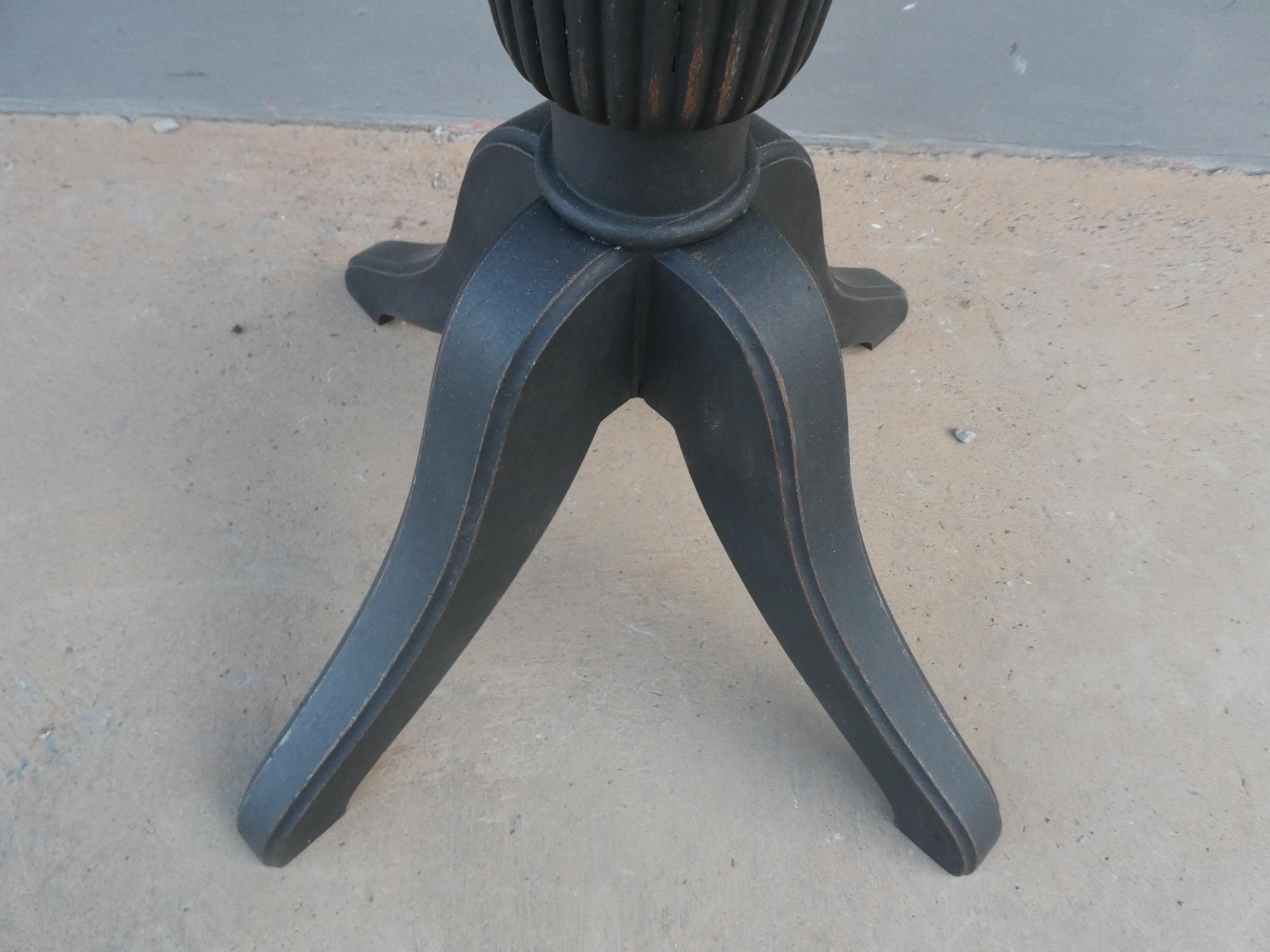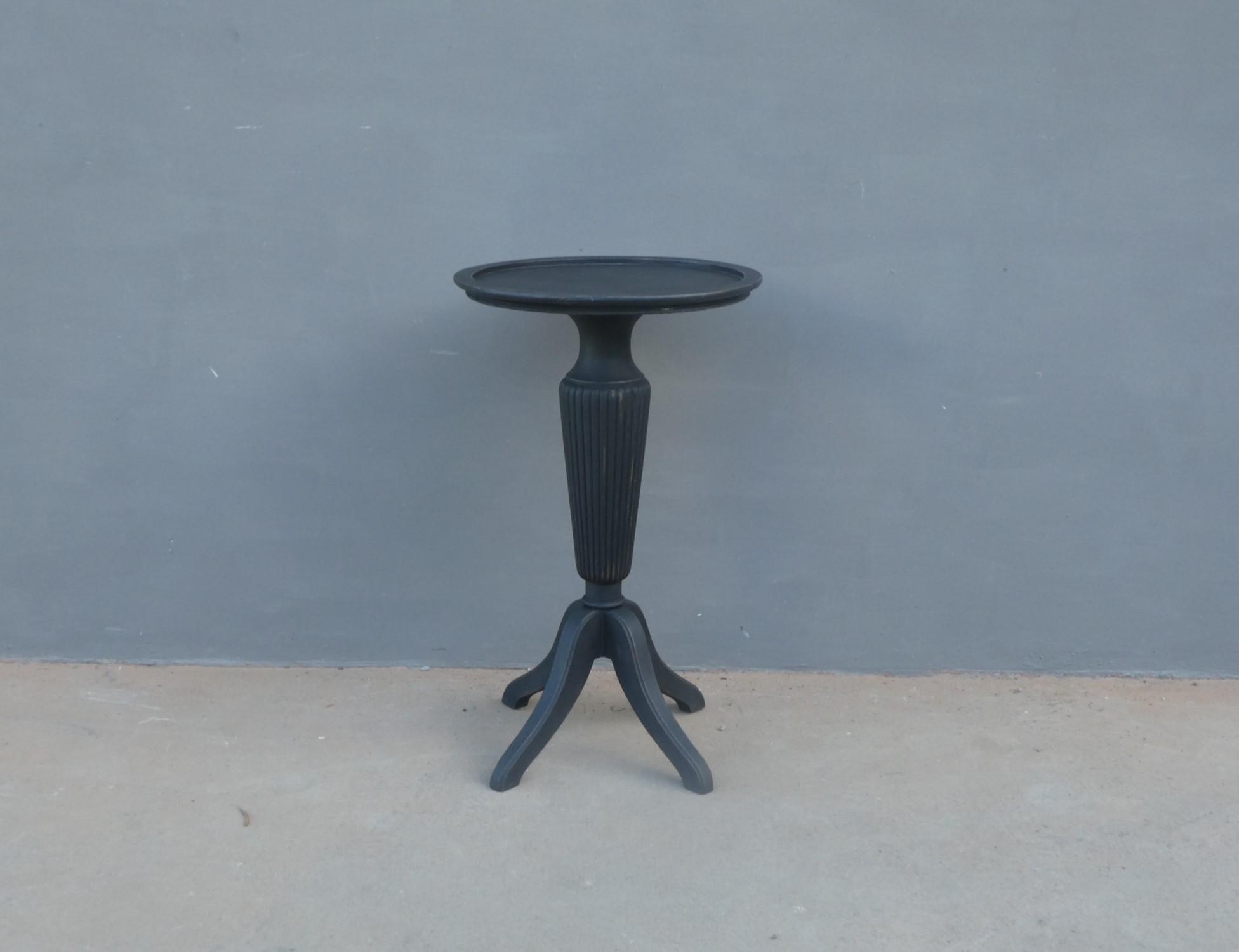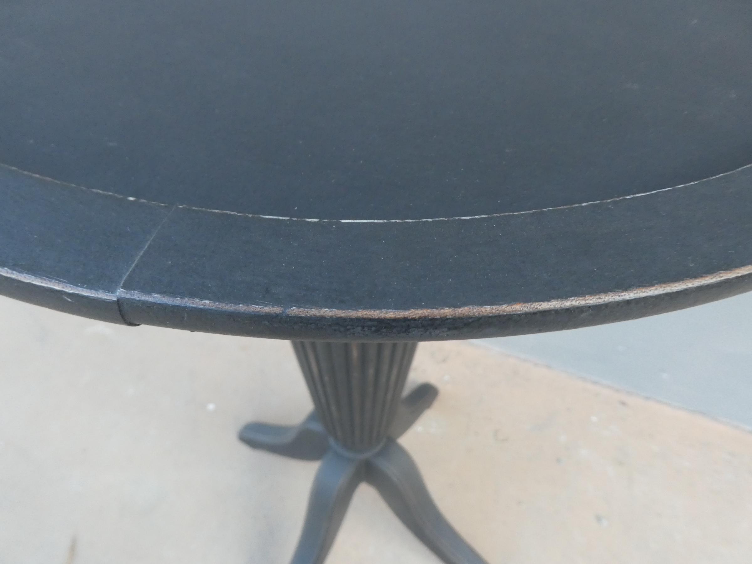 Tavolino tondo d’appoggio laccato e rifinito con la tecnica Shabby Chic, che prevede l’uso di colori scuri in superifice e colori più chiari che affiorano dopo il trattamento di usura. La ricerca di un decoro delicato si riflette sulla scelta del gambo centrale, finemente lavorato, ramificato su quattro piedi d’appoggio dalla forma armoniosa. Epoca seconda metà ‘900.