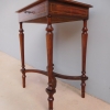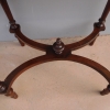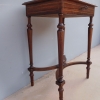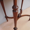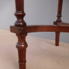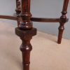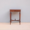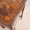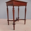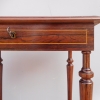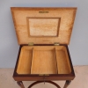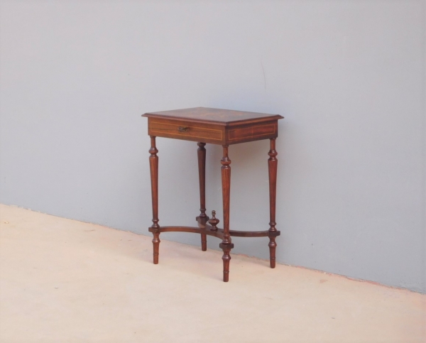 Tavolino travailleuse da lavoro rettangolare, appartenente d’epoca ai primi del ‘900. La struttura, oltre a vantare proporzioni sapientemente equilibrate, si contraddistingue per il piano d’appoggio apribile, che cela internamente tre scomparti. E’ inoltre impreziosita da chiari intarsi/filetti, contrastanti con la raffinata superficie che fa sfondo, e da lunghi montanti, che terminano su circolari piedi d’appoggio. Necessita di alcuni interventi di restauro, sono presenti piccoli fori di tarlo, principalmente sui piedi, e una gamba è stata recentemente incollata.