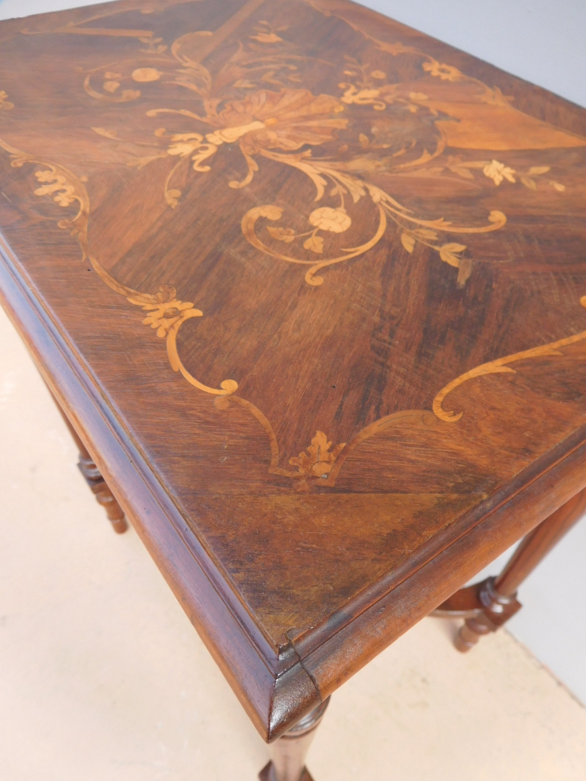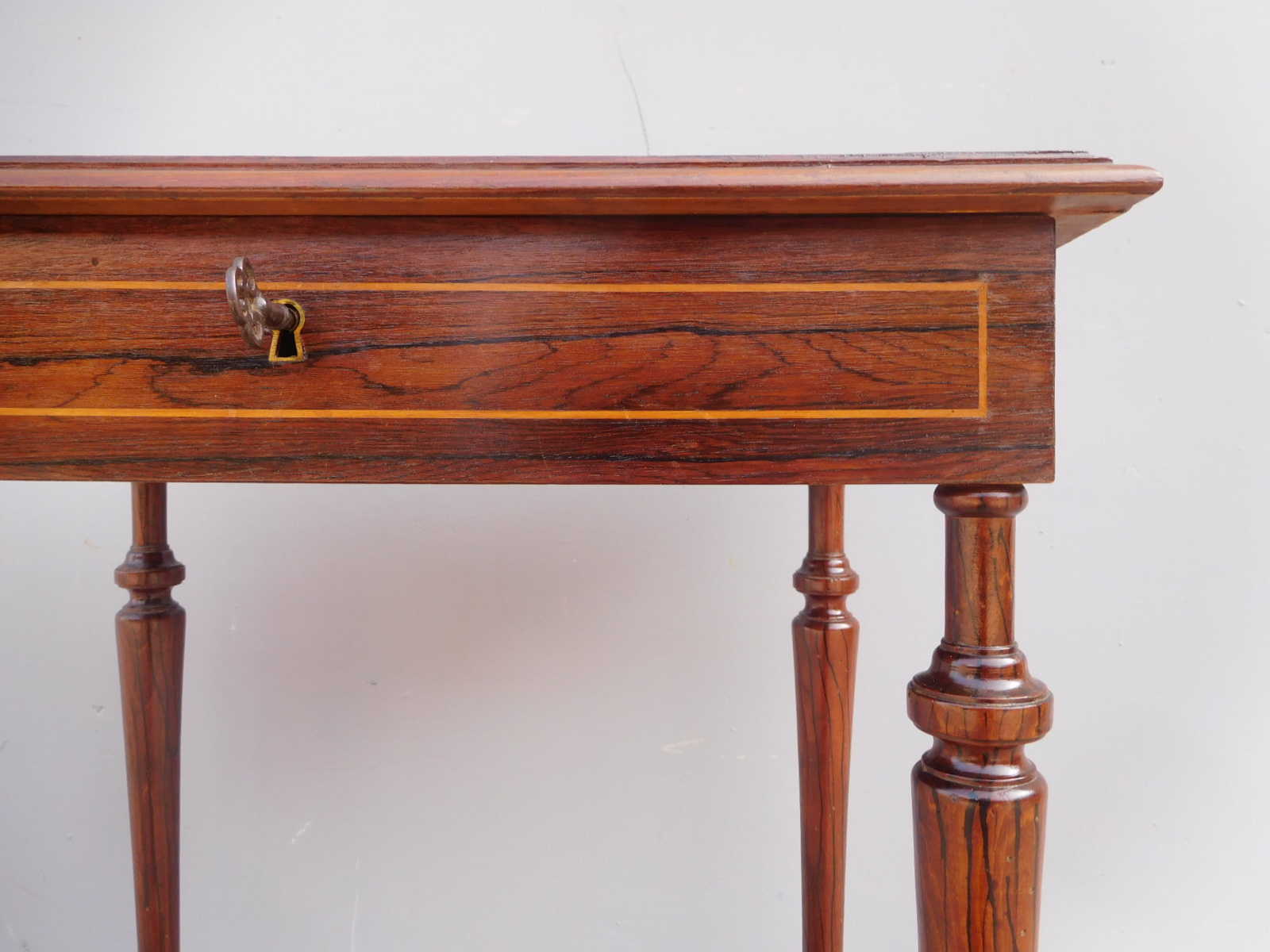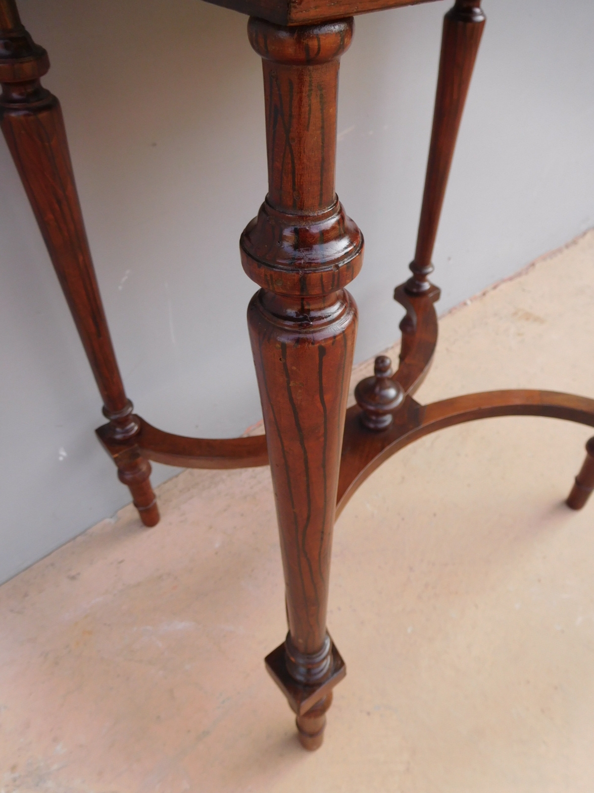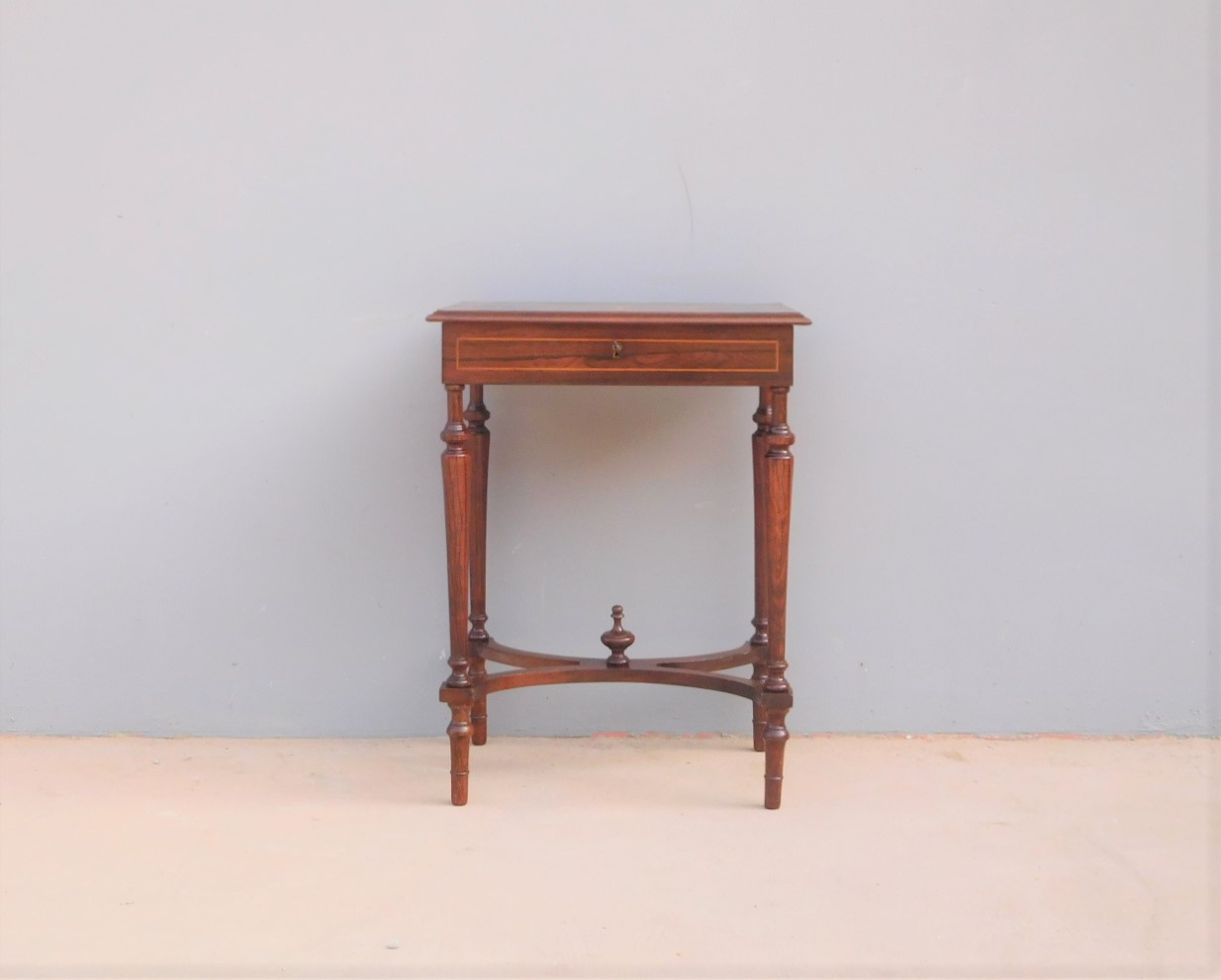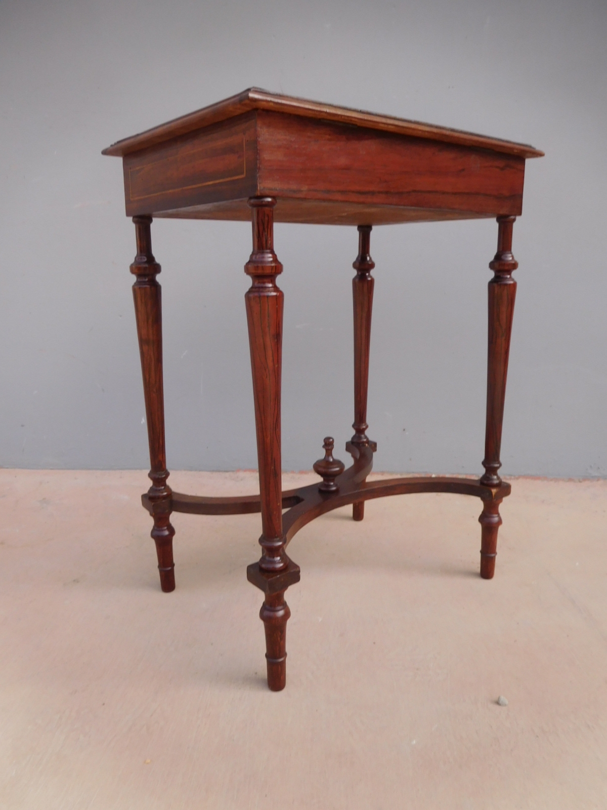 Tavolino travailleuse da lavoro rettangolare, appartenente d’epoca ai primi del ‘900. La struttura, oltre a vantare proporzioni sapientemente equilibrate, si contraddistingue per il piano d’appoggio apribile, che cela internamente tre scomparti. E’ inoltre impreziosita da chiari intarsi/filetti, contrastanti con la raffinata superficie che fa sfondo, e da lunghi montanti, che terminano su circolari piedi d’appoggio. Necessita di alcuni interventi di restauro, sono presenti piccoli fori di tarlo, principalmente sui piedi, e una gamba è stata recentemente incollata.