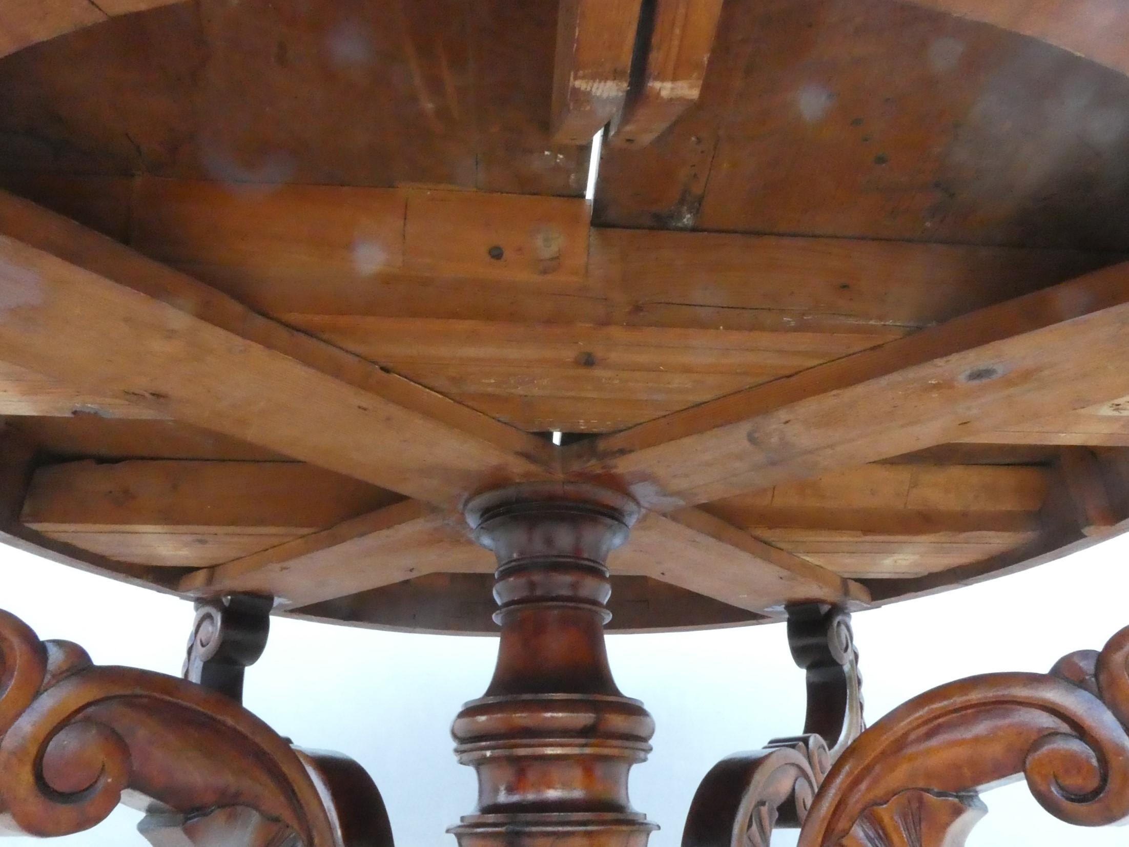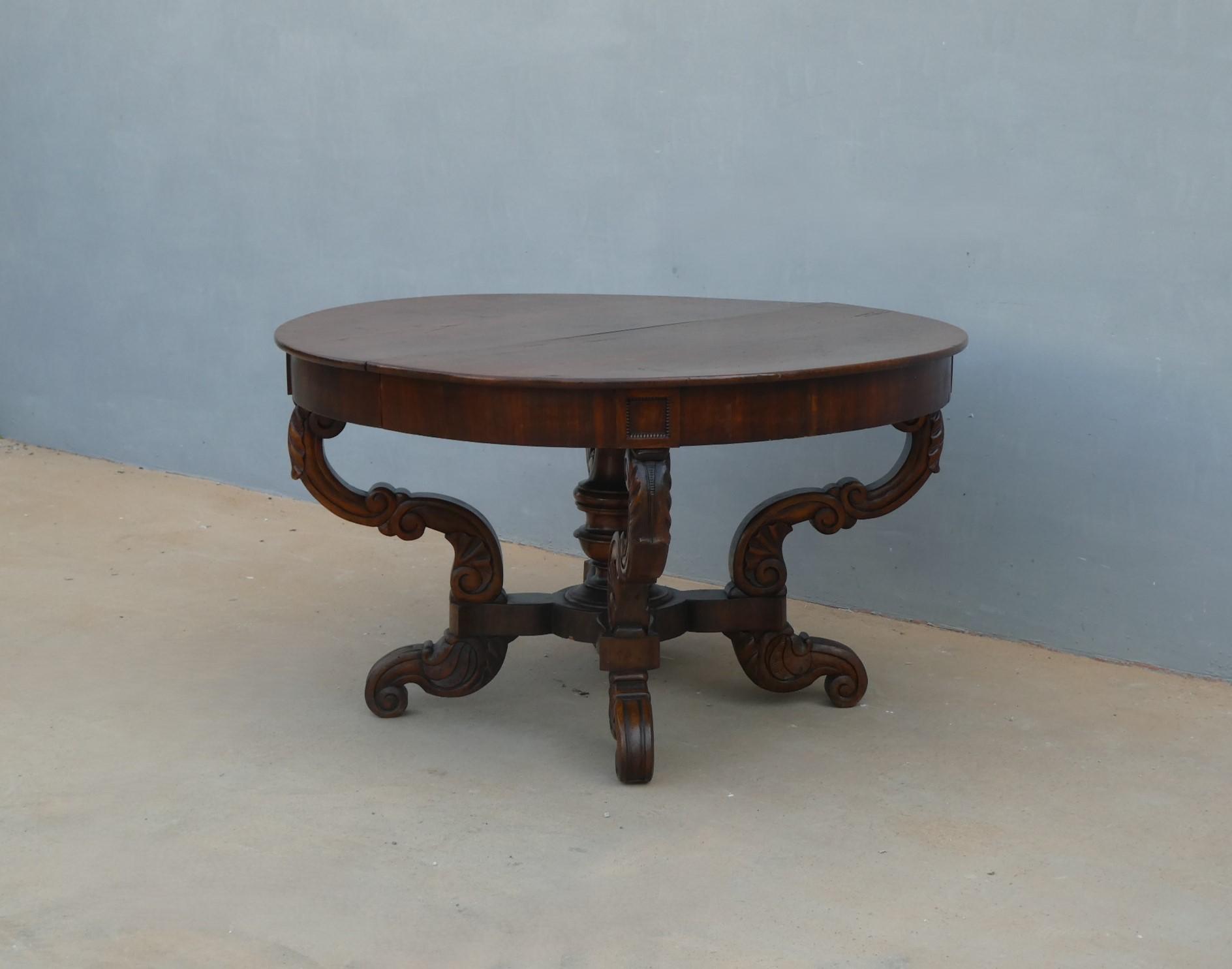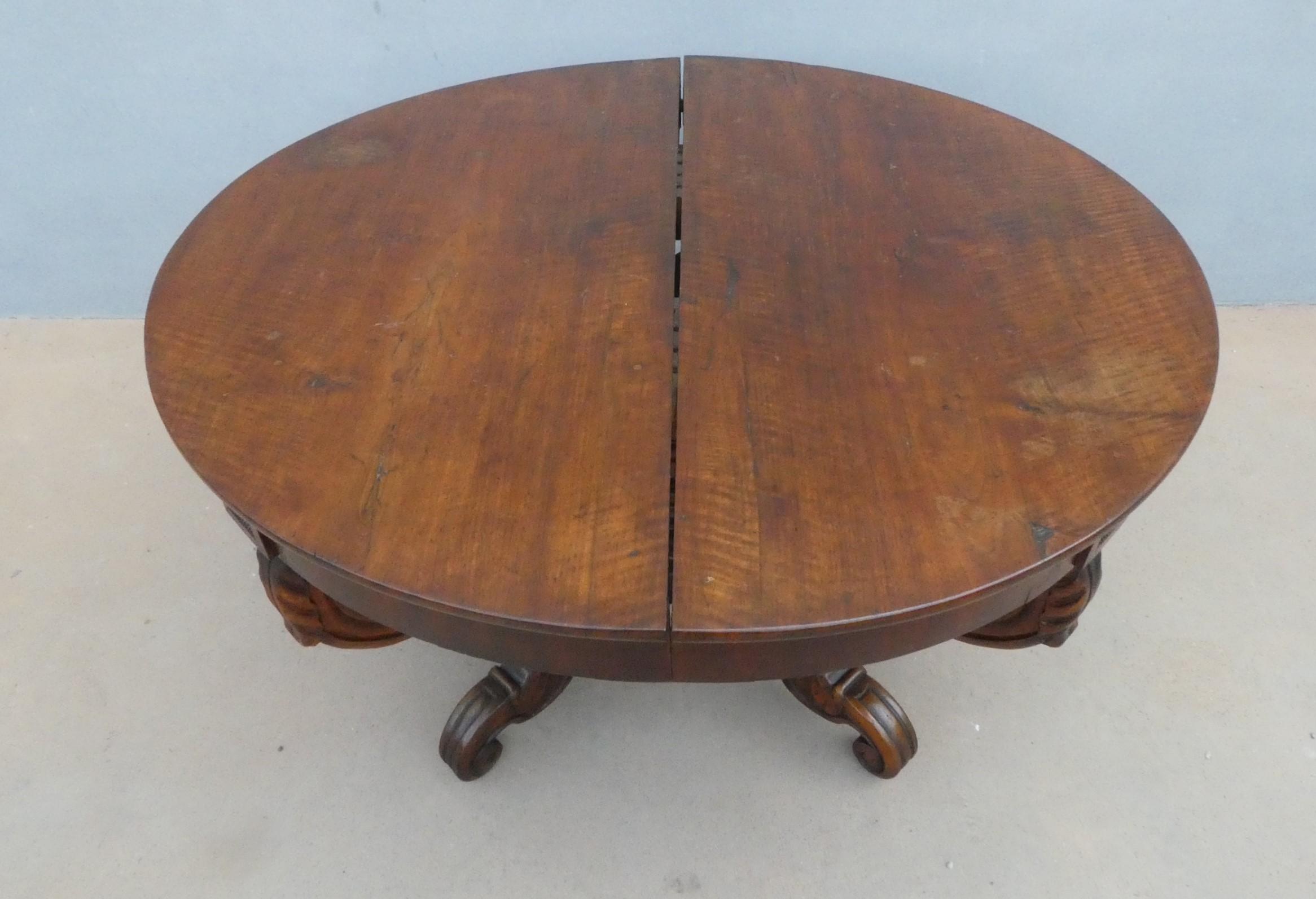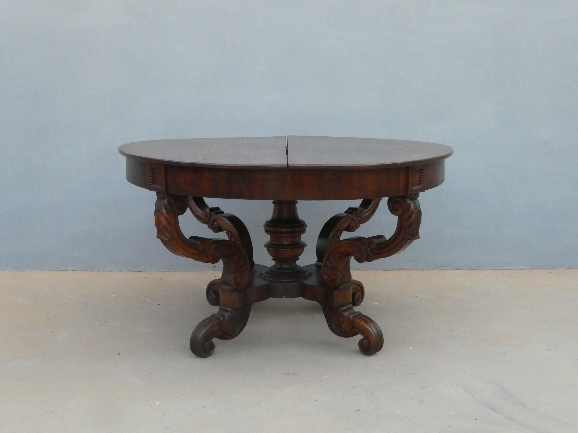 Tavolo tondo a cestello genovese realizzato in legno di mogano ed appartenente d’epoca alla metà dell’800. La struttura, minuziosamente intagliata, si presenta proporzionata ed elegante. La ricerca di un decoro mirato si riflette anche sulla scelta del gambo centrale, ramificato su quattro piedi d’appoggio dalla forma armoniosa. Il tavolo è studiato in modo tale che, tirando le estremità della plancia verso l’esterno ed inserendo le allunghe (mancanti) negli appositi incastri, si allunghi aumentando notevolmente la superficie d’appoggio (attualmente le i listelli interni sono da registrare/pulire e non si allunga/apre correttamente). Necessita di alcuni interventi di restauro conservativo e sono presenti fori di tarlo.
