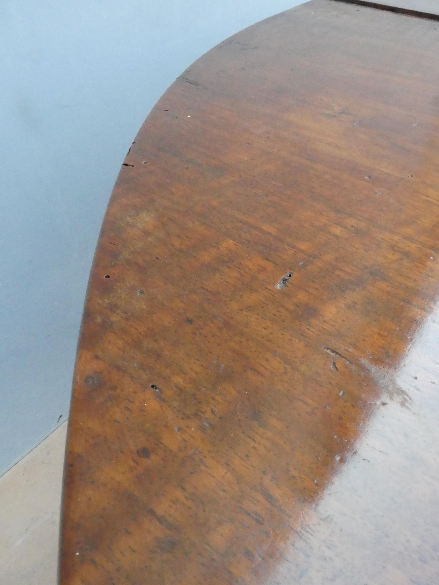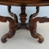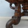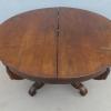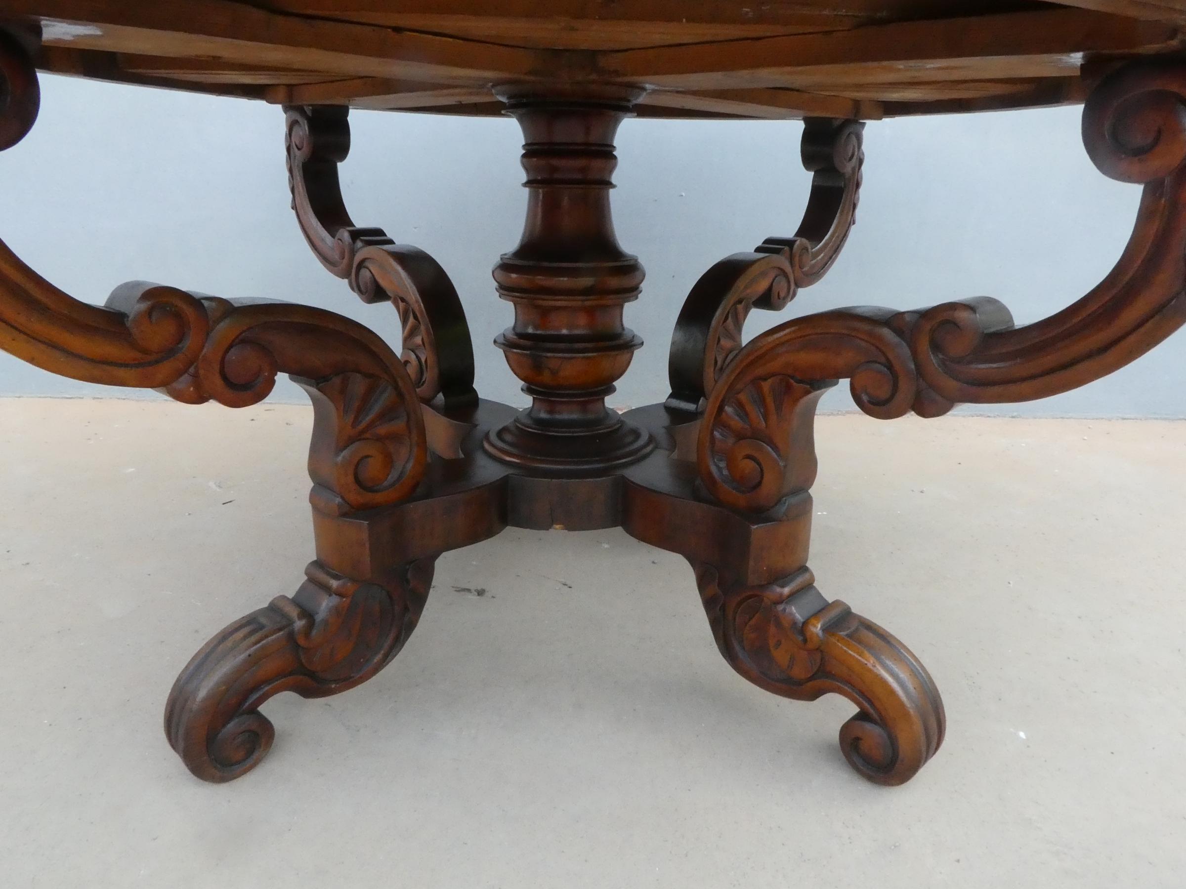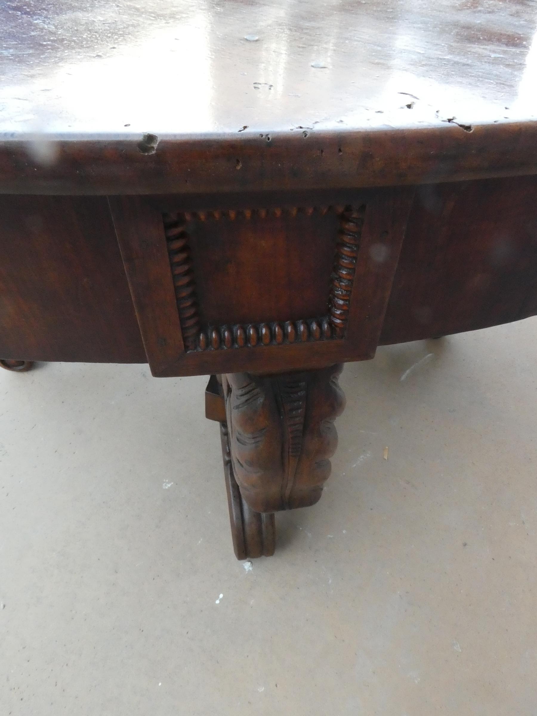 Tavolo tondo a cestello genovese realizzato in legno di mogano ed appartenente d’epoca alla metà dell’800. La struttura, minuziosamente intagliata, si presenta proporzionata ed elegante. La ricerca di un decoro mirato si riflette anche sulla scelta del gambo centrale, ramificato su quattro piedi d’appoggio dalla forma armoniosa. Il tavolo è studiato in modo tale che, tirando le estremità della plancia verso l’esterno ed inserendo le allunghe (mancanti) negli appositi incastri, si allunghi aumentando notevolmente la superficie d’appoggio (attualmente le i listelli interni sono da registrare/pulire e non si allunga/apre correttamente). Necessita di alcuni interventi di restauro conservativo e sono presenti fori di tarlo.