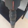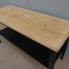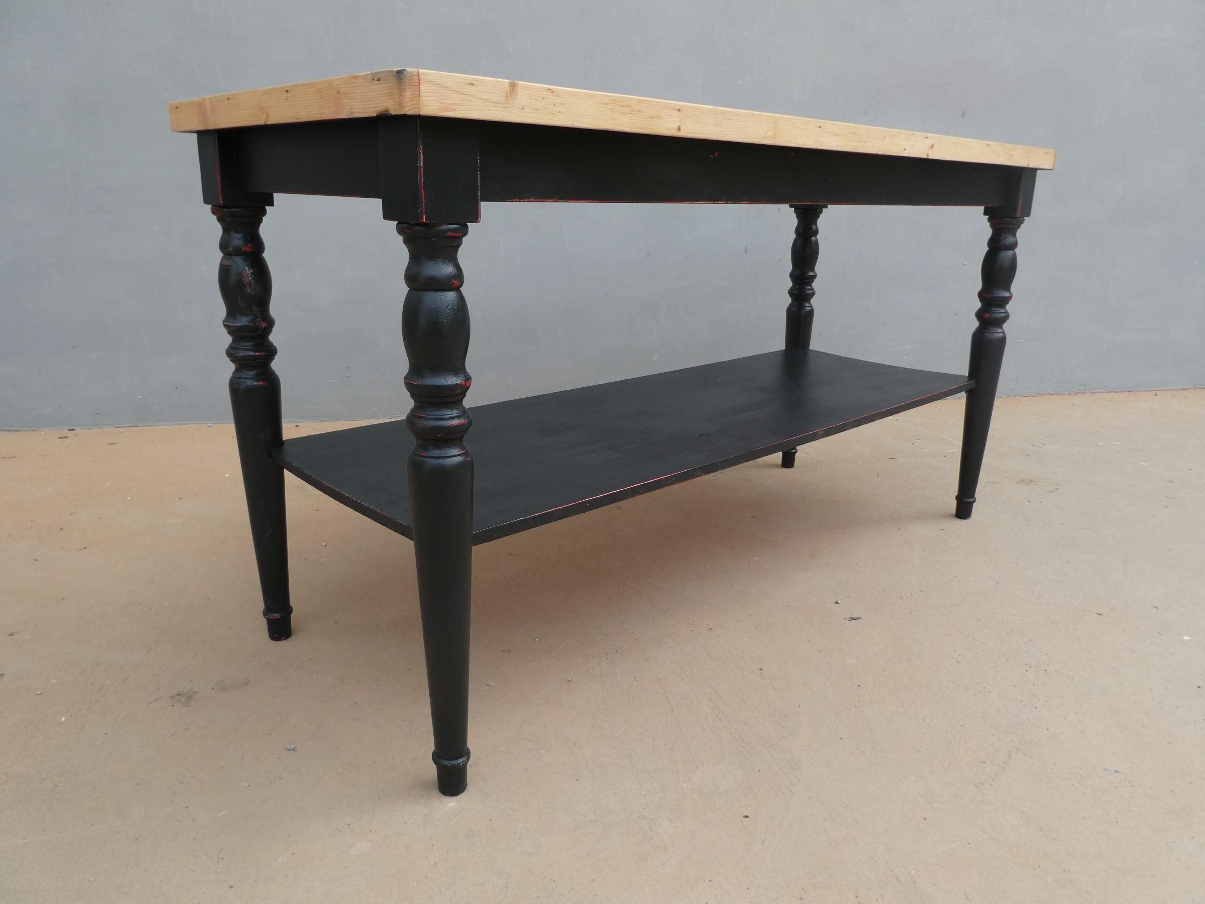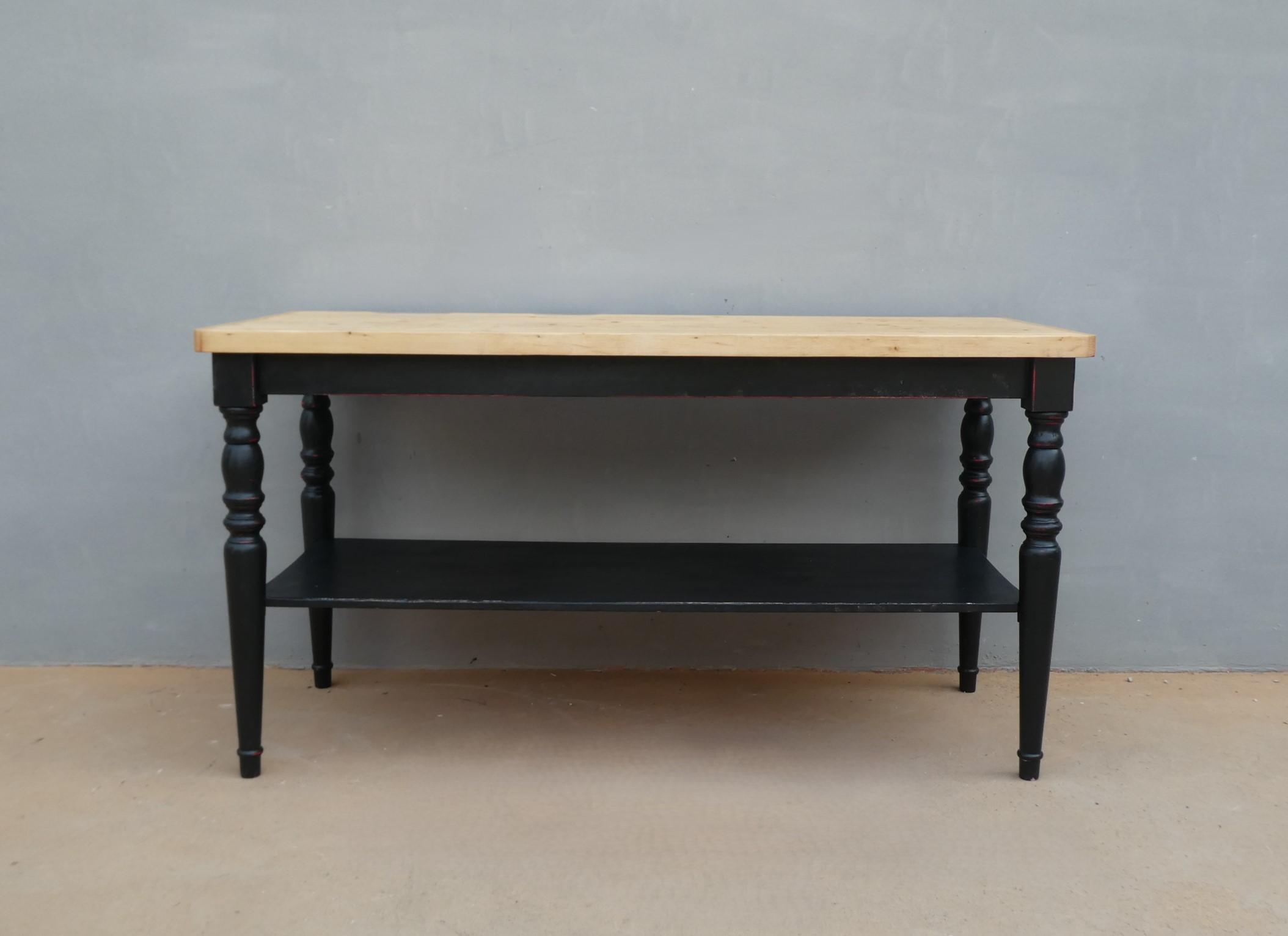 Tavolo bancone rettangolare dotato di un doppio piano d’appoggio, laccato e rifinito con la tecnica “Shabby Chic”. Ciò che rende particolare questo mobile è il gioco contrastante di colori dato dalla lacca scura utilizzata per il cavalletto delle gambe, con il piano in abete, lasciato a legno naturale. Si presenta come versatile ed originale elemento d’arredo. Epoca prima metà ‘900.