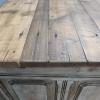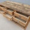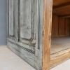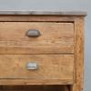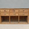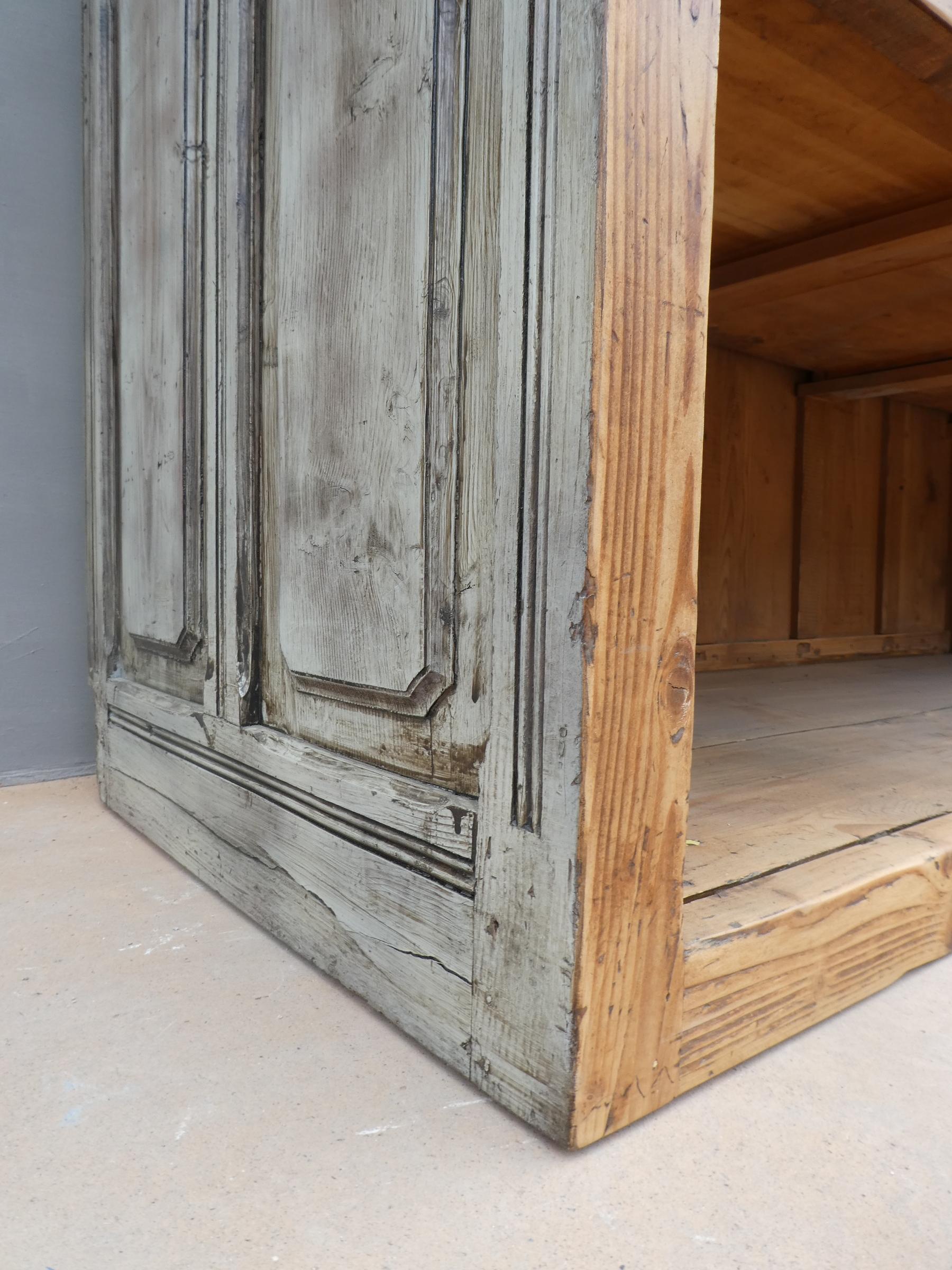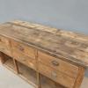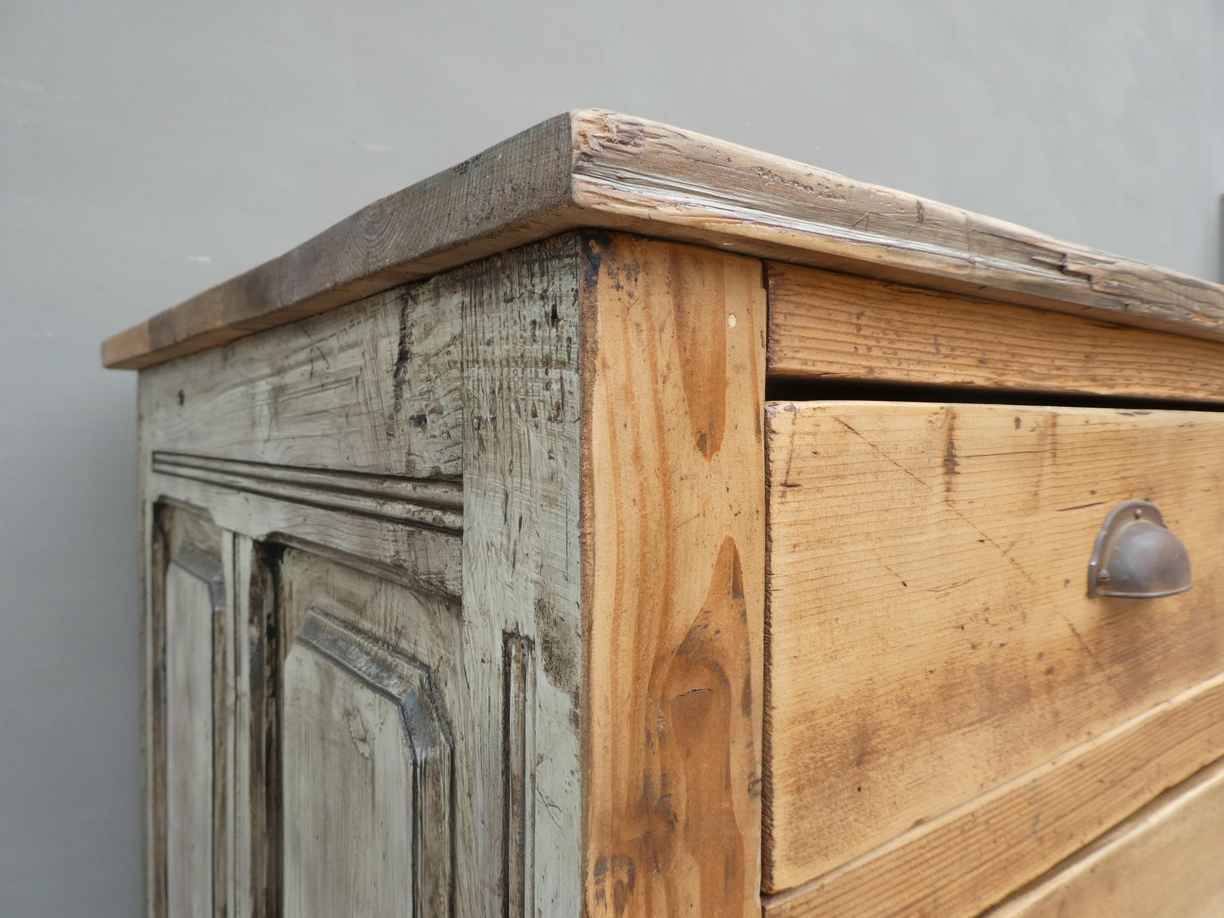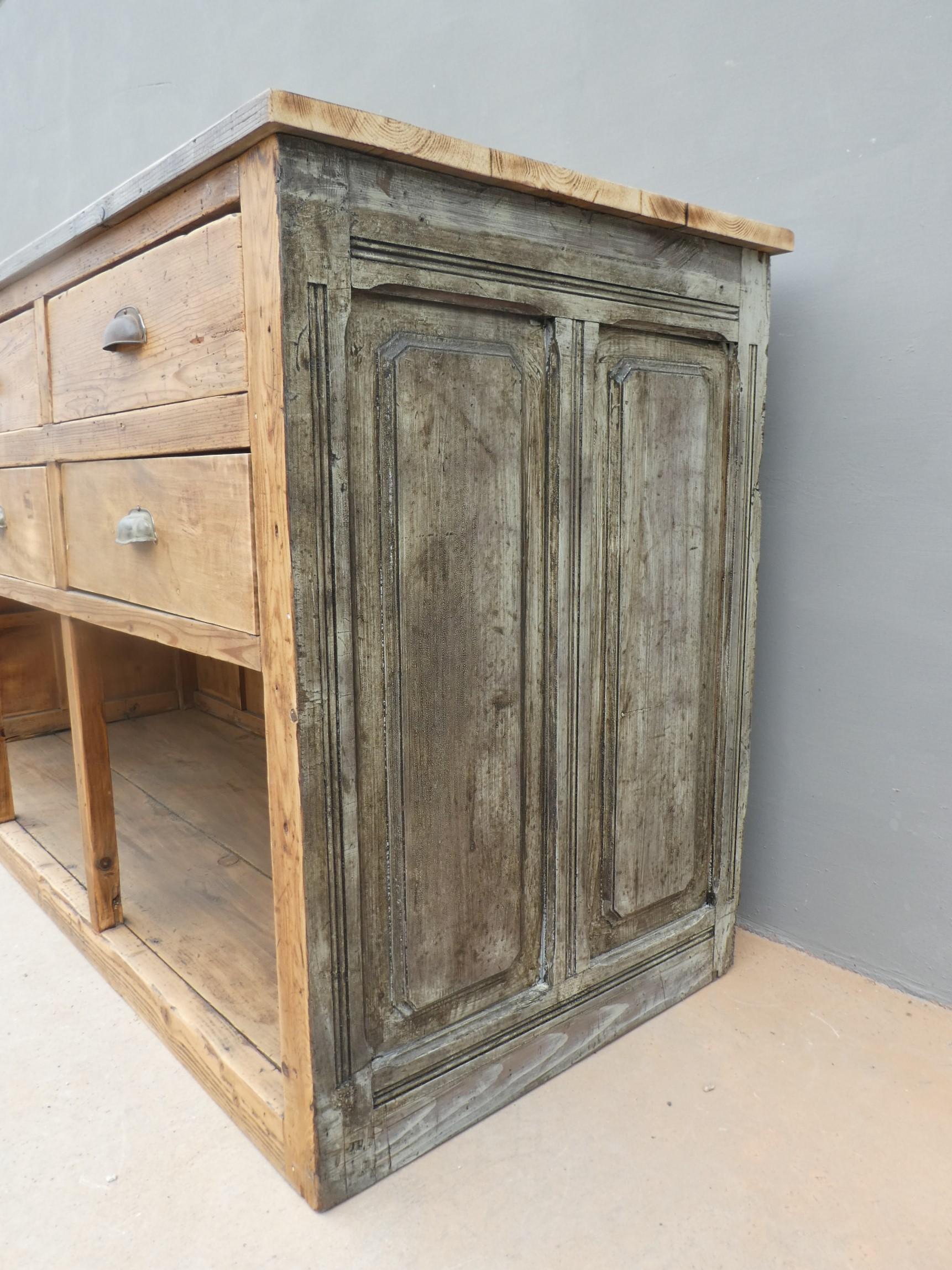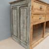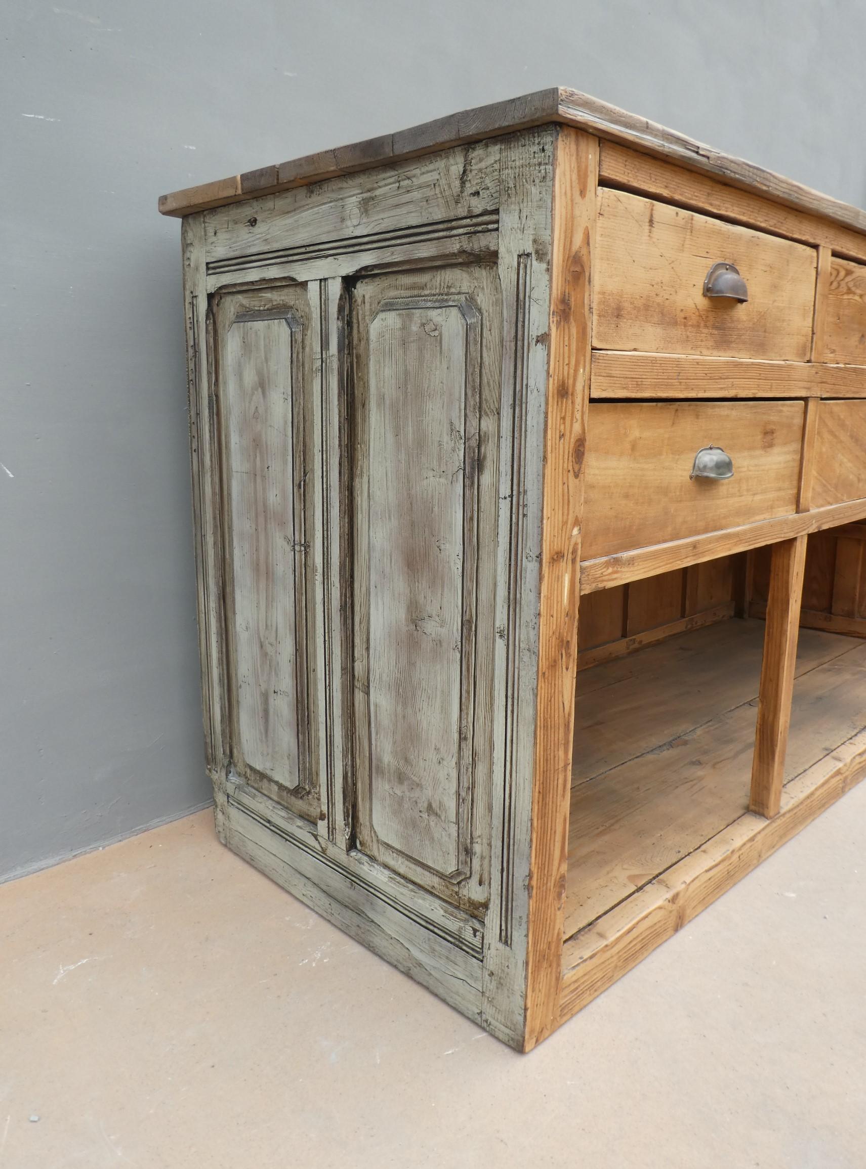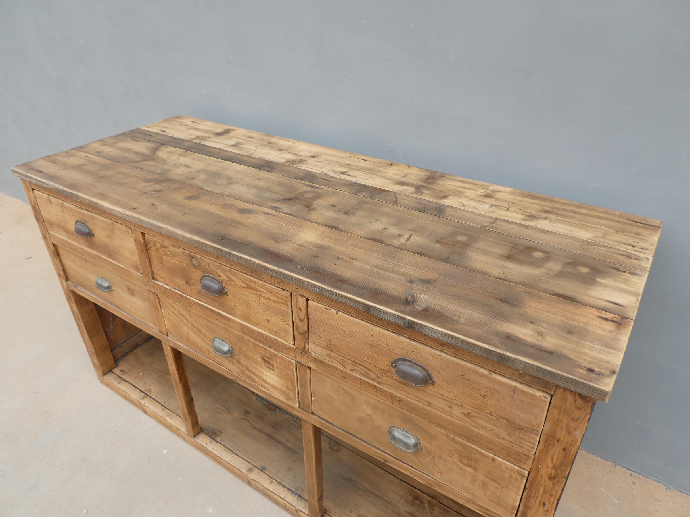 Tavolo bancone da negozio rettangolare dotato di sei cassetti ed un vano a giorno. Ciò che rende particolare questo mobile è il gioco contrastante di colori dato dalla lacca usata per la scocca, rifinita con la tecnica “Shabby Chic”, ed i vari elementi in legno di pino, lasciati a legno naturale. Si presenta come versatile ed originale elemento d’arredo. Necessita di piccoli interventi di restauro (facoltativi – foto)/il piano non è coevo. Epoca prima metà ‘900.