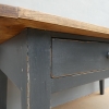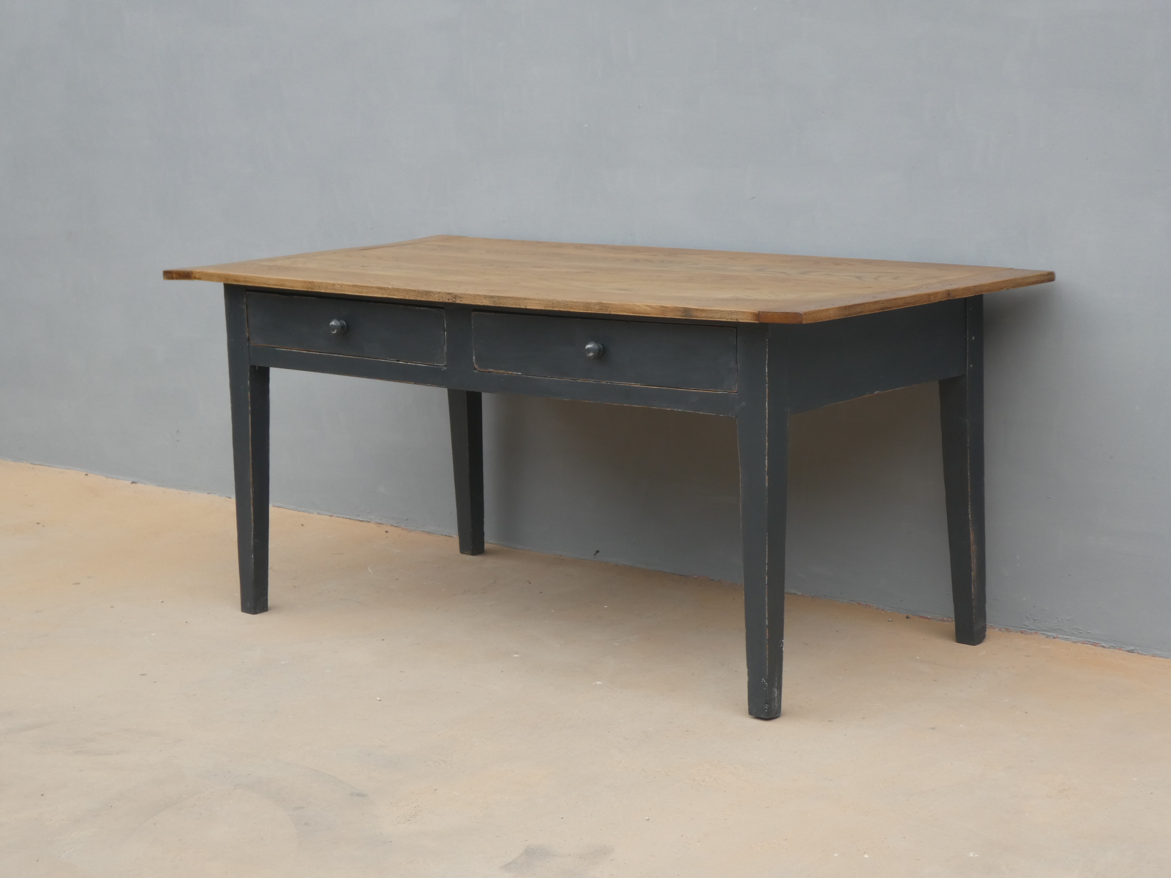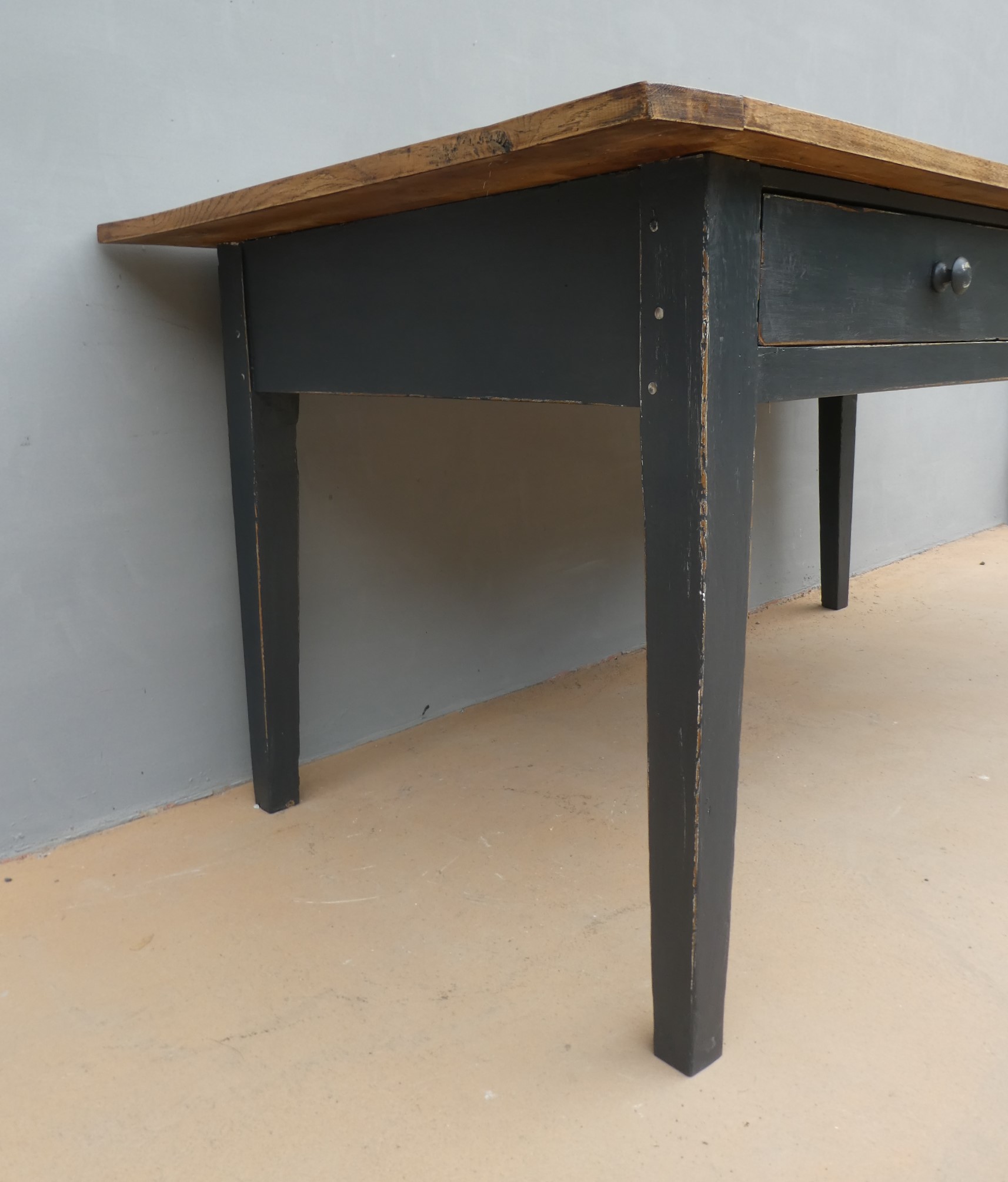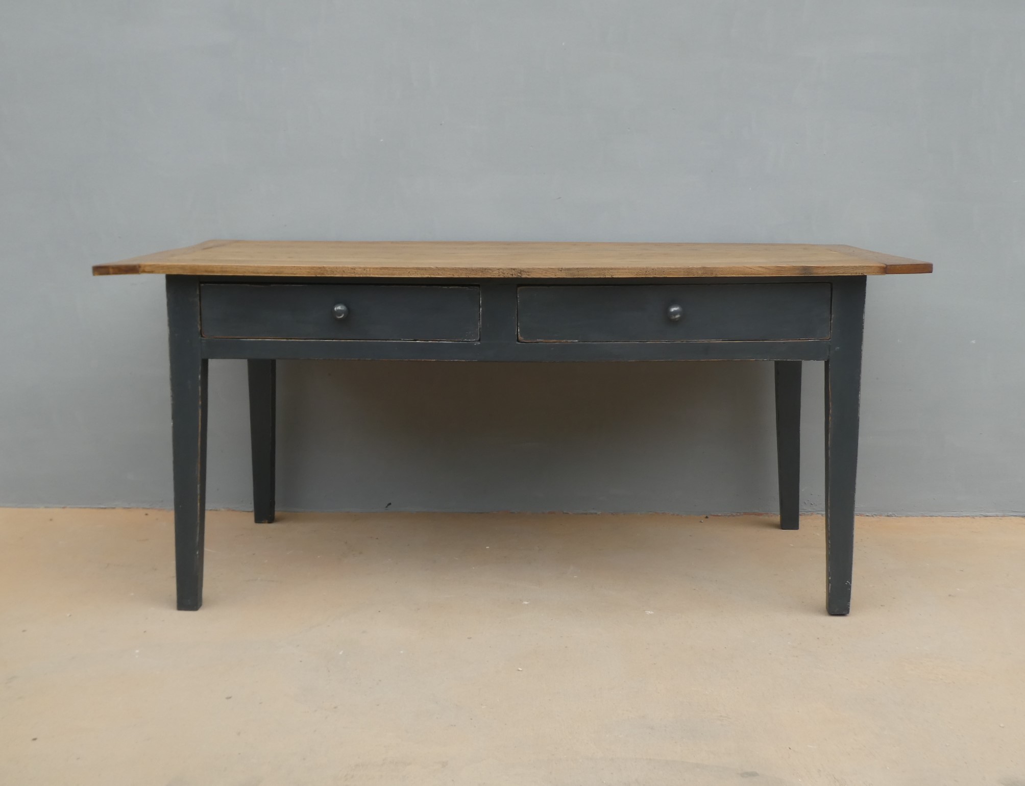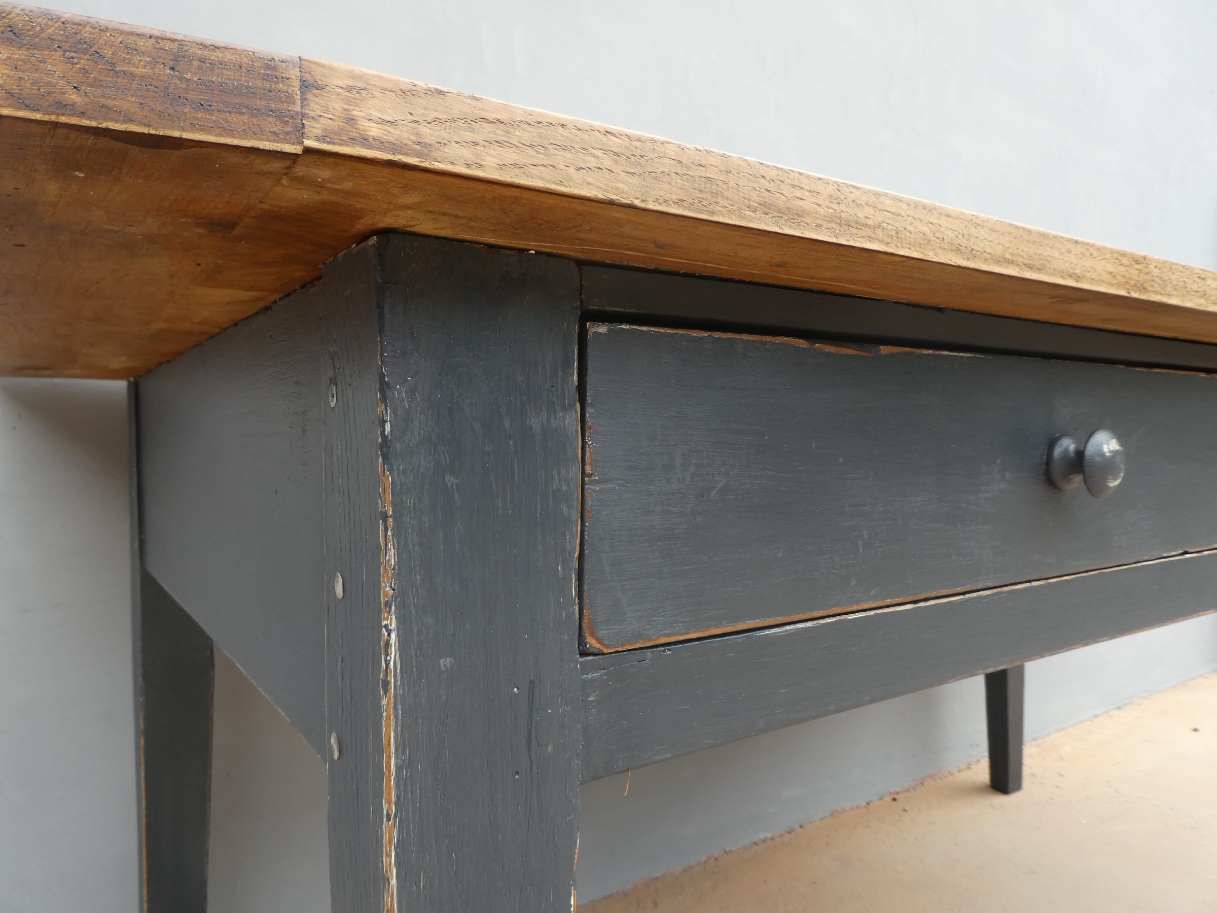 Tavolo fisso rettangolare dotato di doppio cassetto frontale, laccato e rifinito con la tecnica “Shabby Chic” che prevede l’uso di colori chiari e colori più scuri che affiorano dopo il trattamento d’usura. Ciò che rende particolare ed originale questo mobile, è il contrasto creato dalla lacca utilizzata per il cavalletto delle gambe, con quella del piano (non coevo) in castagno, lasciato a legno. Epoca fine ‘800.