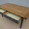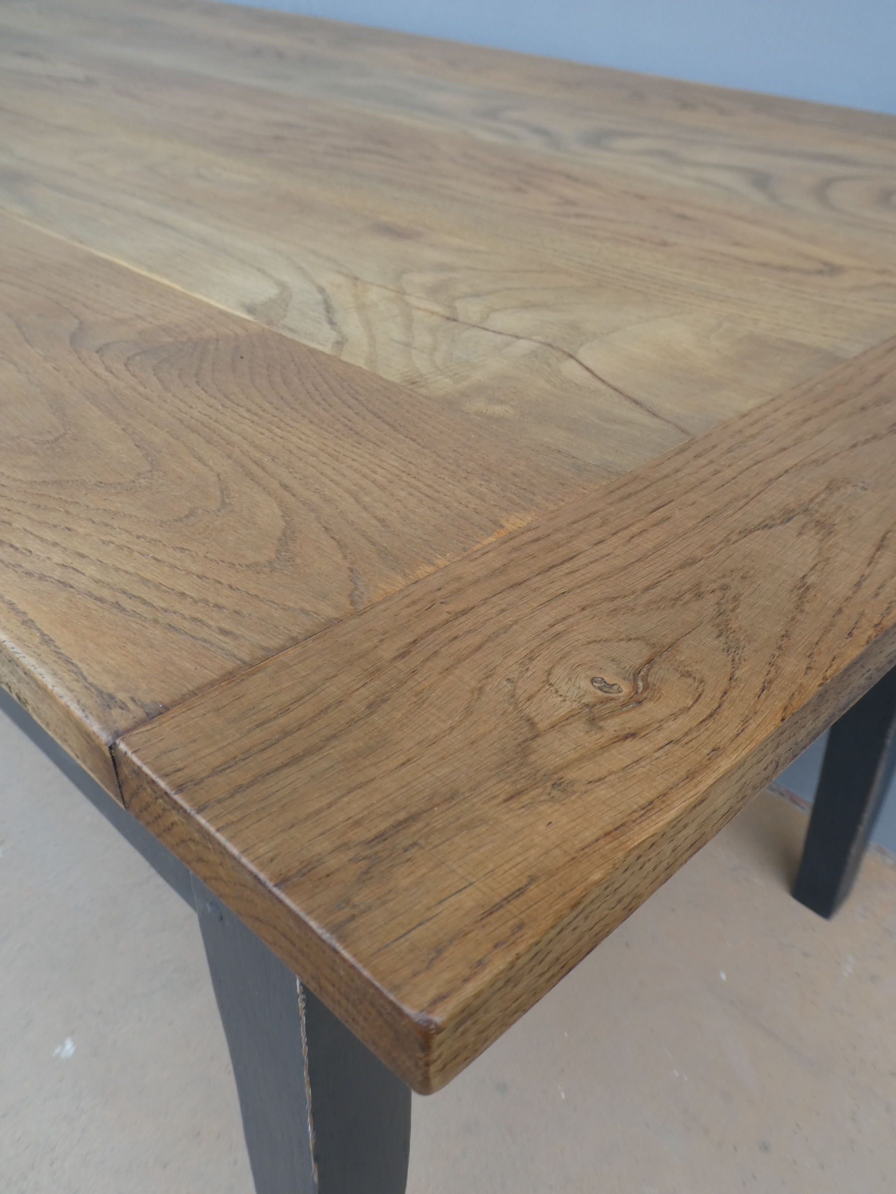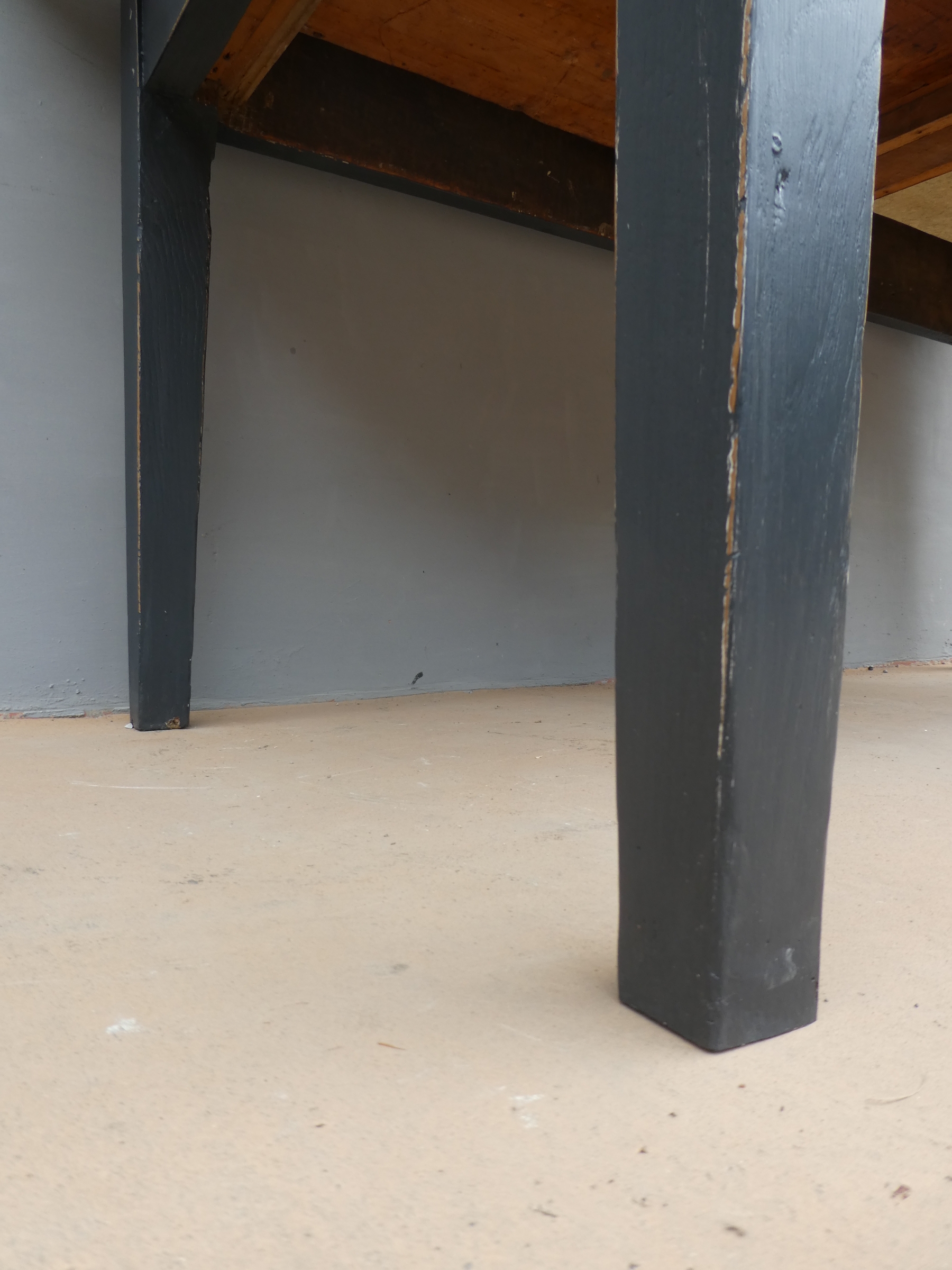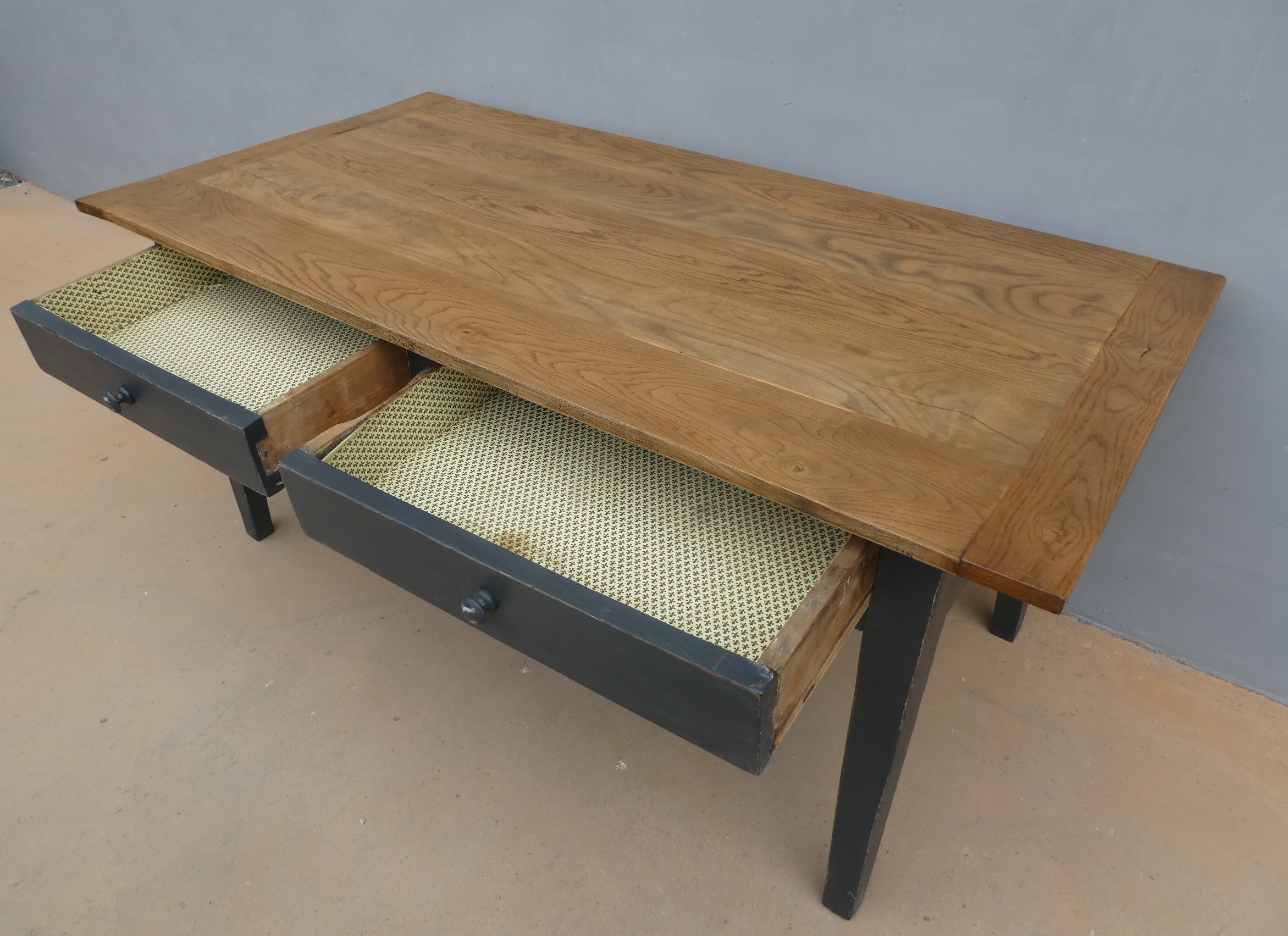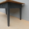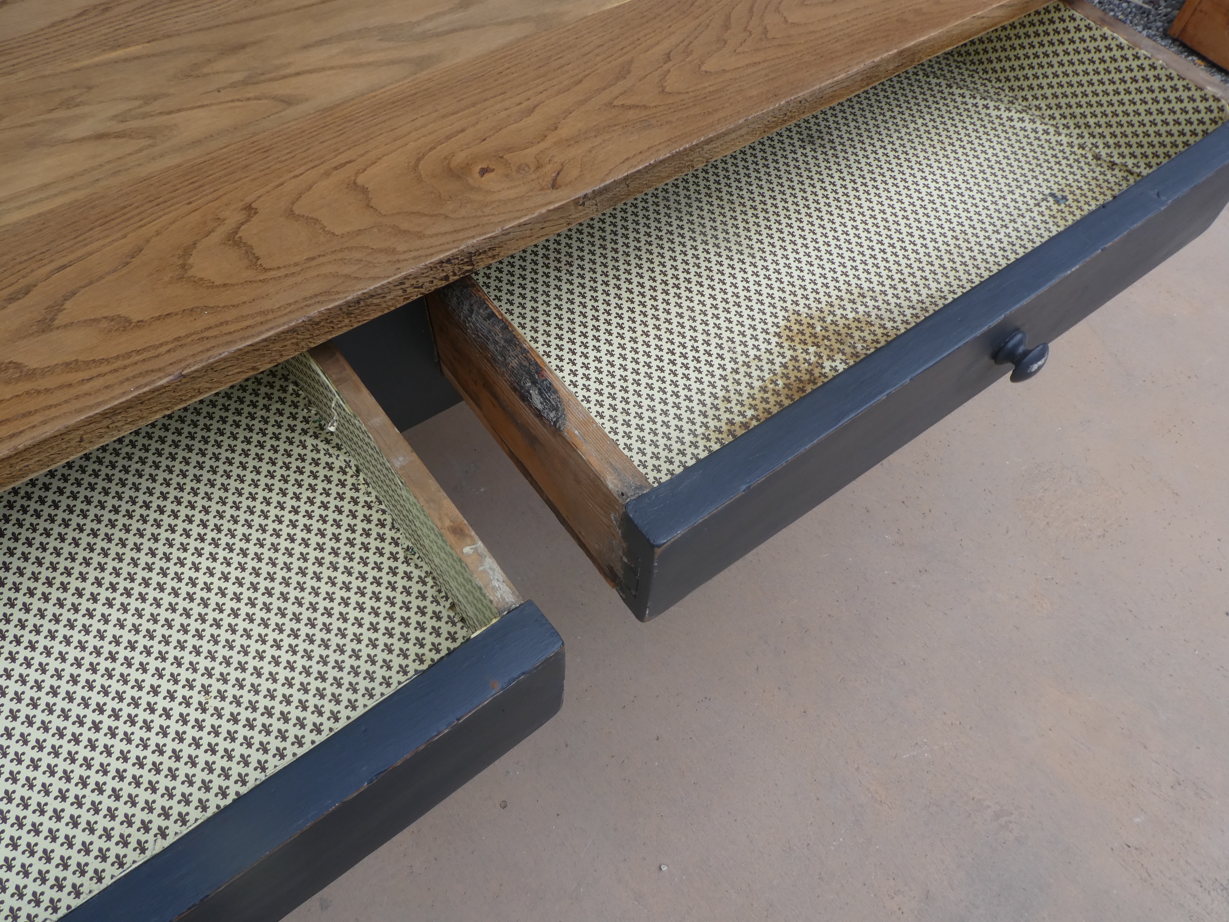Tavolo fisso rettangolare dotato di doppio cassetto frontale, laccato e rifinito con la tecnica “Shabby Chic” che prevede l’uso di colori chiari e colori più scuri che affiorano dopo il trattamento d’usura. Ciò che rende particolare ed originale questo mobile, è il contrasto creato dalla lacca utilizzata per il cavalletto delle gambe, con quella del piano (non coevo) in castagno, lasciato a legno. Epoca fine ‘800.